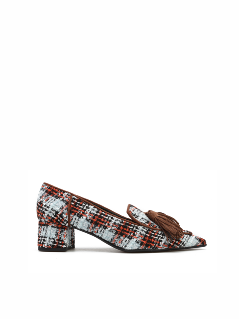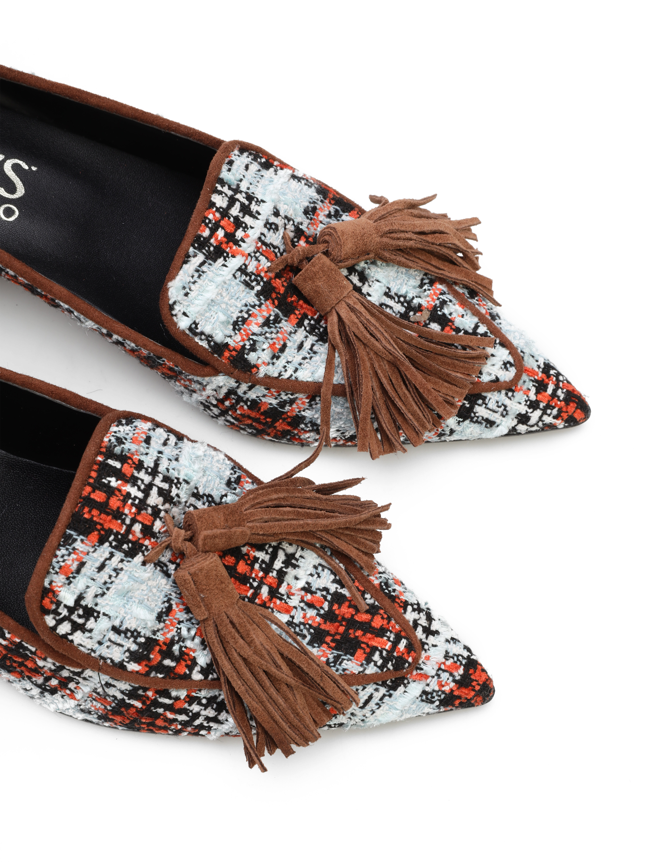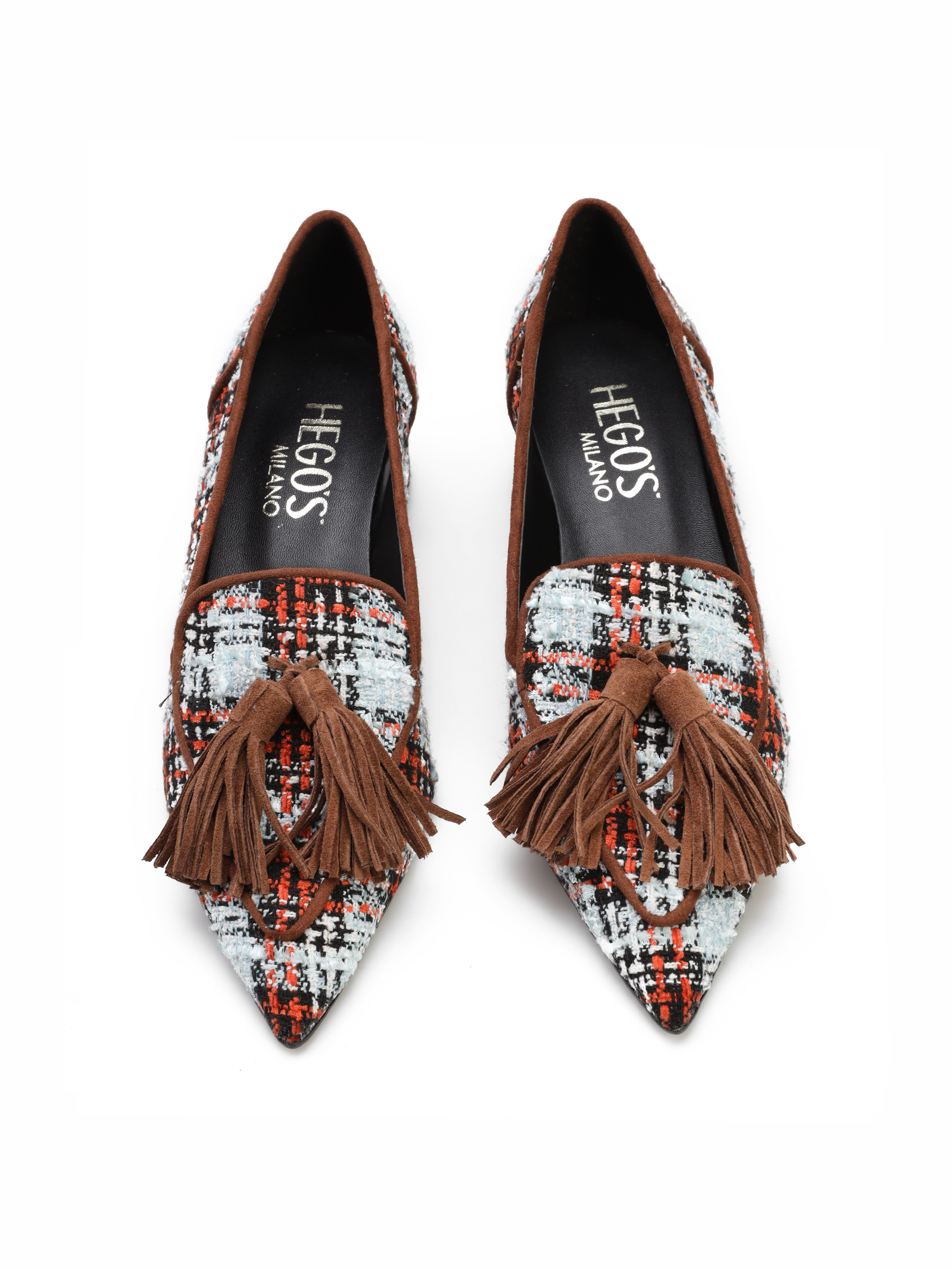 Czółenka na słupku to model dla kobiet łączących wygodę i aktualne Trendy. Cholewka z tkaniny w modnym połączeniu kolorystycznym ozdobiona została frędzlami. Model w szpic na niskim obcasie na słupku. Posiada skórzaną wkładkę.