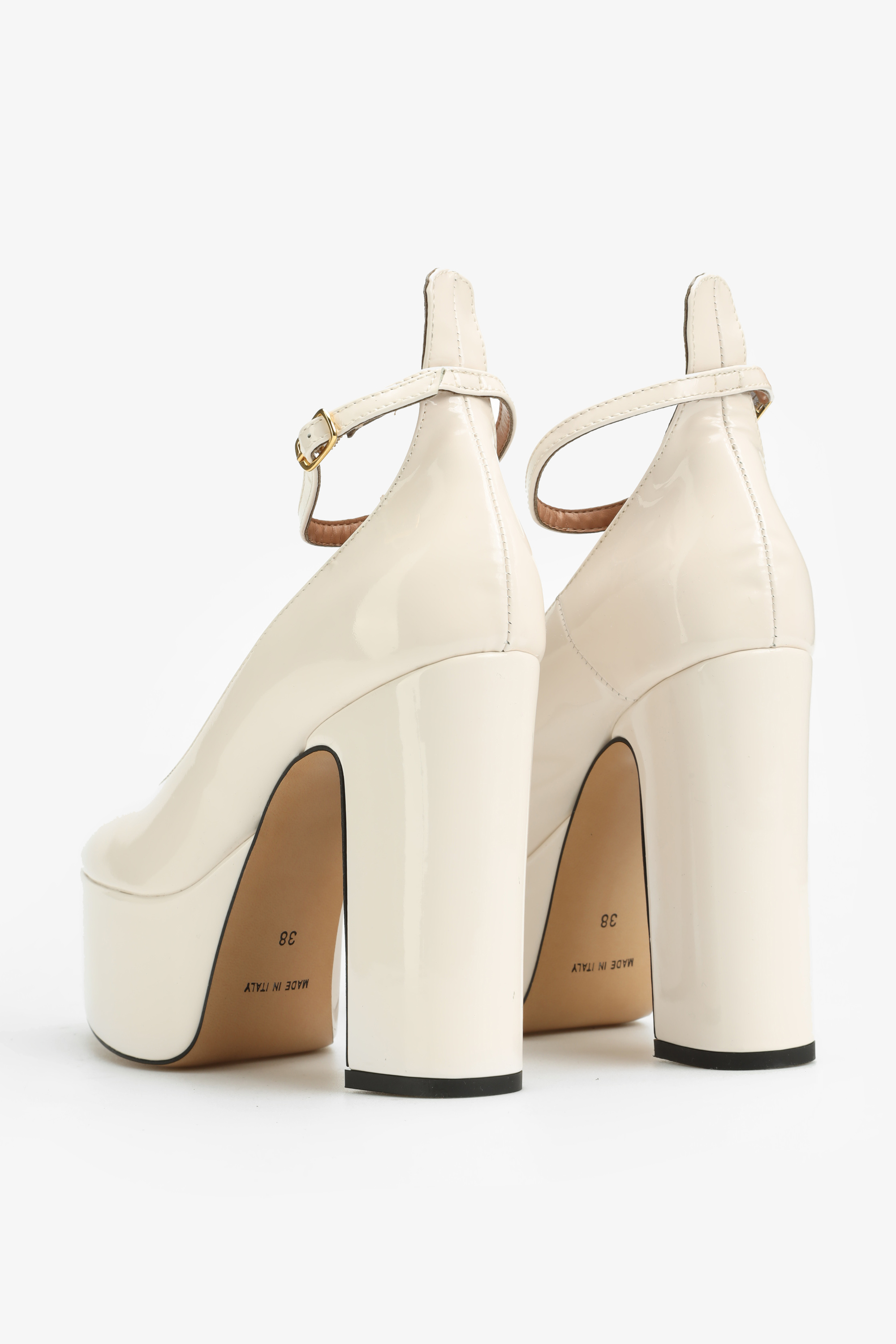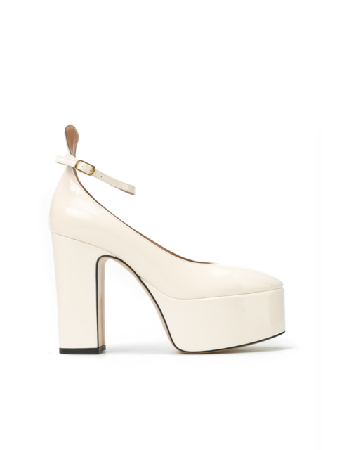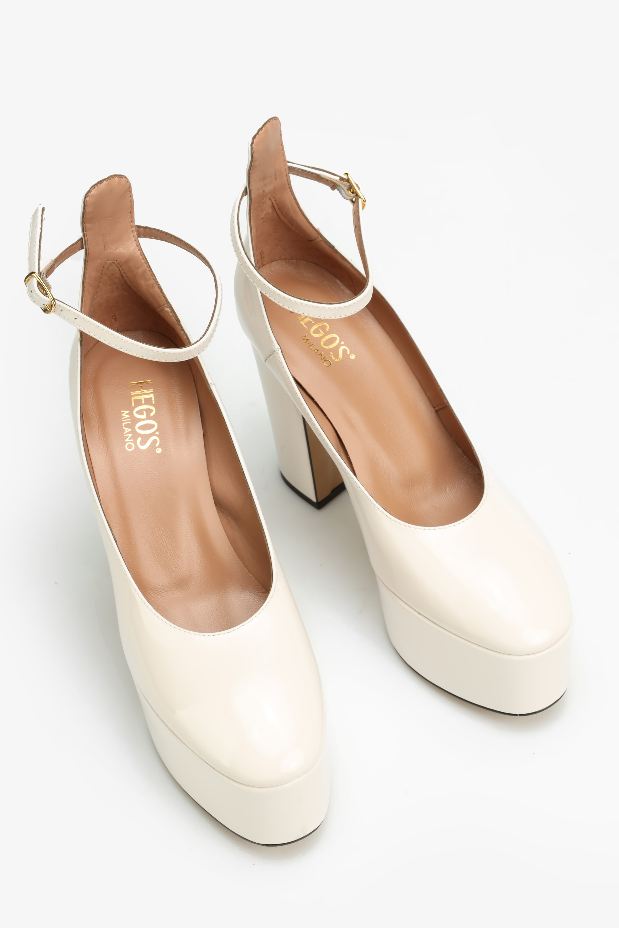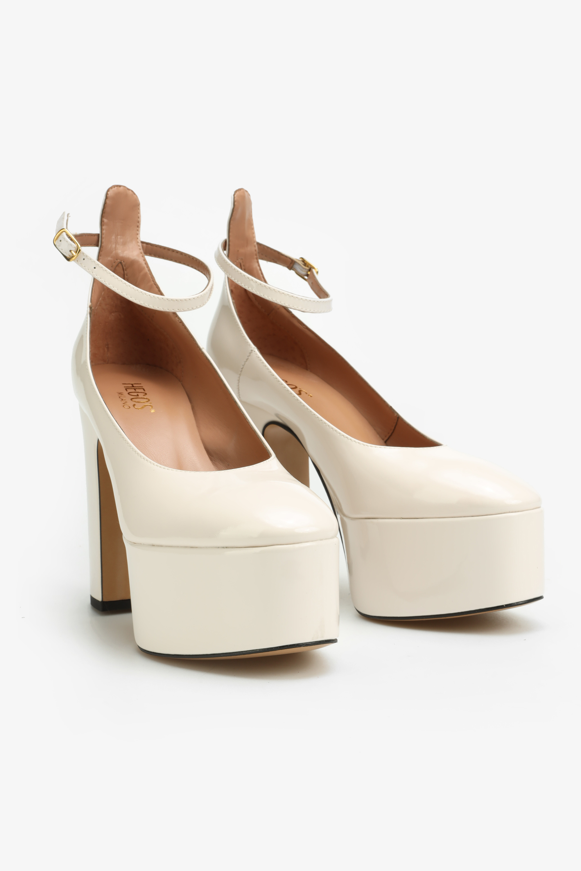 Kremowe czółenka w stylu Mary Jane w całości wykonane są z naturalnej skóry lakierowanej. Najmodniejsza w tym sezonie wysoka platforma i stabilny obcas na słupku to fason zaprojektowany przez włoskich projektantów HEGO'S Milano. Delikatny paseczek zapiany wokół kostki odpowiada za stabilny krok.