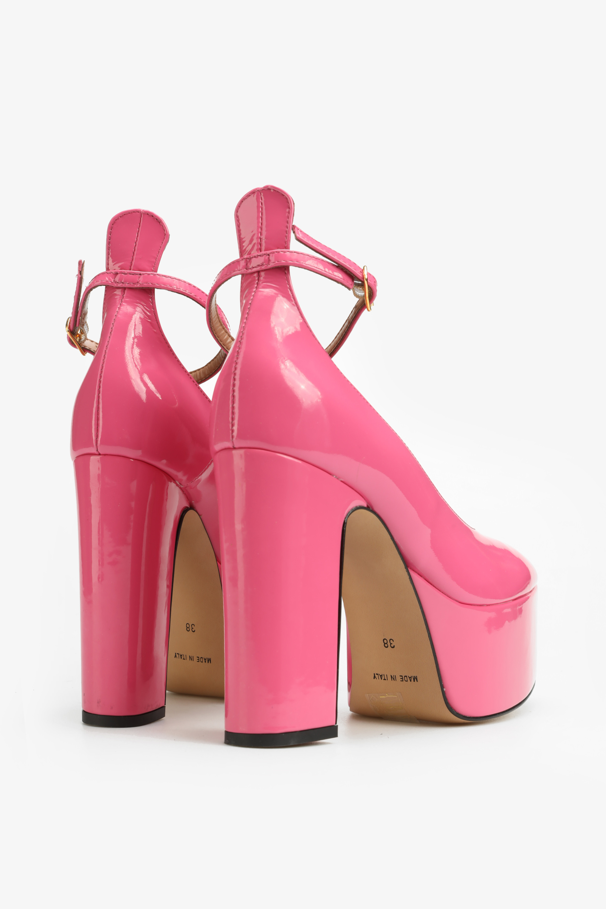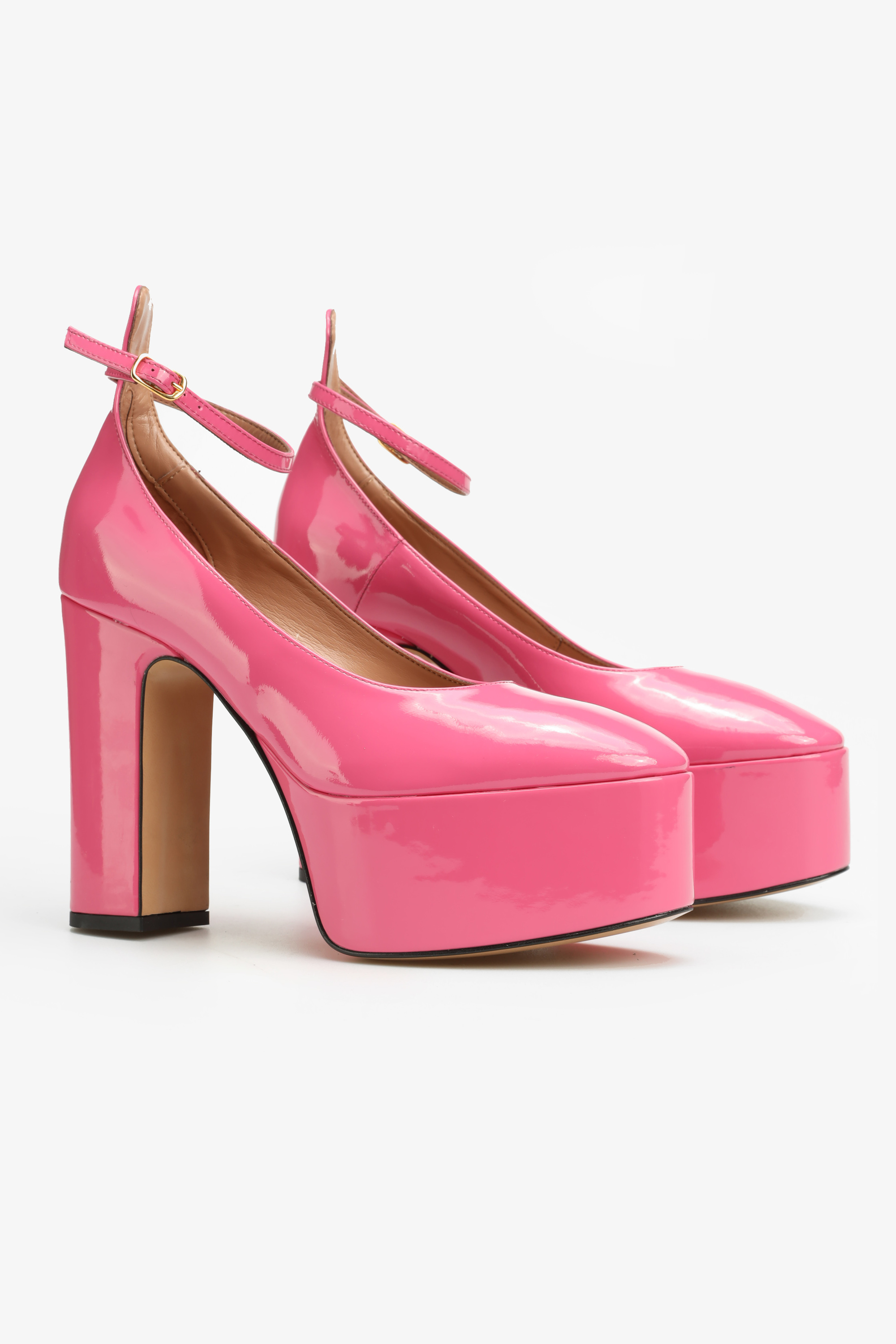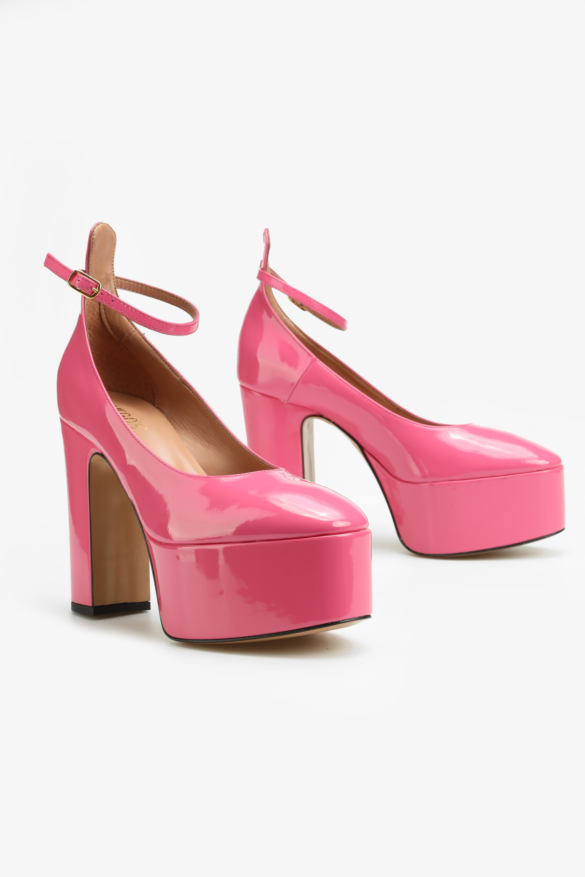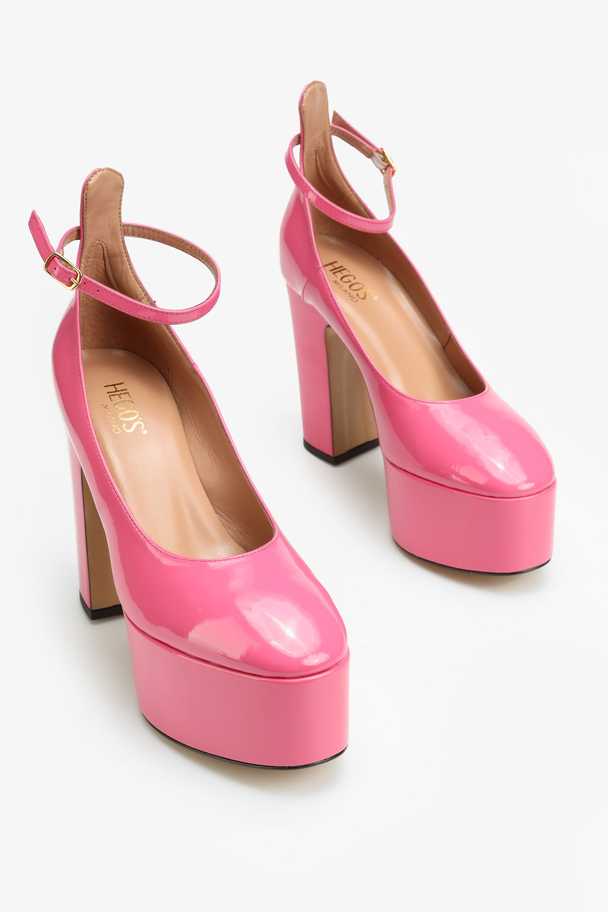 Czółenka w stylu Mary Jane w całości wykonane są  z naturalnej skóry lakierowanej. Najmodniejsza w tym sezonie wysoka platforma i stabilny obcas na słupku to fason zaprojektowany przez włoskich projektantów HEGO'S Milano.Wyrazisty i modny kolor to must have sezonu, ponieważ  "PINK is the new black". Delikatny paseczek zapiany wokół kostki odpowiada za stabilny krok.