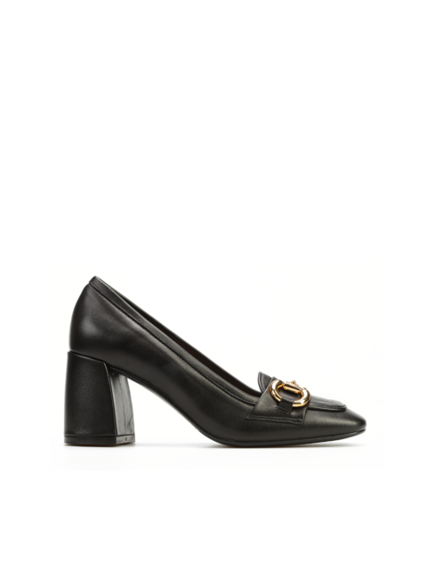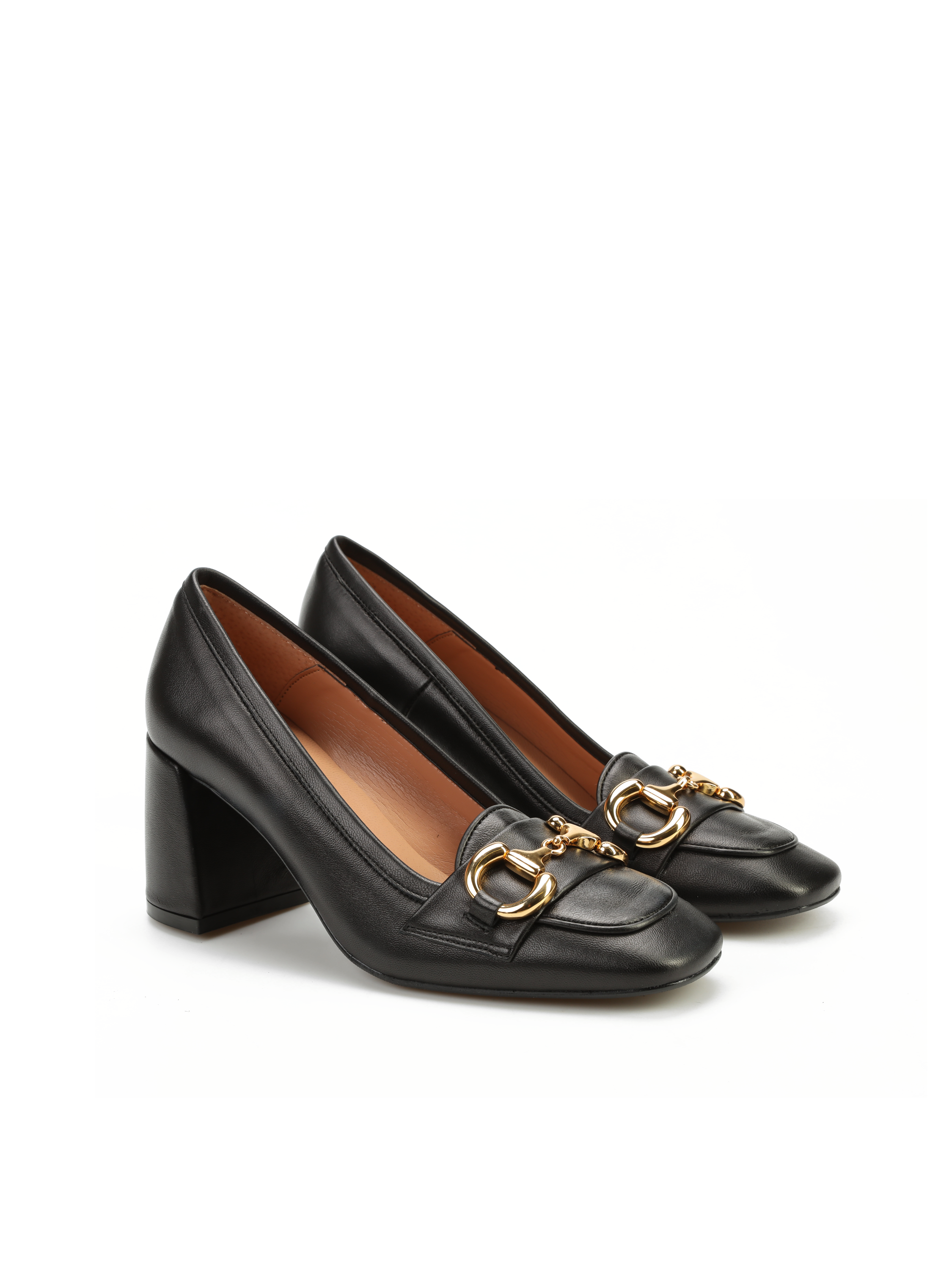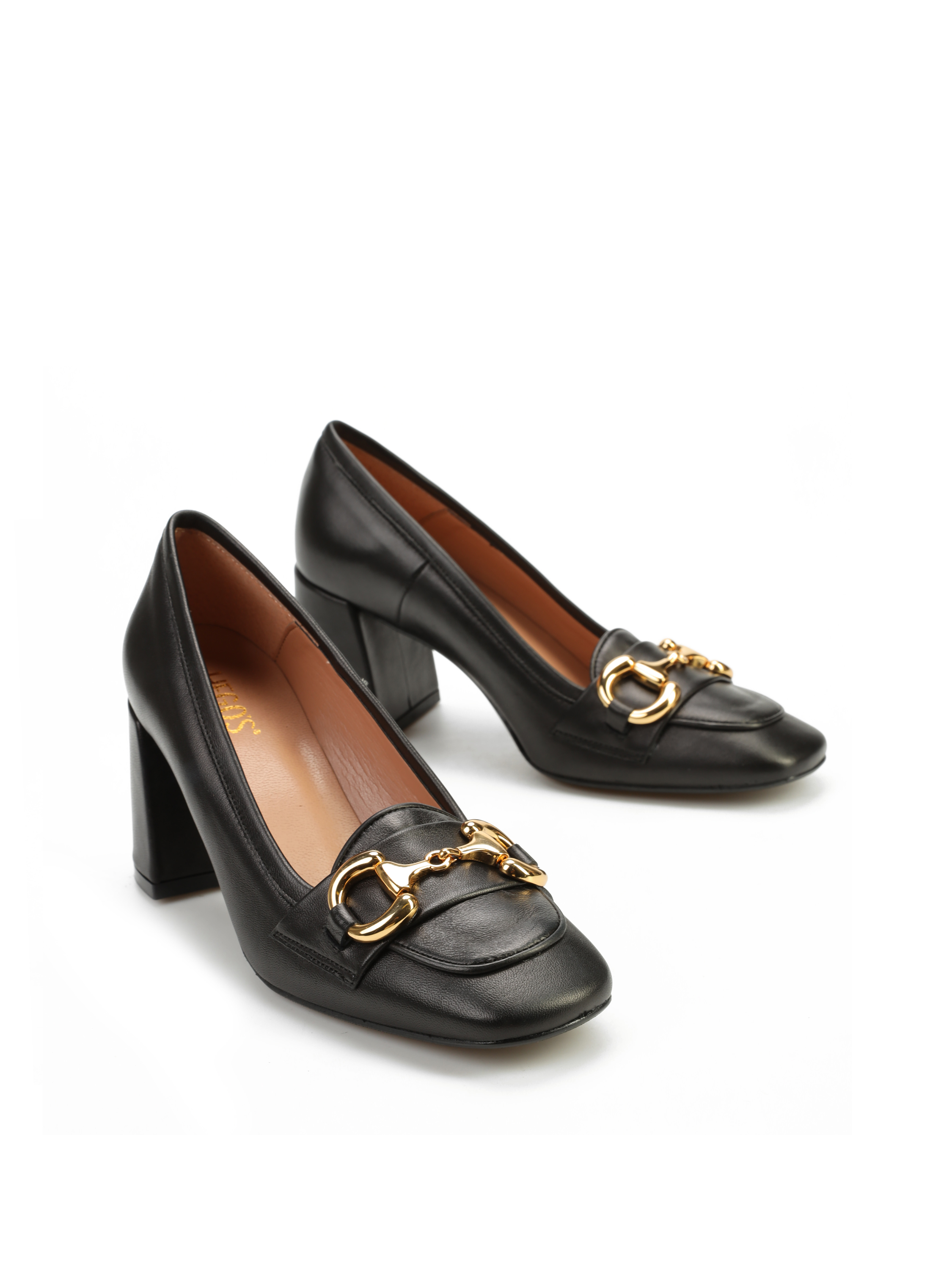 Czółenka na słupku wykonane są z włoskiej, naturalnej skóry. Czarna cholewka posiada ozdobną klamrę w złotym kolorze. Szeroki i stabilny obcas zapewni odpowiedni komfort podczas noszenia obuwia. Model będzie uzupełnieniem modnej garderoby kobiety.
