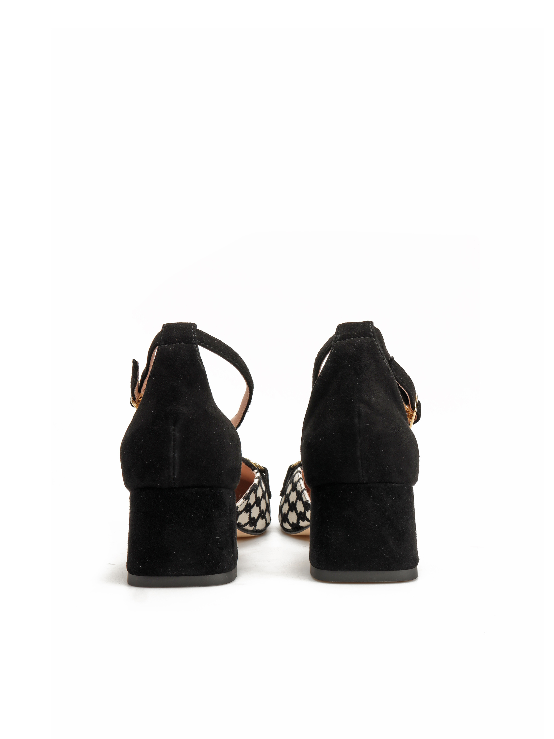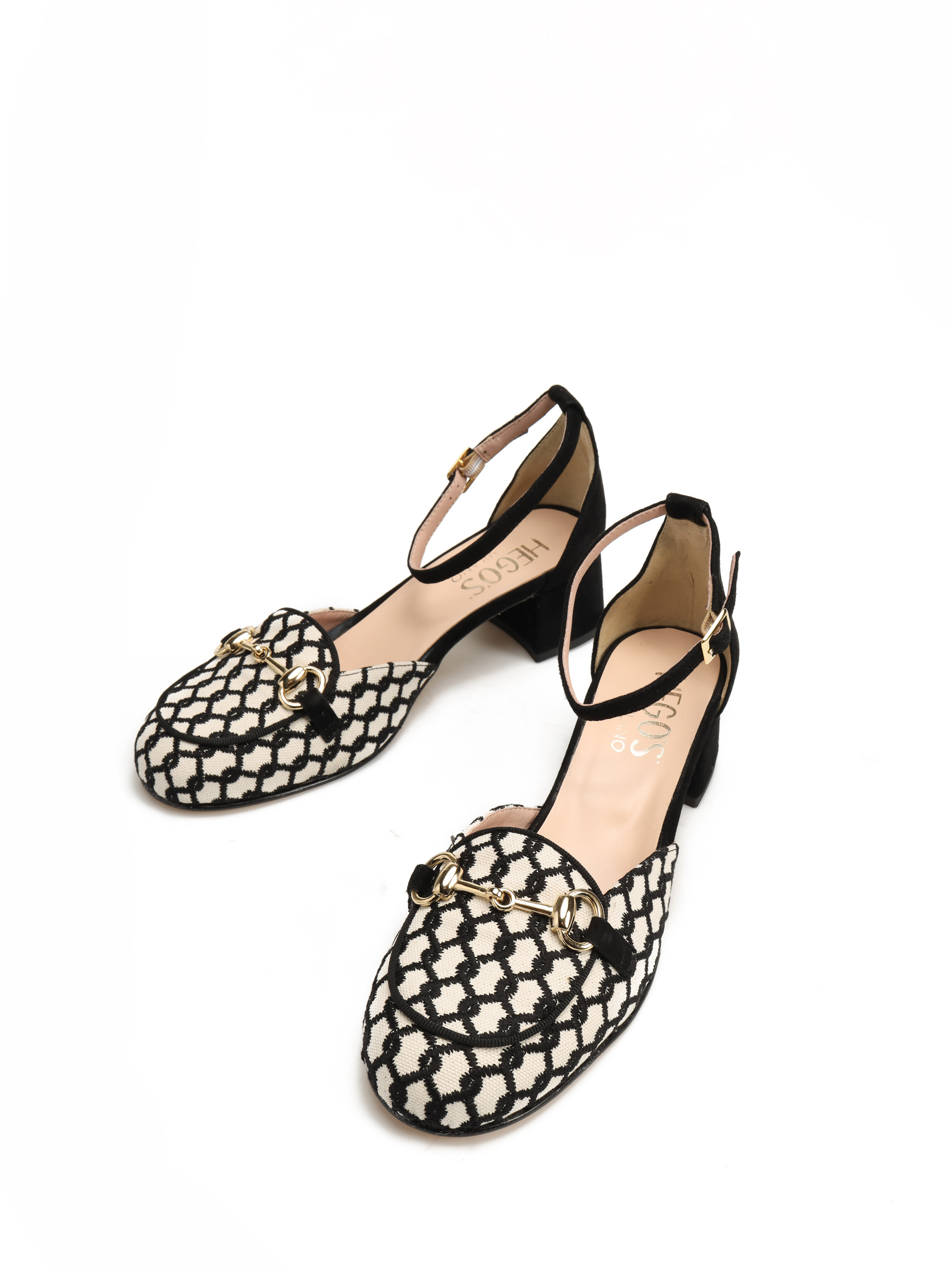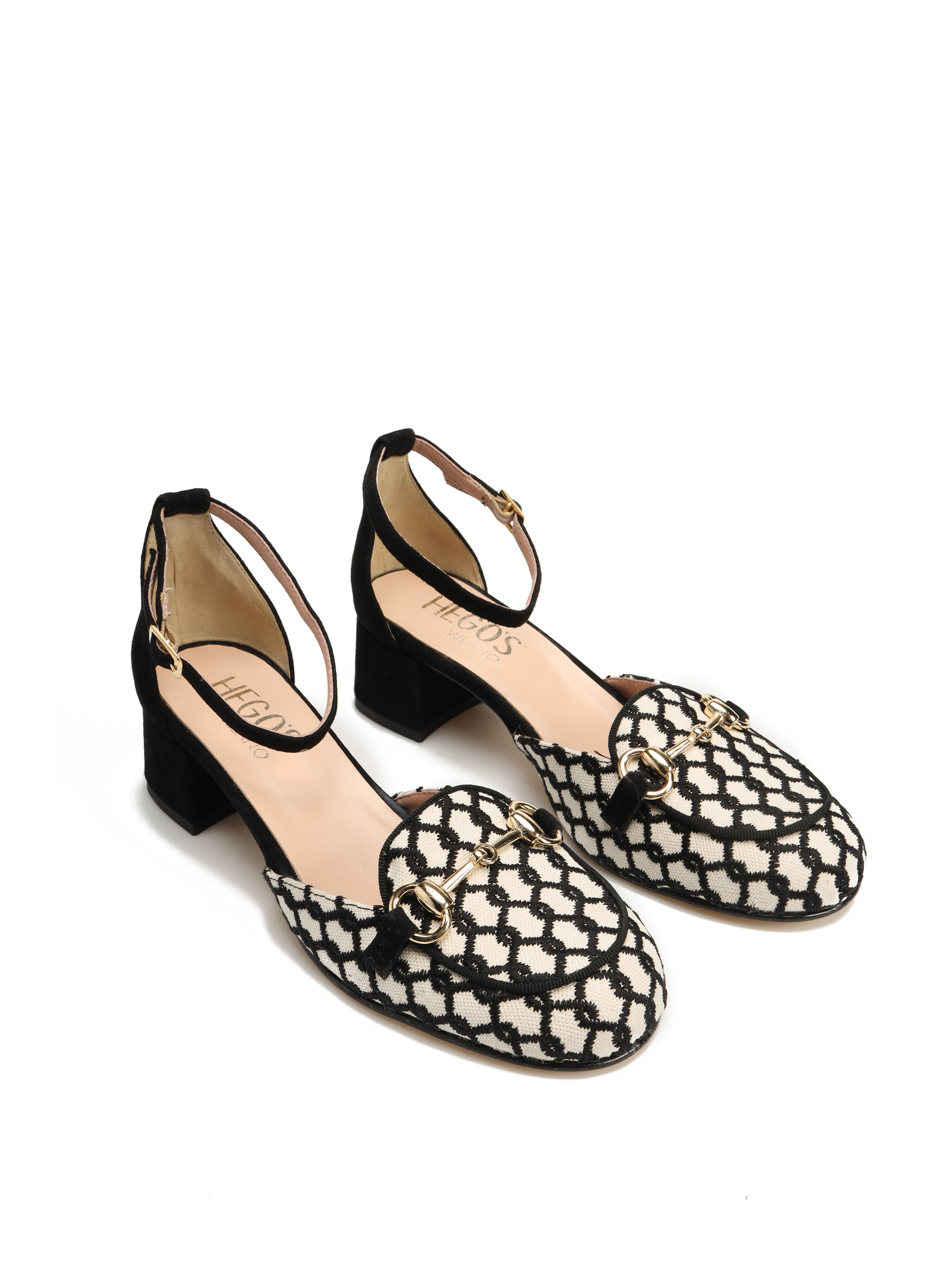 Czółenka na słupku HEGO'S Milano to stylowy element garderoby kobiety. Haftowana cholewka ozdobiona została złotym wędzidłem. Model zapinany wokół kostki regulowanym paskiem na sprzączkę. Osadzony na wygodnym, niskim obcasie na słupku.
