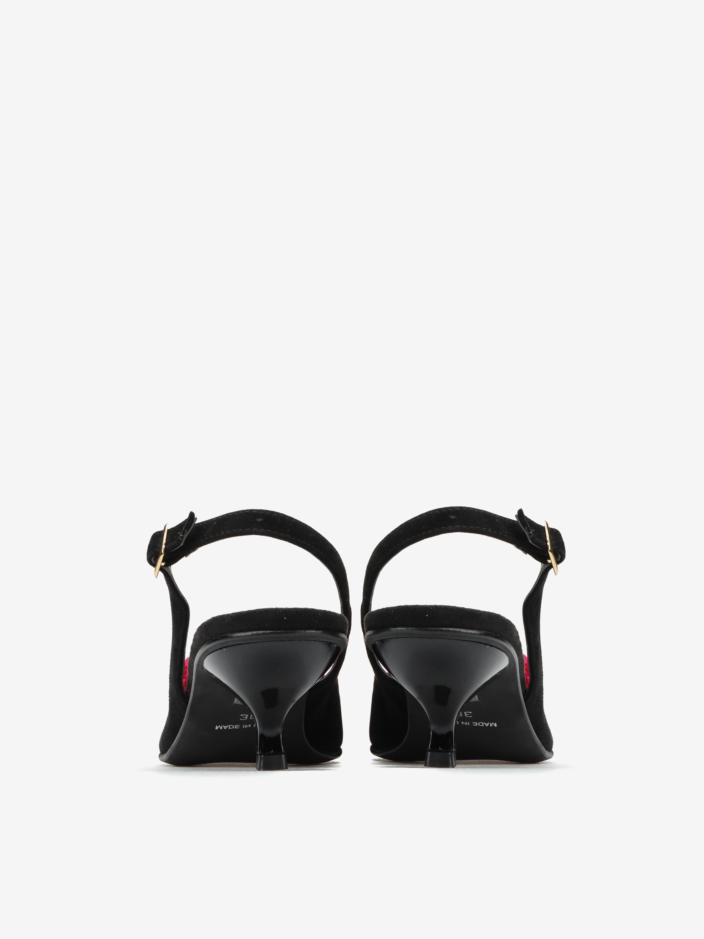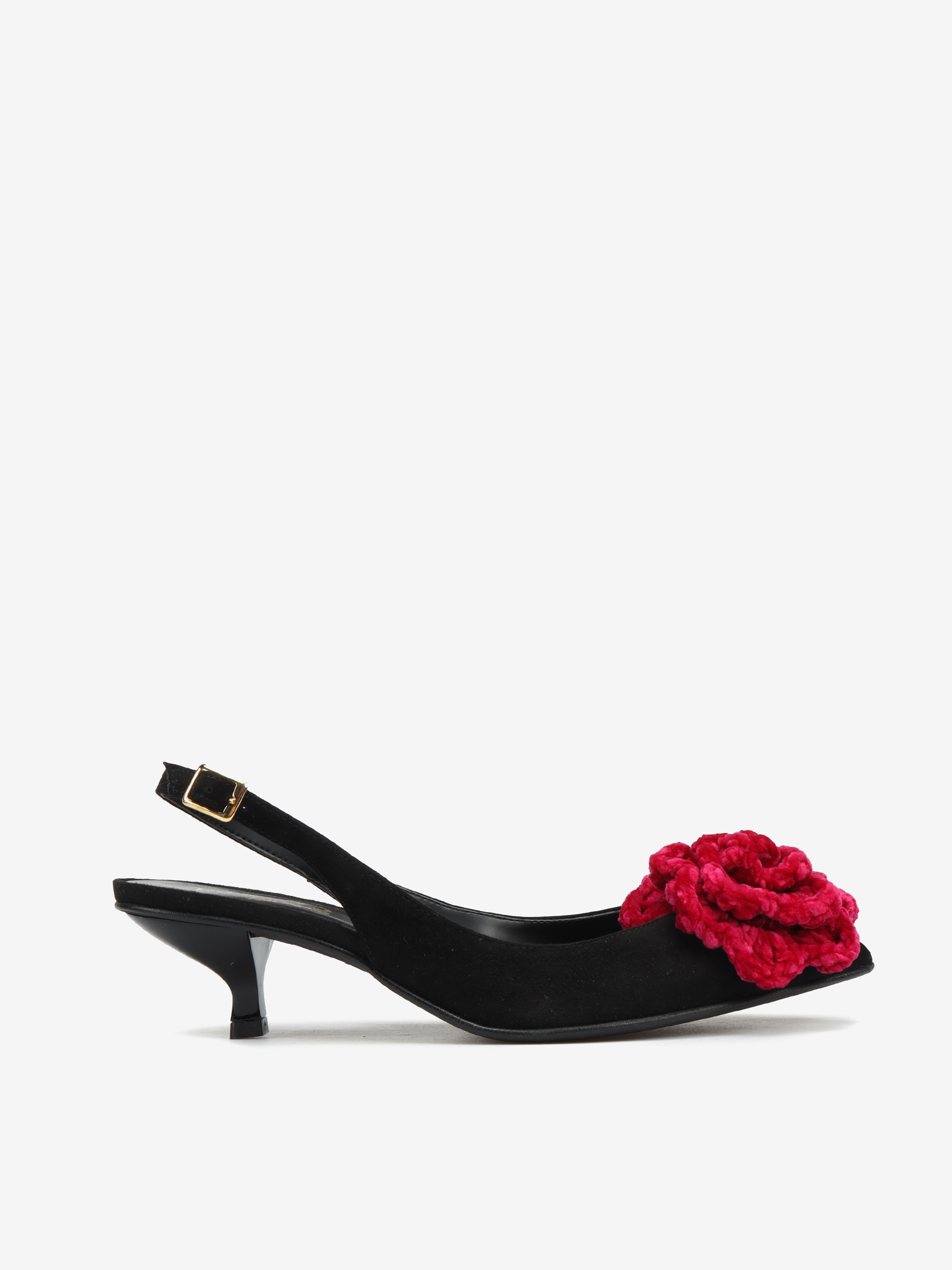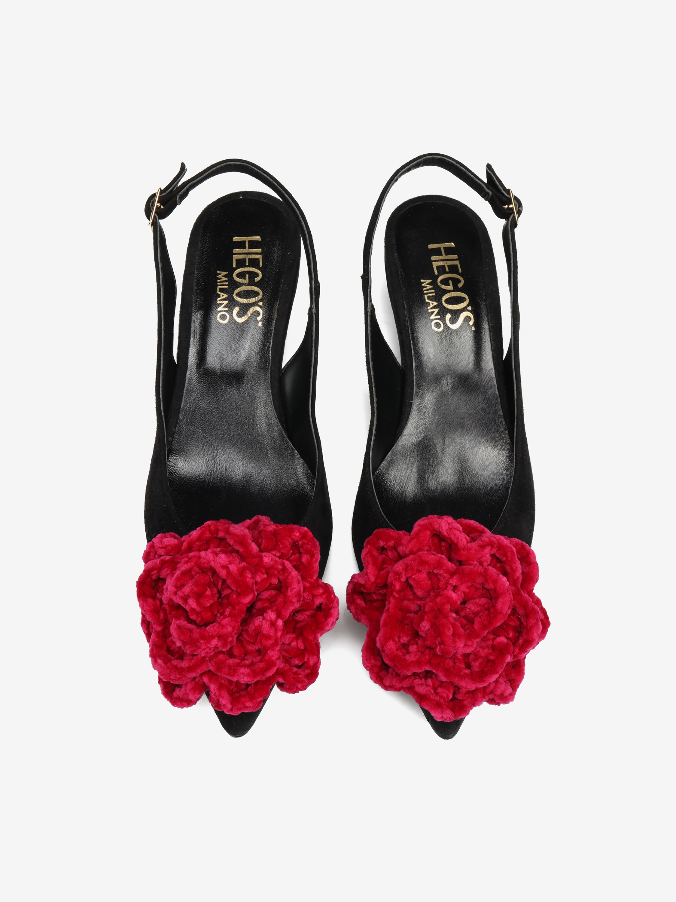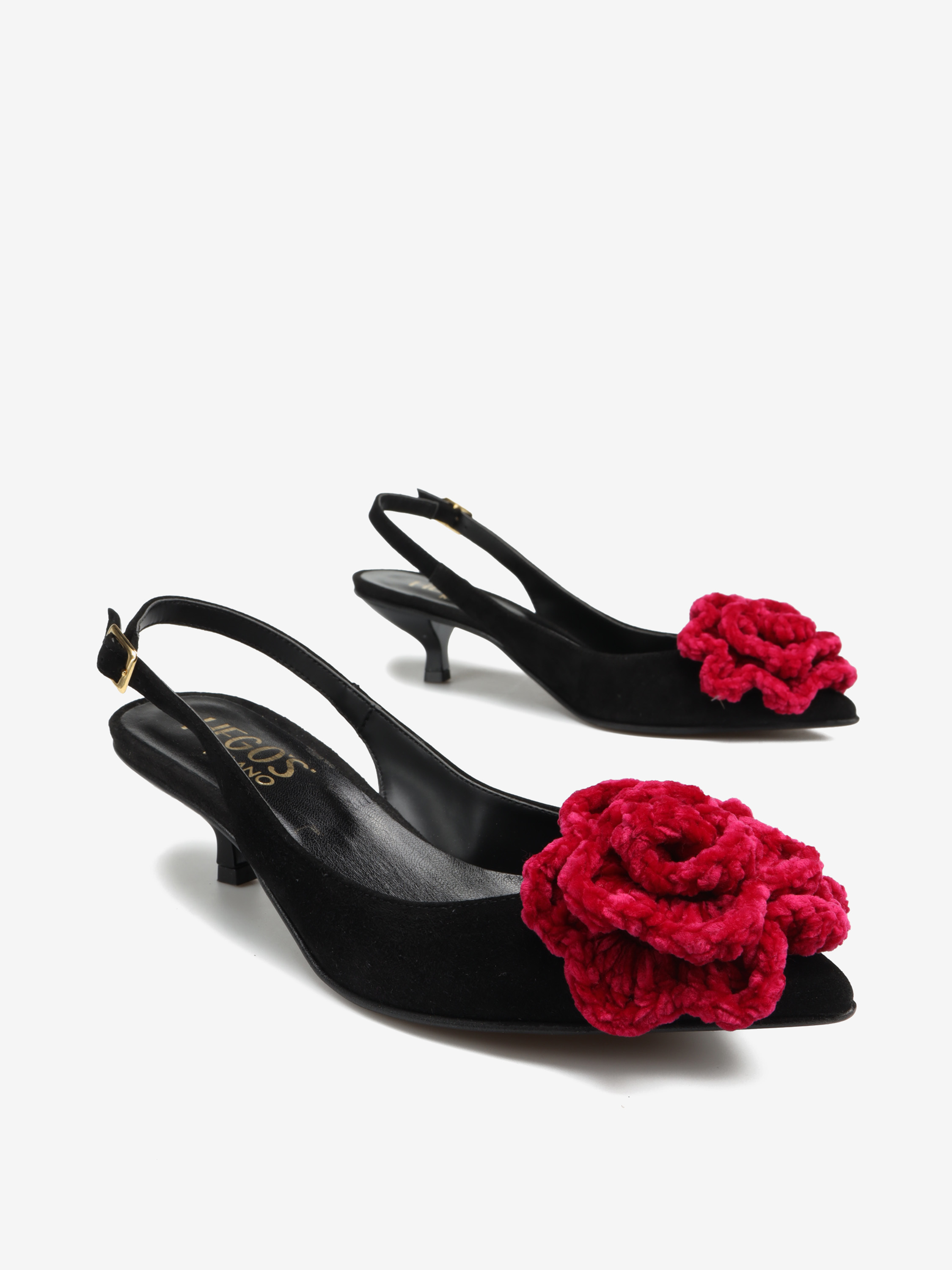 Szpilki z urodzinowej kolekcji Felicita' wykonane z czarnej, zamszowej skóry z artystycznym kwiatem.