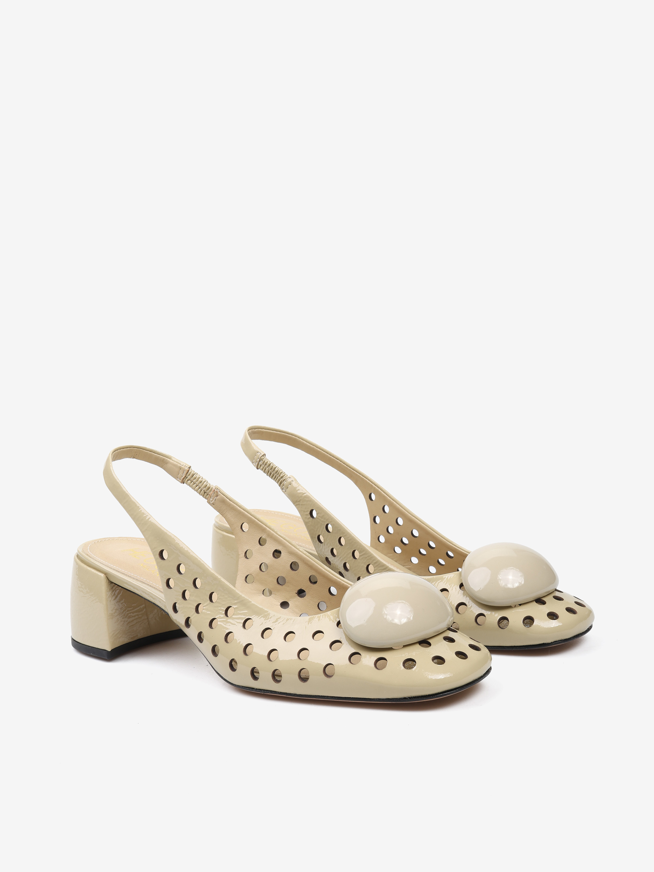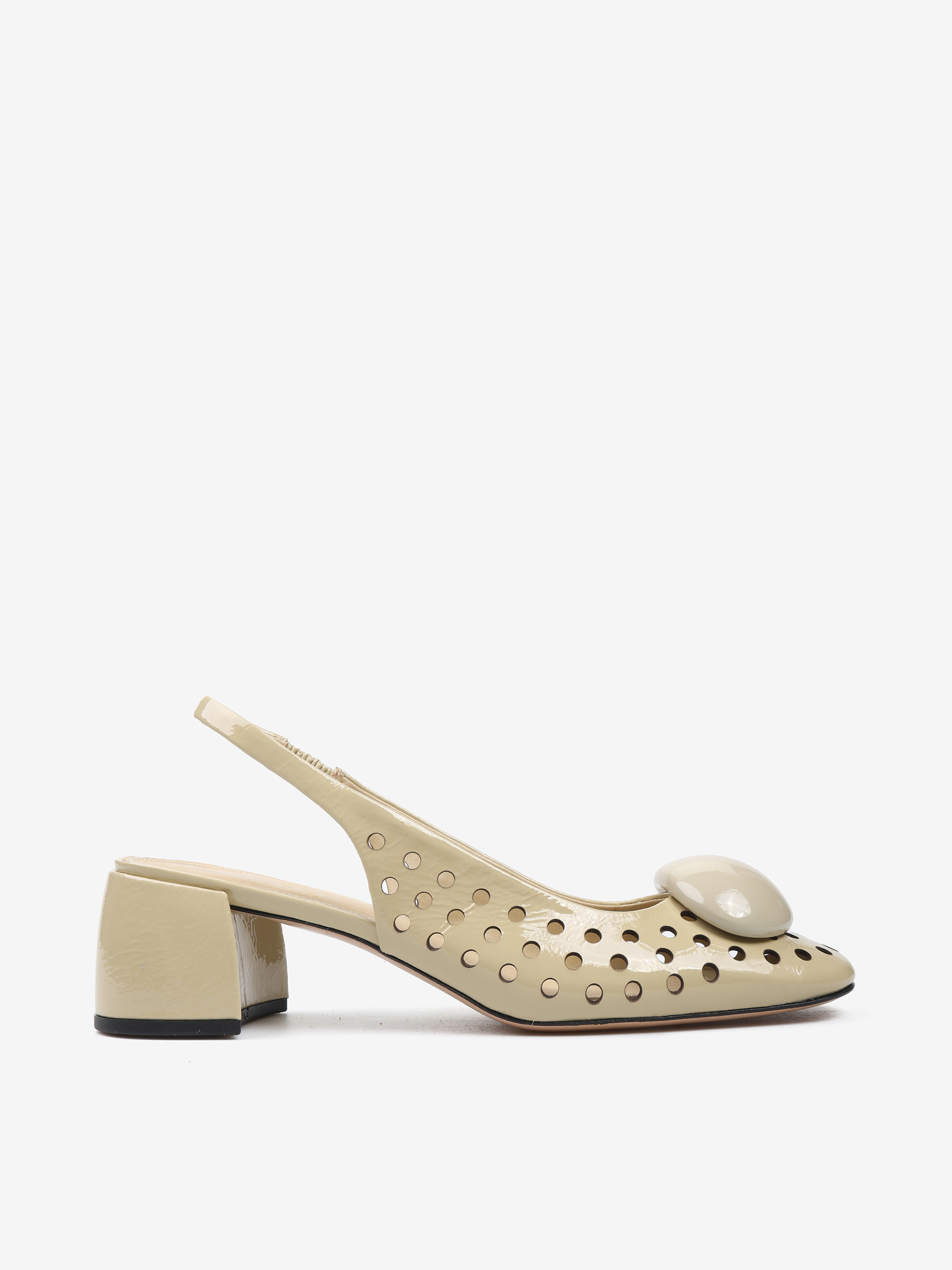 Ażurowe czółenka z ozdobną aplikacją. Odkryta pięta z paskiem dopasowującym się do stopy.