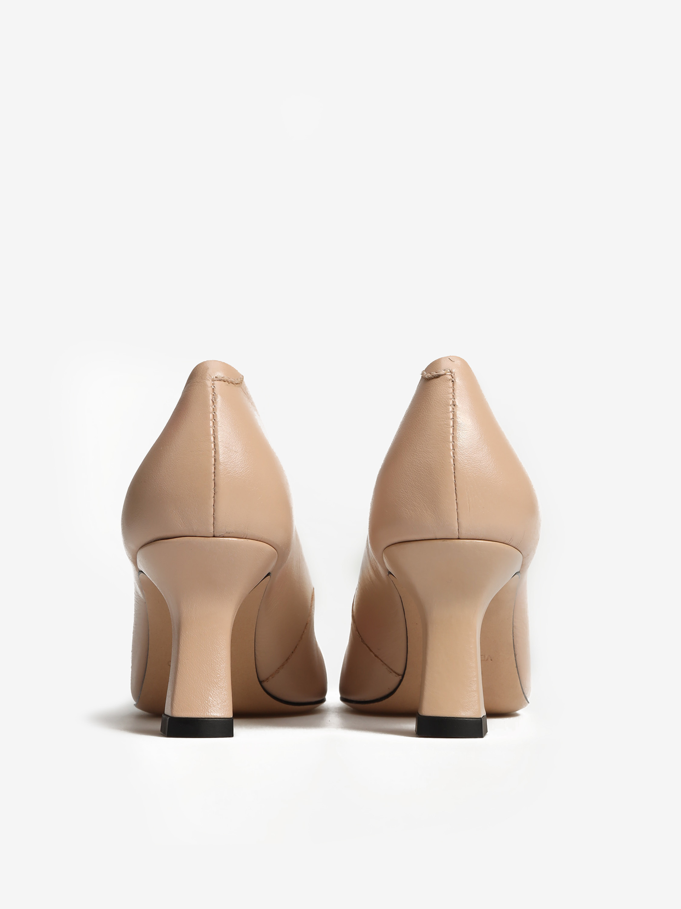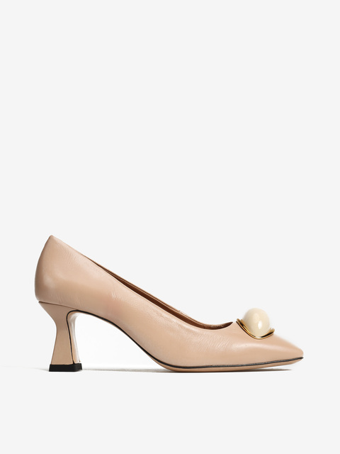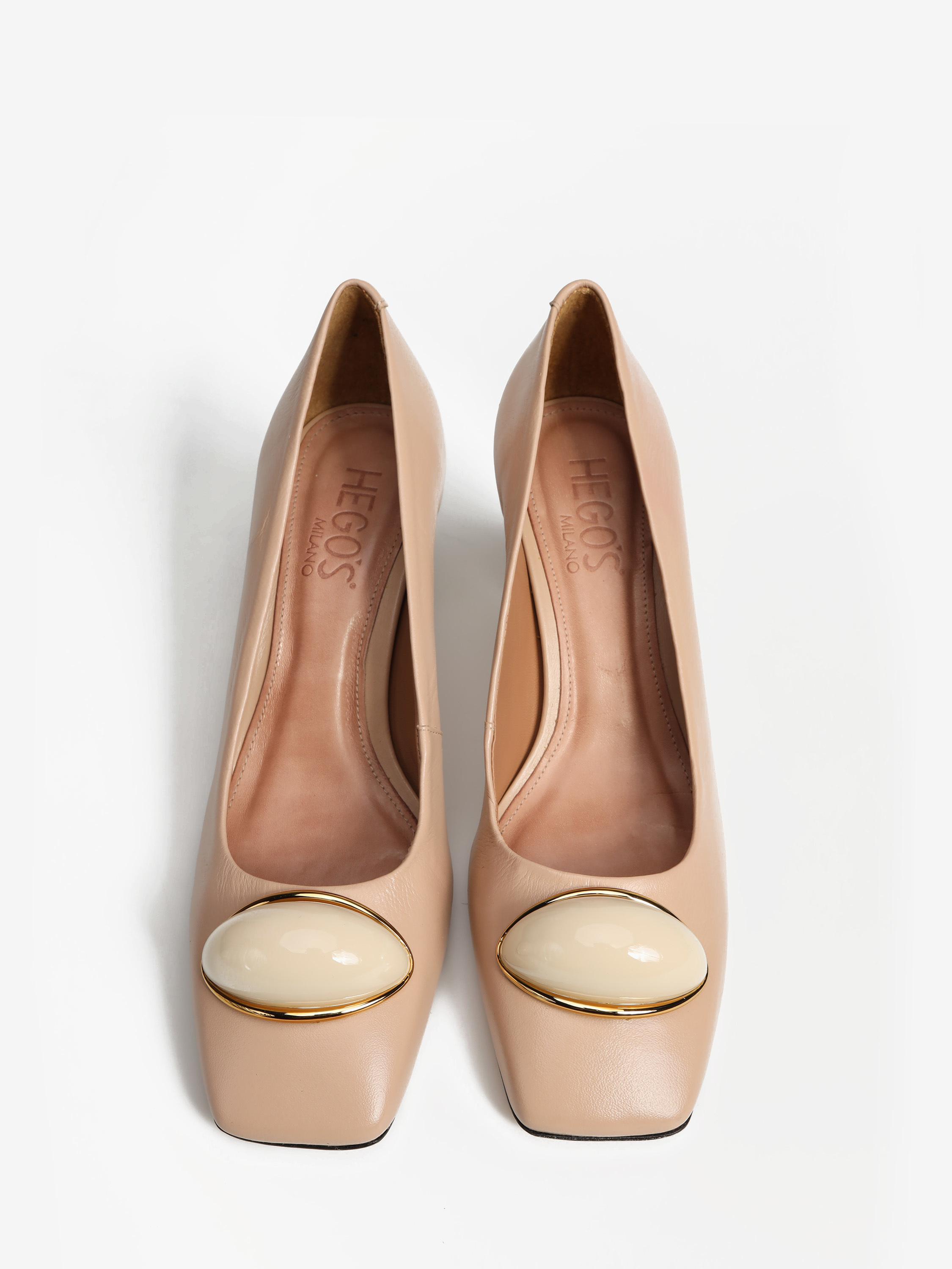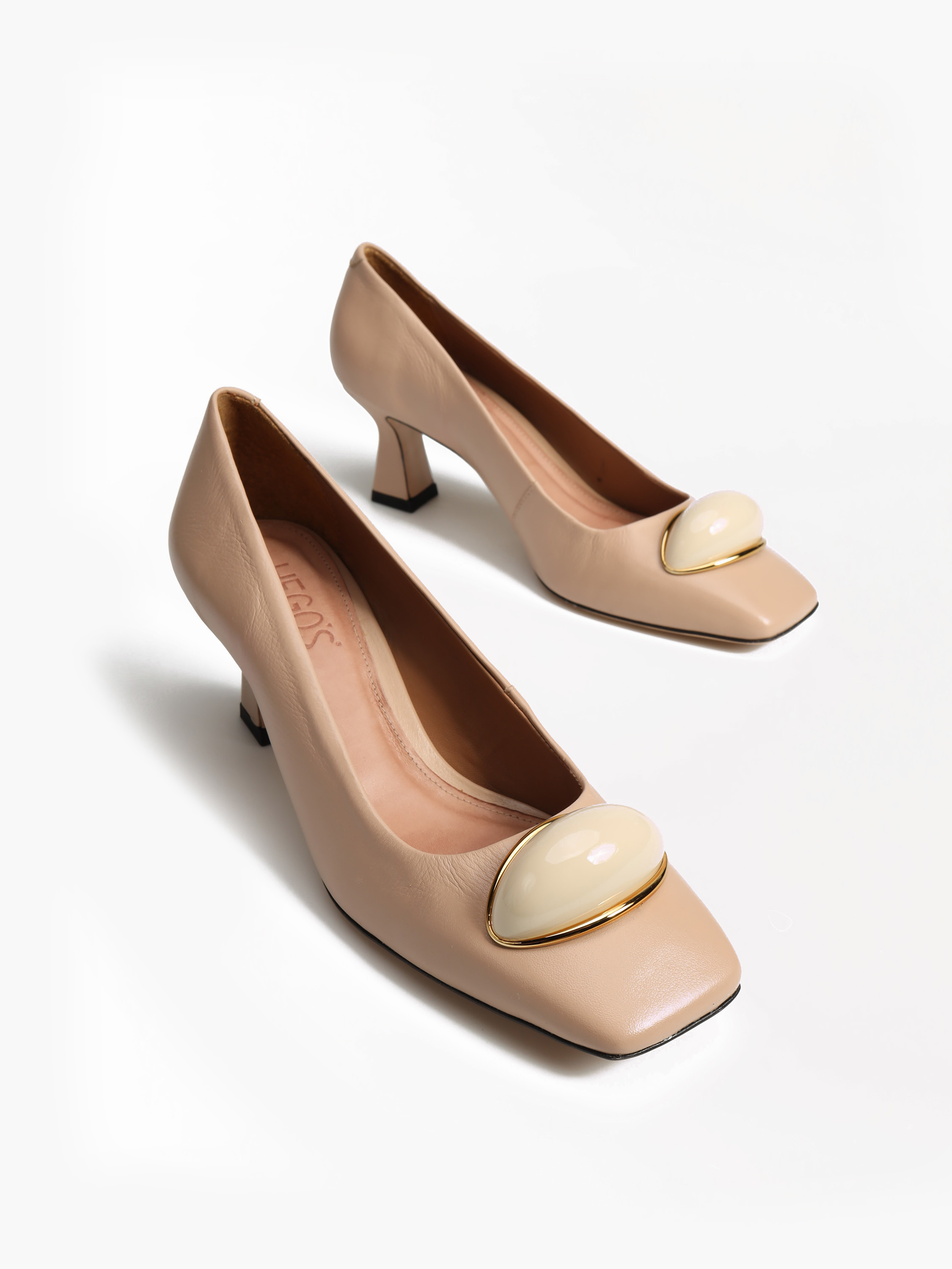 Beżowo kremowe czółenka z kwadratowym noskiem, osadzone na niewielkim 6 cm obcasie. Cholewa jest wykonana z naturalnej skóry i wykończona efektowną ozdobą w tym samym kolorze.