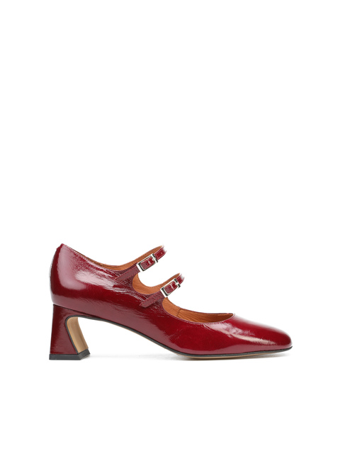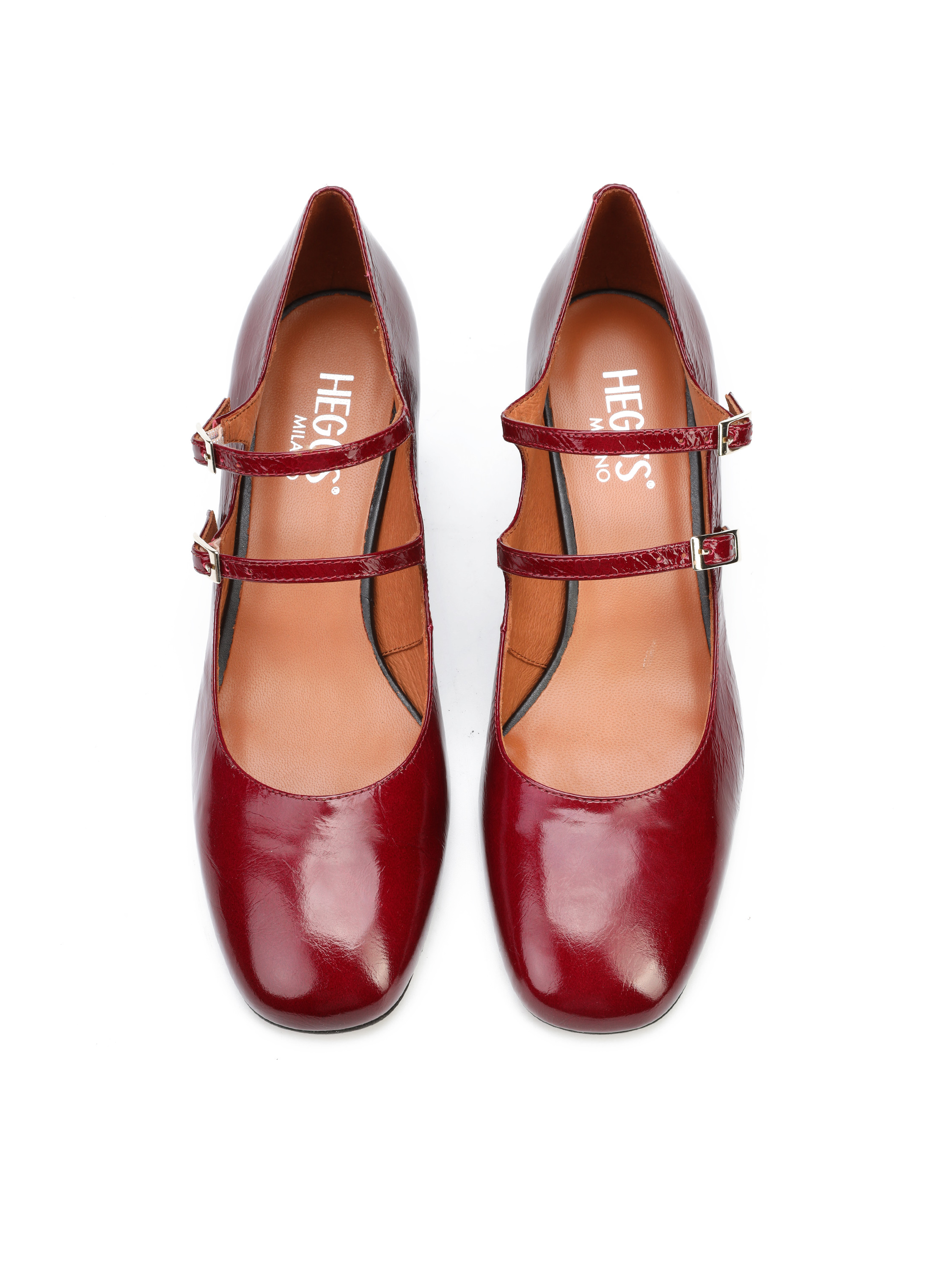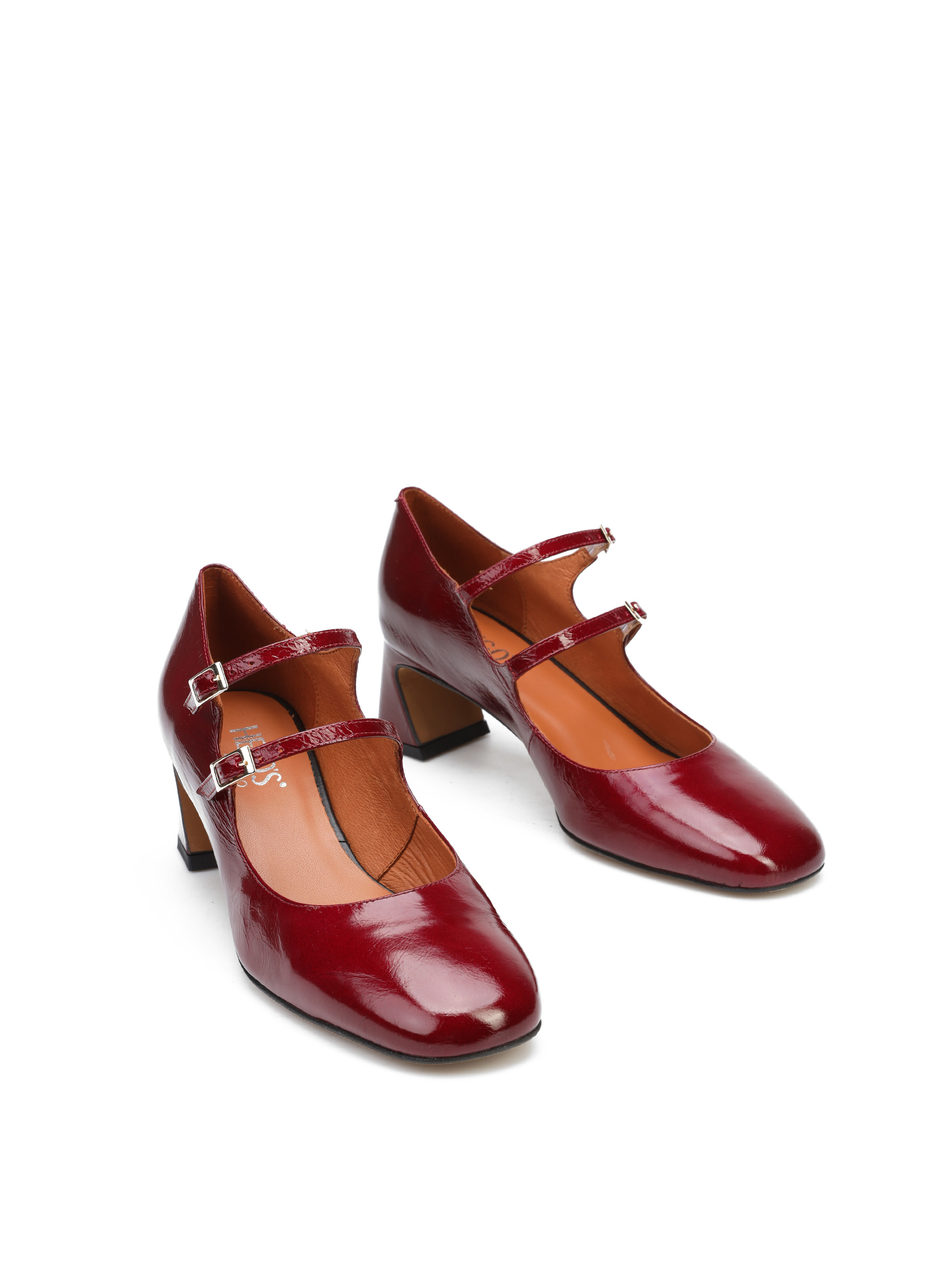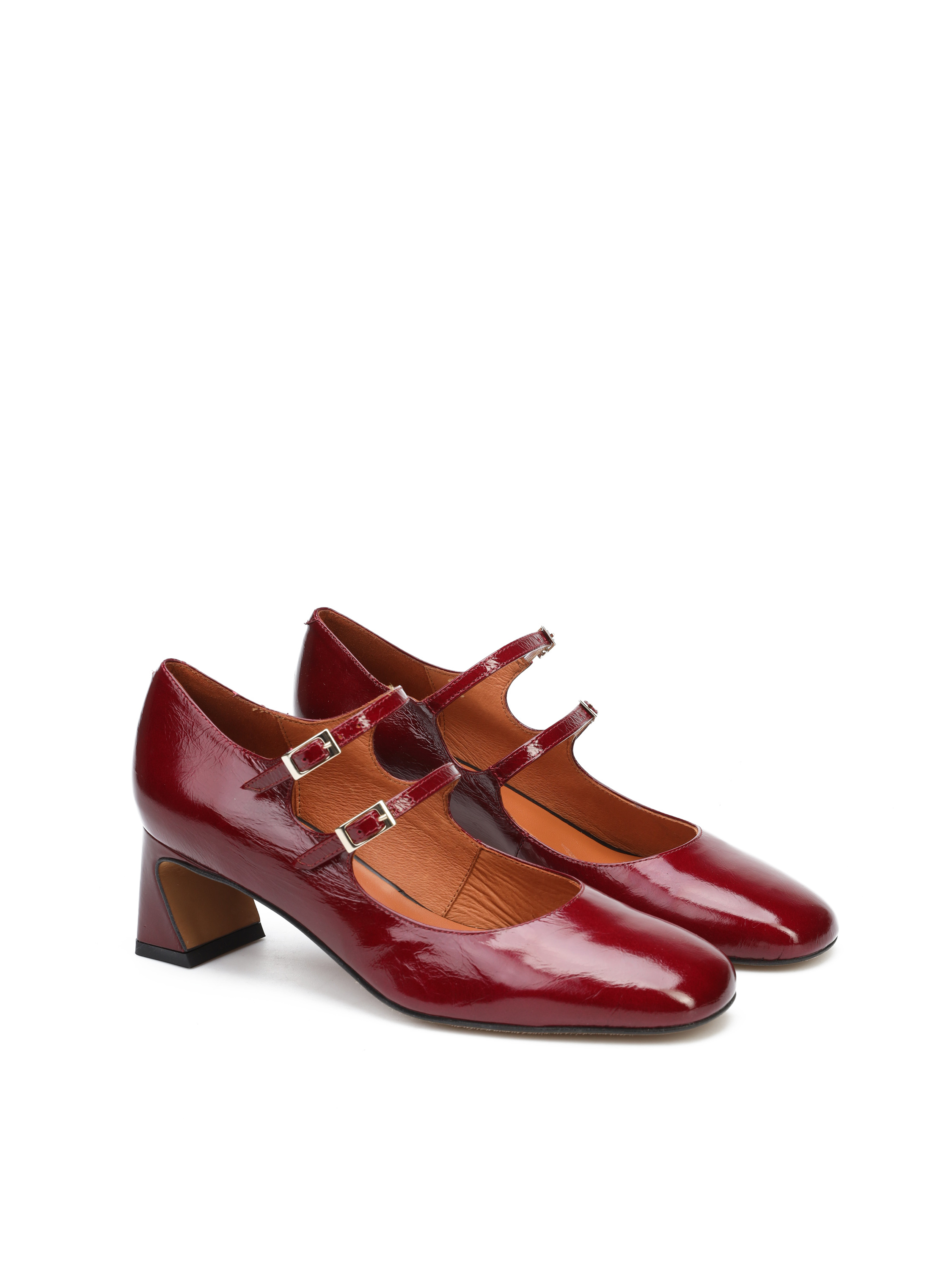 Czółenka na niskim obcasie w stylu Mary Jane wykonane są z lakierowanej skóry. Cholewka w bordowym kolorze posiada dwa regulowane paski zapinane na sprzączkę. Model z kwadratowym, ściętym noskiem i niewysokim, geometrycznym obcasem.
