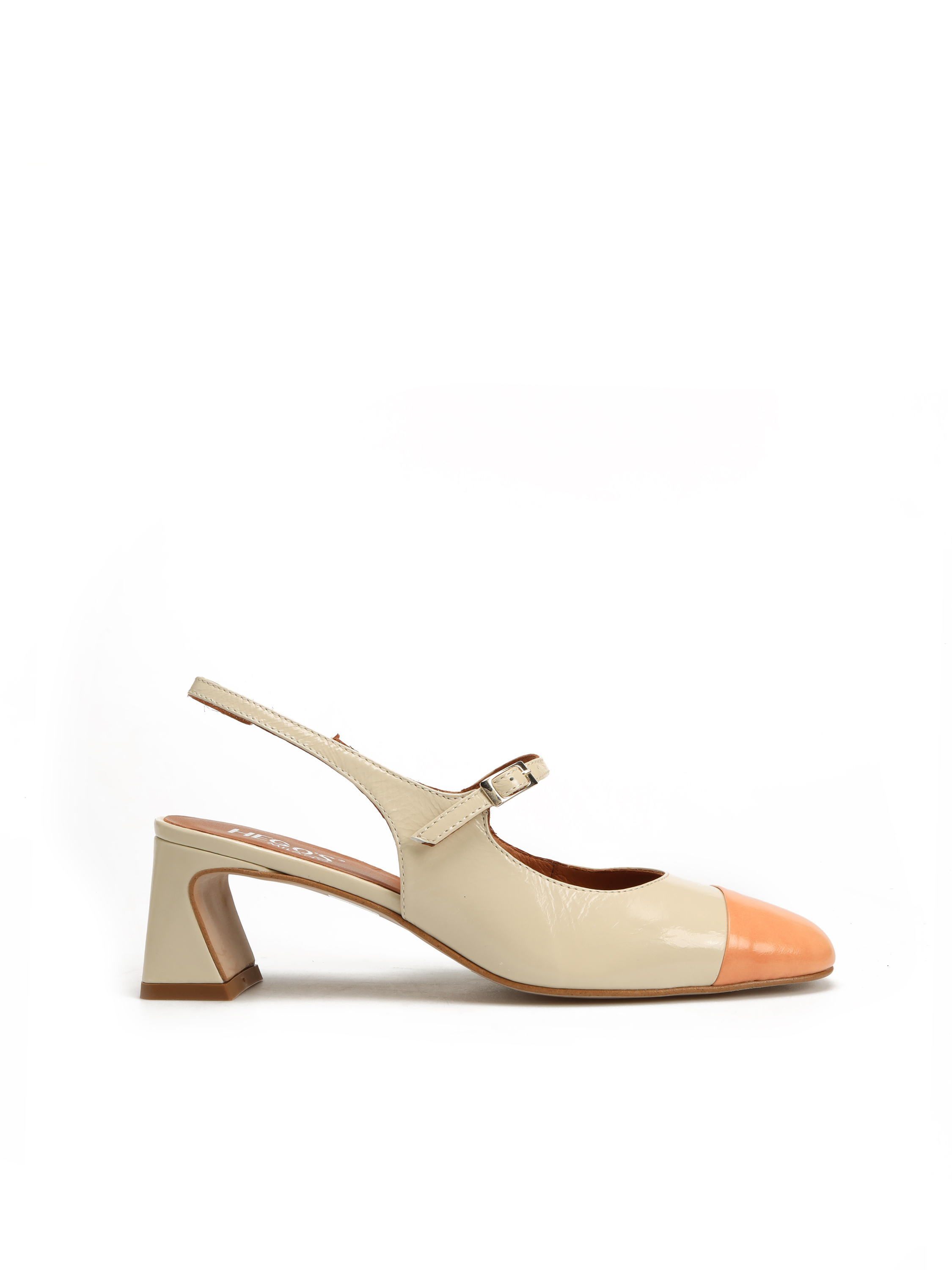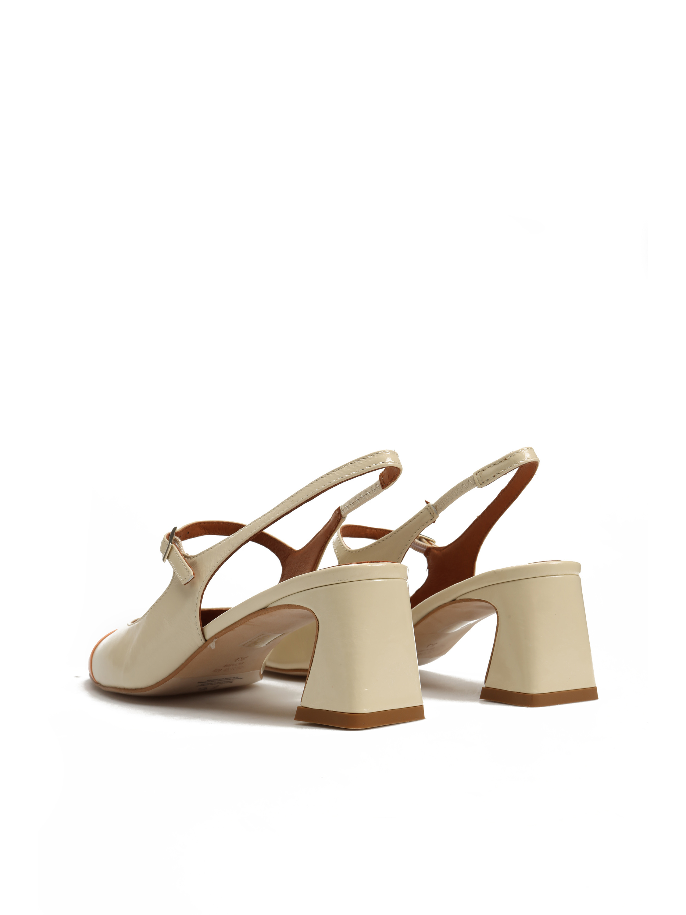 Czółenka z odkrytą piętą to must have sezonu. Cholewka w kolorze złamanej bieli wykonana jest z lakierowanej skóry. Posiada zapinany, regulowany pasek oraz wszytą przy pięcie gumkę, która ułatwia zakładanie obuwia. Model z geometrycznym obcasem na słupku oraz kolorowym noskiem.