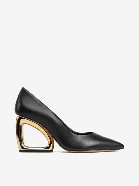 Niezwykle efektowne czółenka w czarnym kolorze. Nosek w szpic, cholewka ze skóry naturalnej i obcas geometryczny.