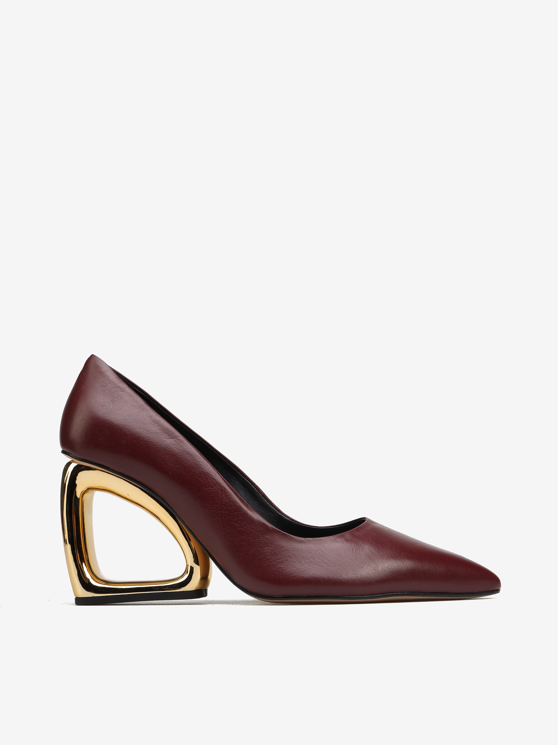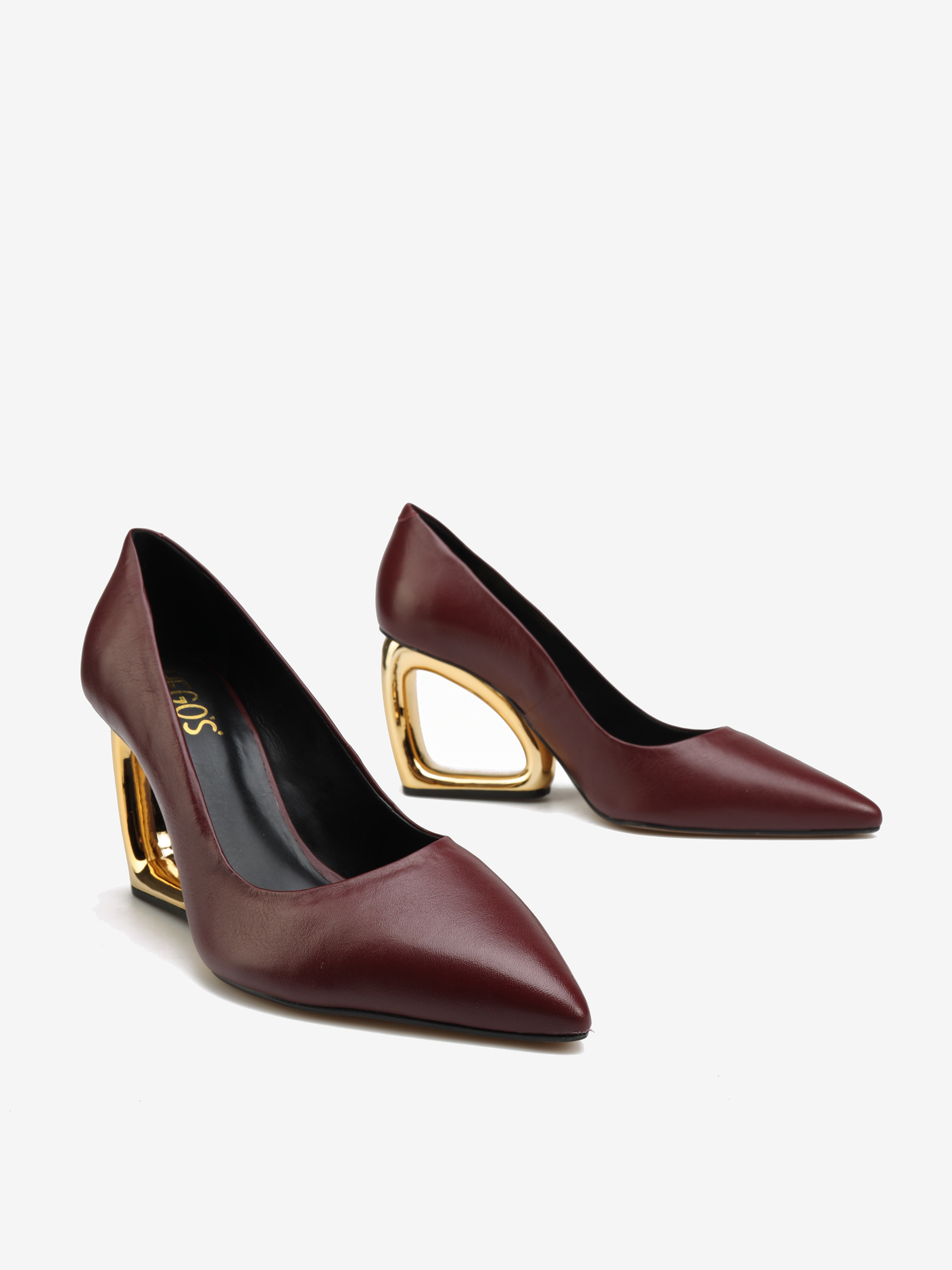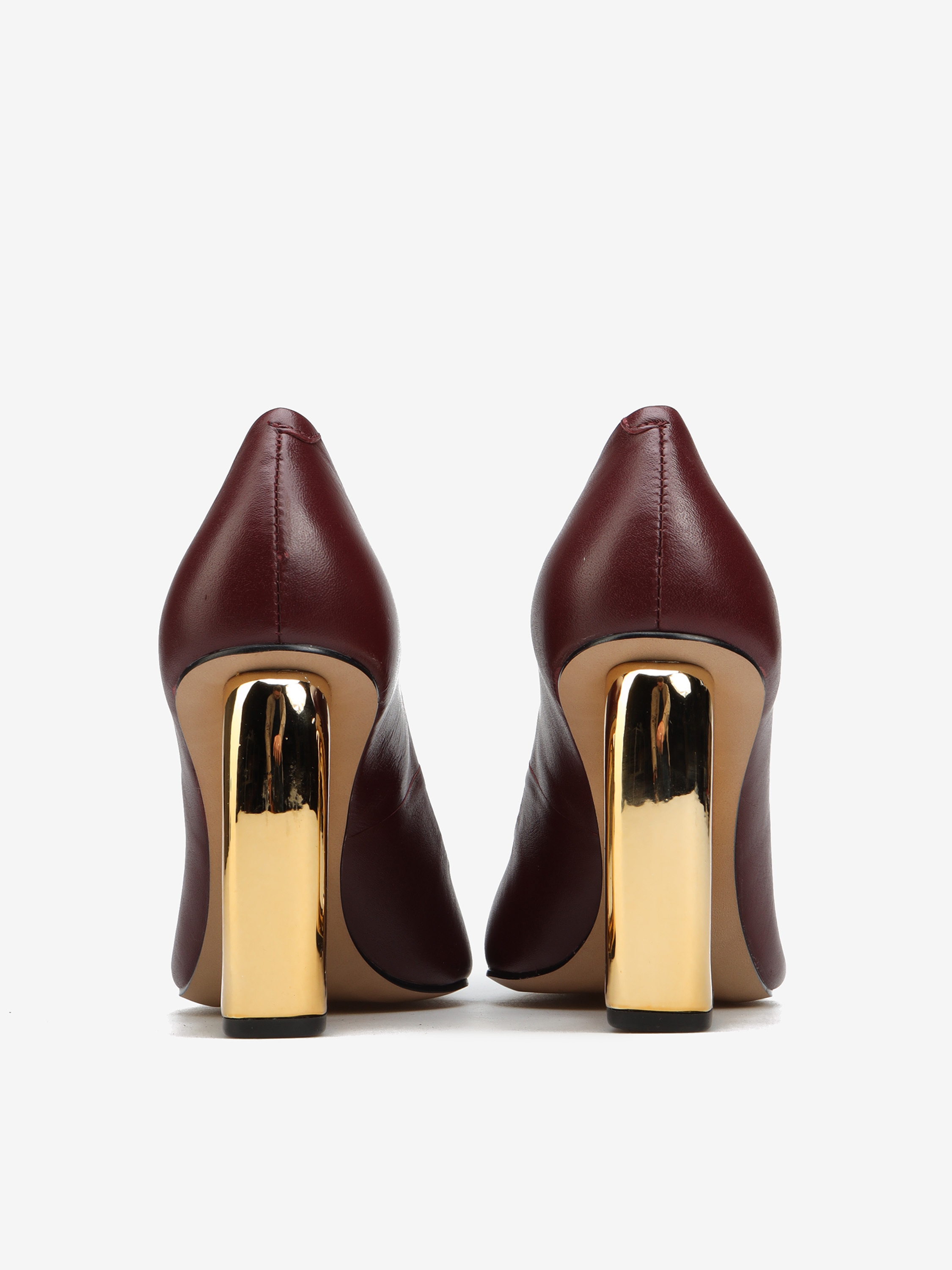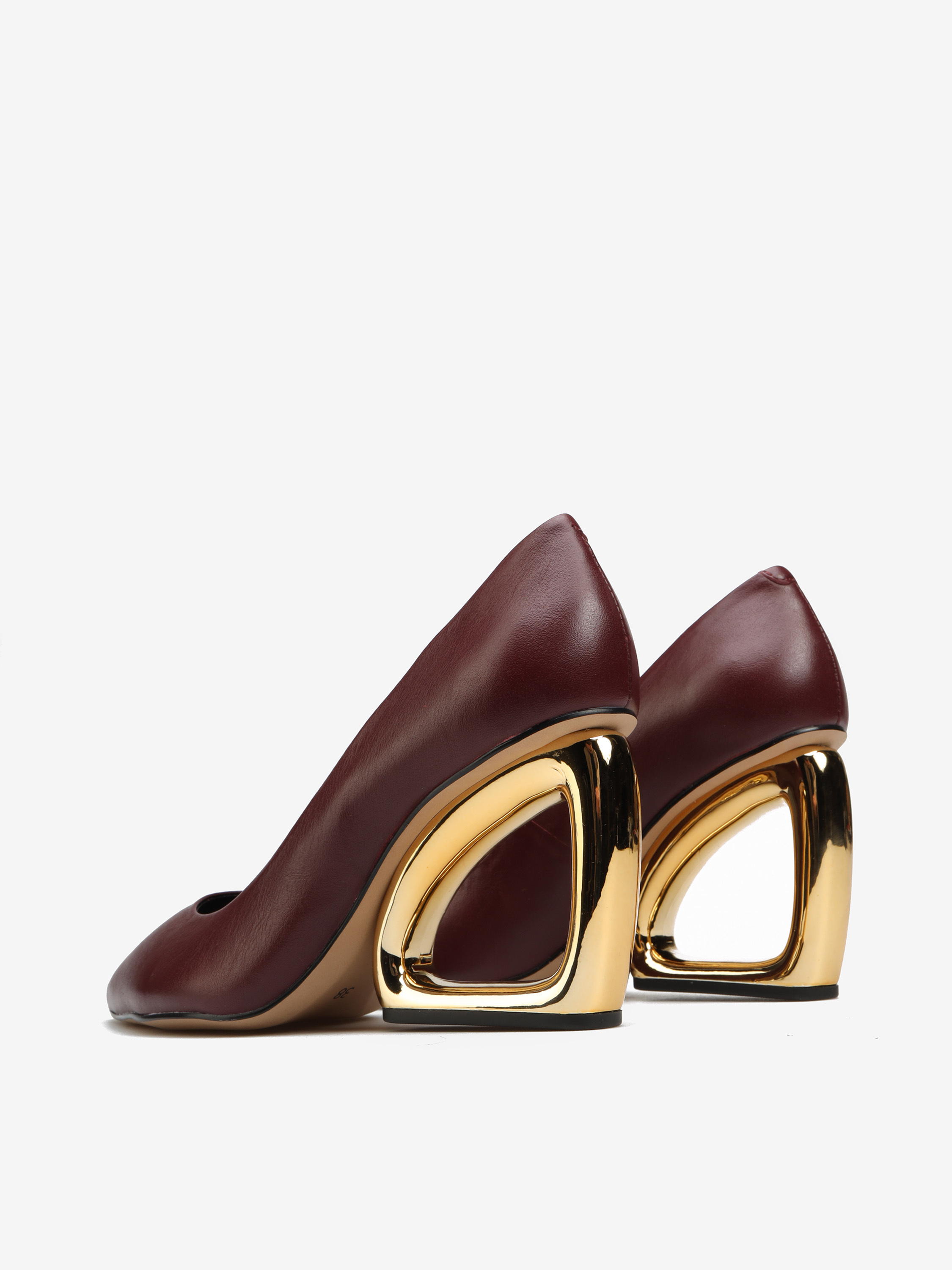 Niezwykle efektowne czółenka w bordowym kolorze. Nosek w szpic, cholewka ze skóry naturalnej i obcas geometryczny.