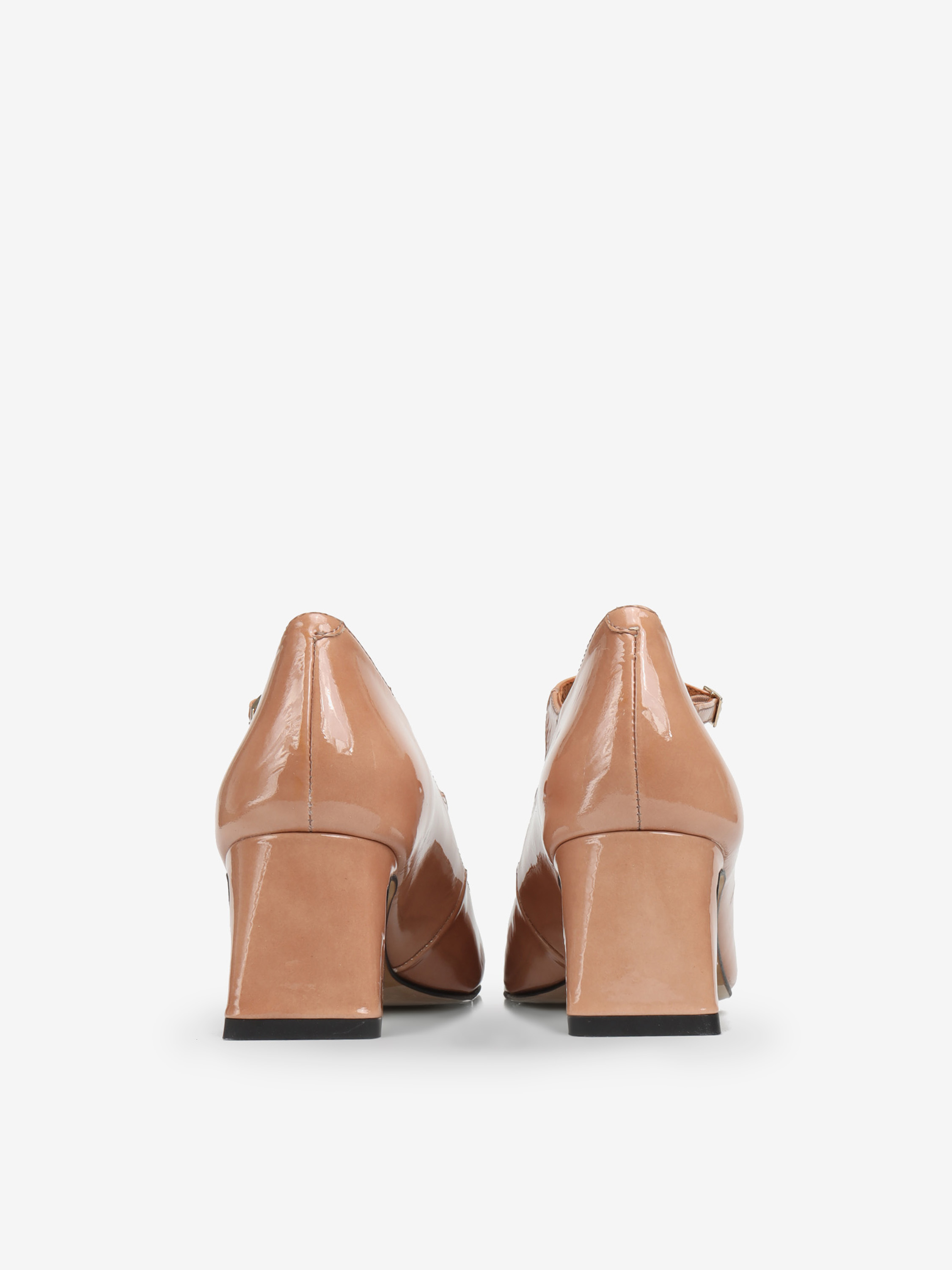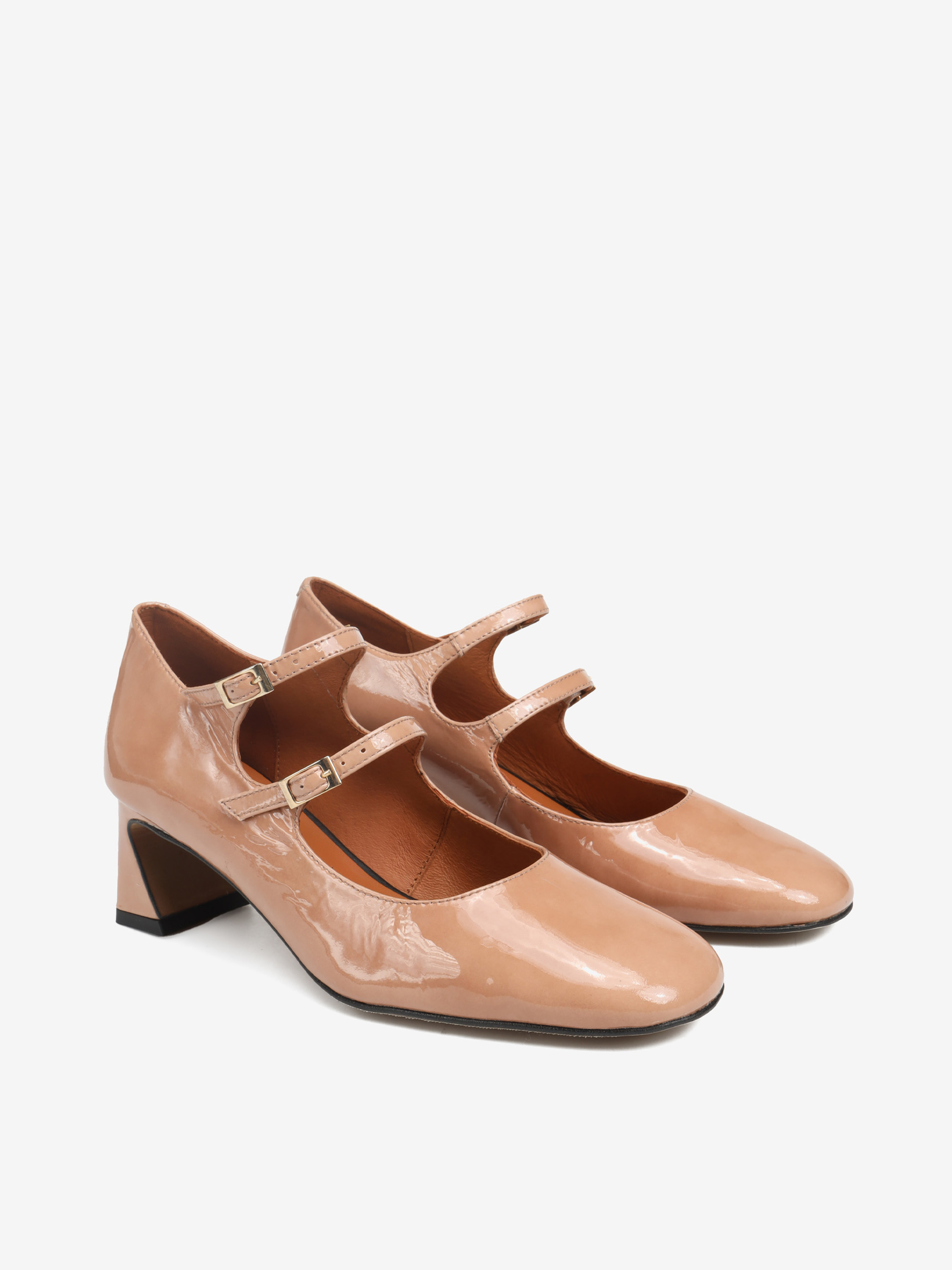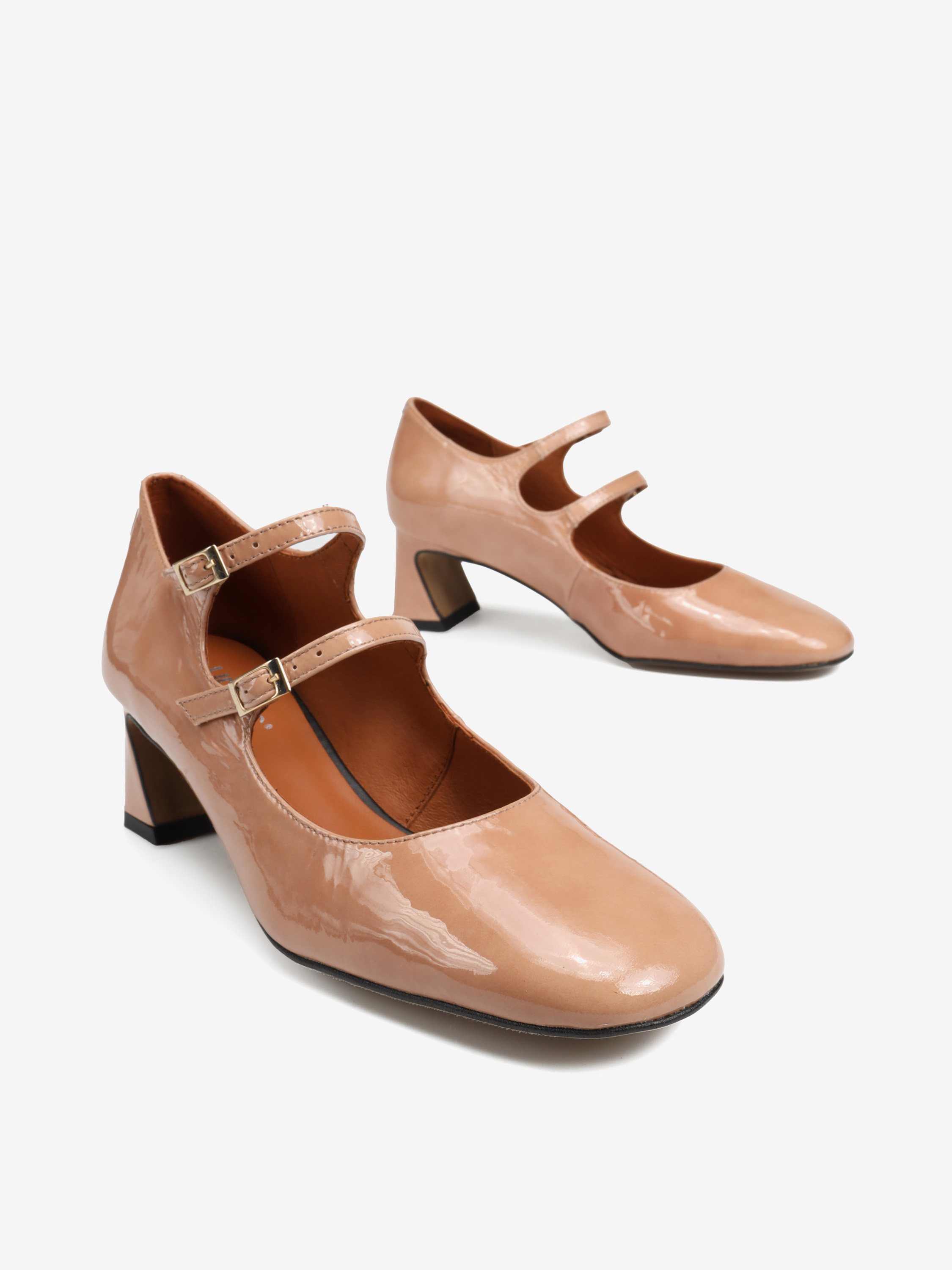 Mary Jane wykonane ze skóry lakierowanej w beżowym kolorze, osadzone na 5,5 cm obcasie.