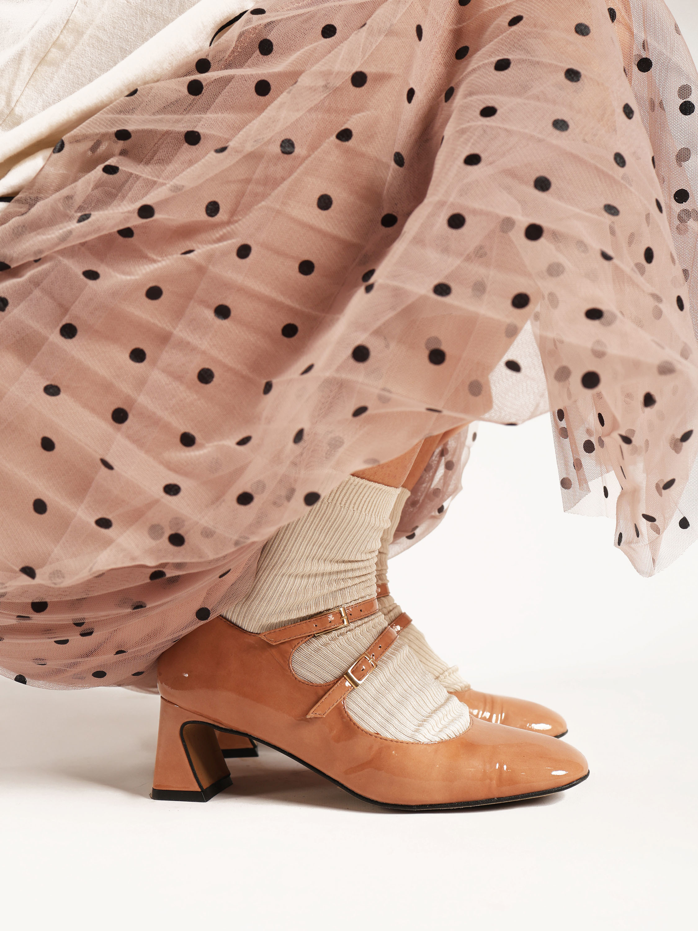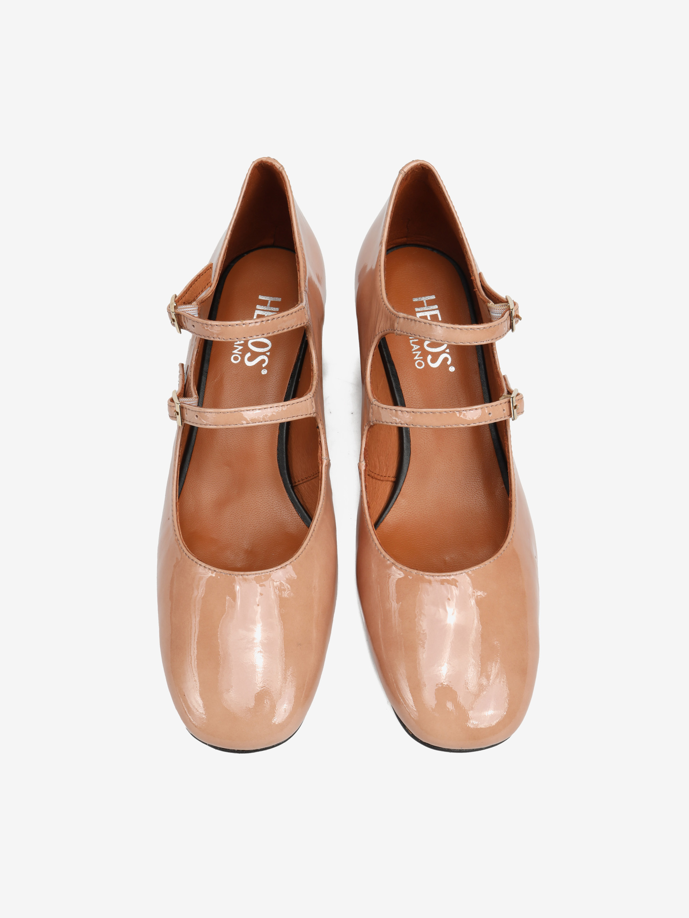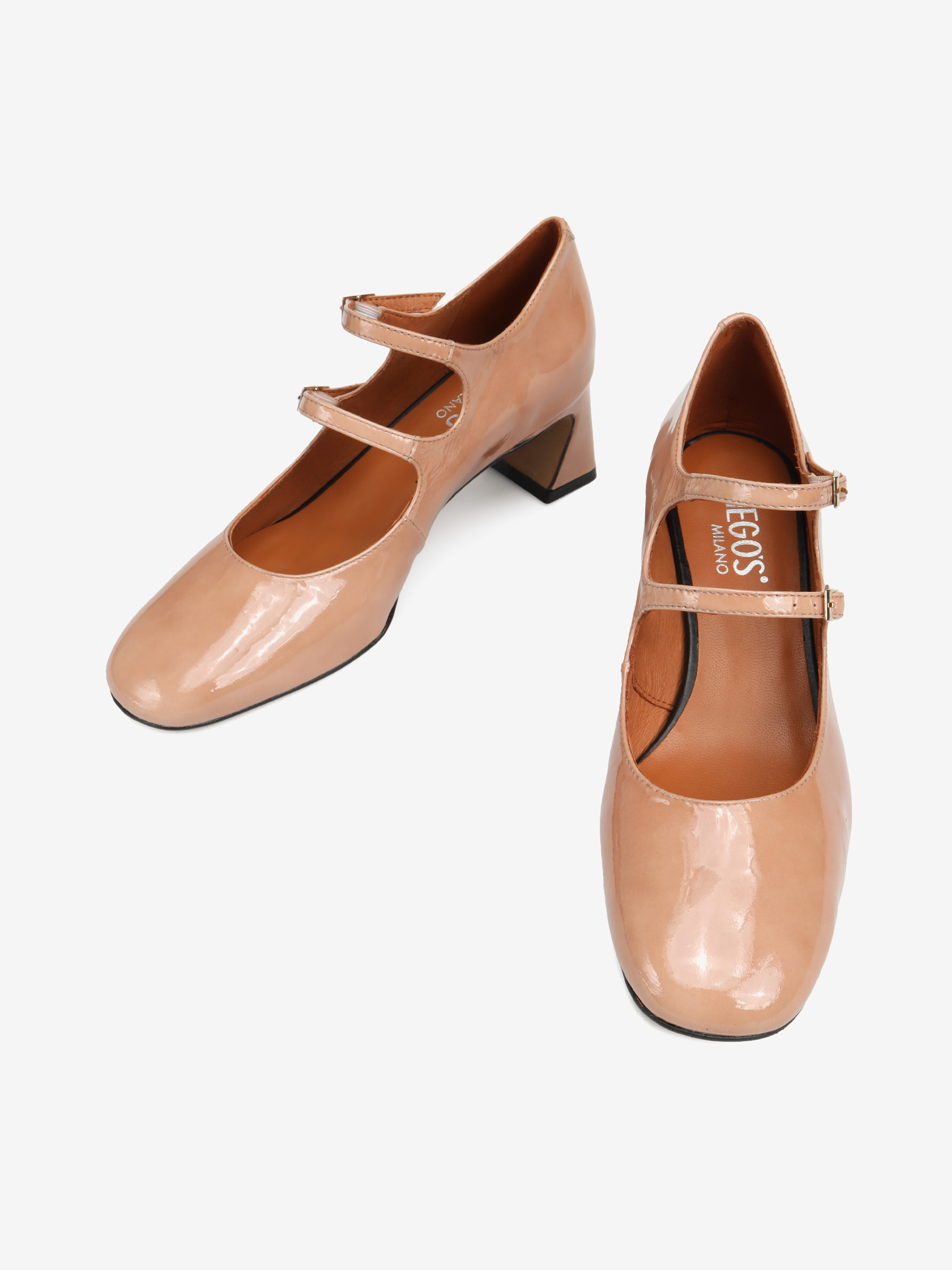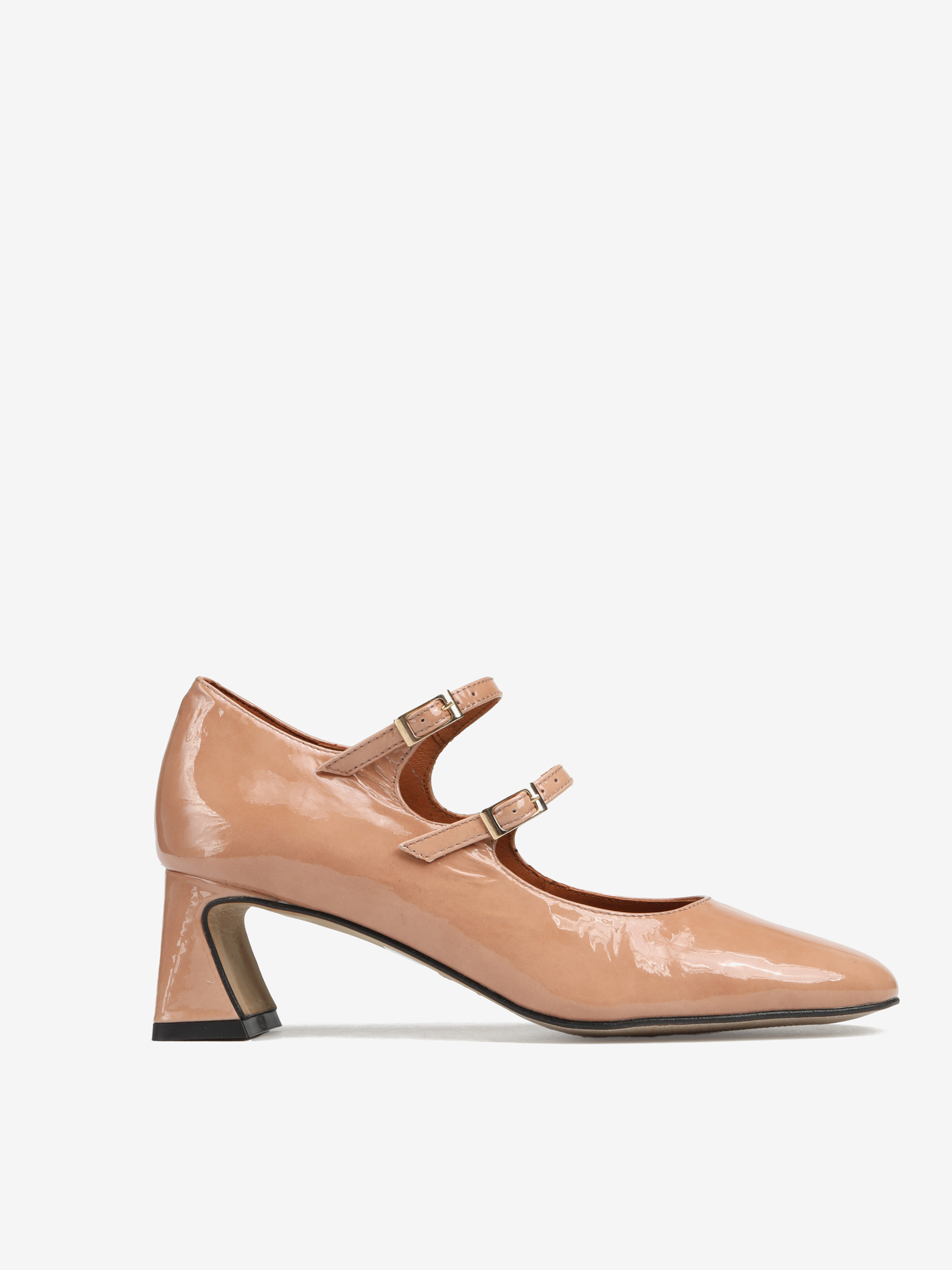 Mary Jane wykonane ze skóry lakierowanej w beżowym kolorze, osadzone na 5,5 cm obcasie.
