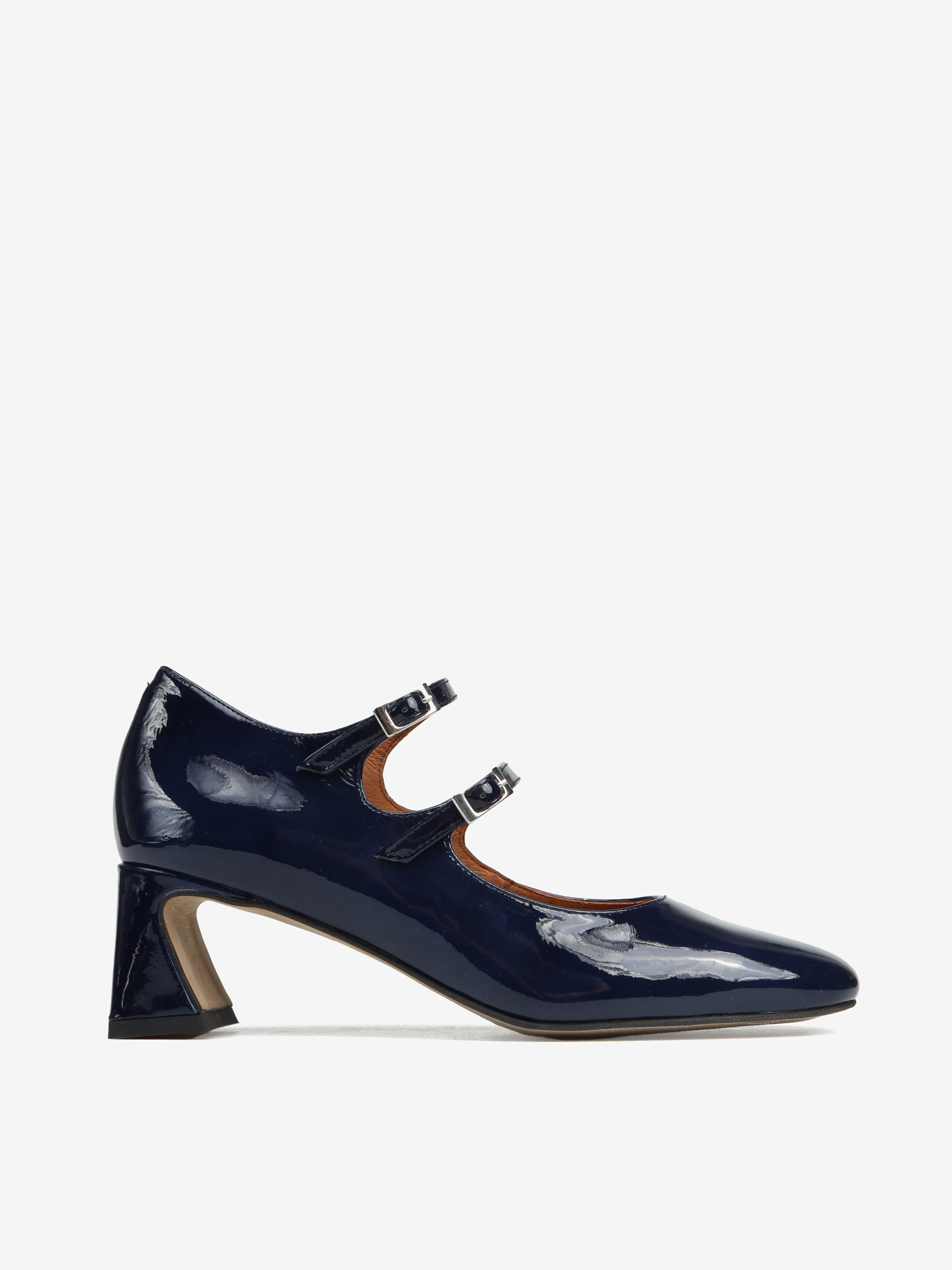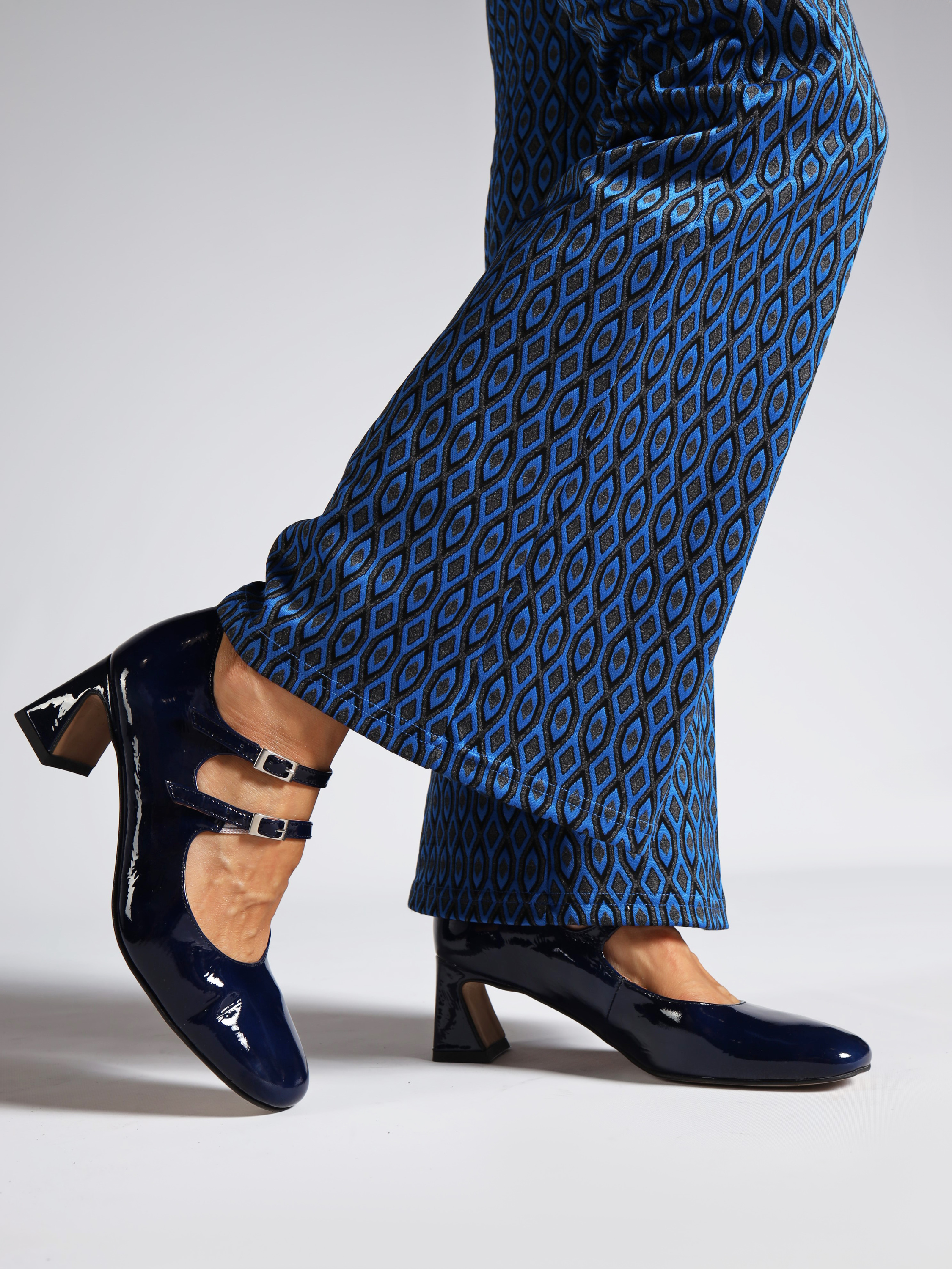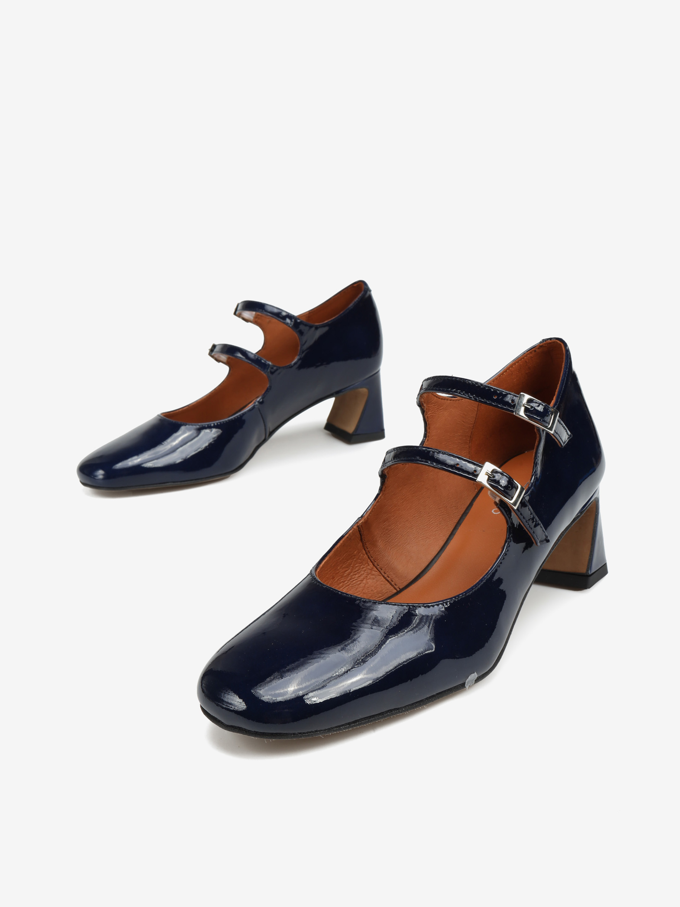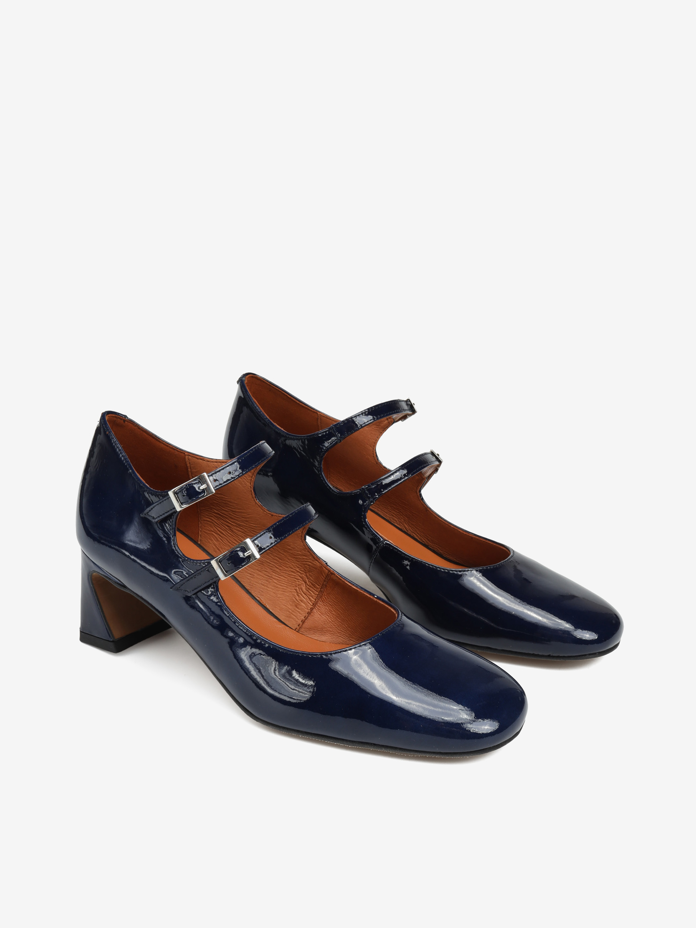Mary Jane wykonane ze skóry lakierowanej w granatowym kolorze, osadzone na 5,5 cm obcasie.