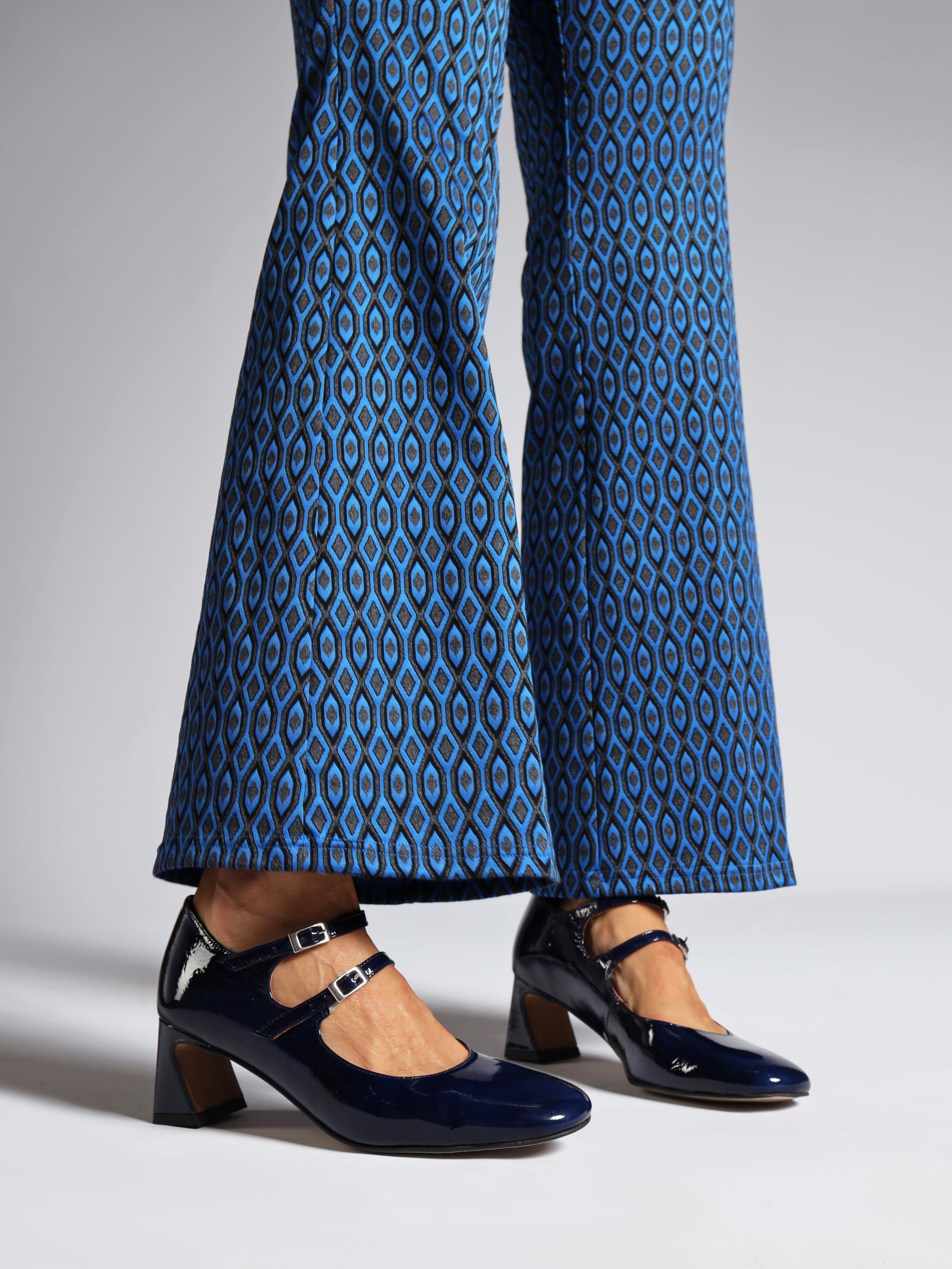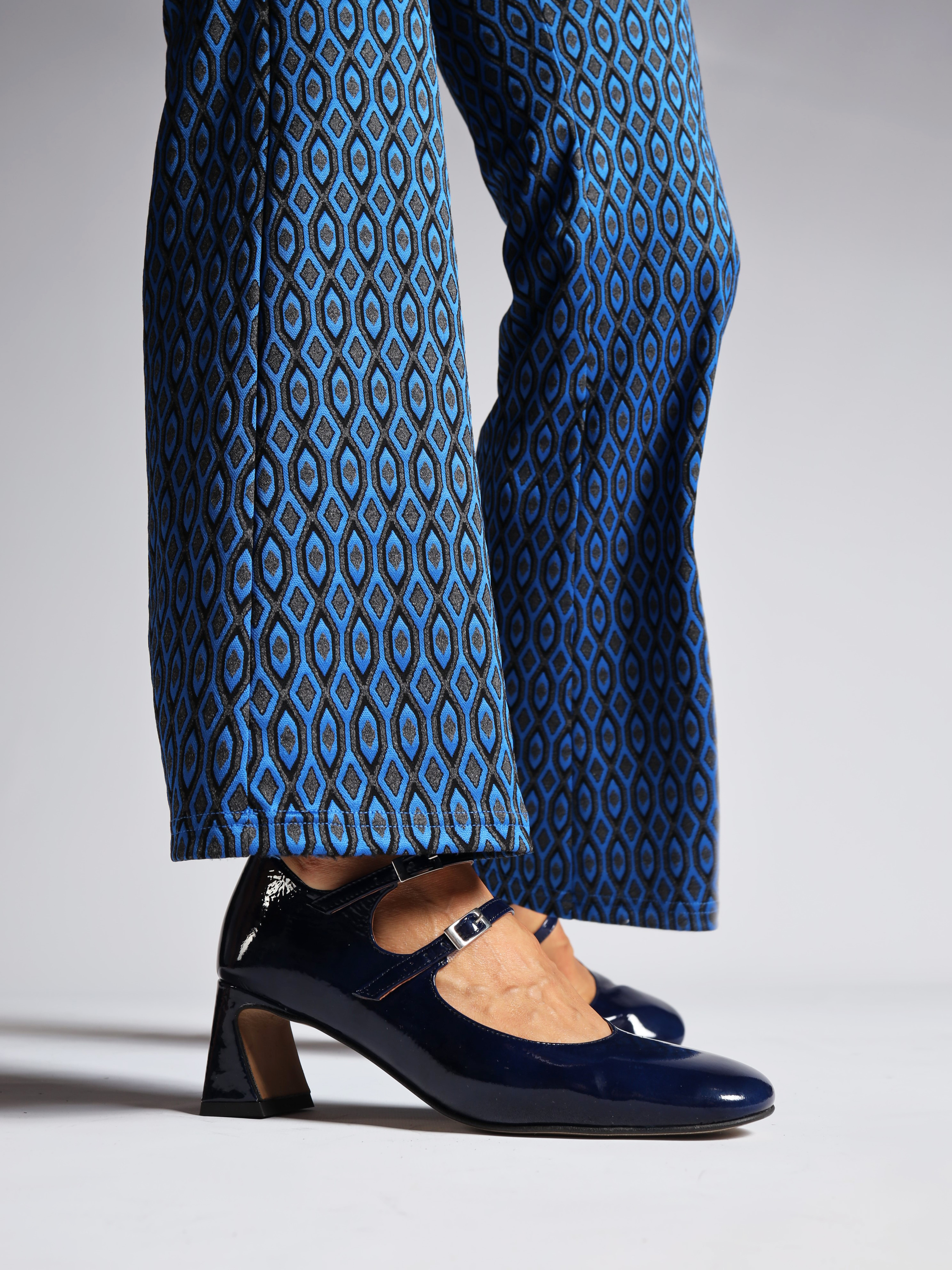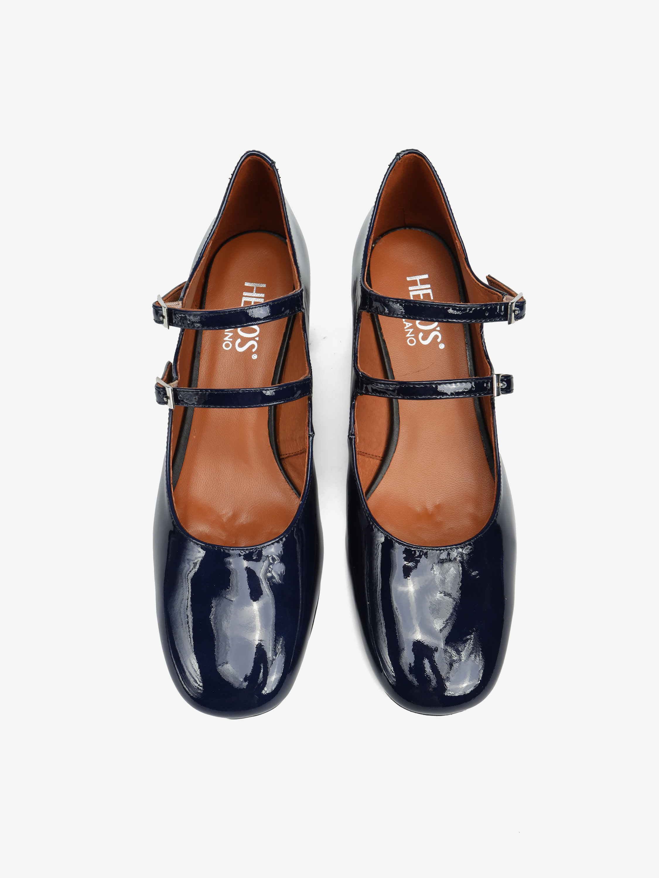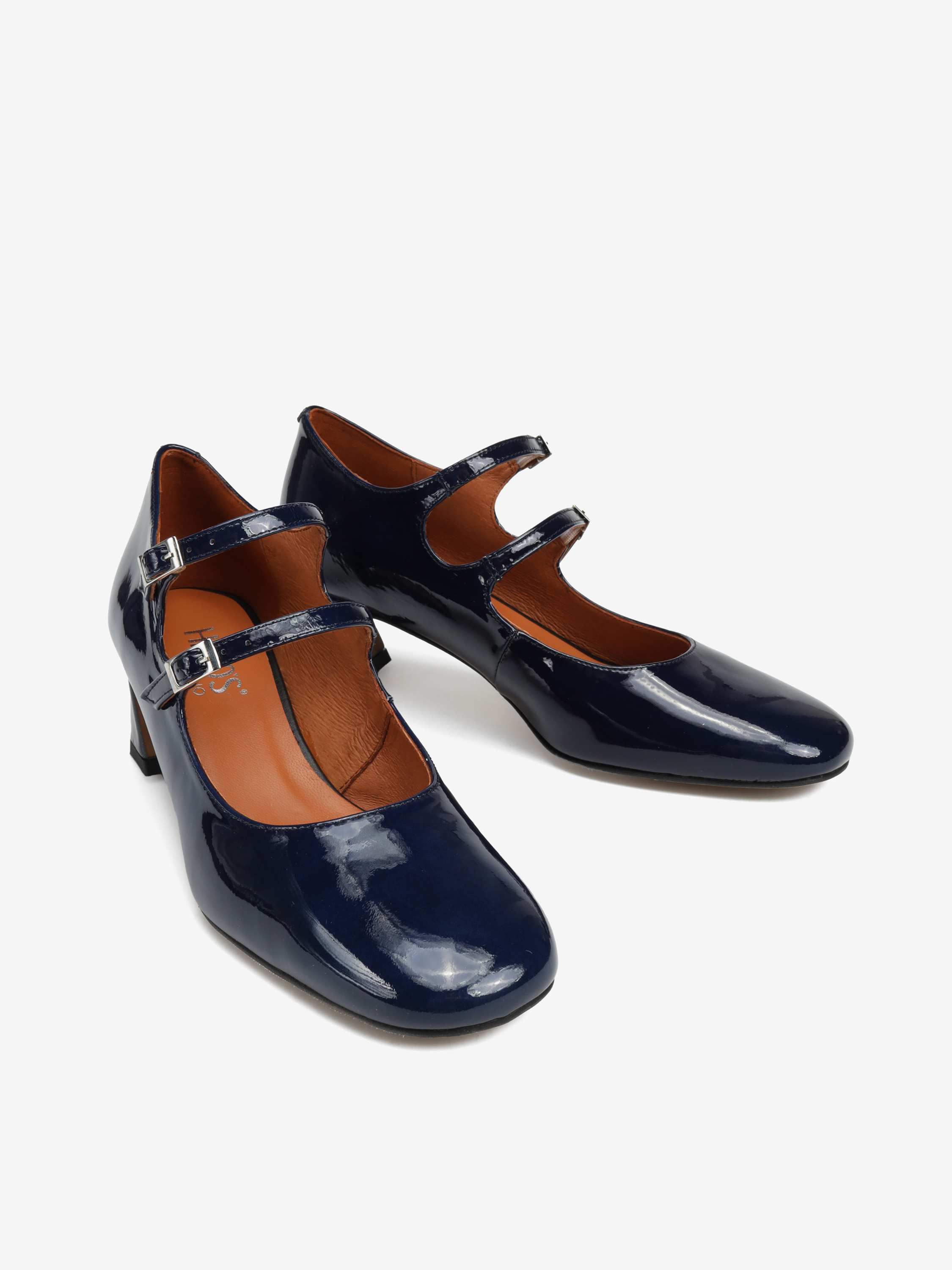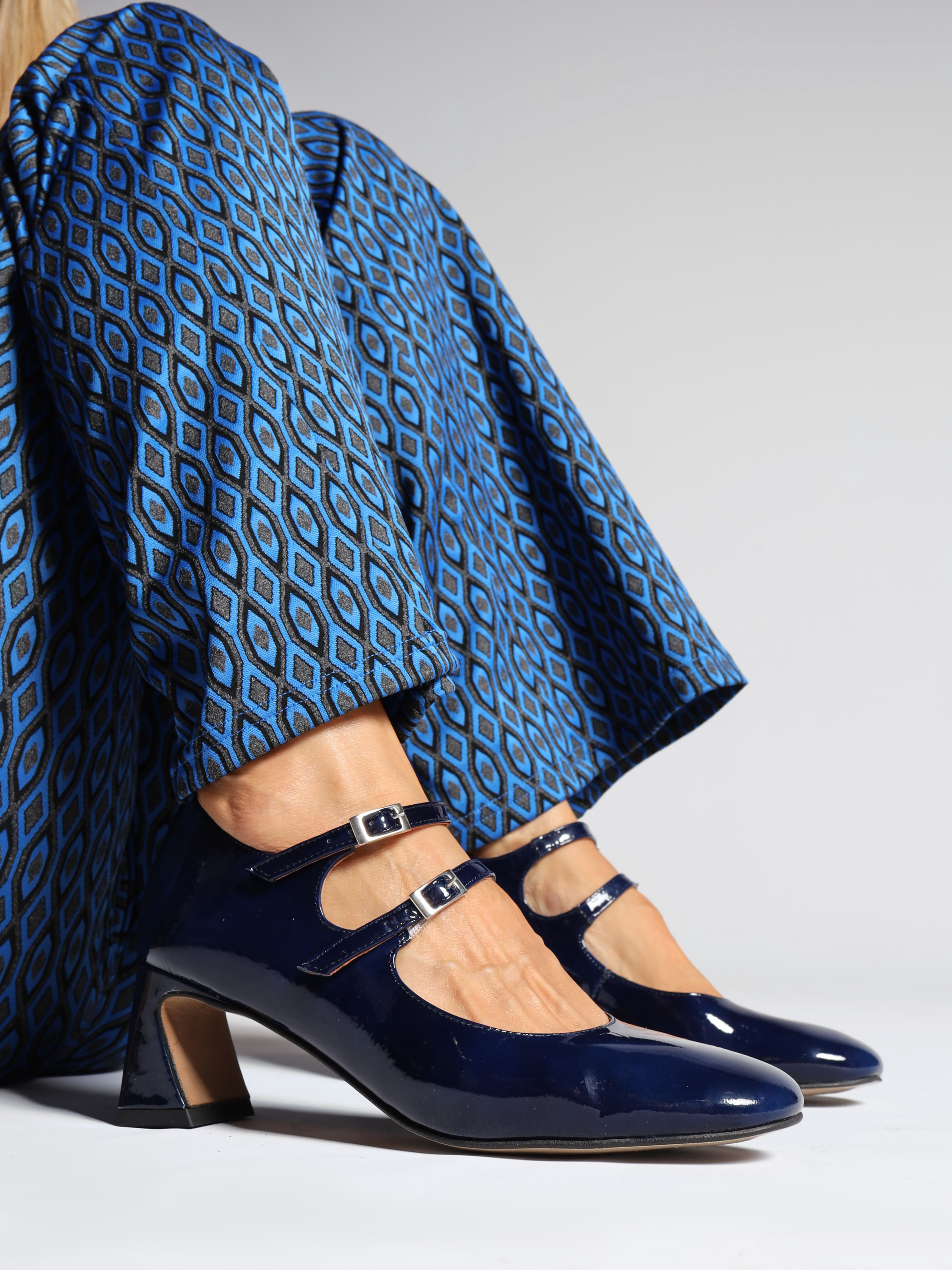 Mary Jane wykonane ze skóry lakierowanej w granatowym kolorze, osadzone na 5,5 cm obcasie.