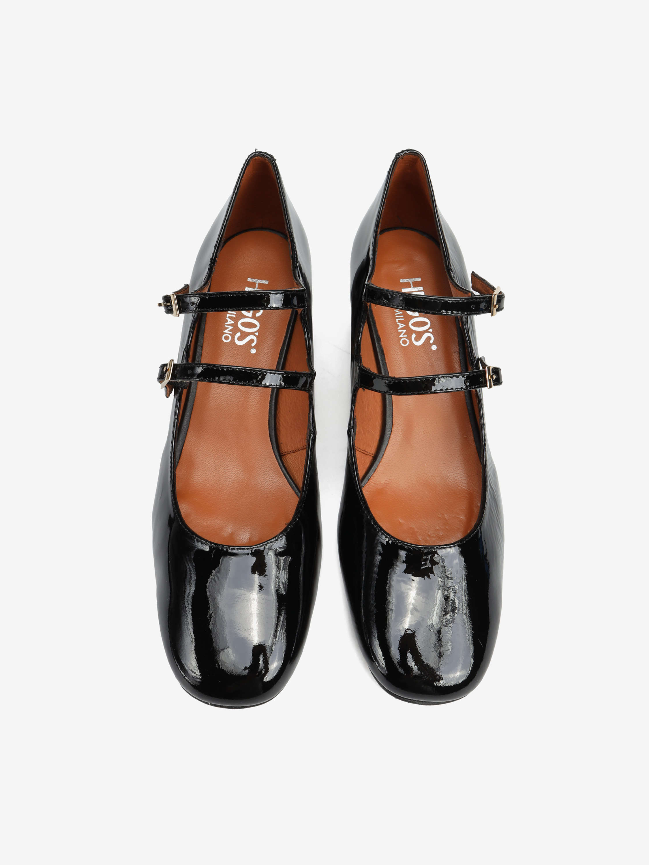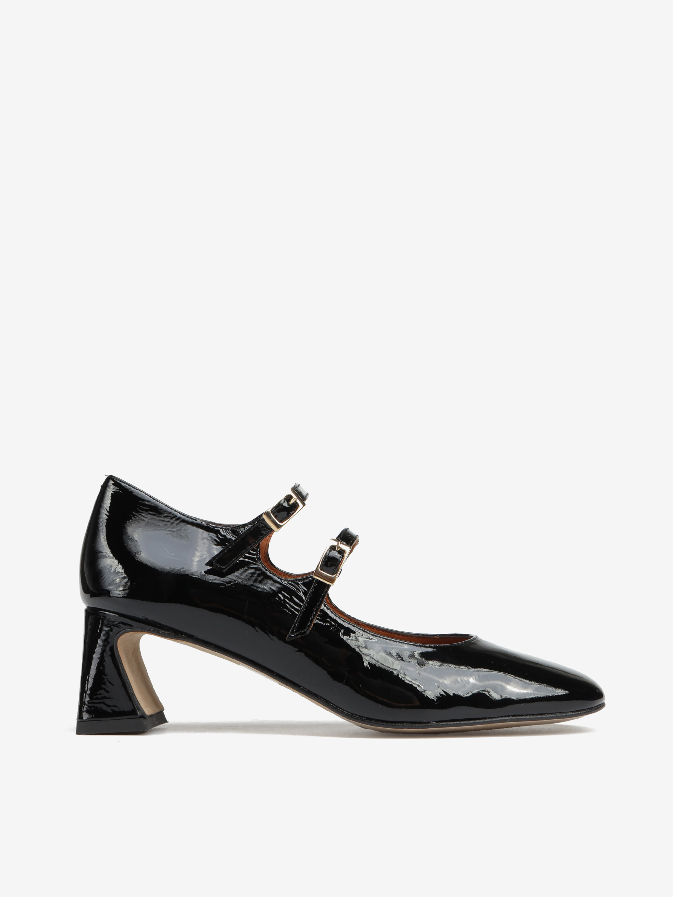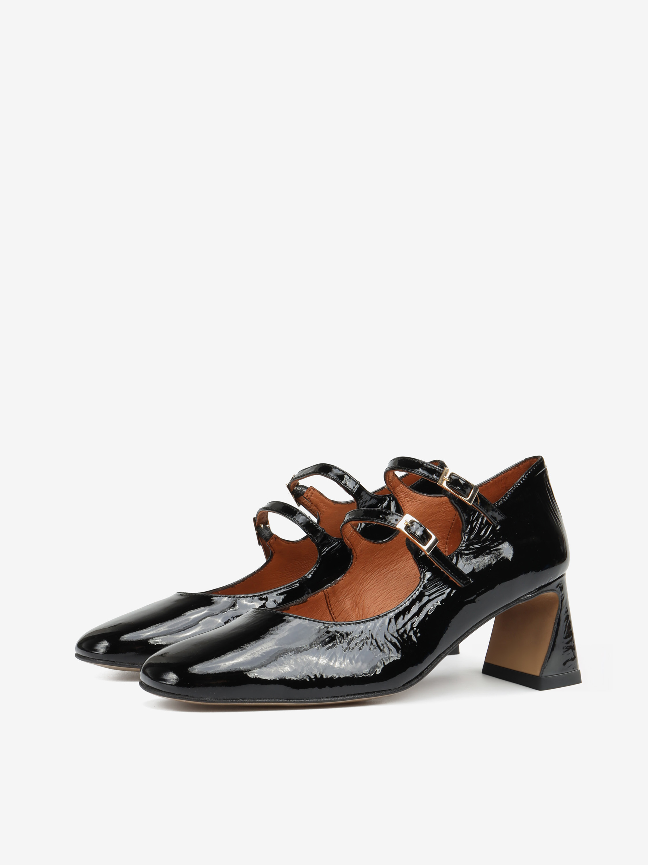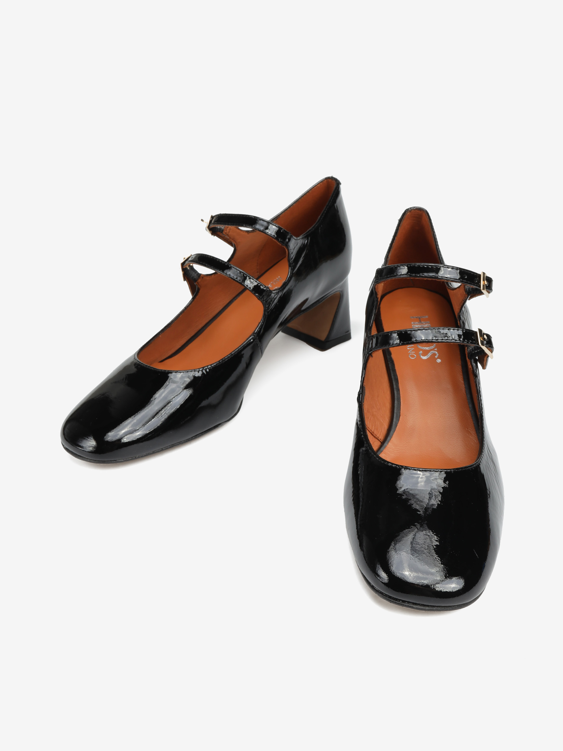 Mary Jane wykonane ze skóry lakierowanej w czarnym kolorze, osadzone na 5,5 cm obcasie.