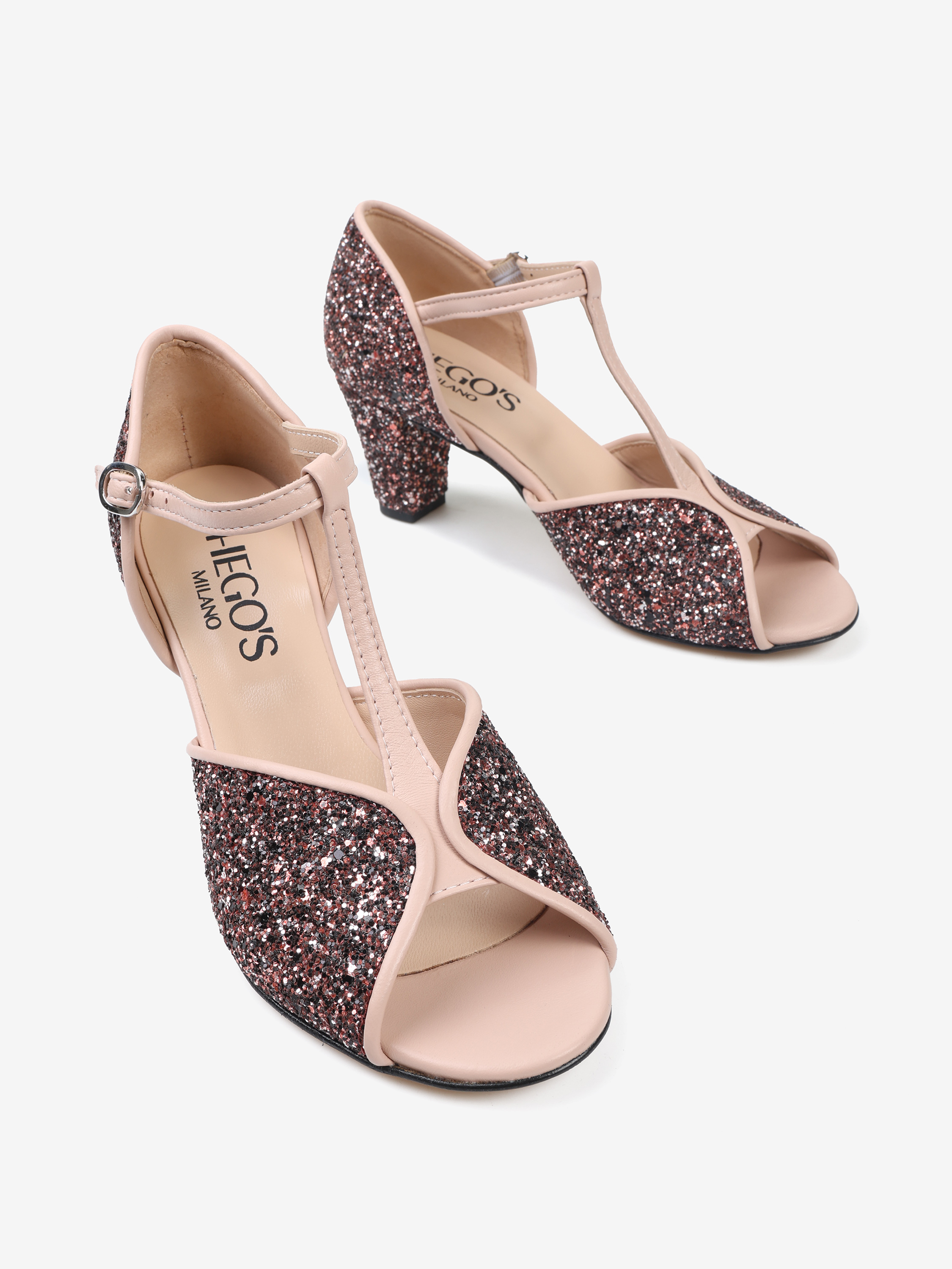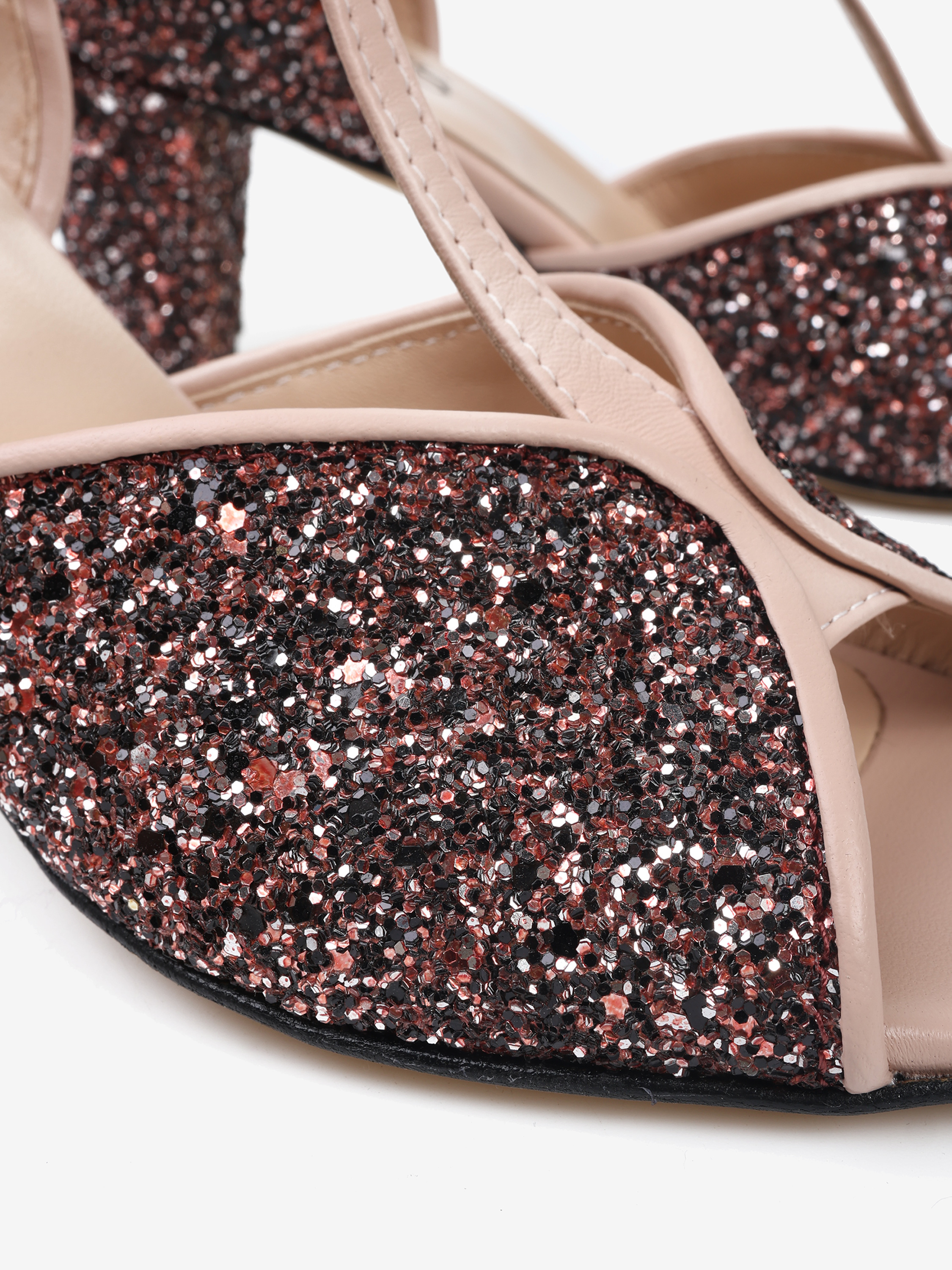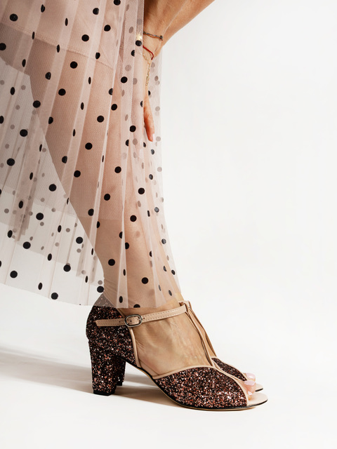 Czółenka peep toe z paskiem na podbiciu i regulowanym zapięciem na kostce. Wykończone gruboziarnistym brokatem.