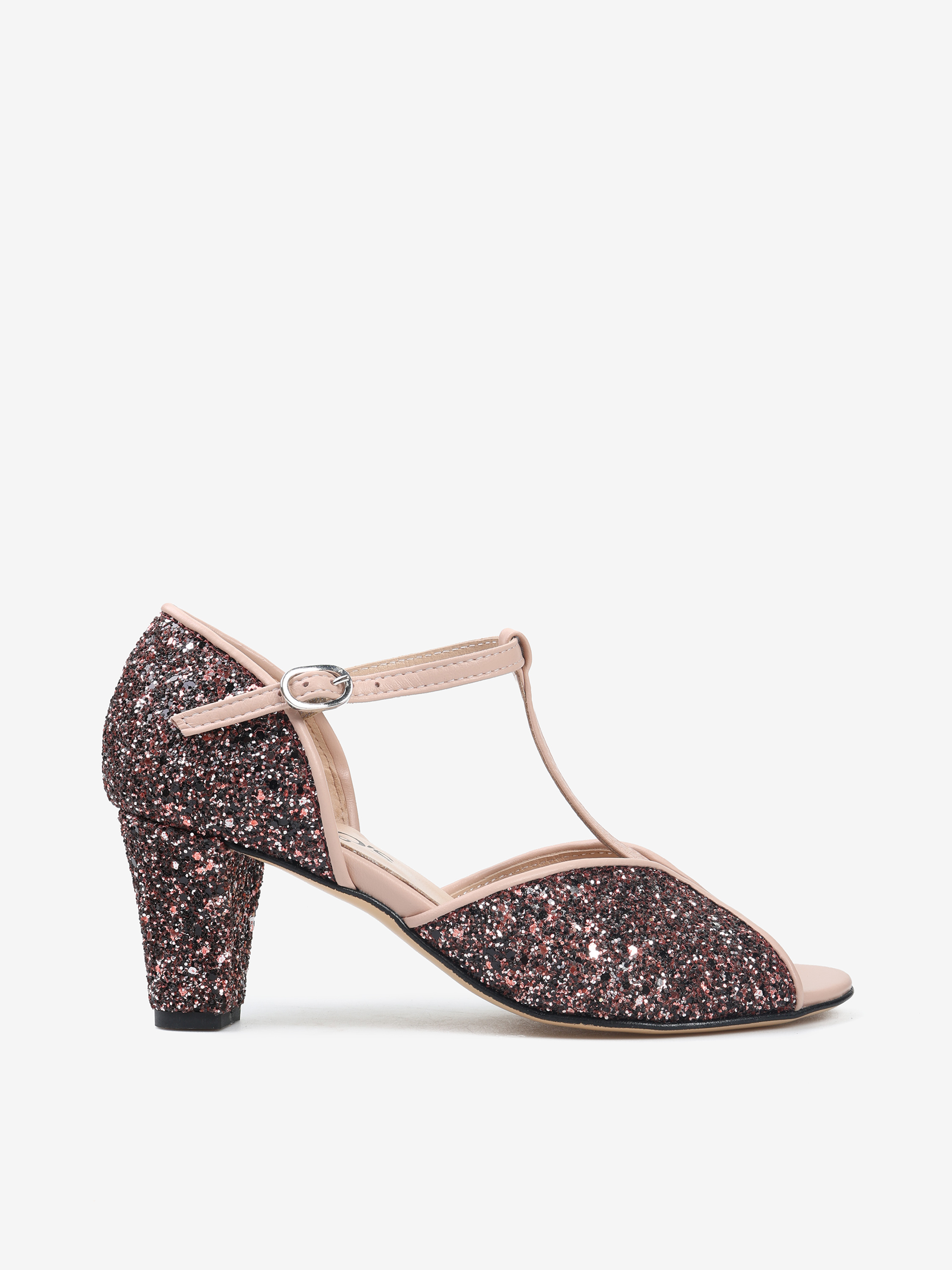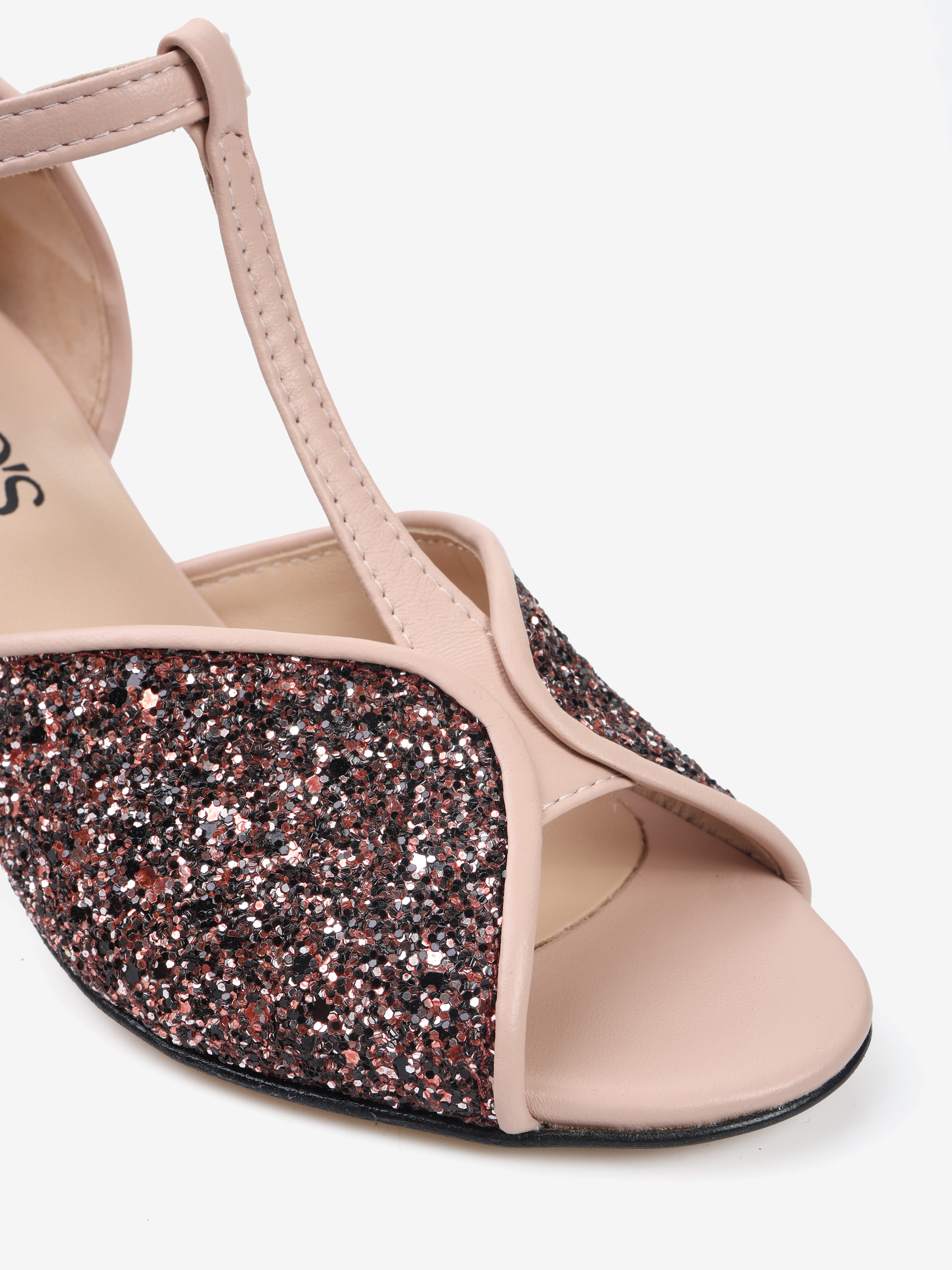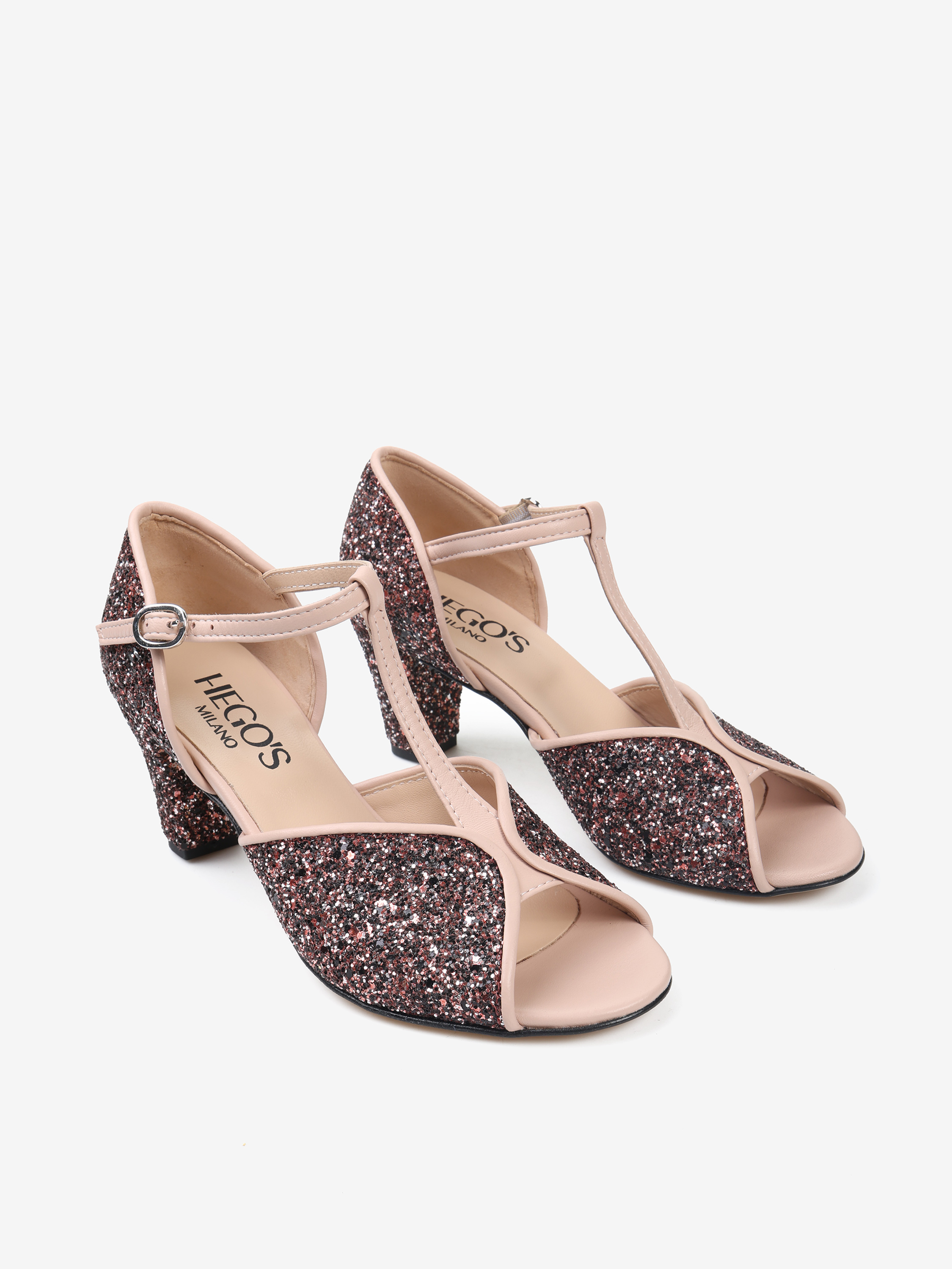 Czółenka peep toe z paskiem na podbiciu i regulowanym zapięciem na kostce. Wykończone gruboziarnistym brokatem.
