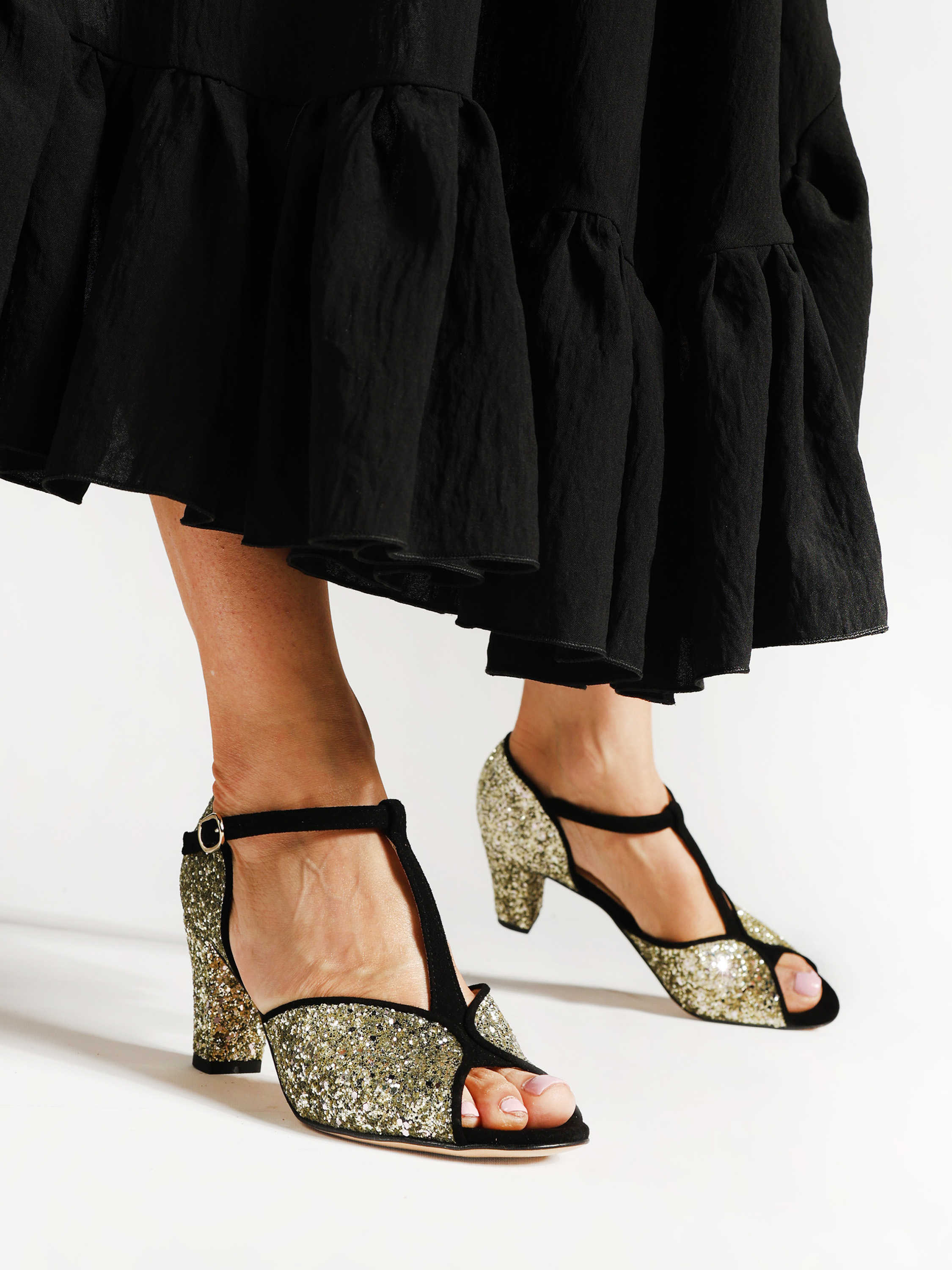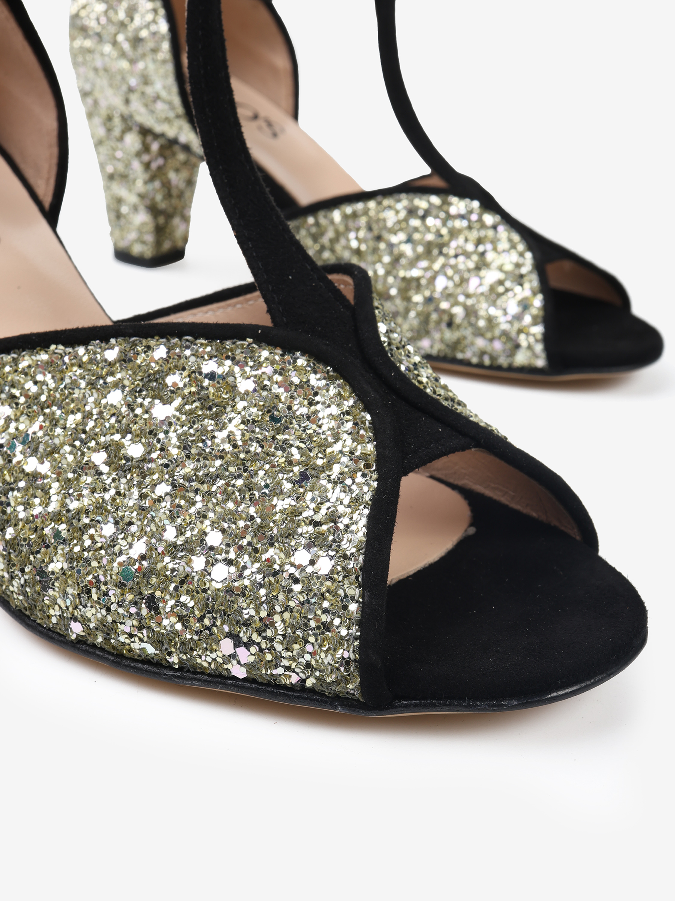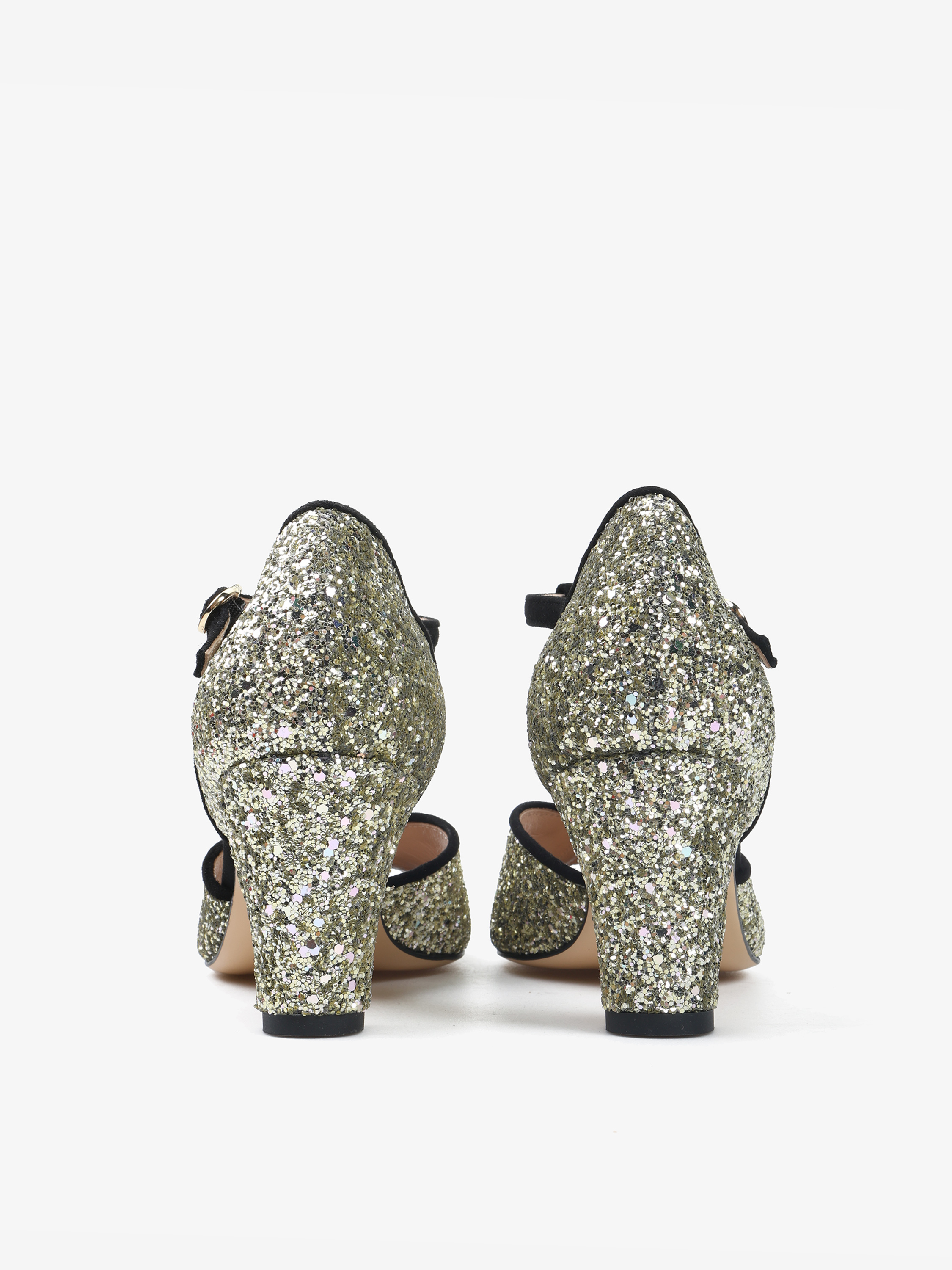 Czółenka peep toe z paskiem na podbiciu i regulowanym zapięciem na kostce. Wykończone gruboziarnistym brokatem.