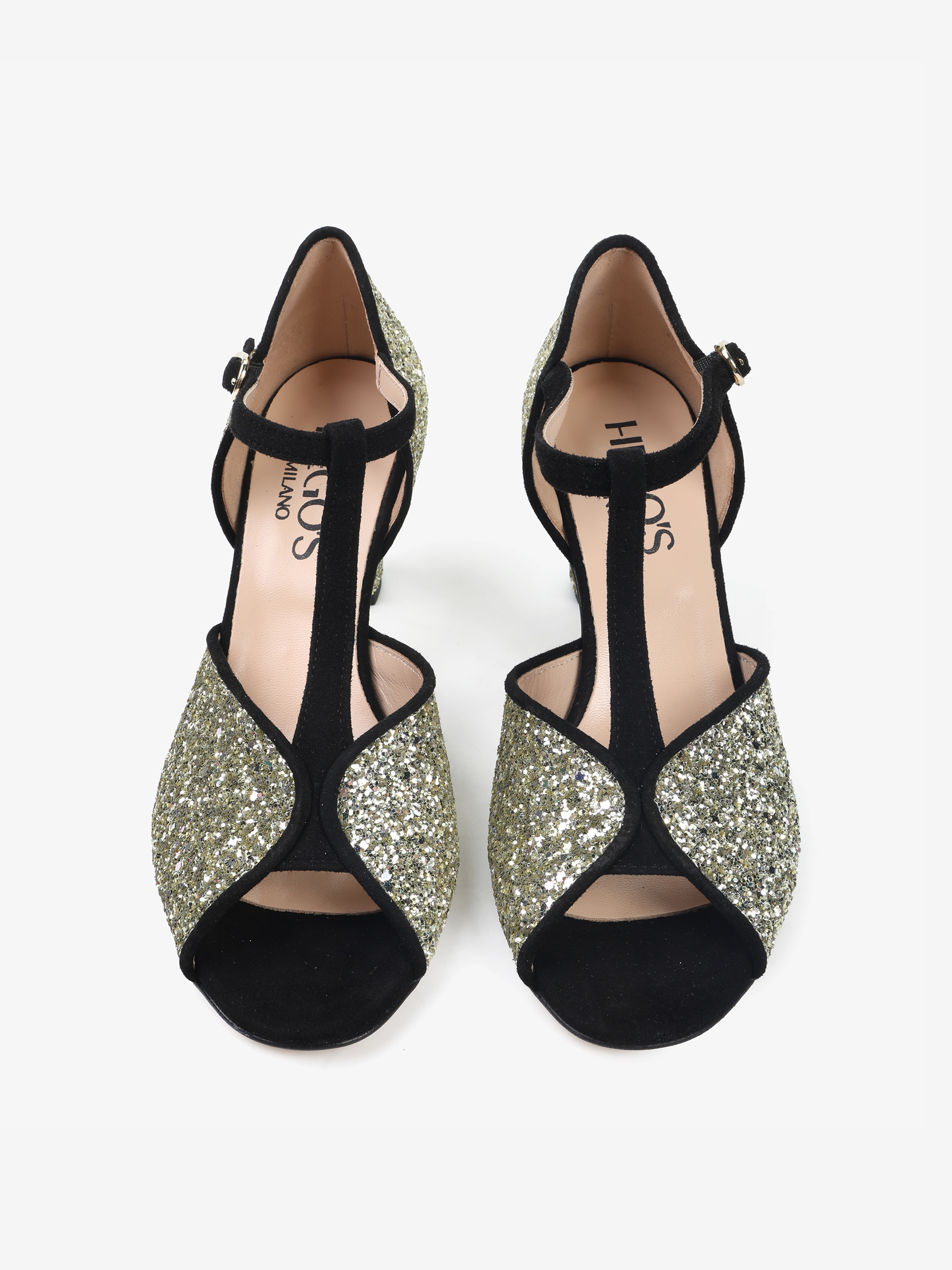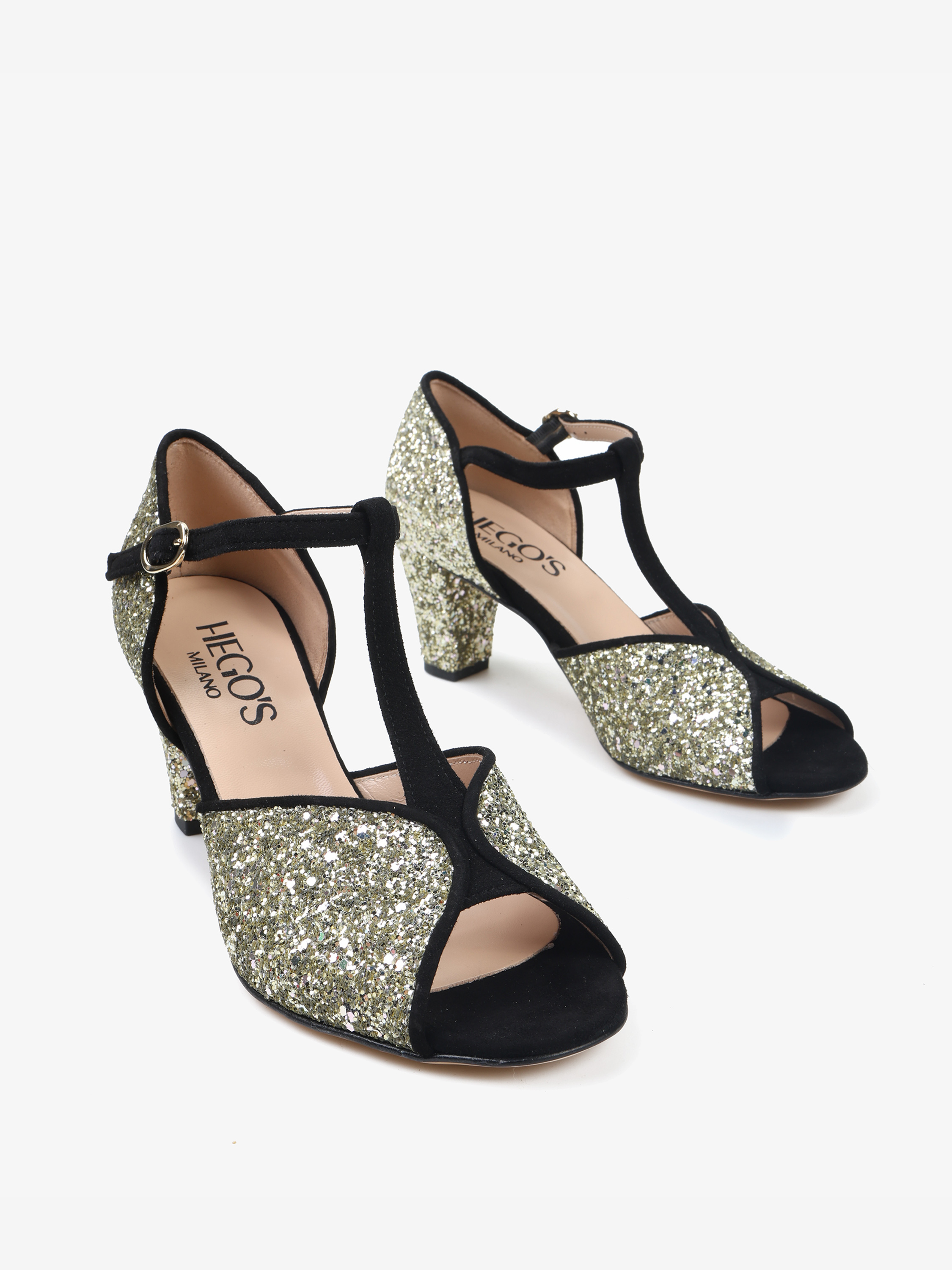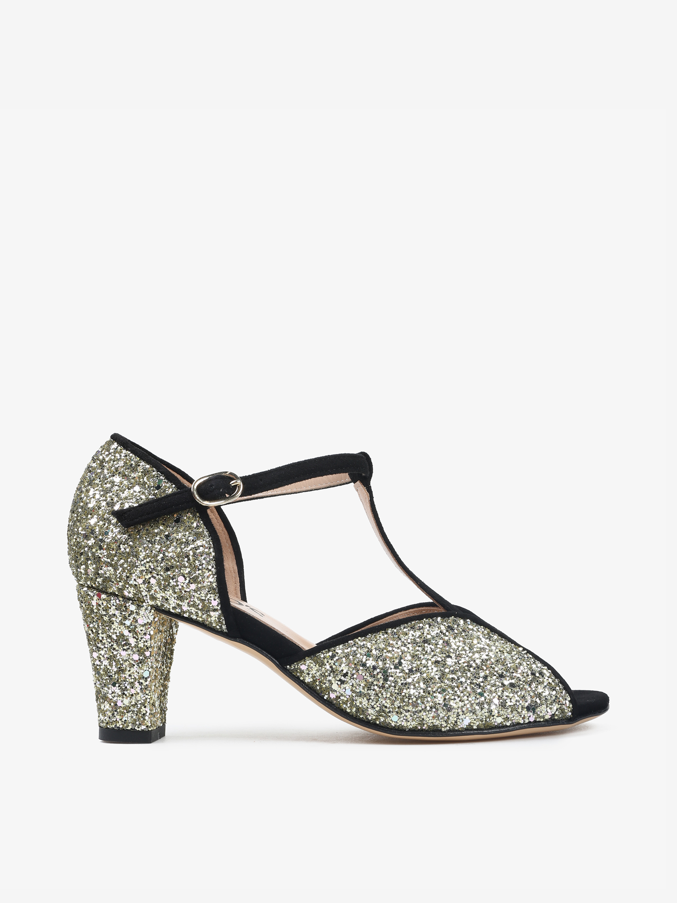 Czółenka peep toe z paskiem na podbiciu i regulowanym zapięciem na kostce. Wykończone gruboziarnistym brokatem.