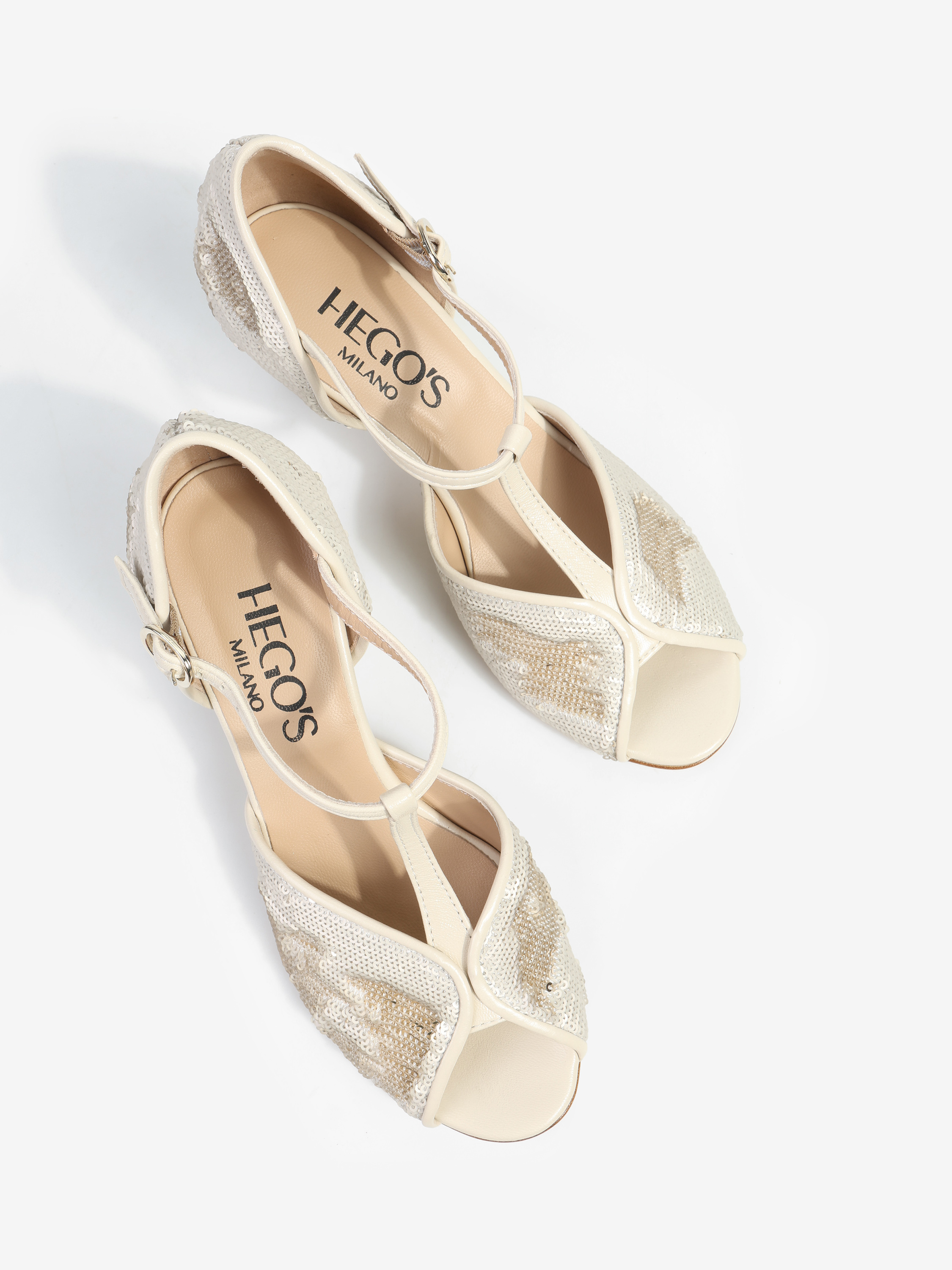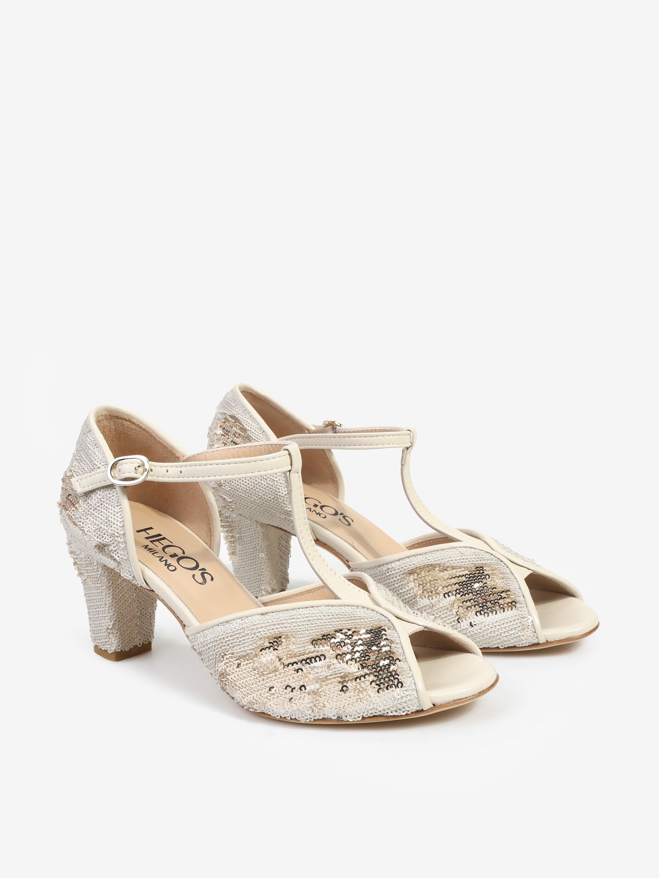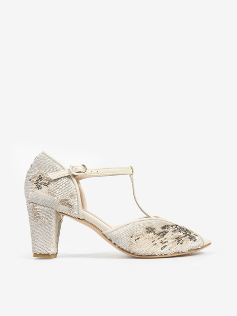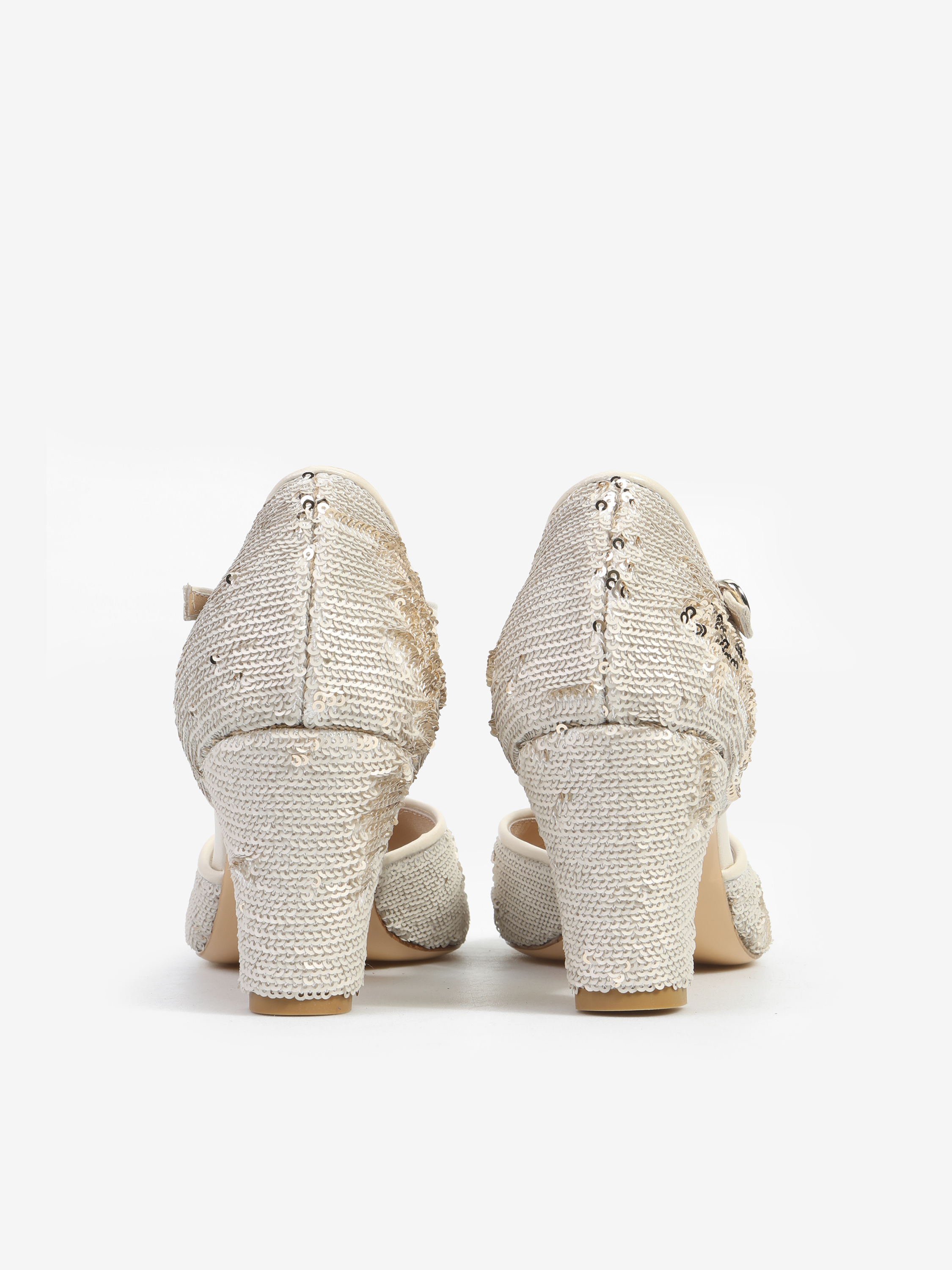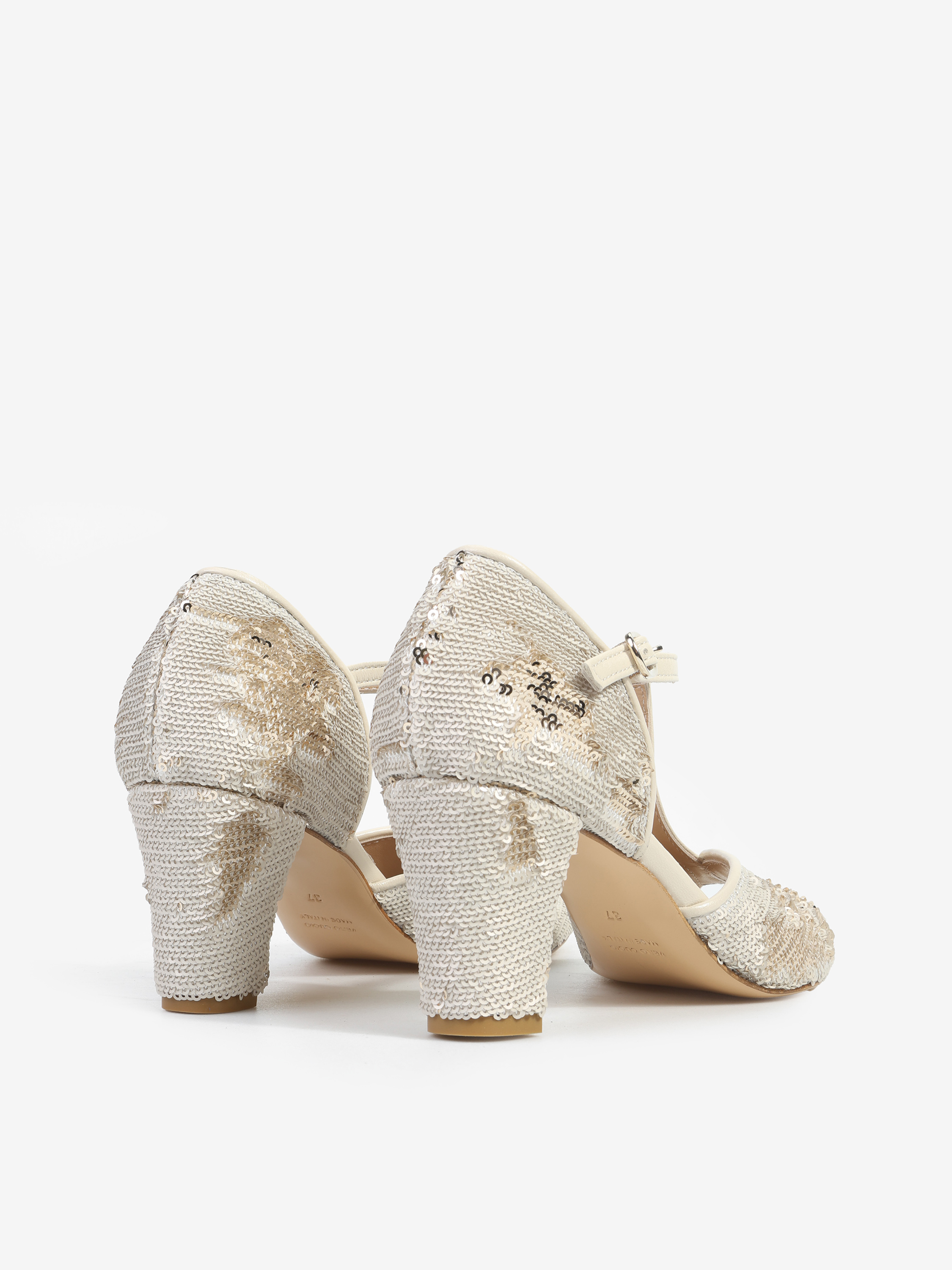 Czółenka peep toe z paskiem na podbiciu, zakrytą piętą i regulowanym zapięciem. Wykończone dwustronnymi cekinami, które można układać.