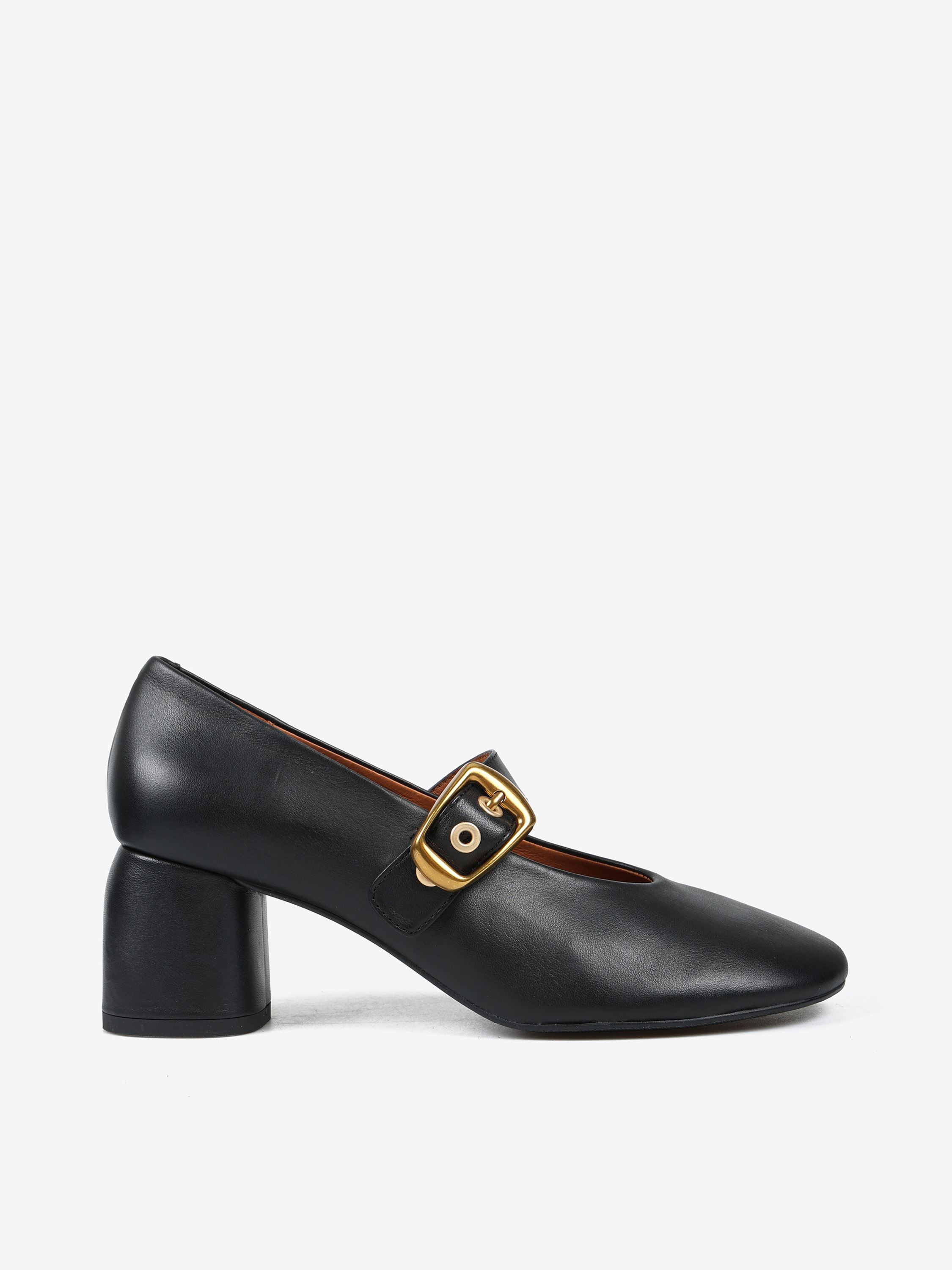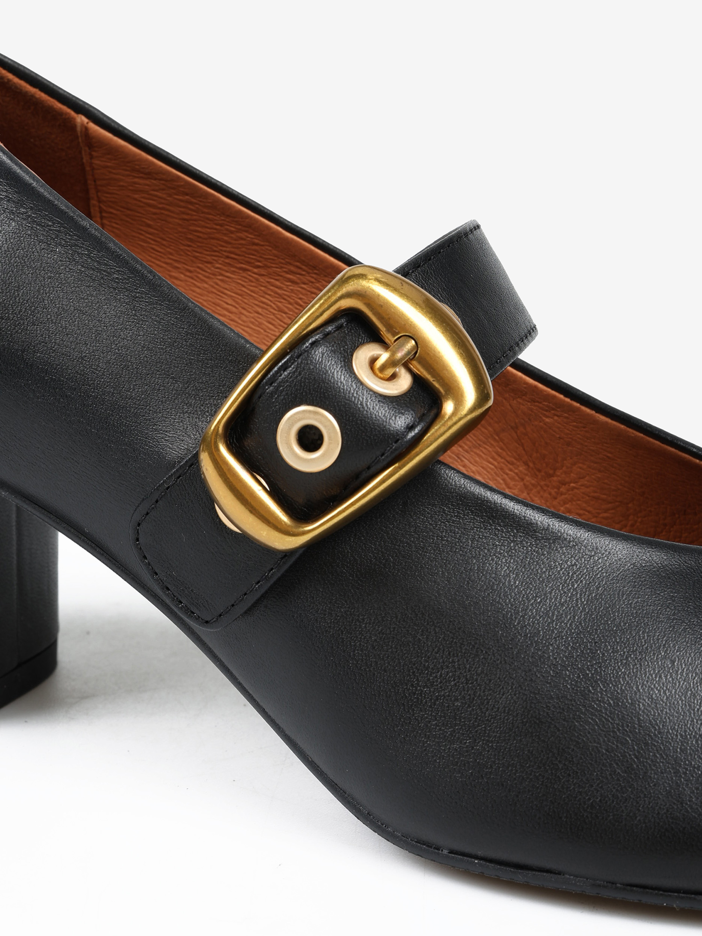 Czółenka Mary Jane na słupku. Owalne wycięcie i regulowany pasek.