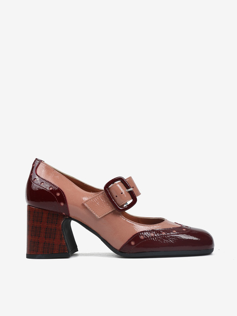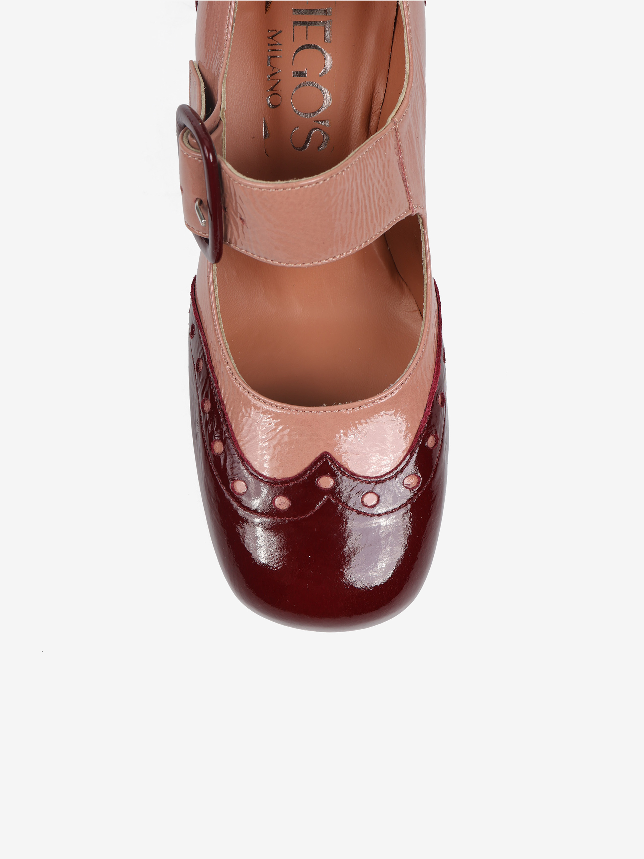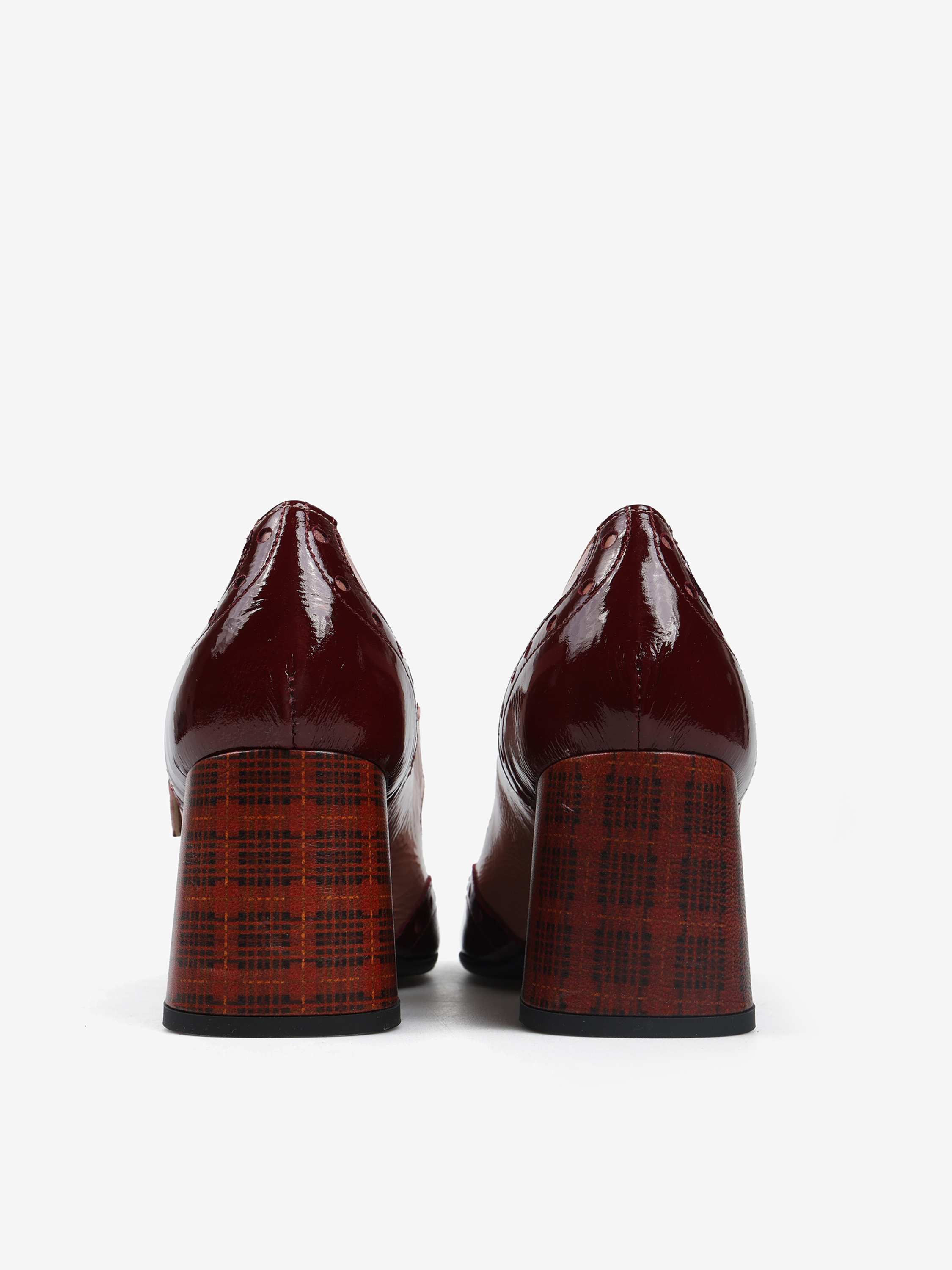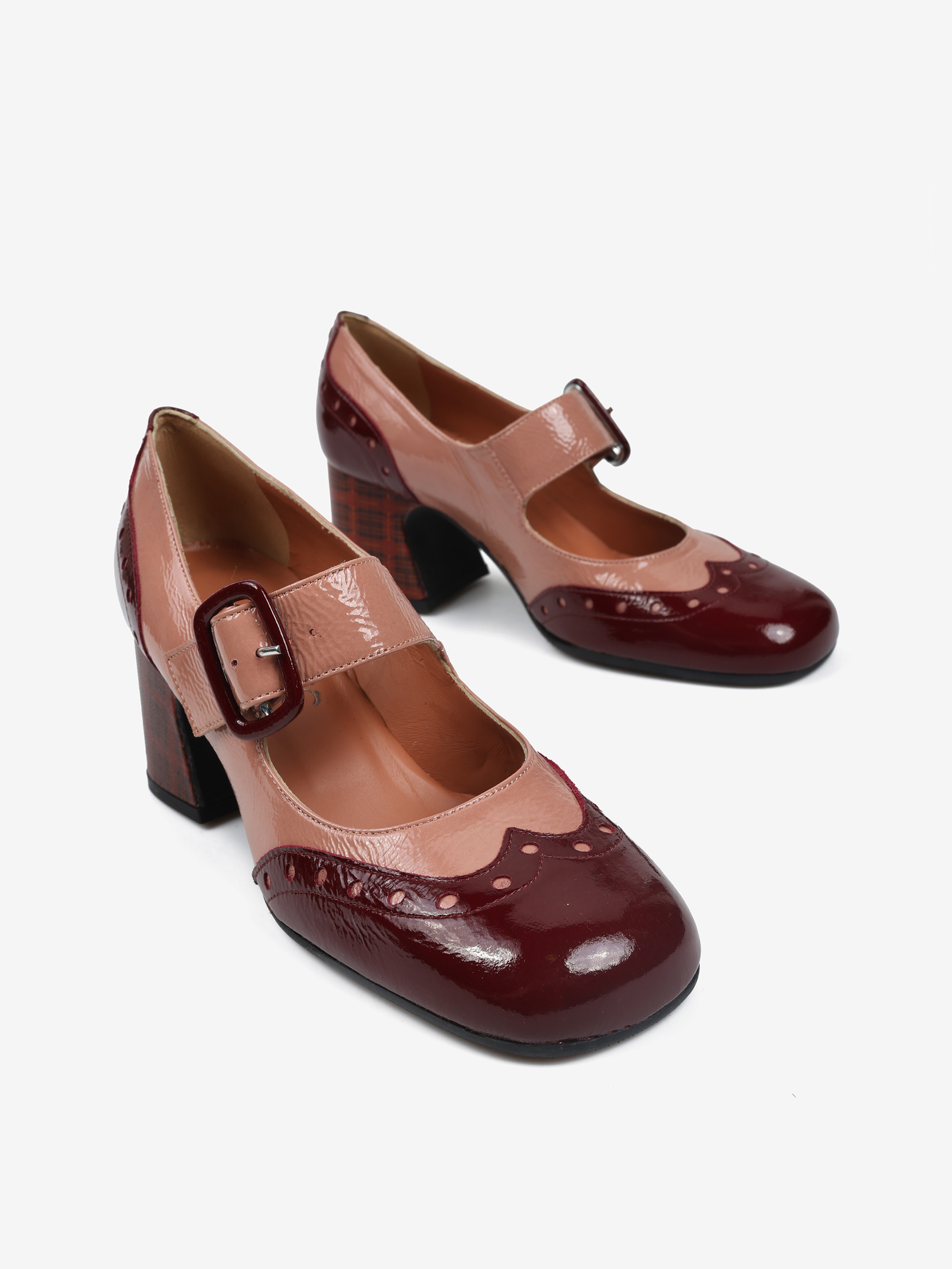 Lakierowane czółenka Mary Jane z kwadratowym noskiem i ażurowym, bordowym przeszyciem. Słupek ze wzorem w kratkę.