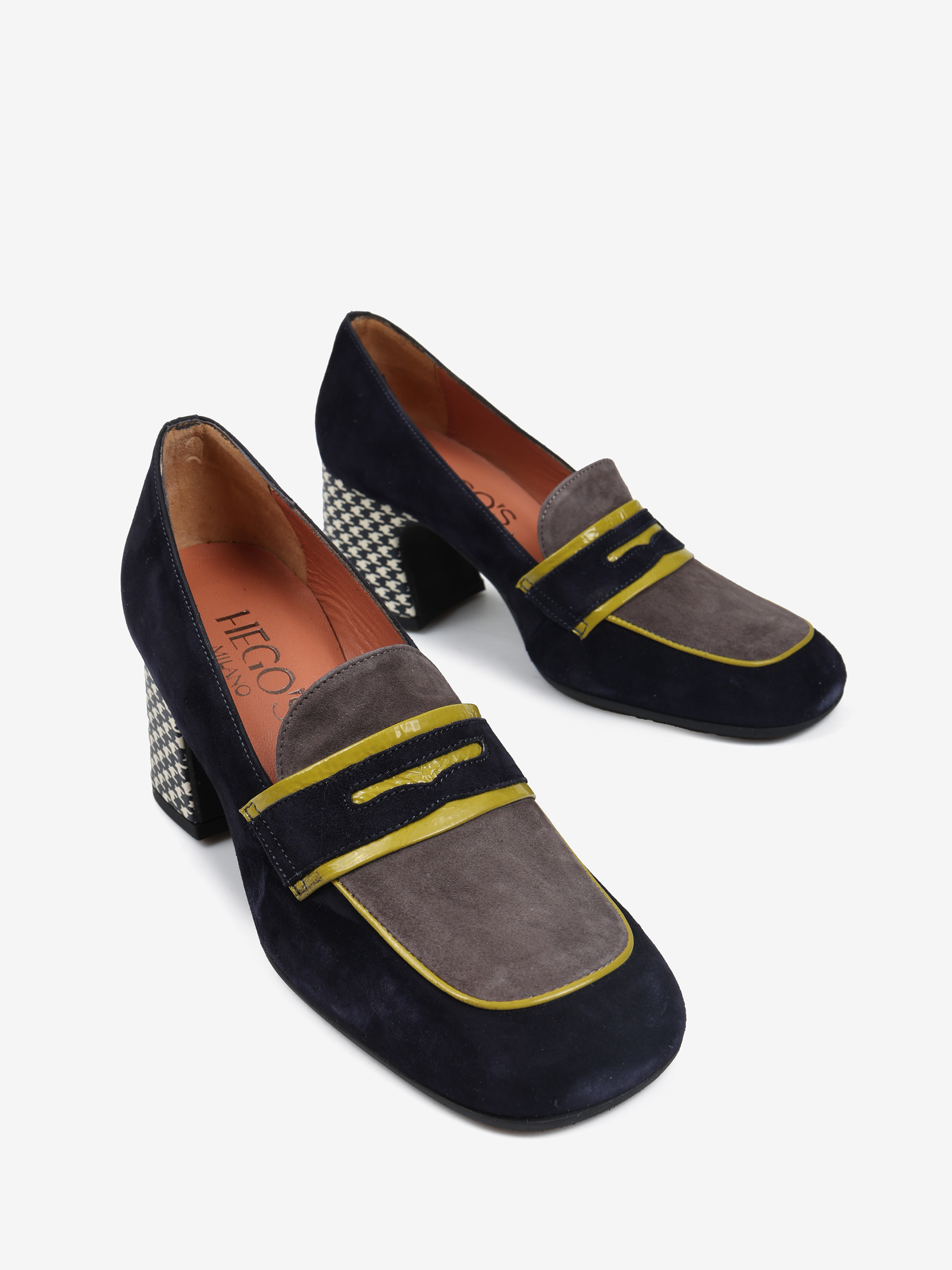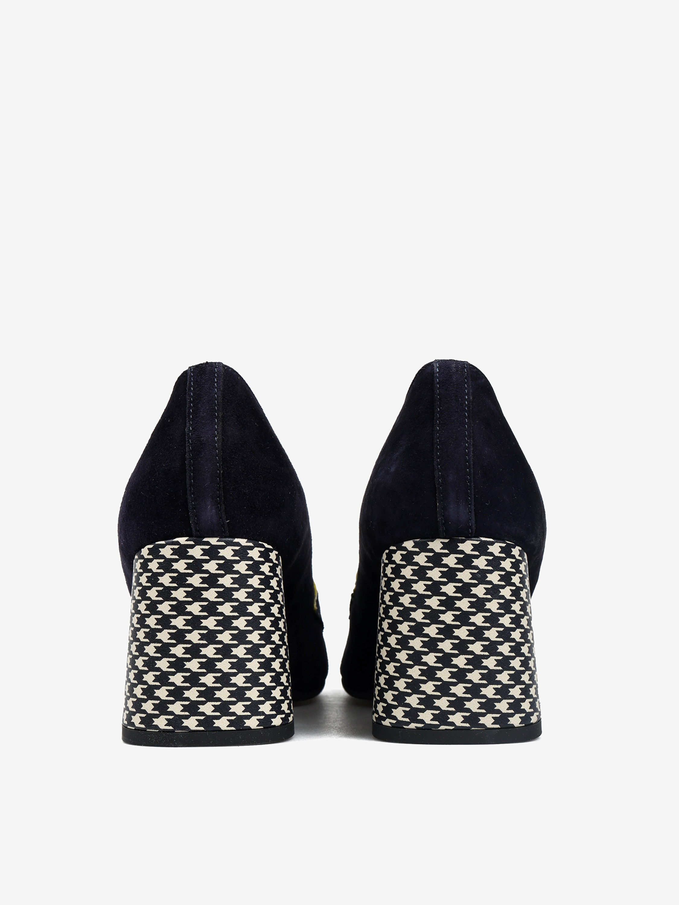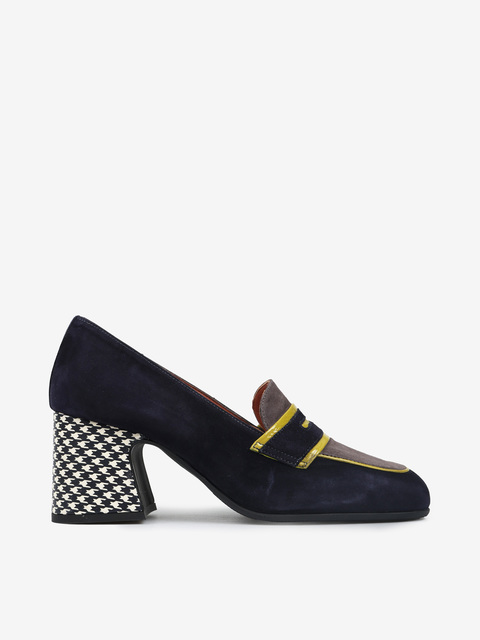 Zamszowe czółenka na wzorzystym słupku. Kwadratowe noski z kontrastującą lamówką i ozdobną patką.