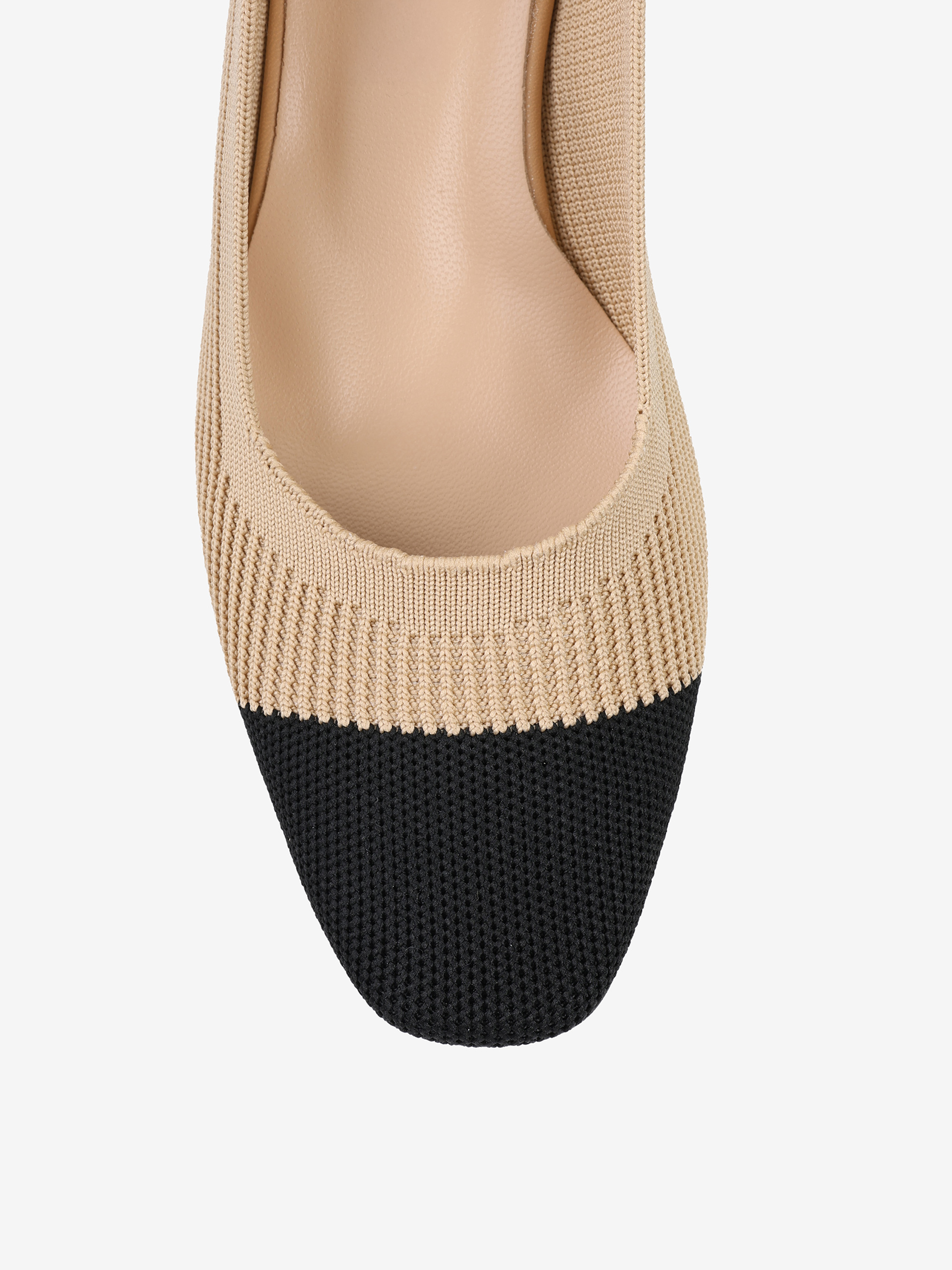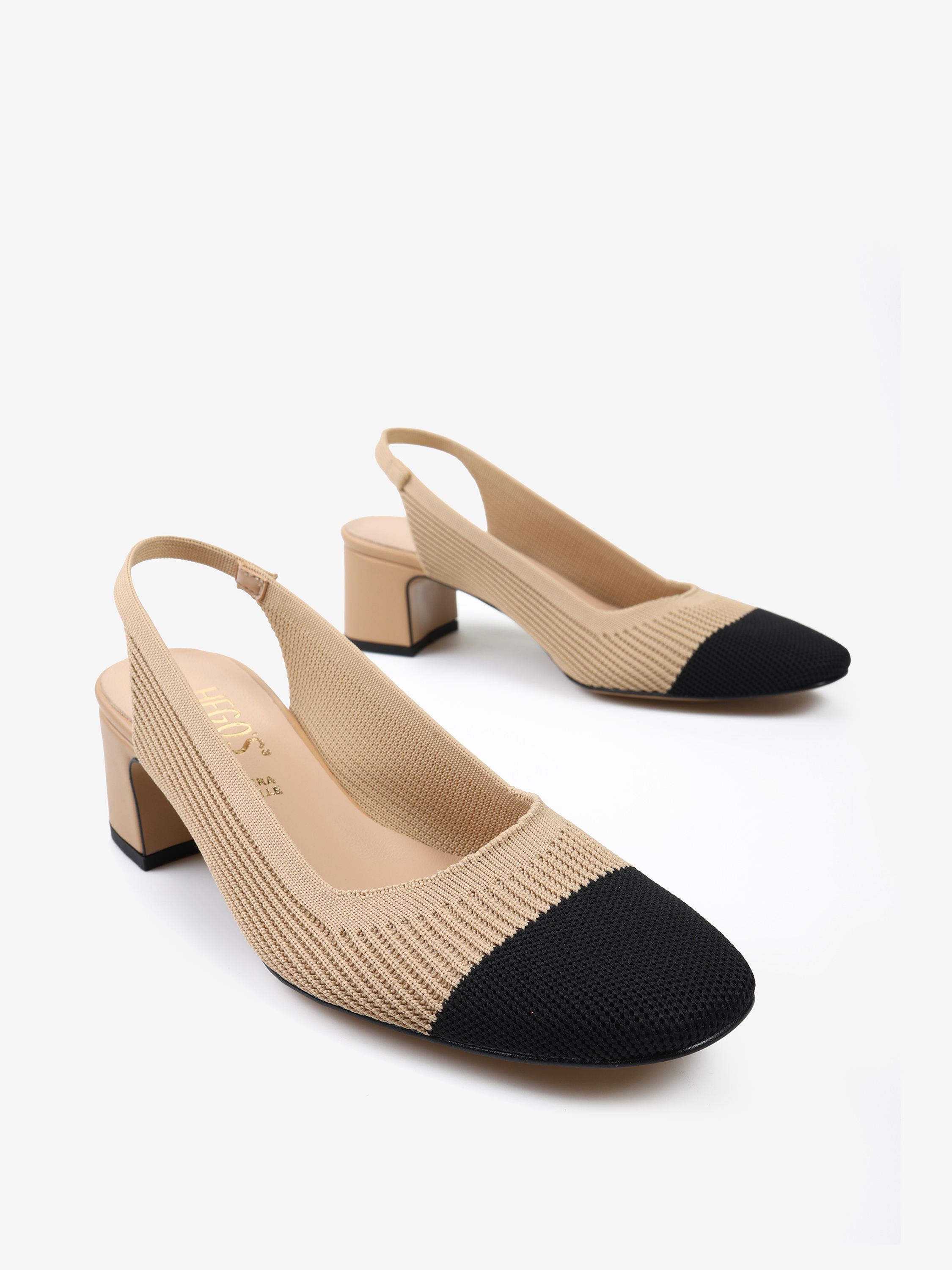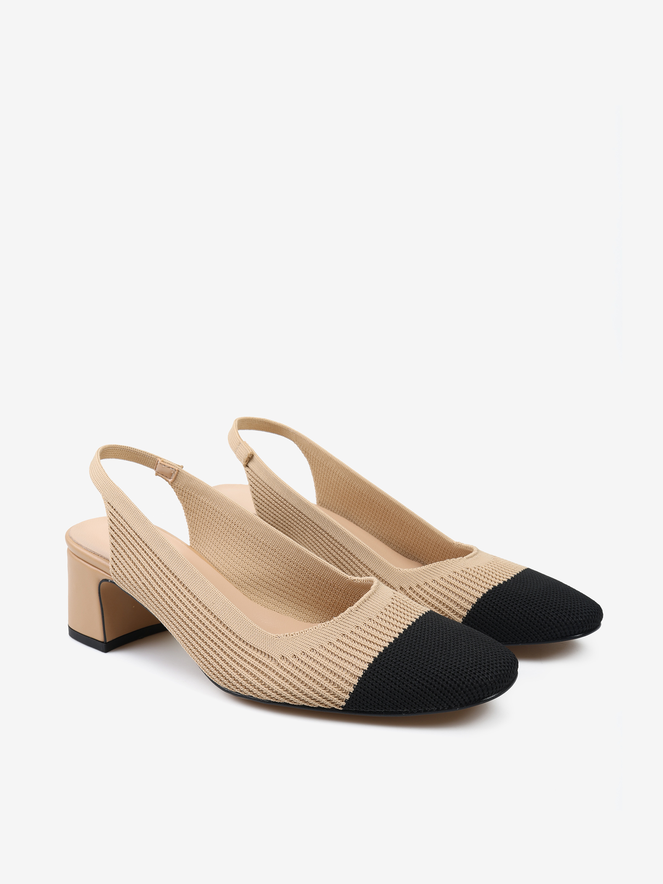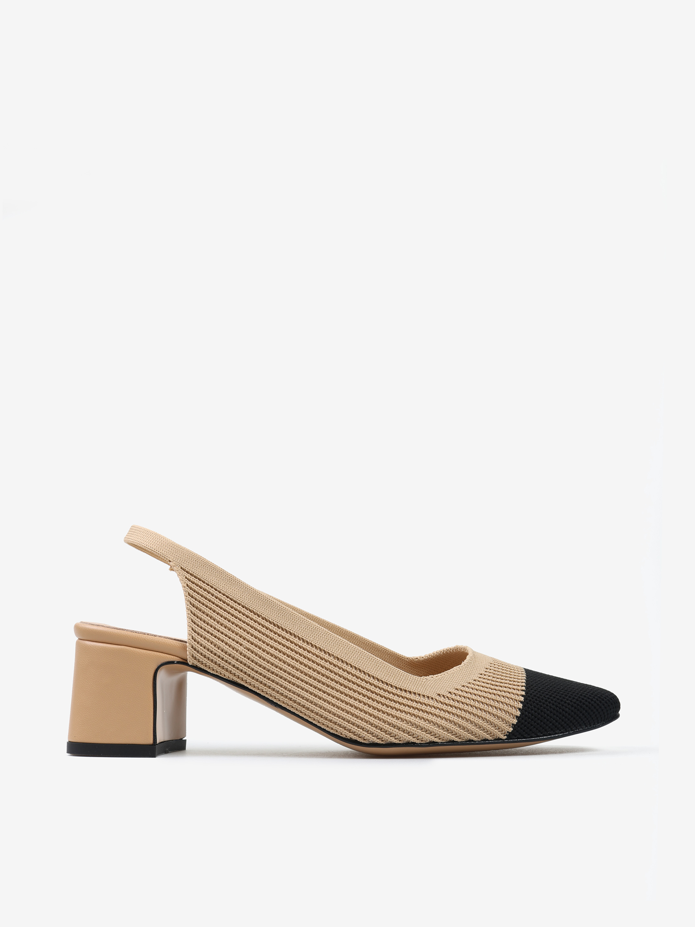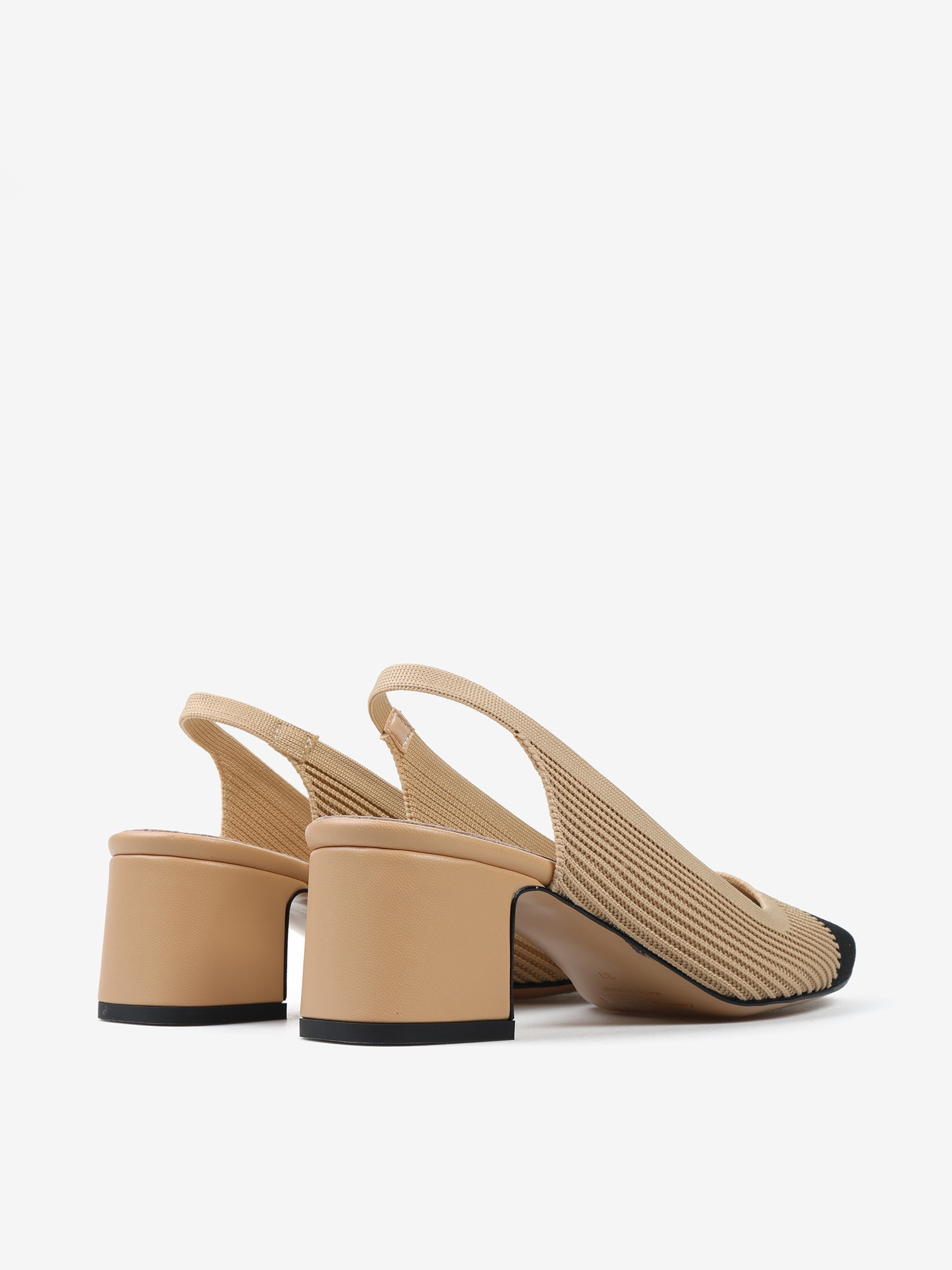 Czółenka na słupku wykonane z miękkiej, prążkowanej tkaniny. Czarny nosek i odkryta pięta z paskiem dopasowującym się do stopy.