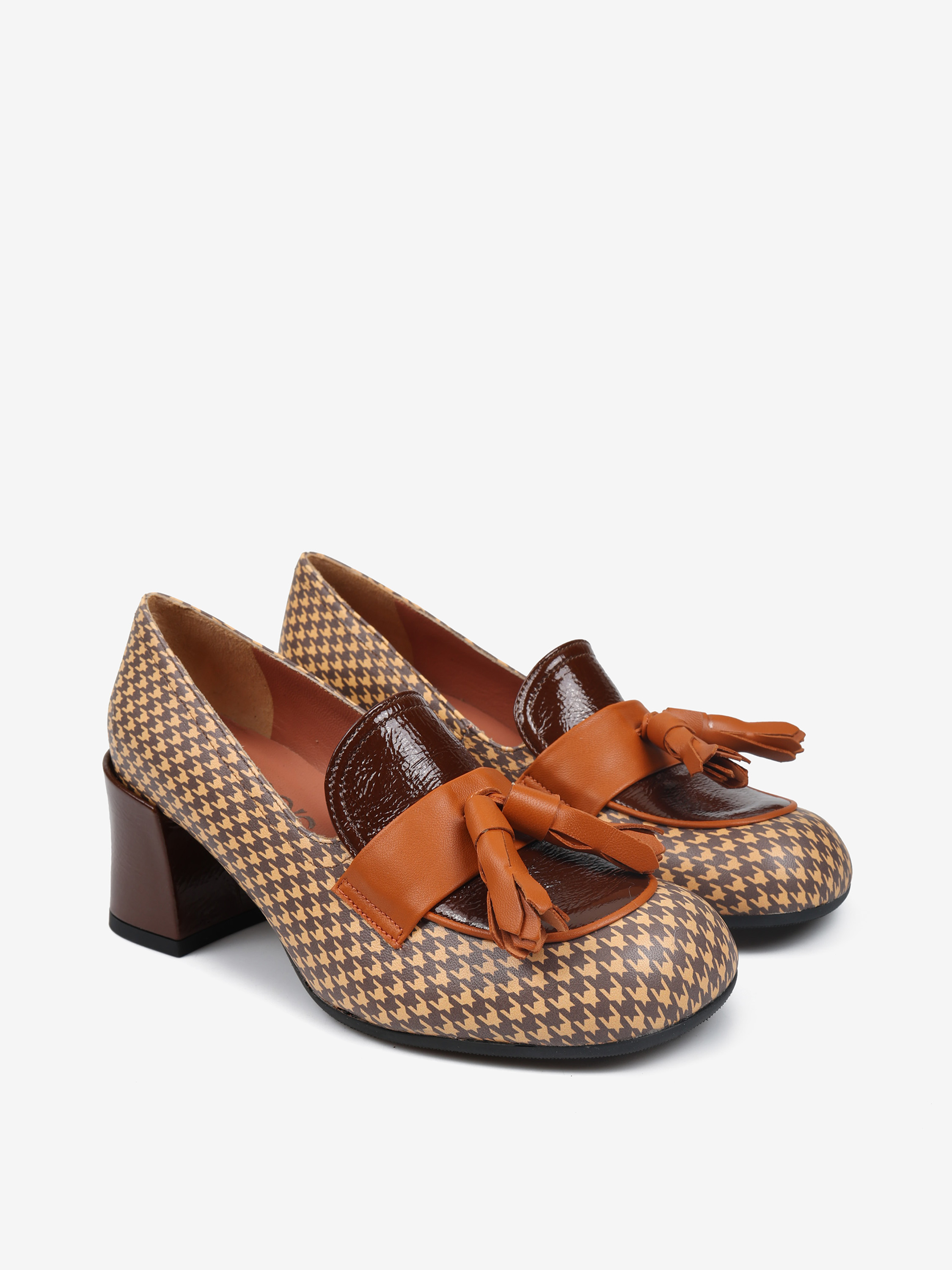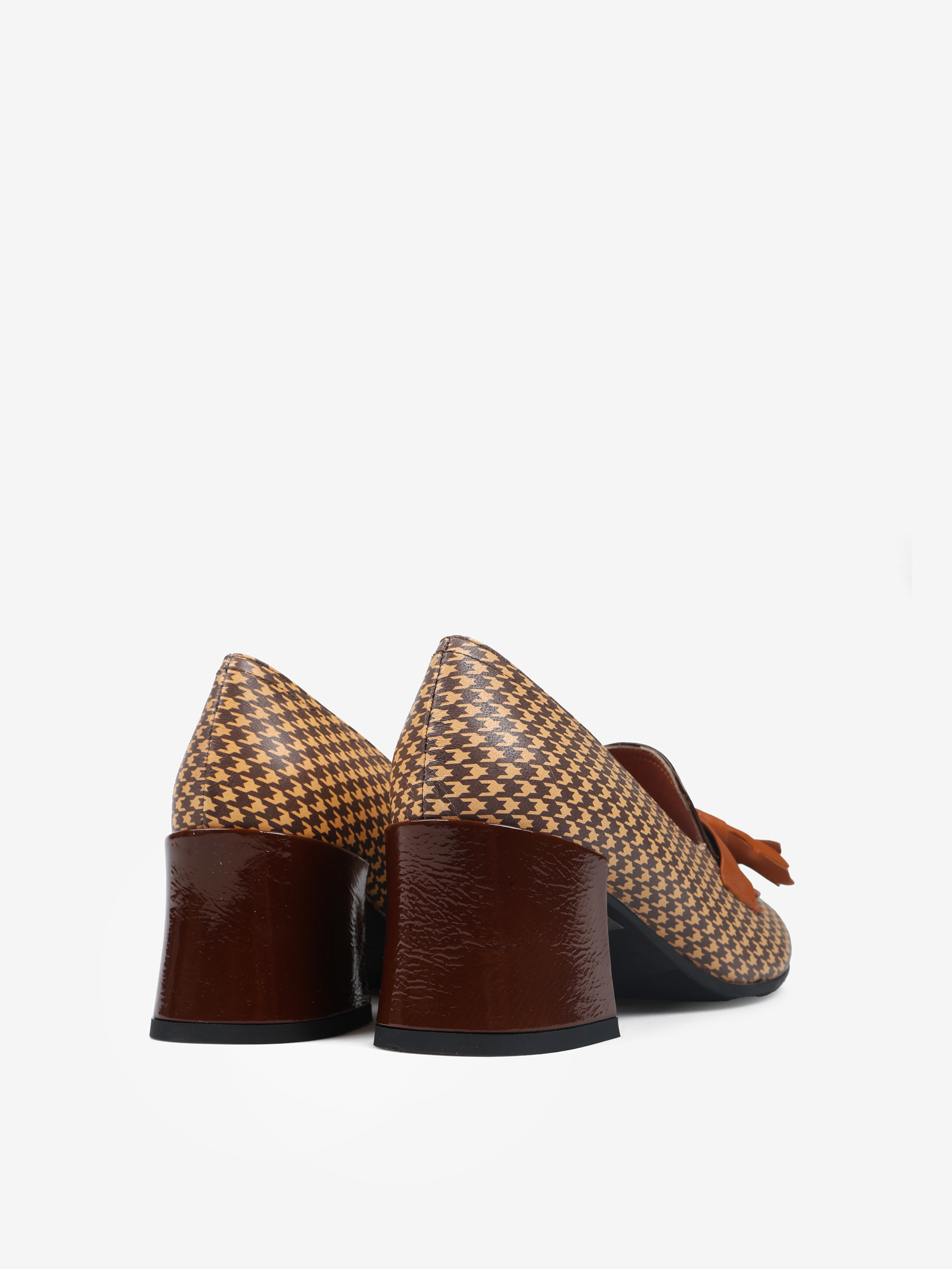 Wzorzyste czółenka na bordowym słupku. Kwadratowe noski z ozdobną patką i frędzlami. Bordowy język z lakierowanej skóry.