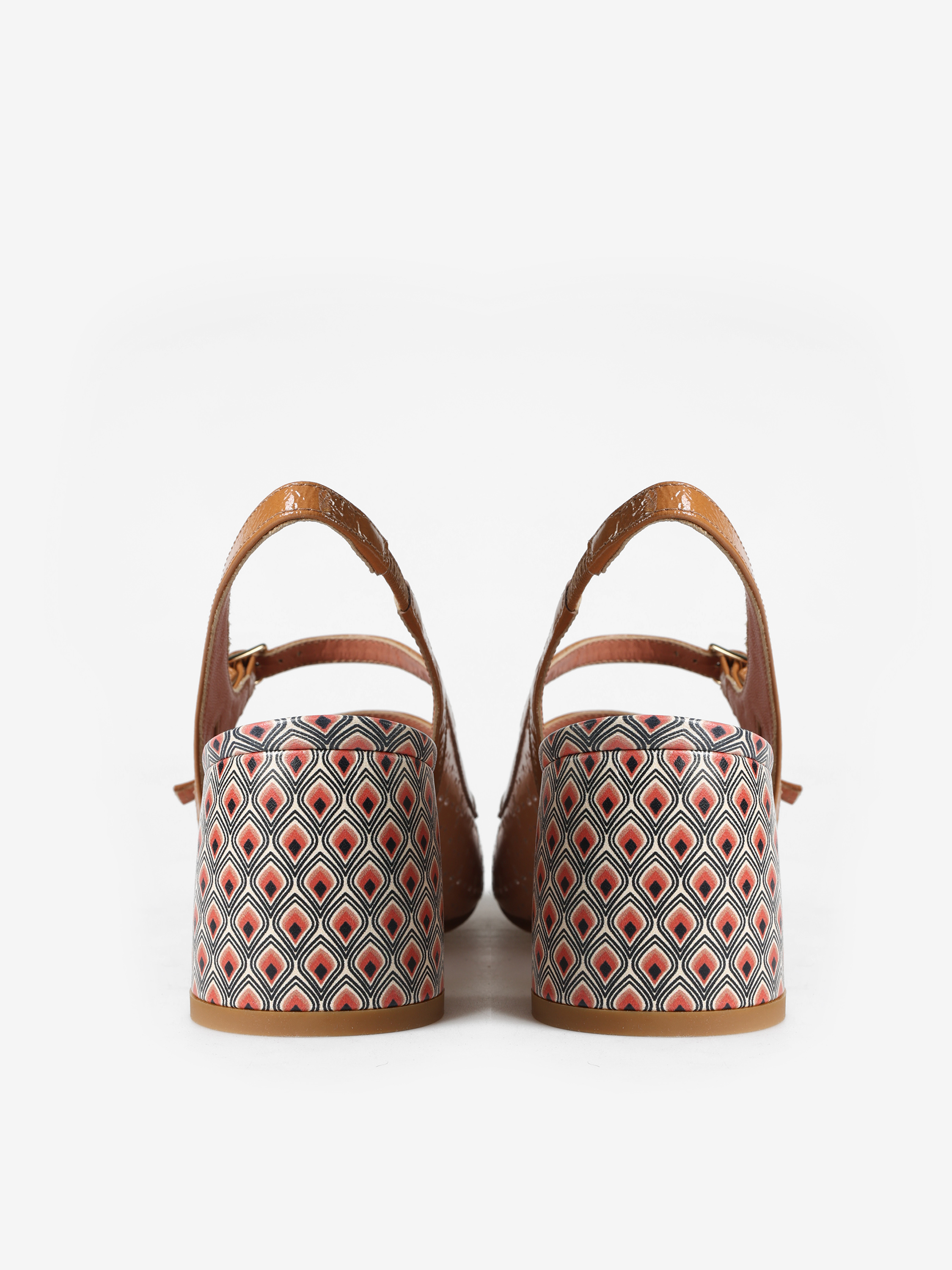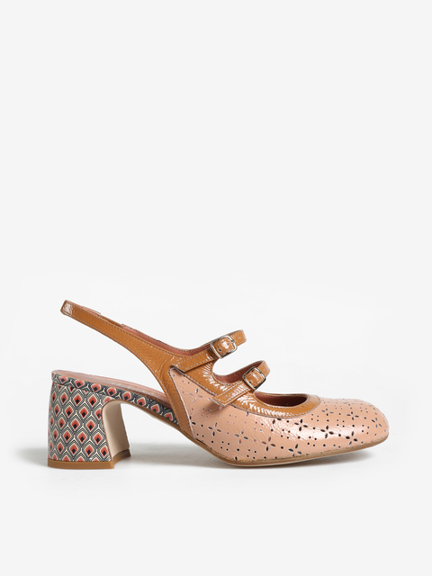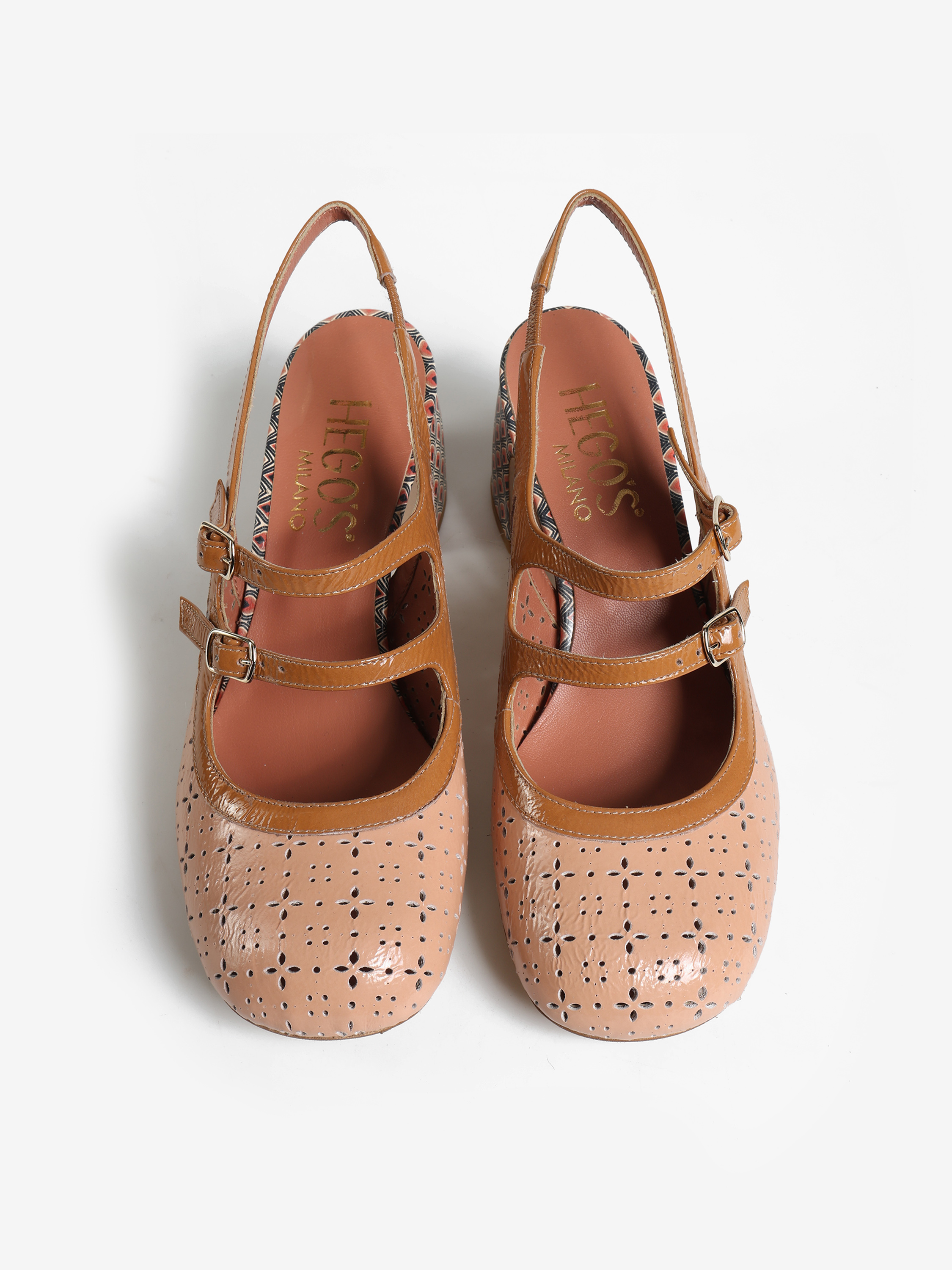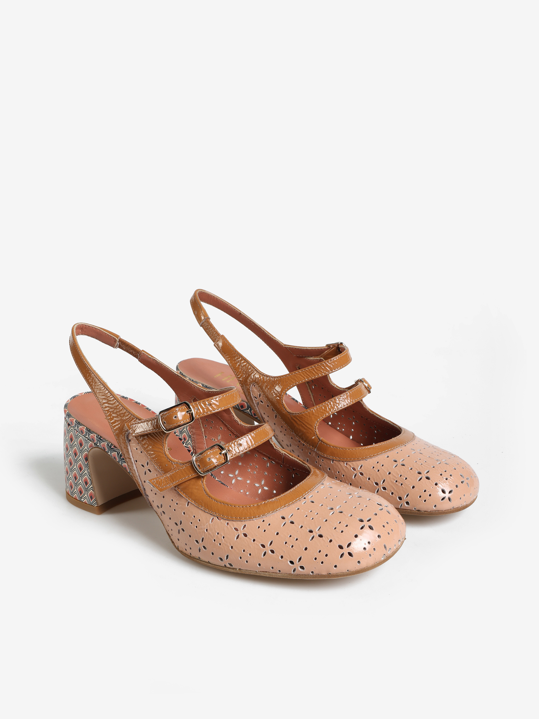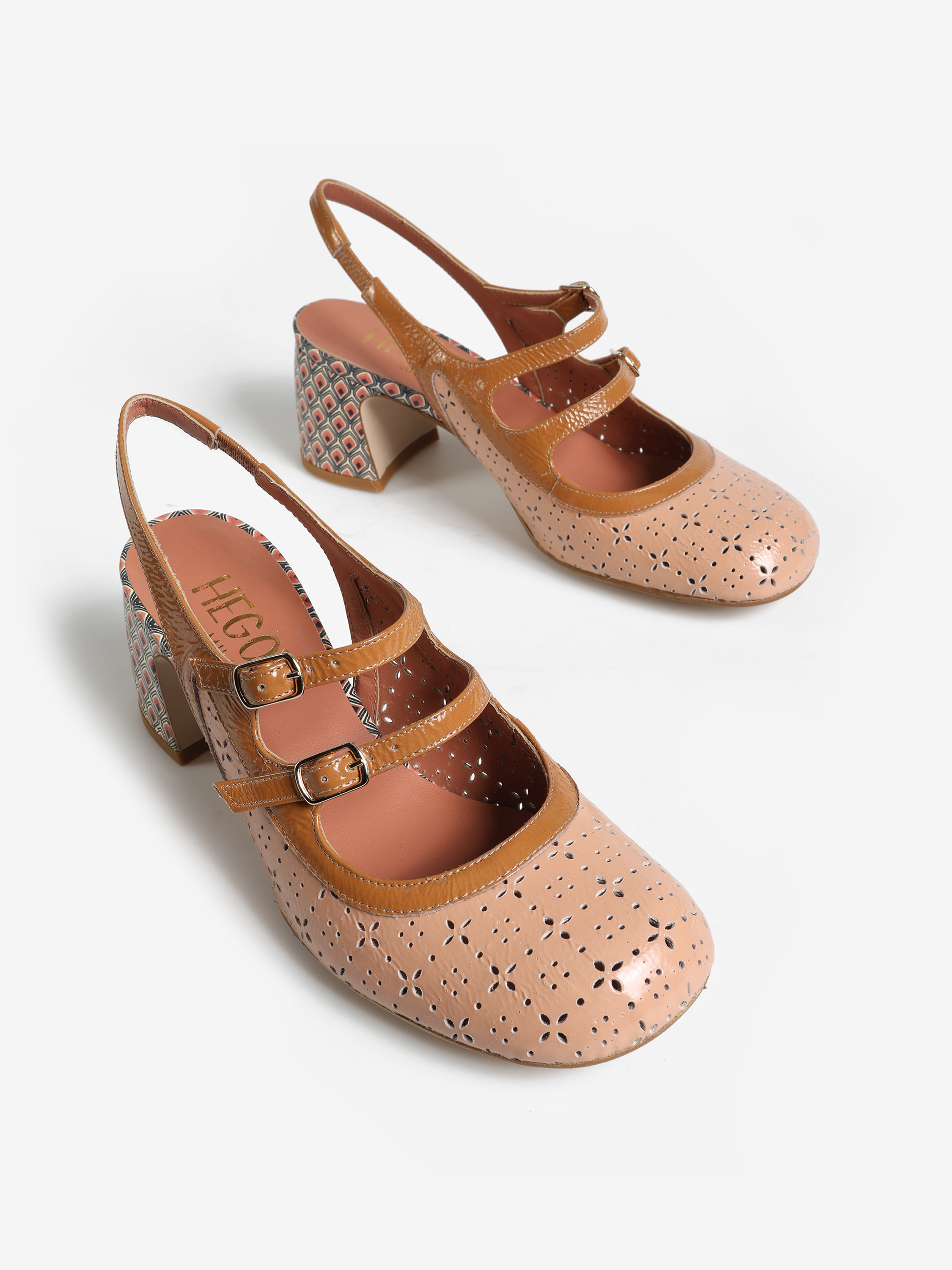 Ażurowe czółenka Mary Jane z okrągłym noskiem i  wzorzystym obcasem. Odkryta pięta z paskiem dopasowującym się do stopy.