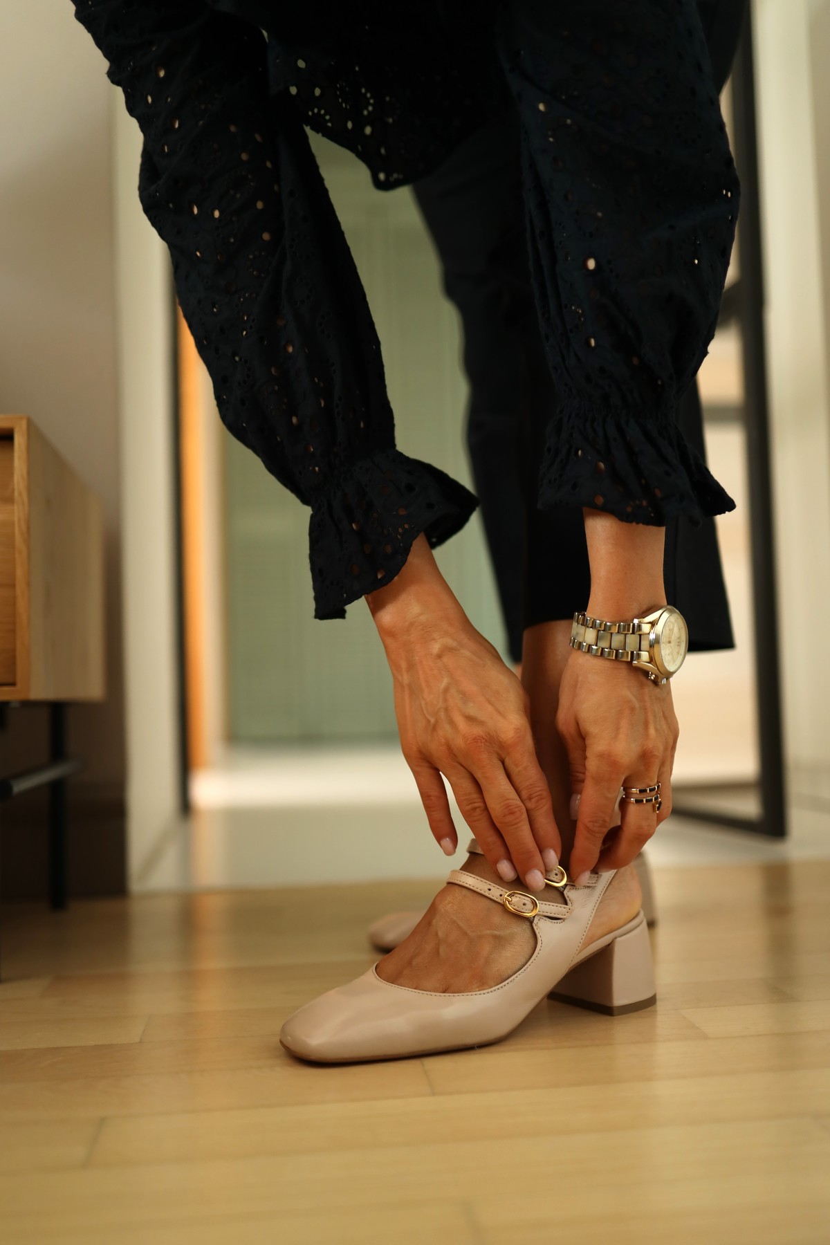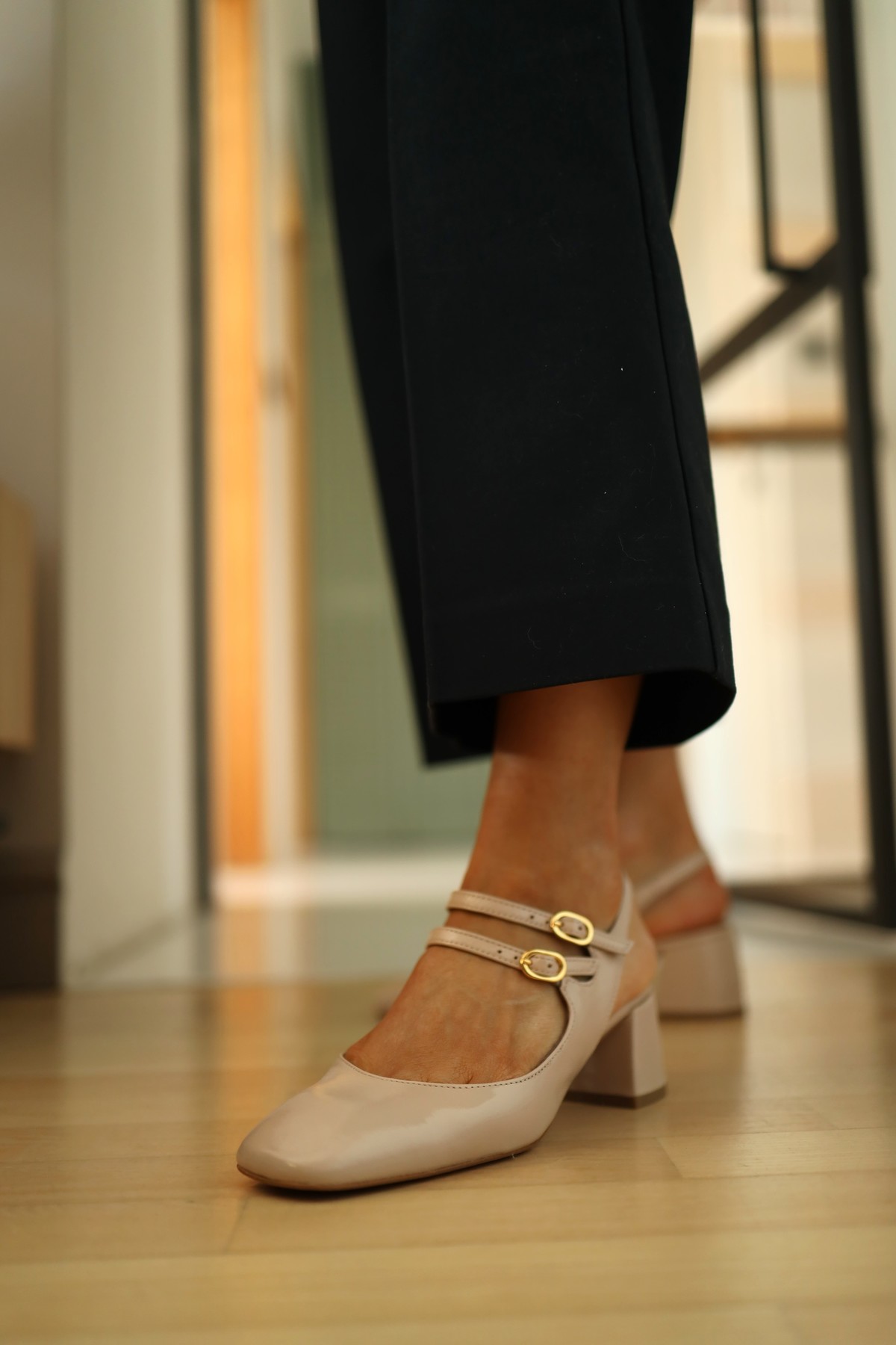 Model z charakterystycznym zapięciem w kostce i zaokrąglonym noskiem.