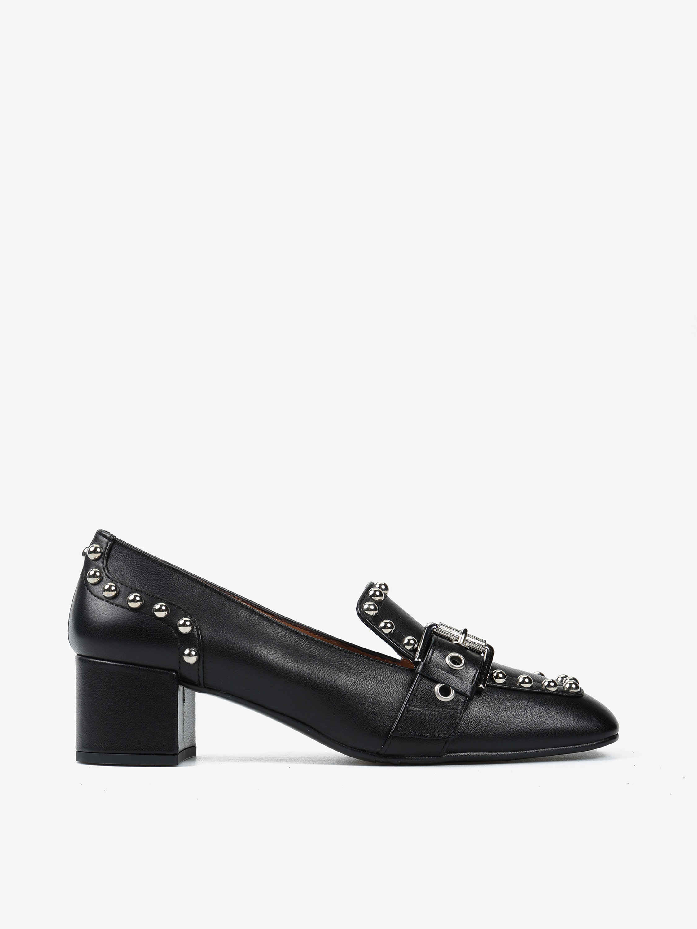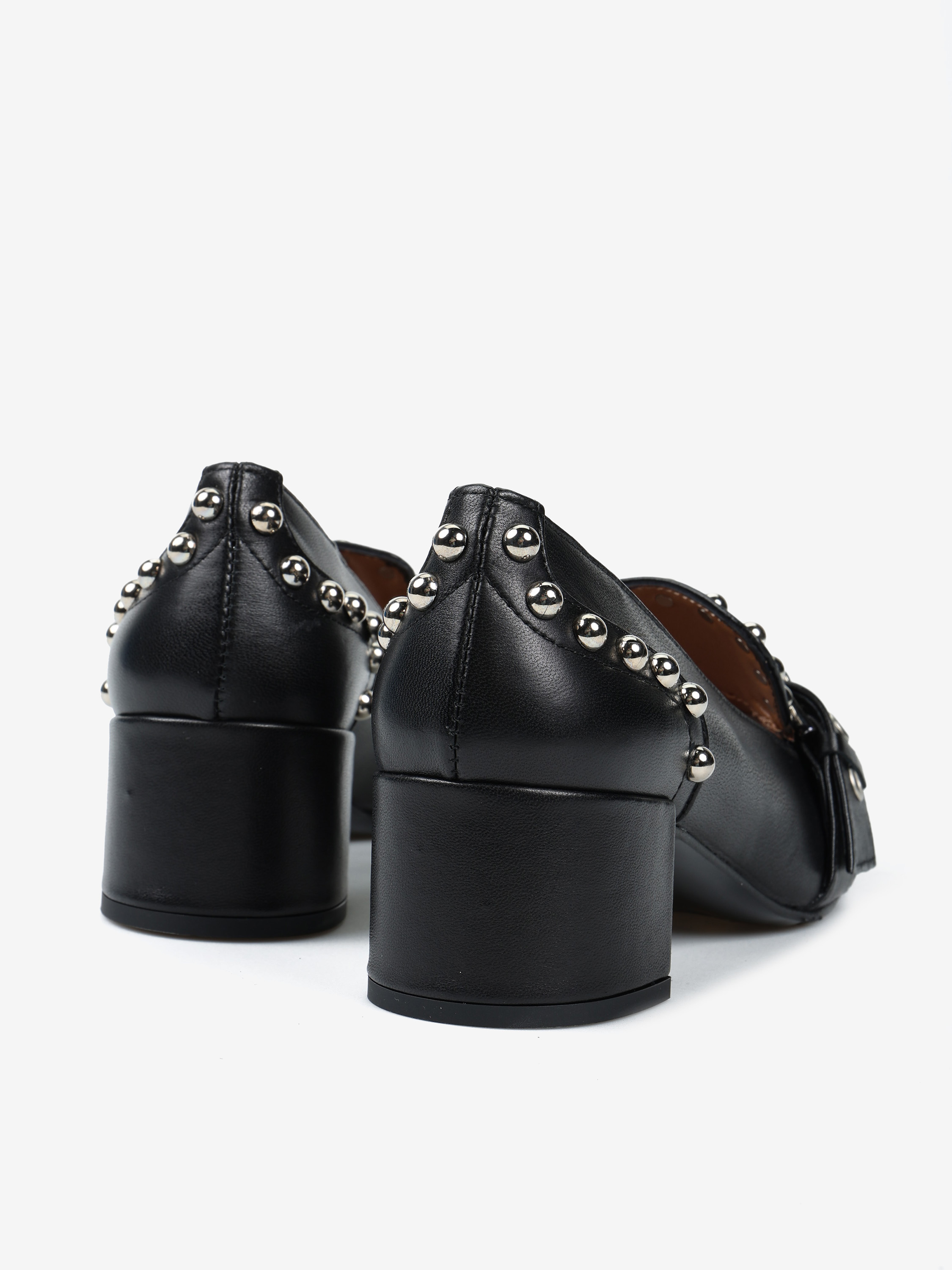 Czółenka na słupku wykonane z miękkiej i delikatnej skóry. Ozdobne ćwieki i pasek.