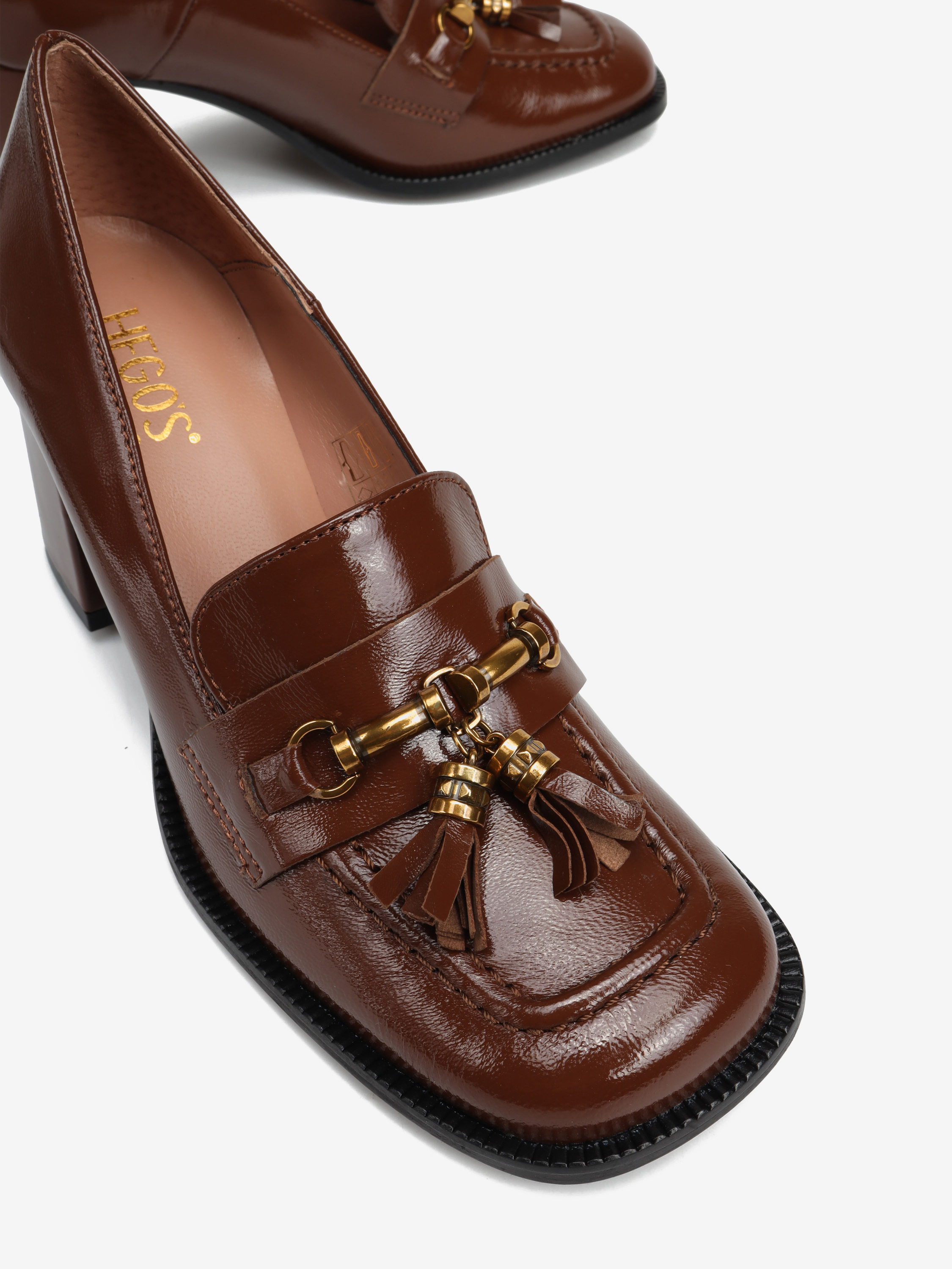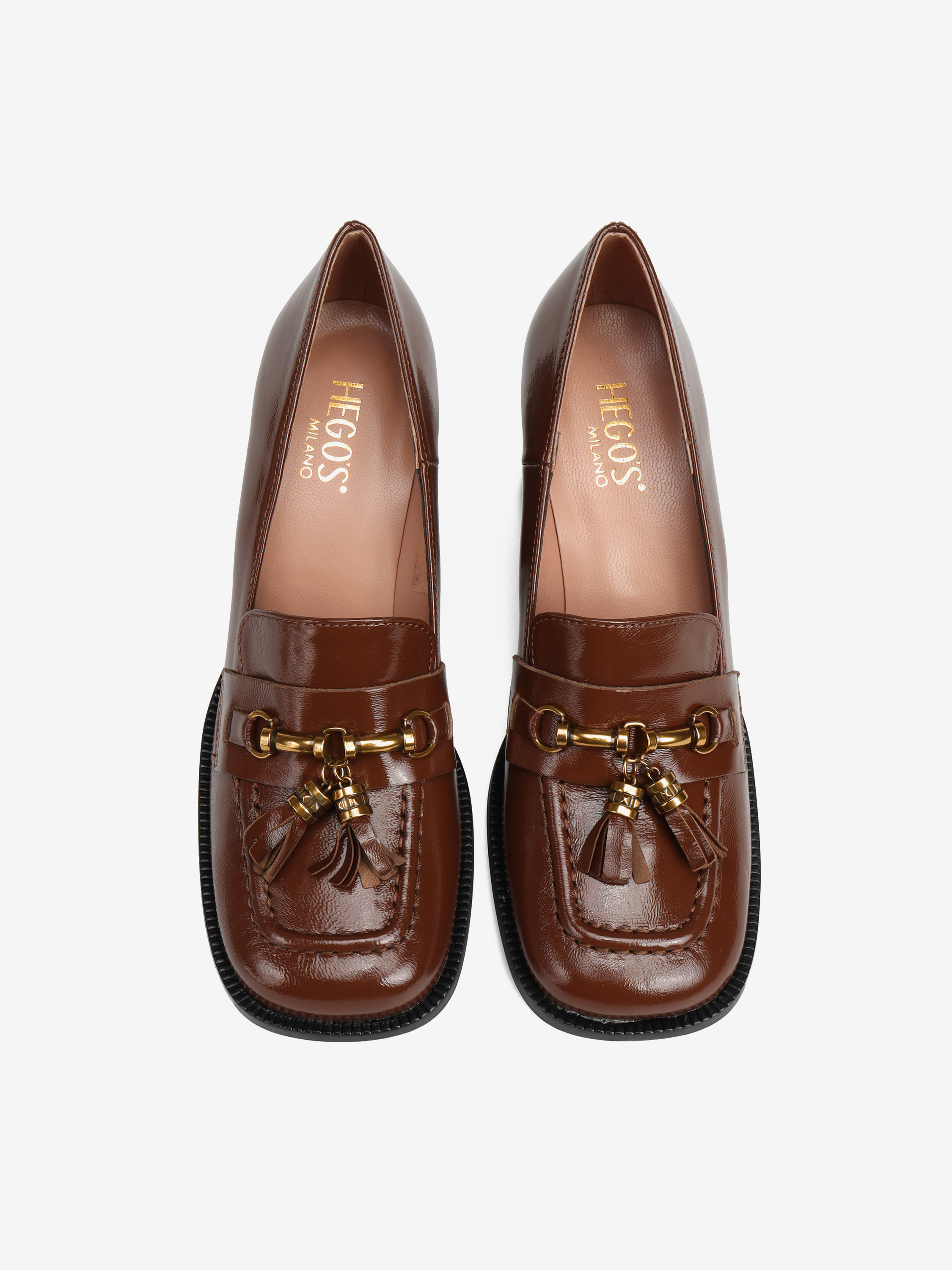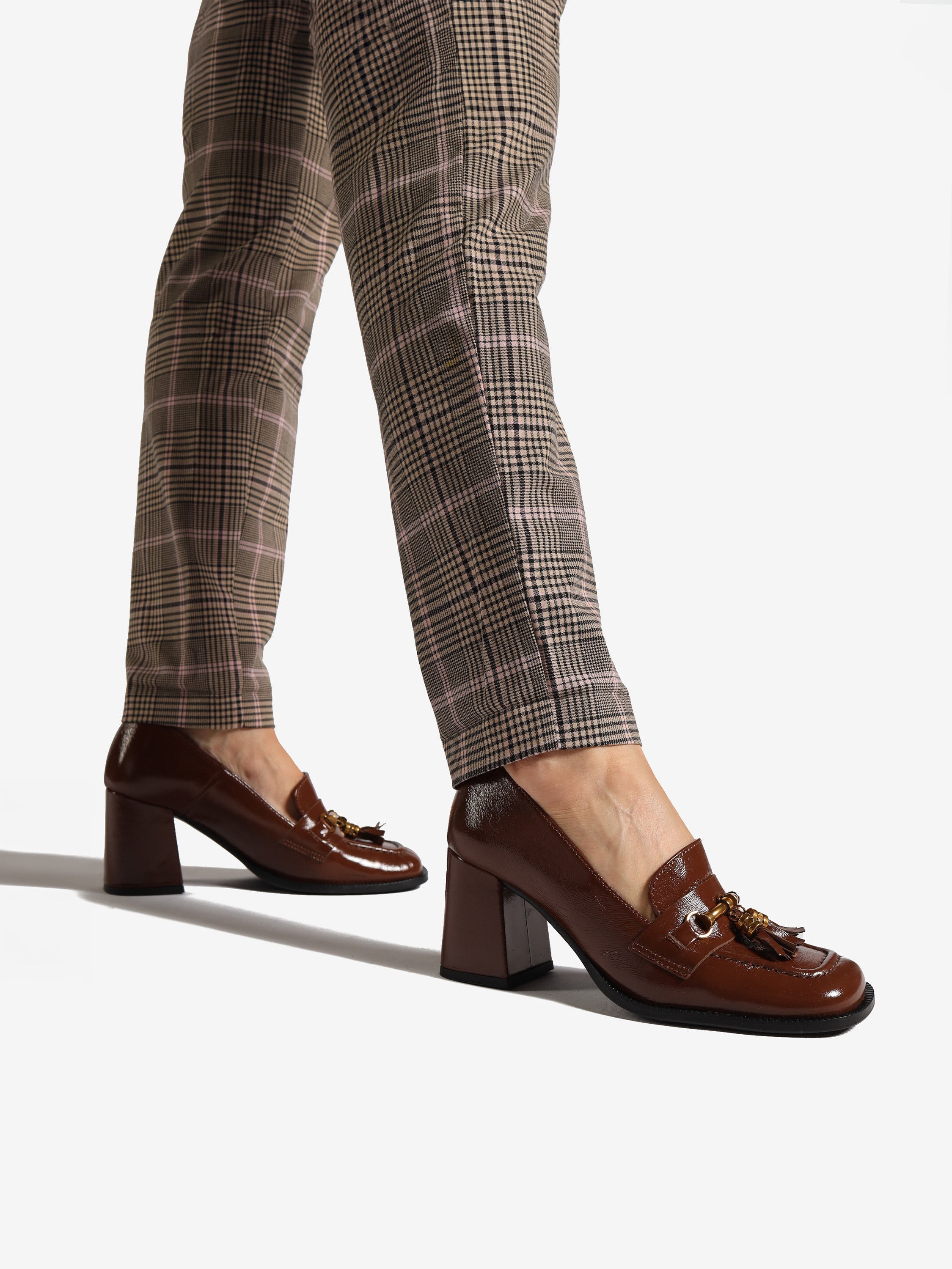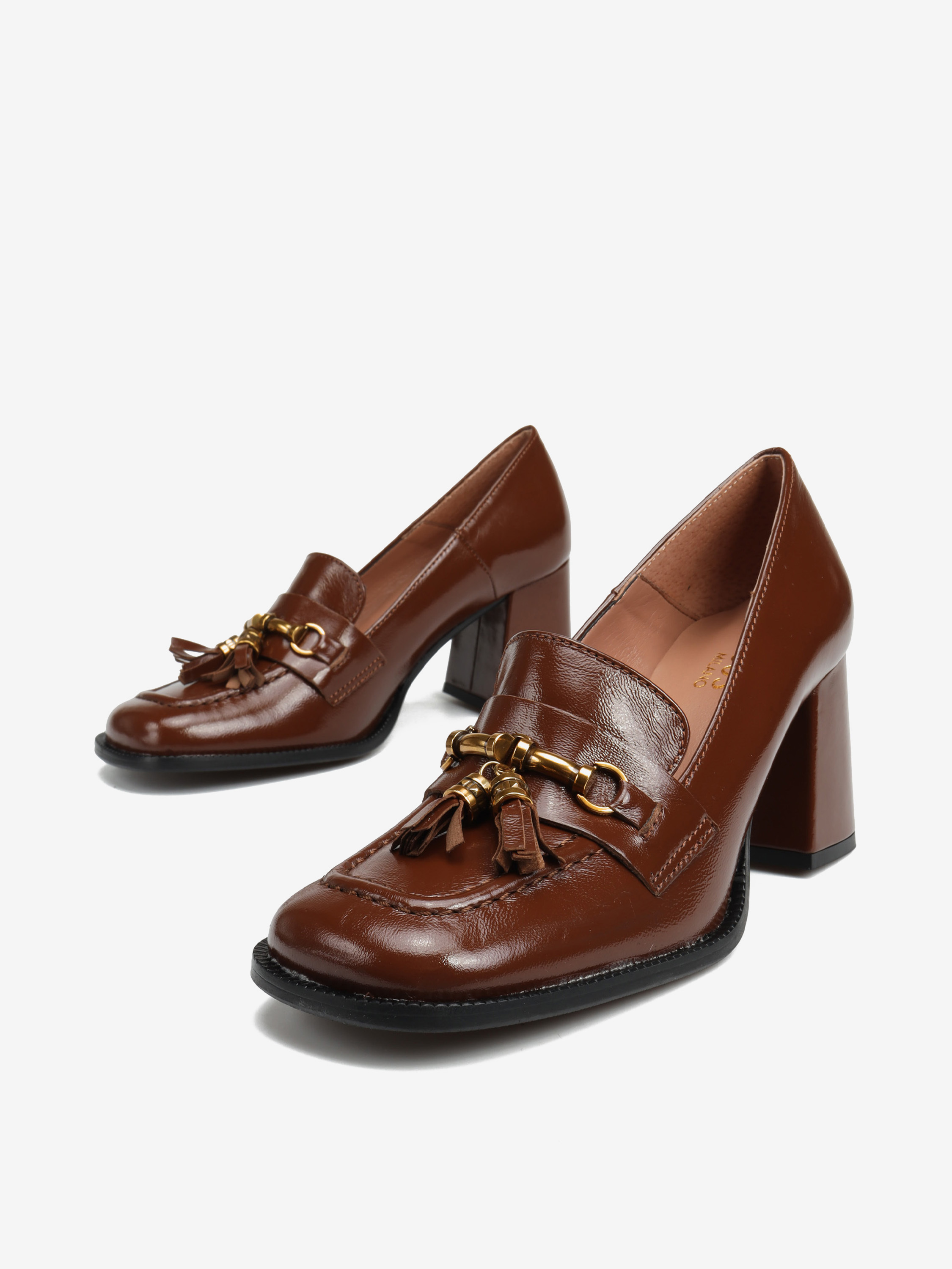 Mokasyny na obcasie wykonane są z włoskiej, naturalnej skóry. Cholewka w brązowym kolorze ozdobiona złotym elementem i frędzlami.