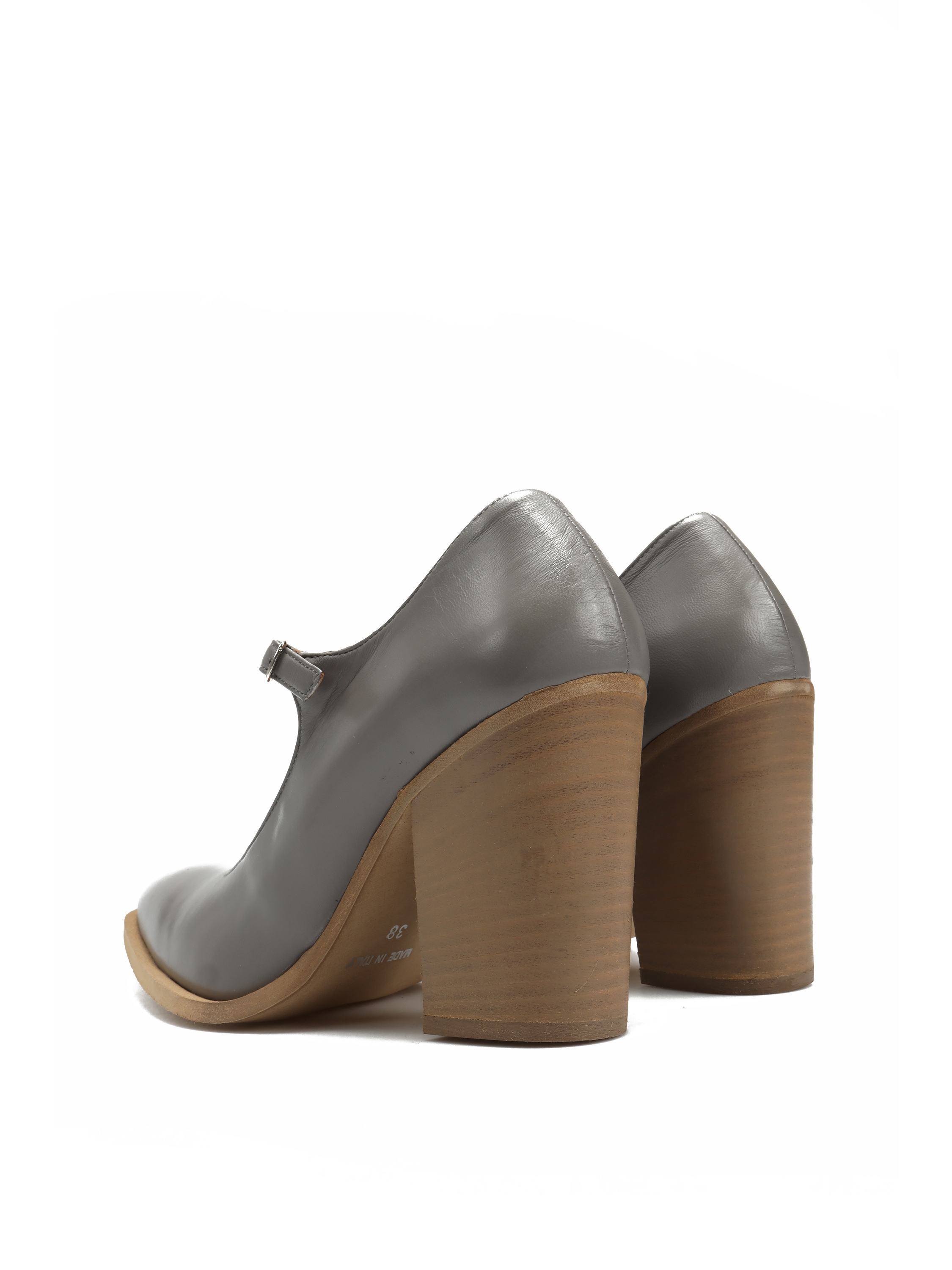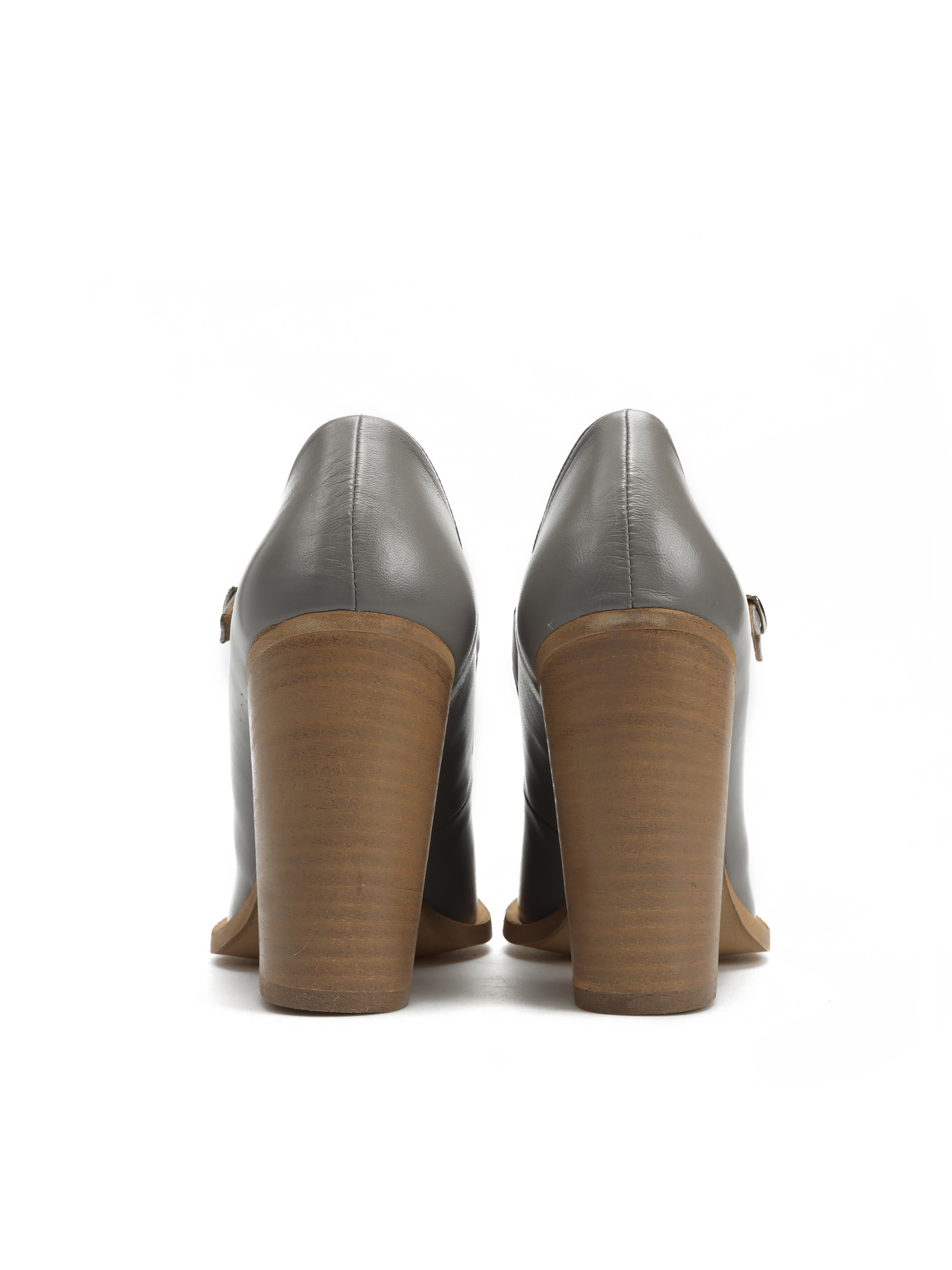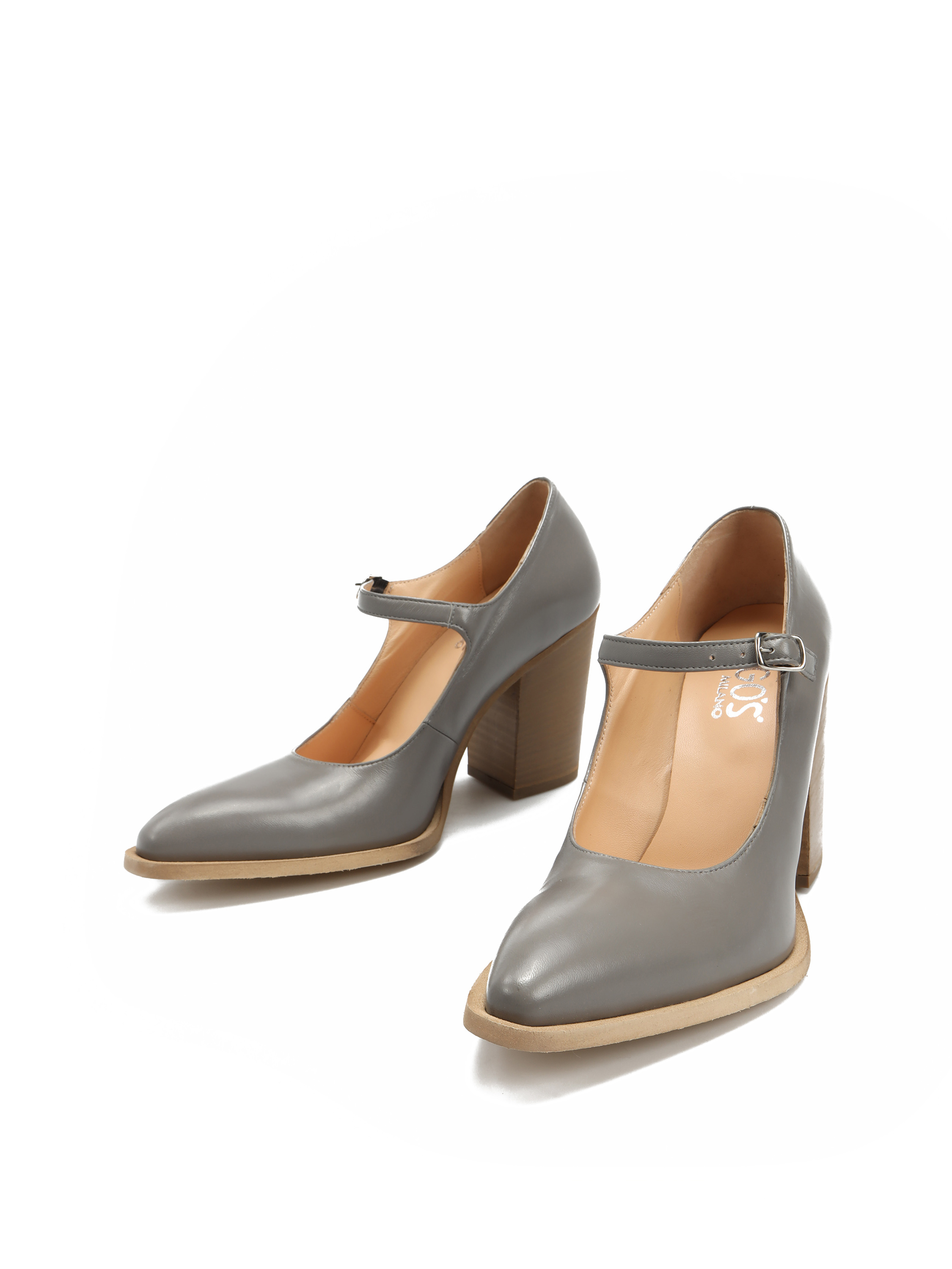 Model z charakterystycznym zapięciem w kostce i zaokrąglonym noskiem.