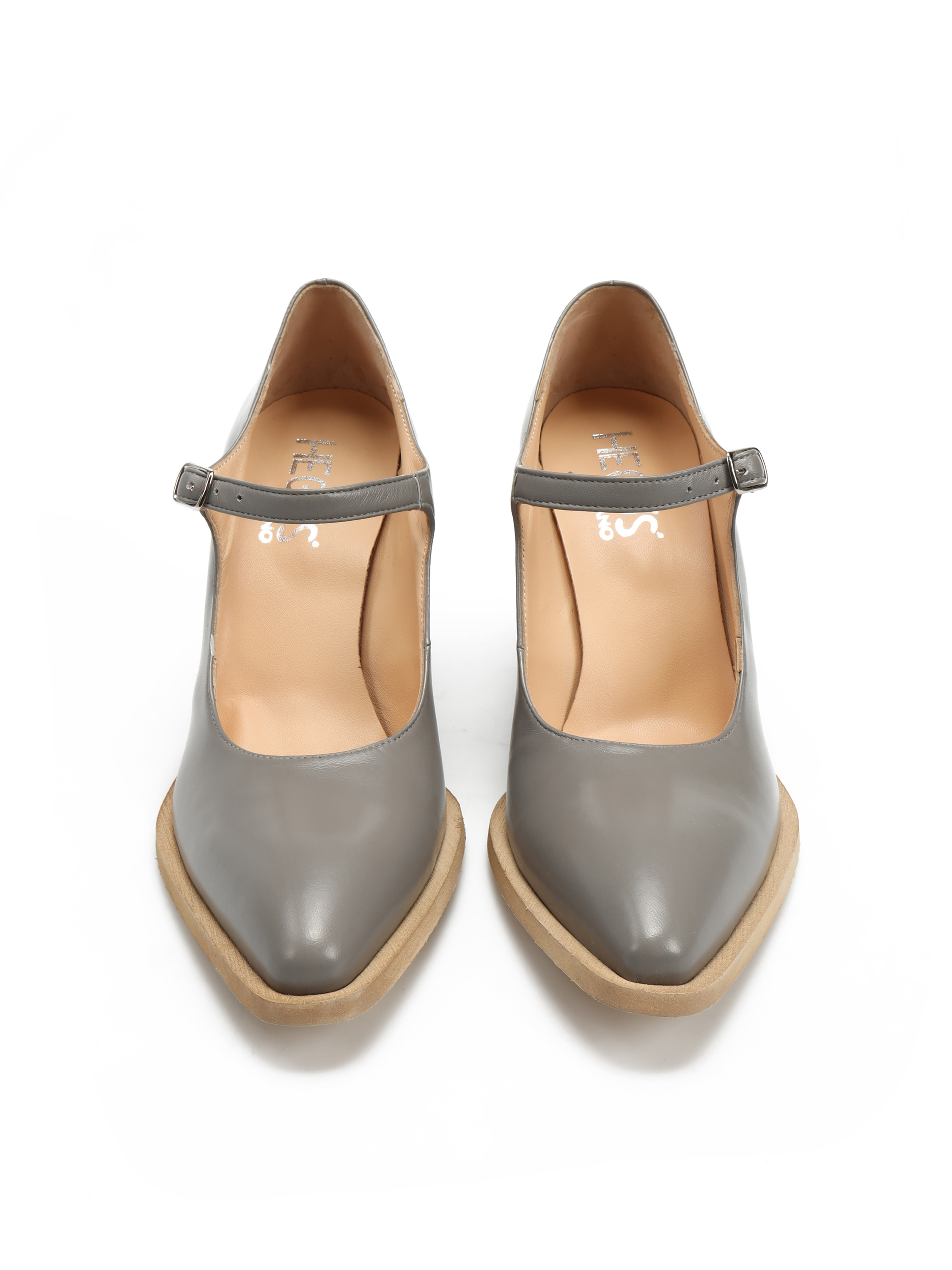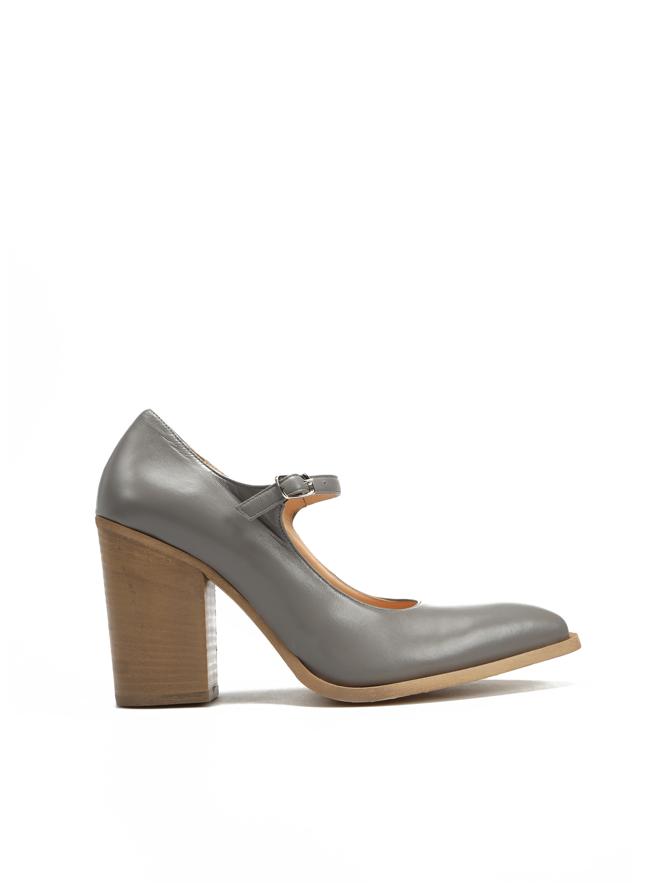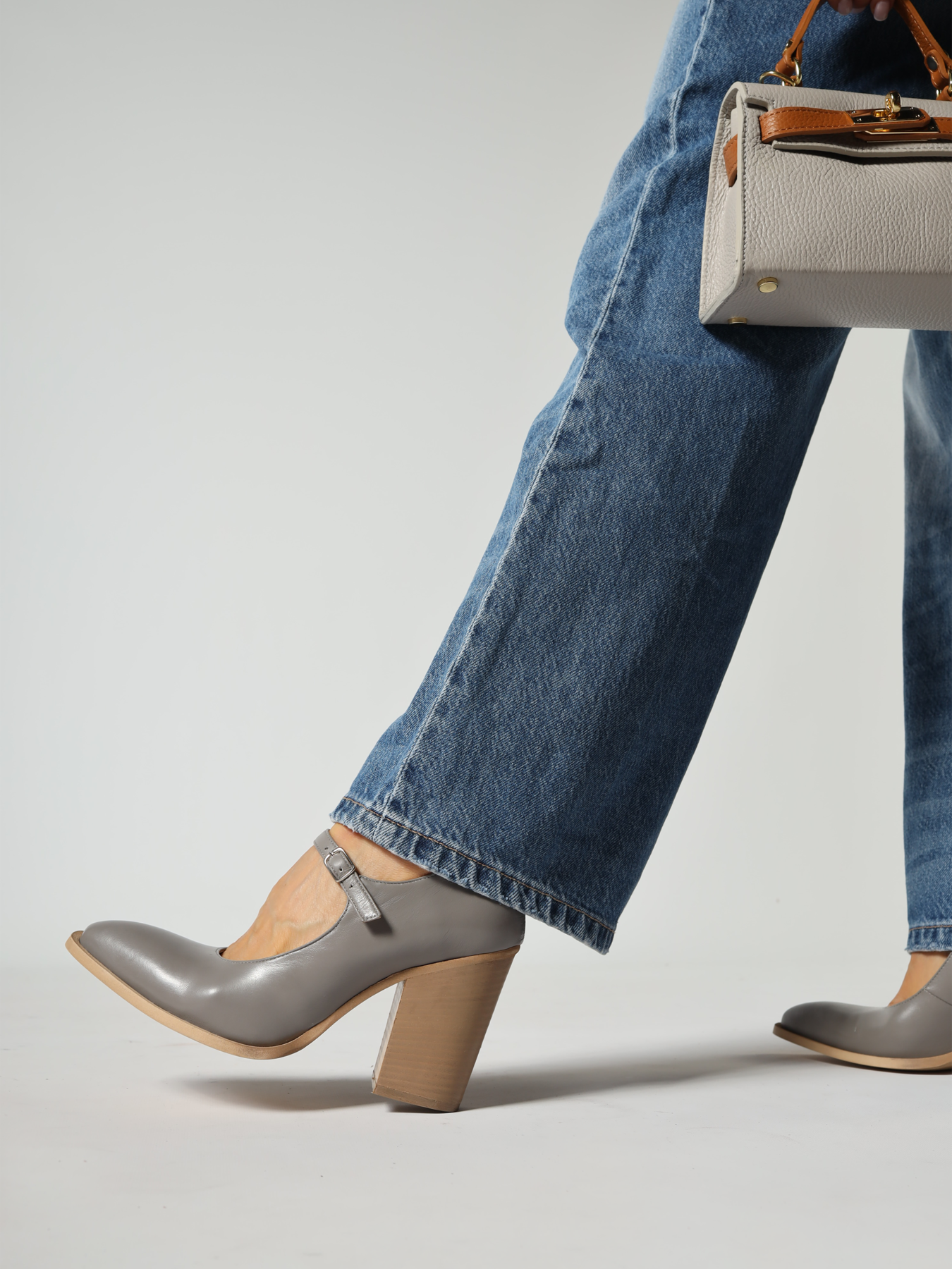 Model z charakterystycznym zapięciem w kostce i zaokrąglonym noskiem.