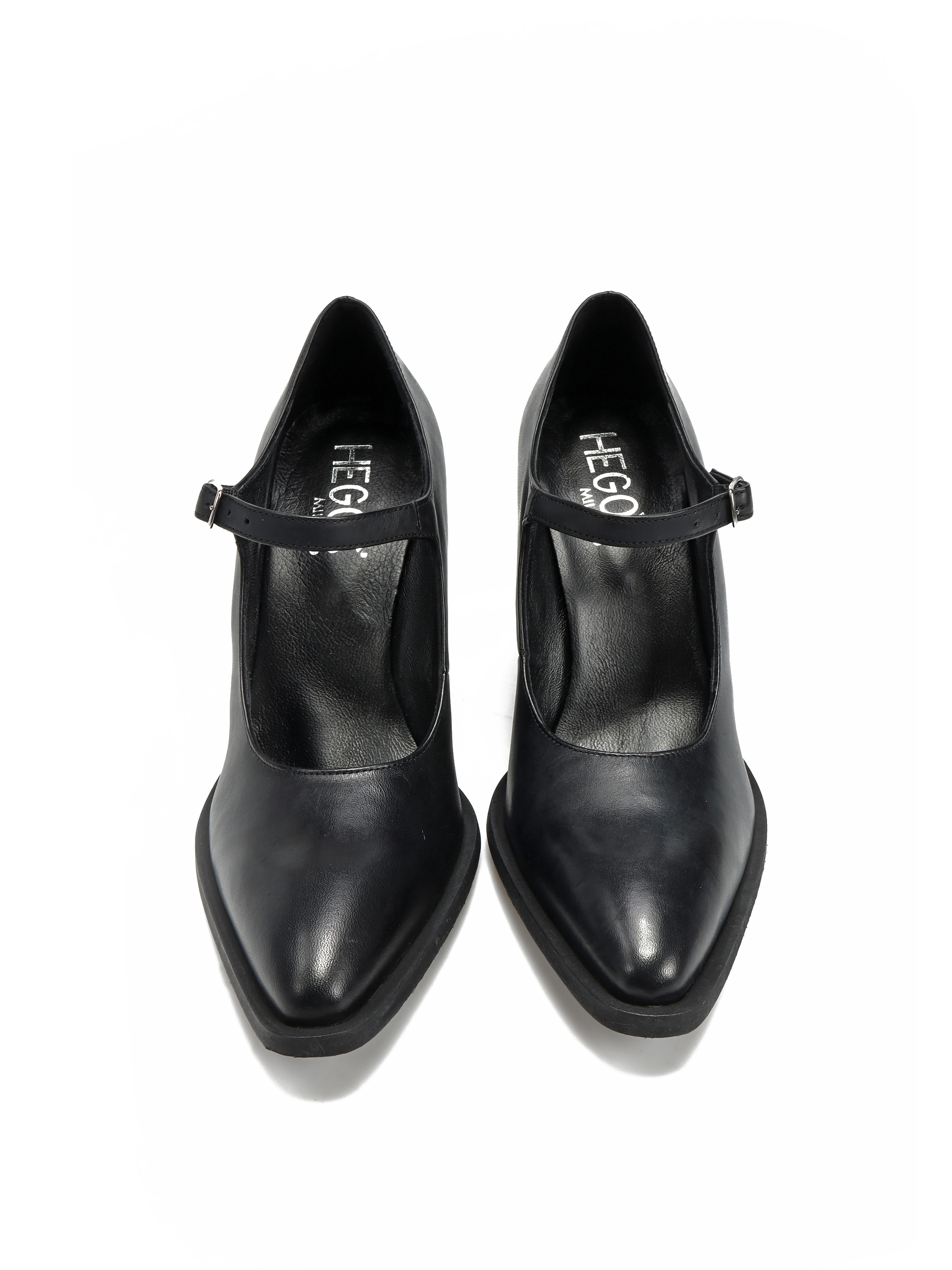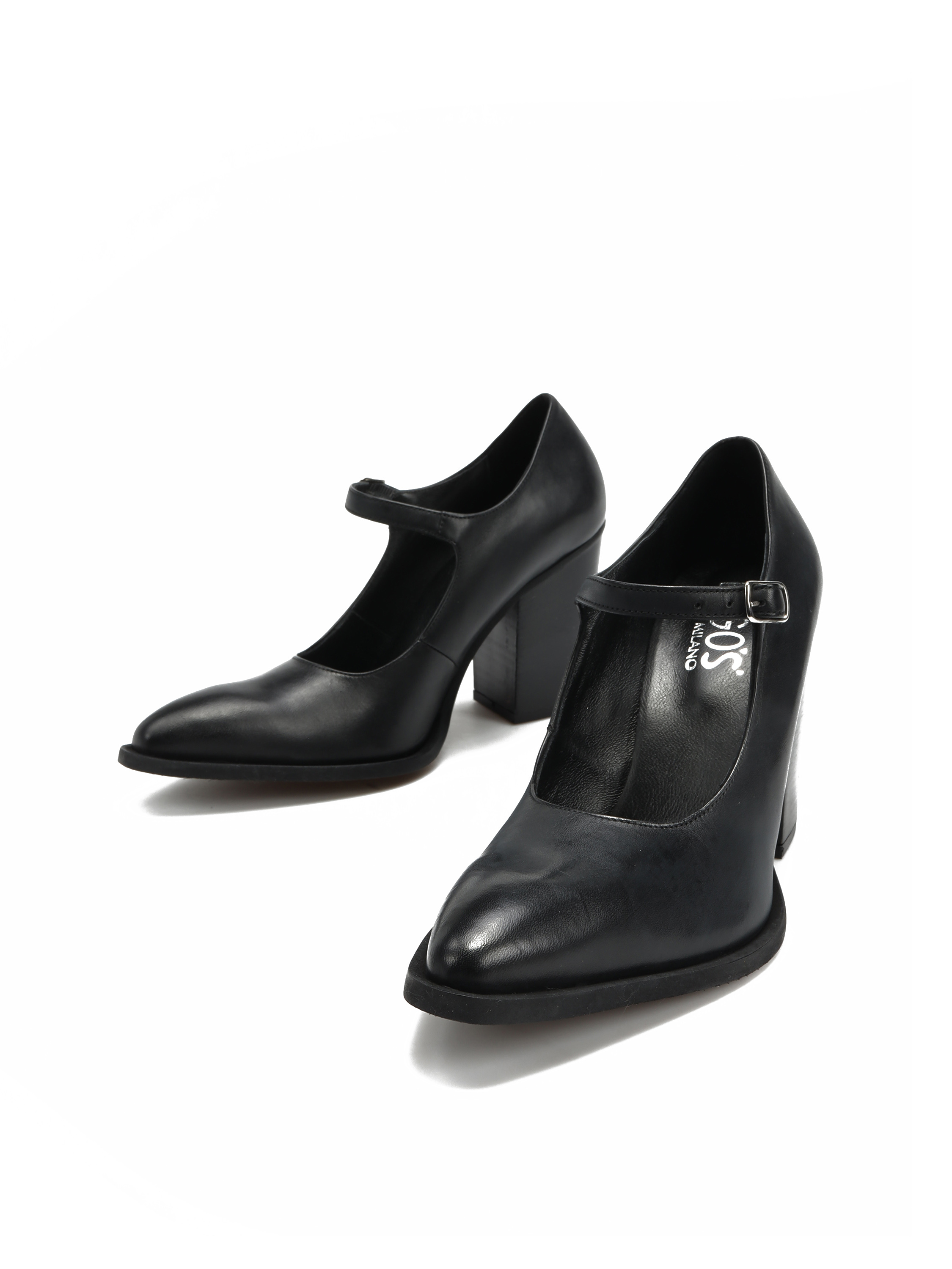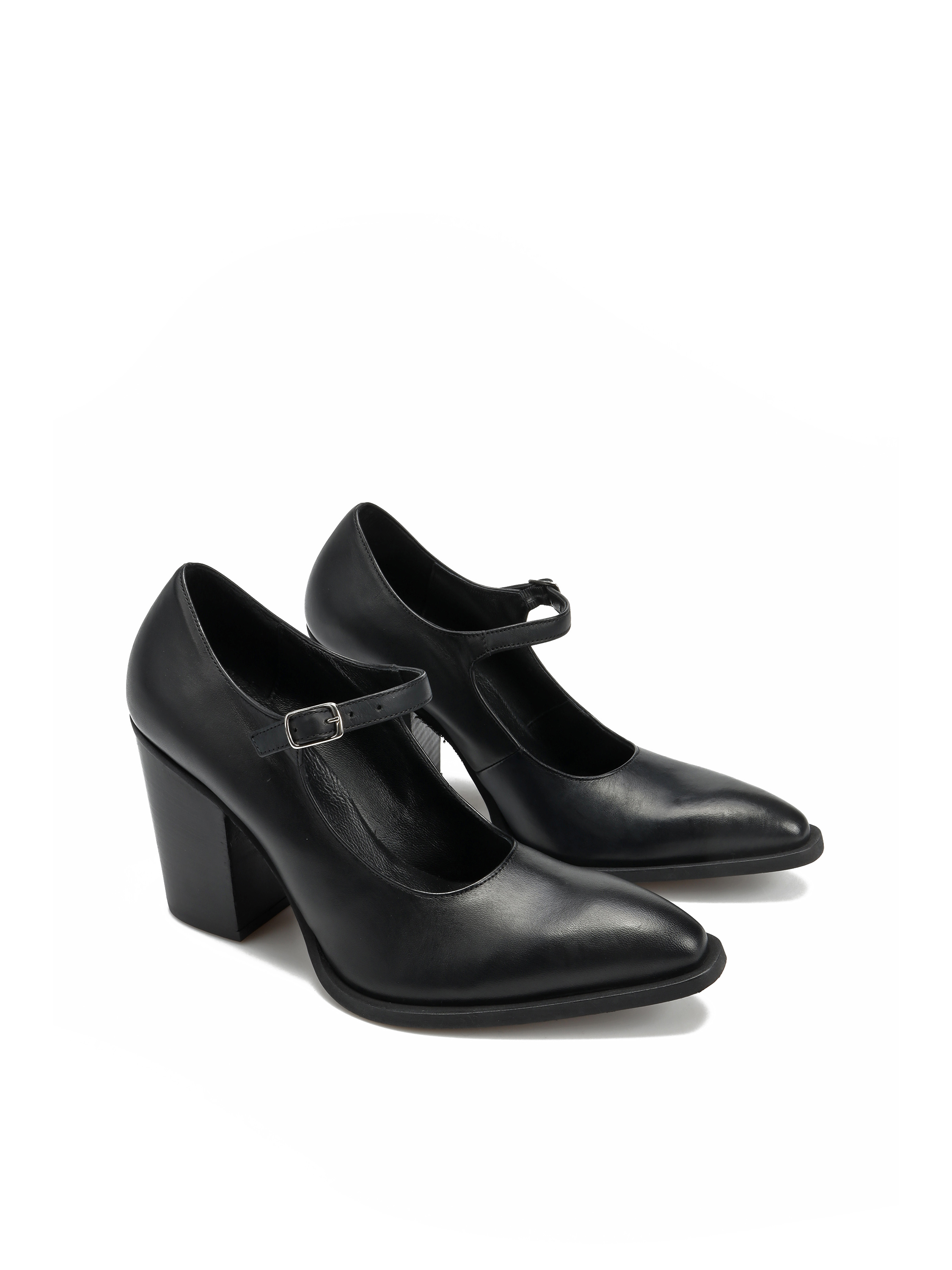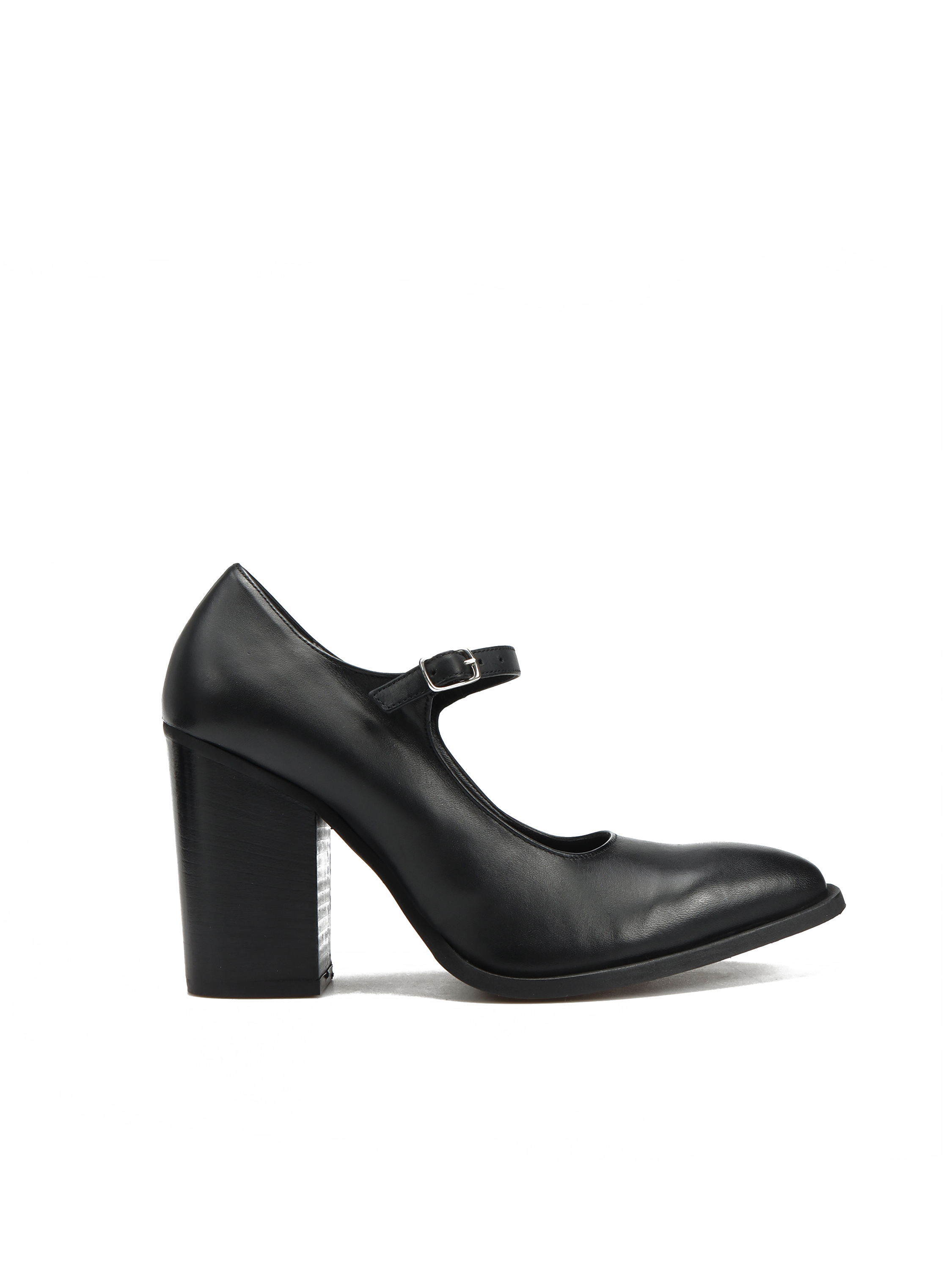 Model z charakterystycznym zapięciem w kostce i zaokrąglonym noskiem.