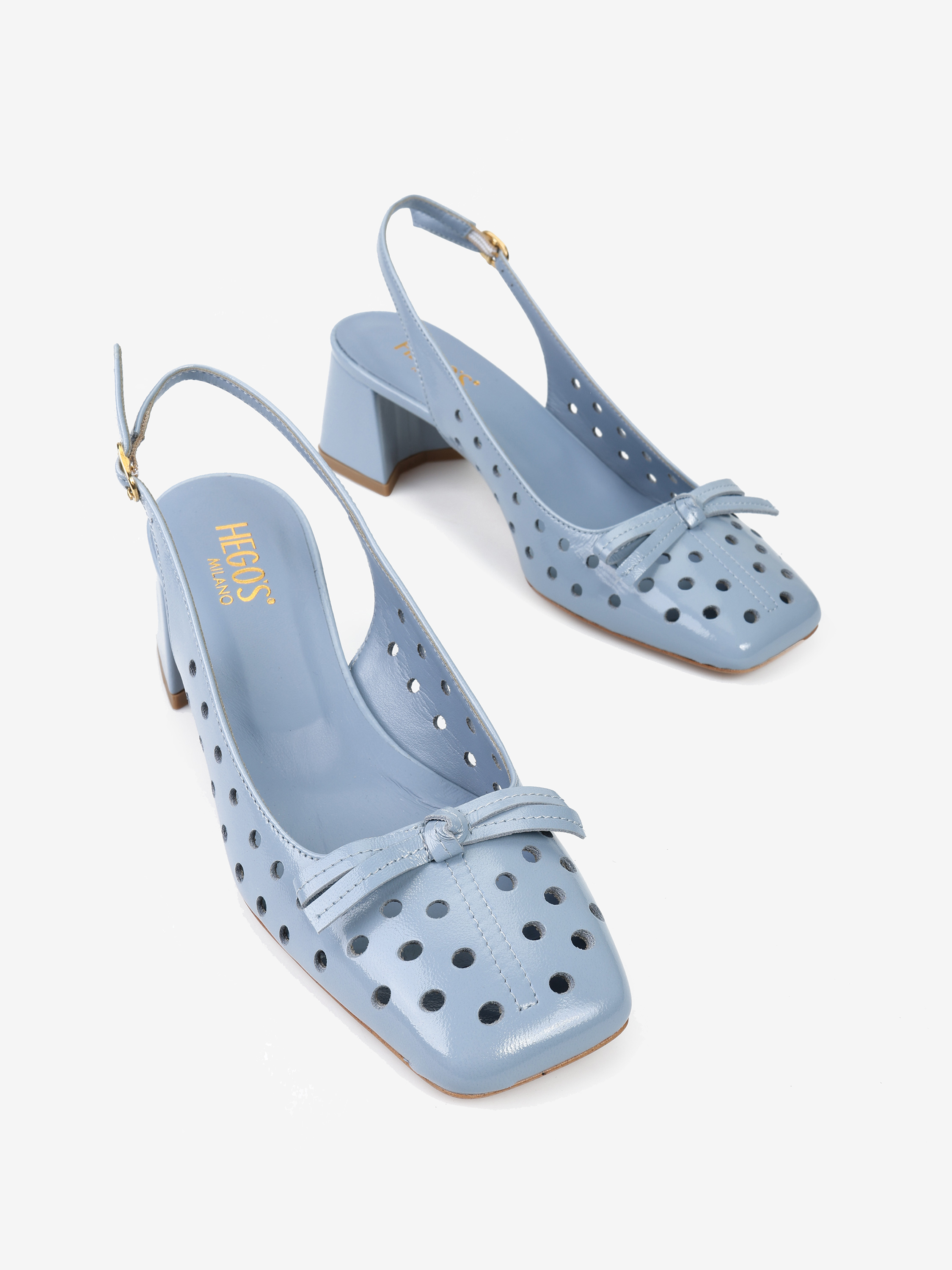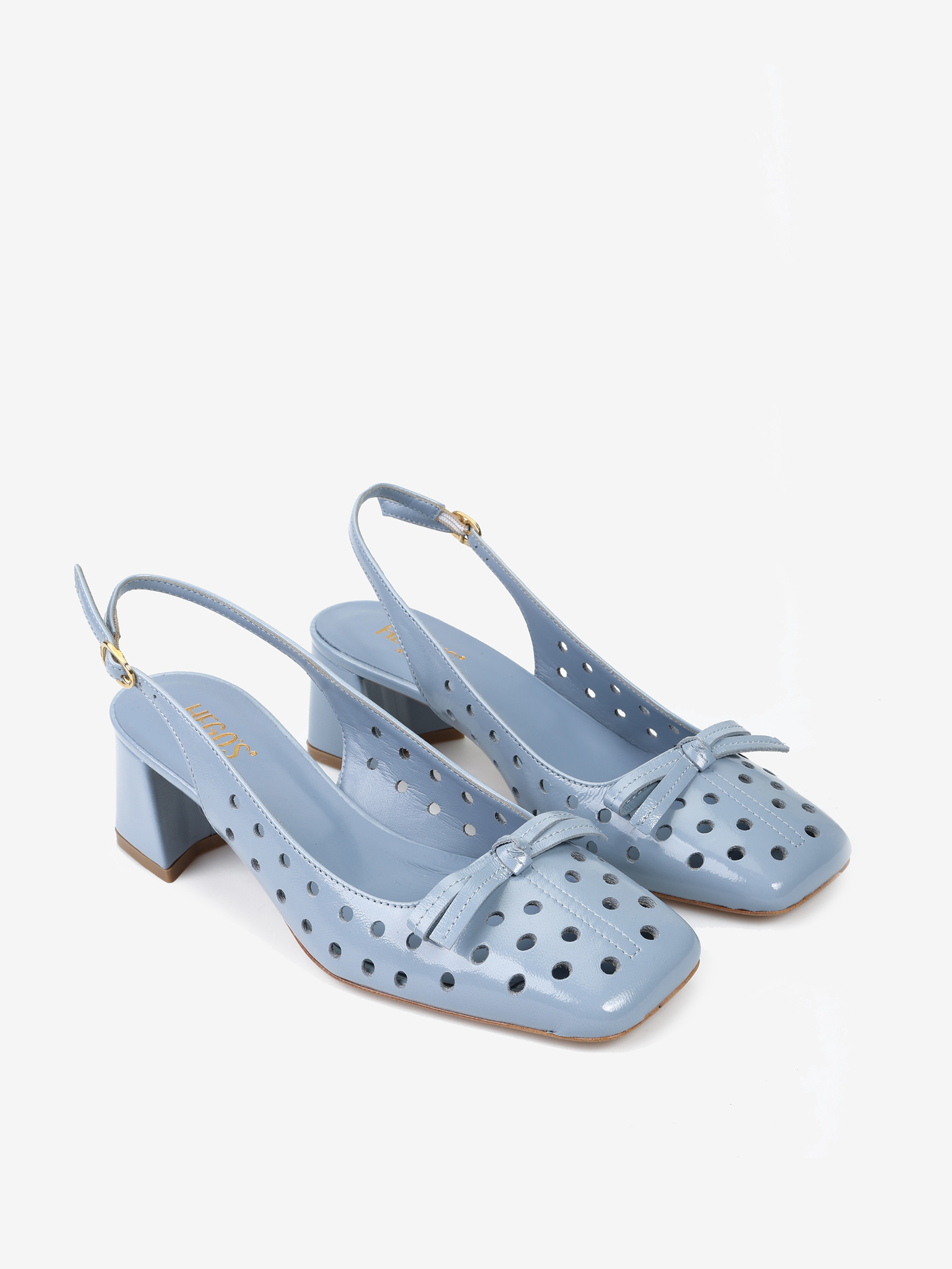 Ażurowe czółenka na słupku z kwadratowym noskiem i ozdobną kokardką. Odkryta pięta z regulowanym paskiem.