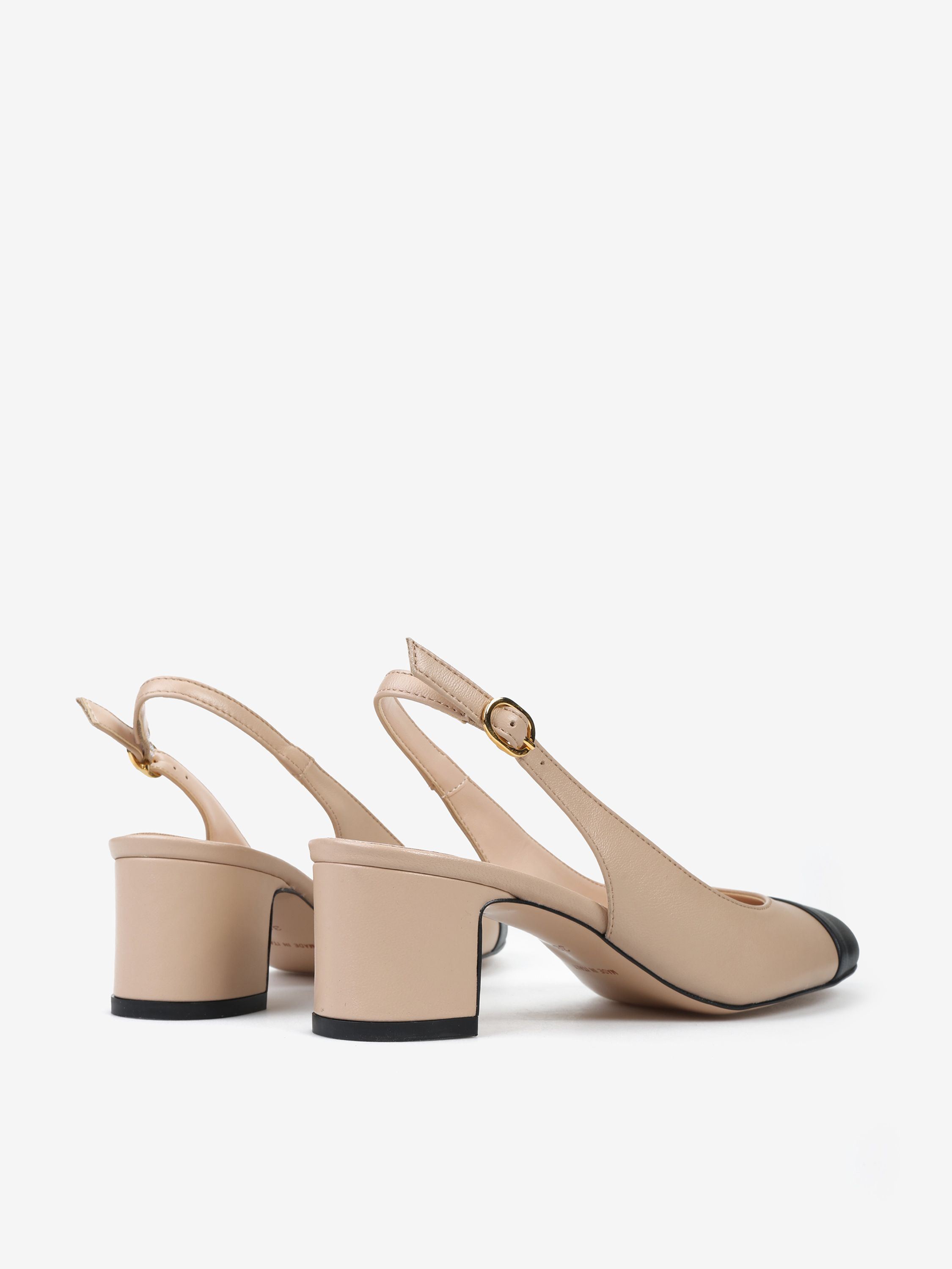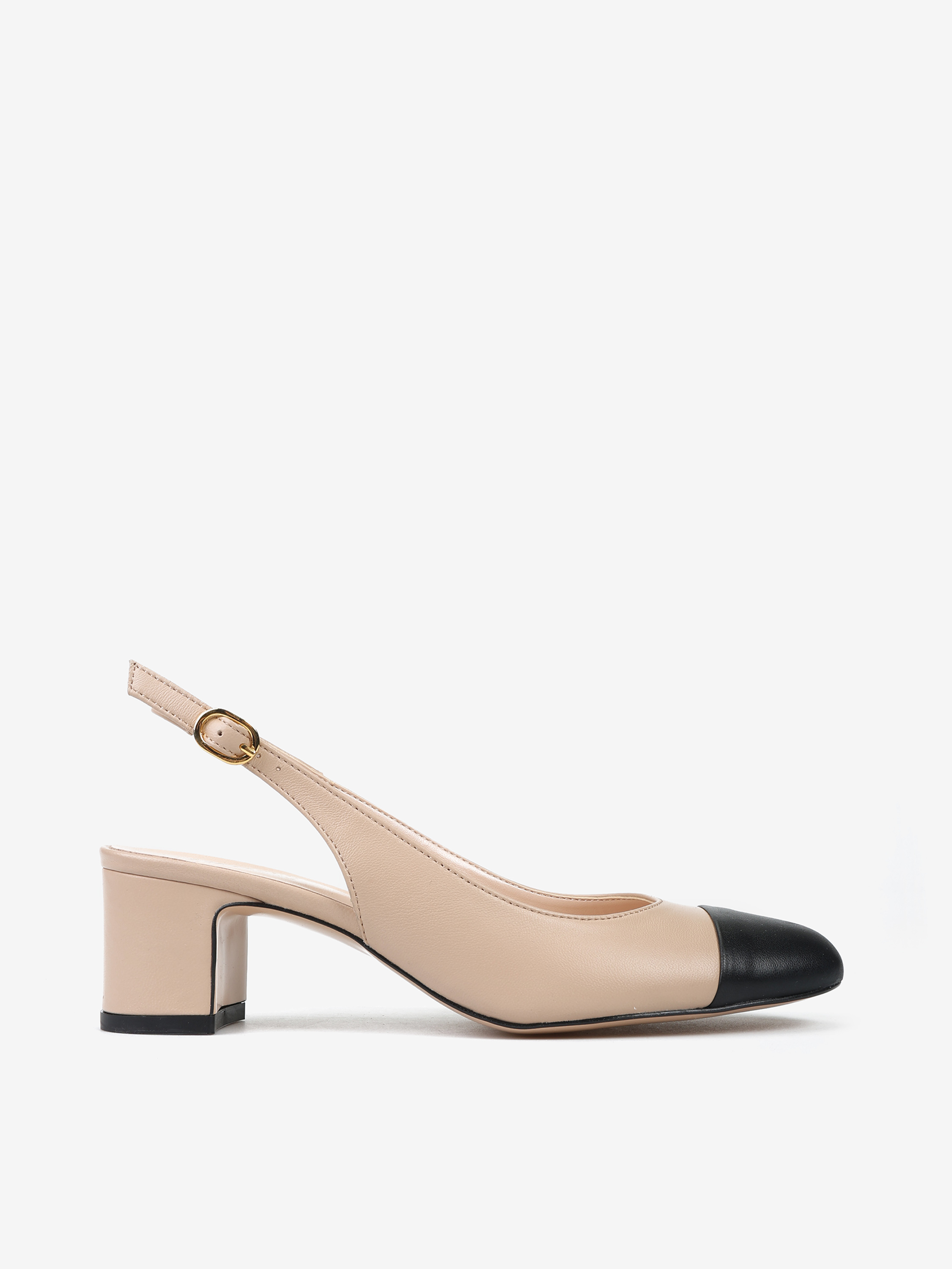 Klasyczne beżowe czółenka z okrągłym, czarnym noskiem. Odkryta pięta z regulowanym paskiem.