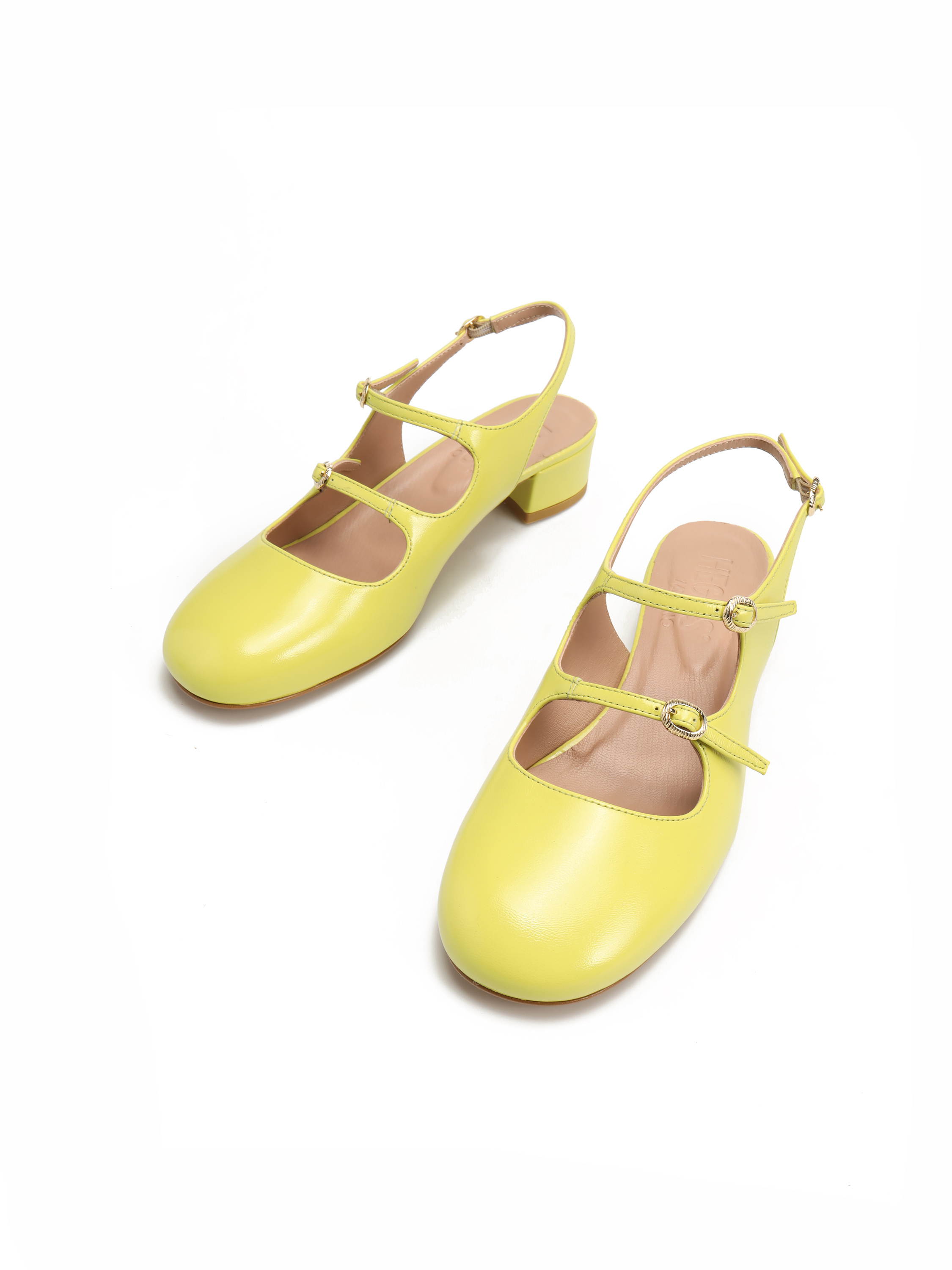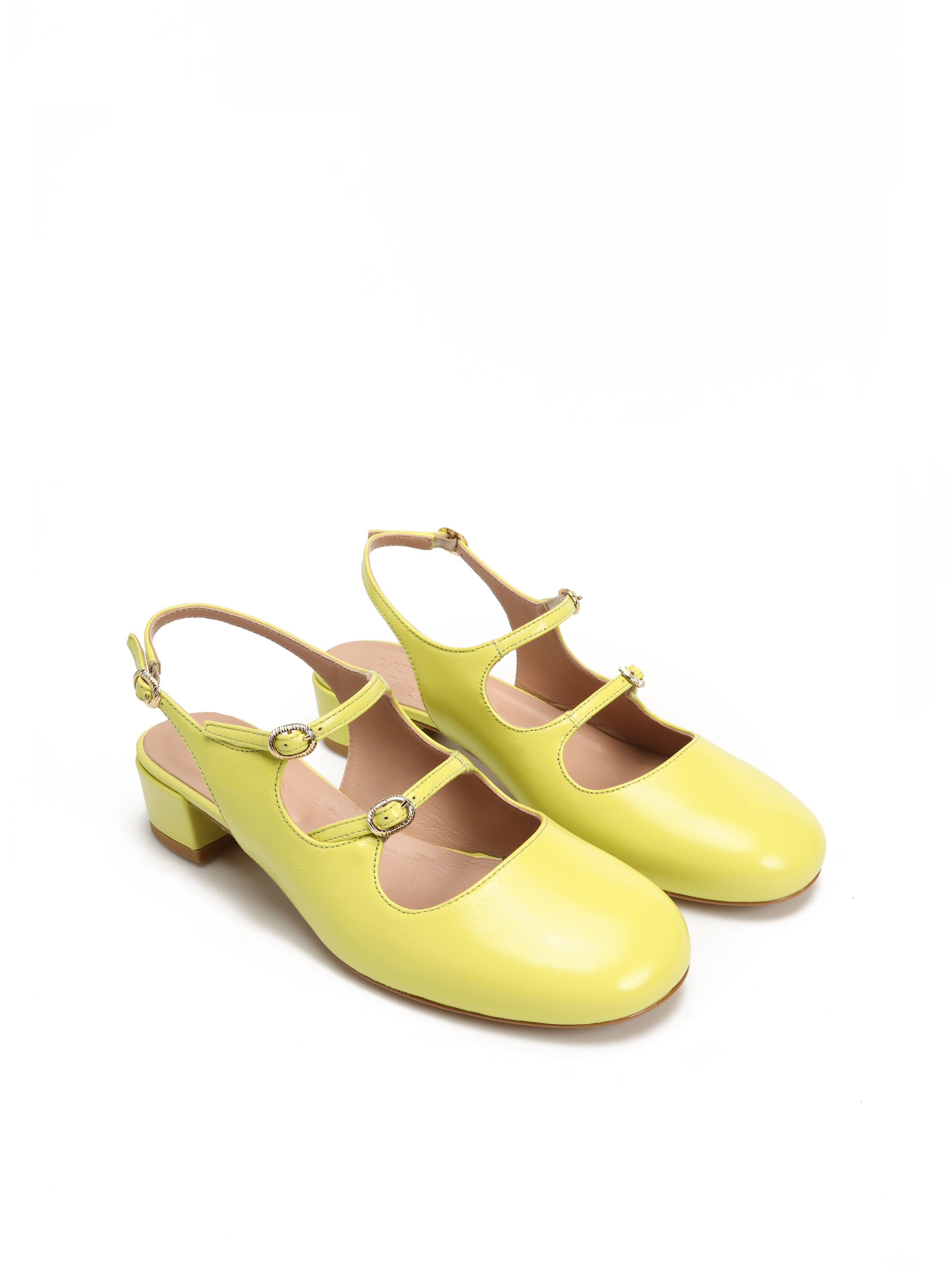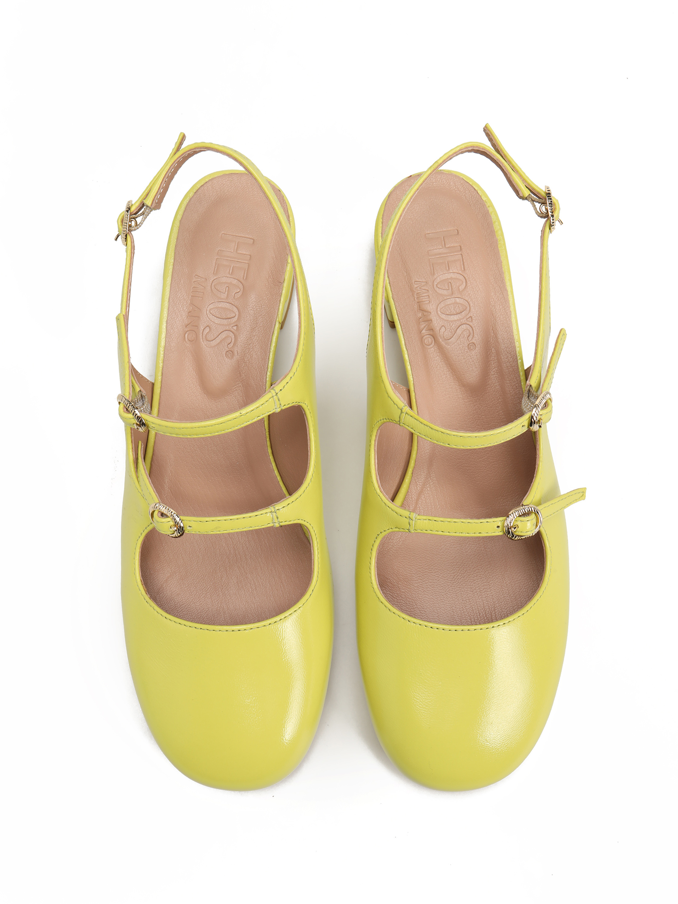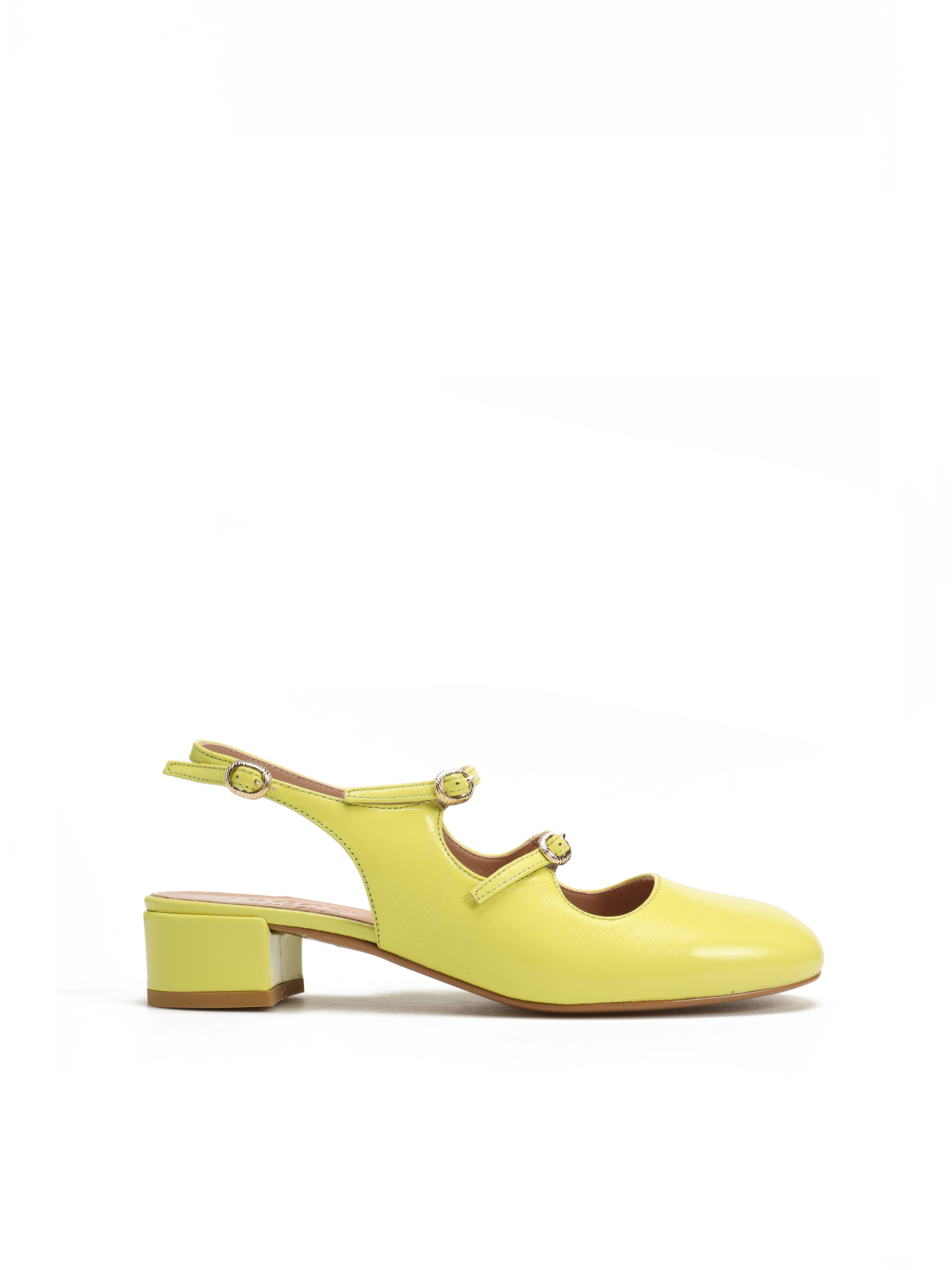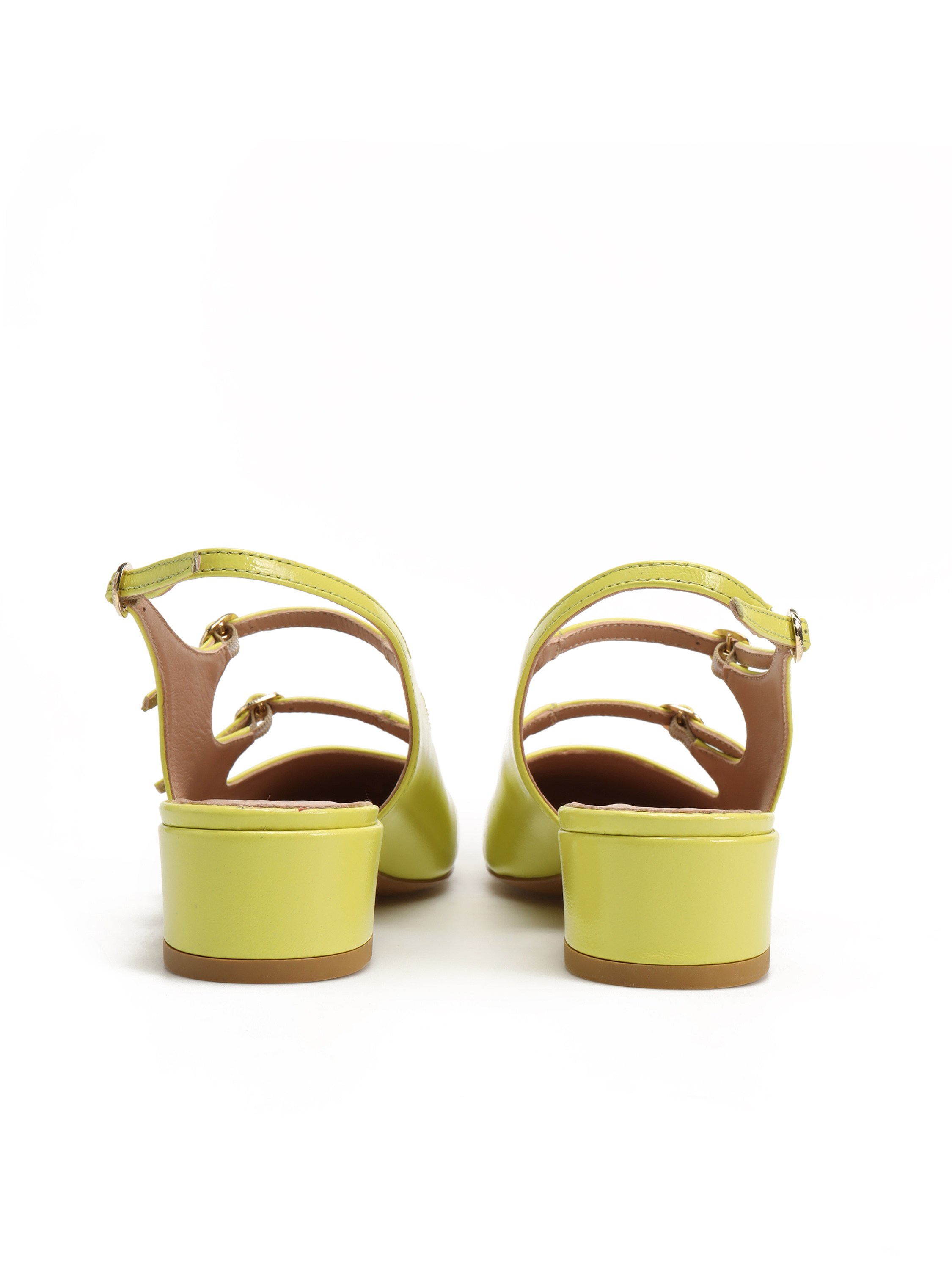 Czółenka z odkrytą piętą w stylu Mary Jane to gorący Trend sezonu. Wykonane są z naturalnej skóry. Cholewka w limonkowym kolorze posiada regulowane paski, które pozwolą dopasować obuwie do Twojej stopy. Model z okrągłym noskiem na niewysokim obcasie na słupku.