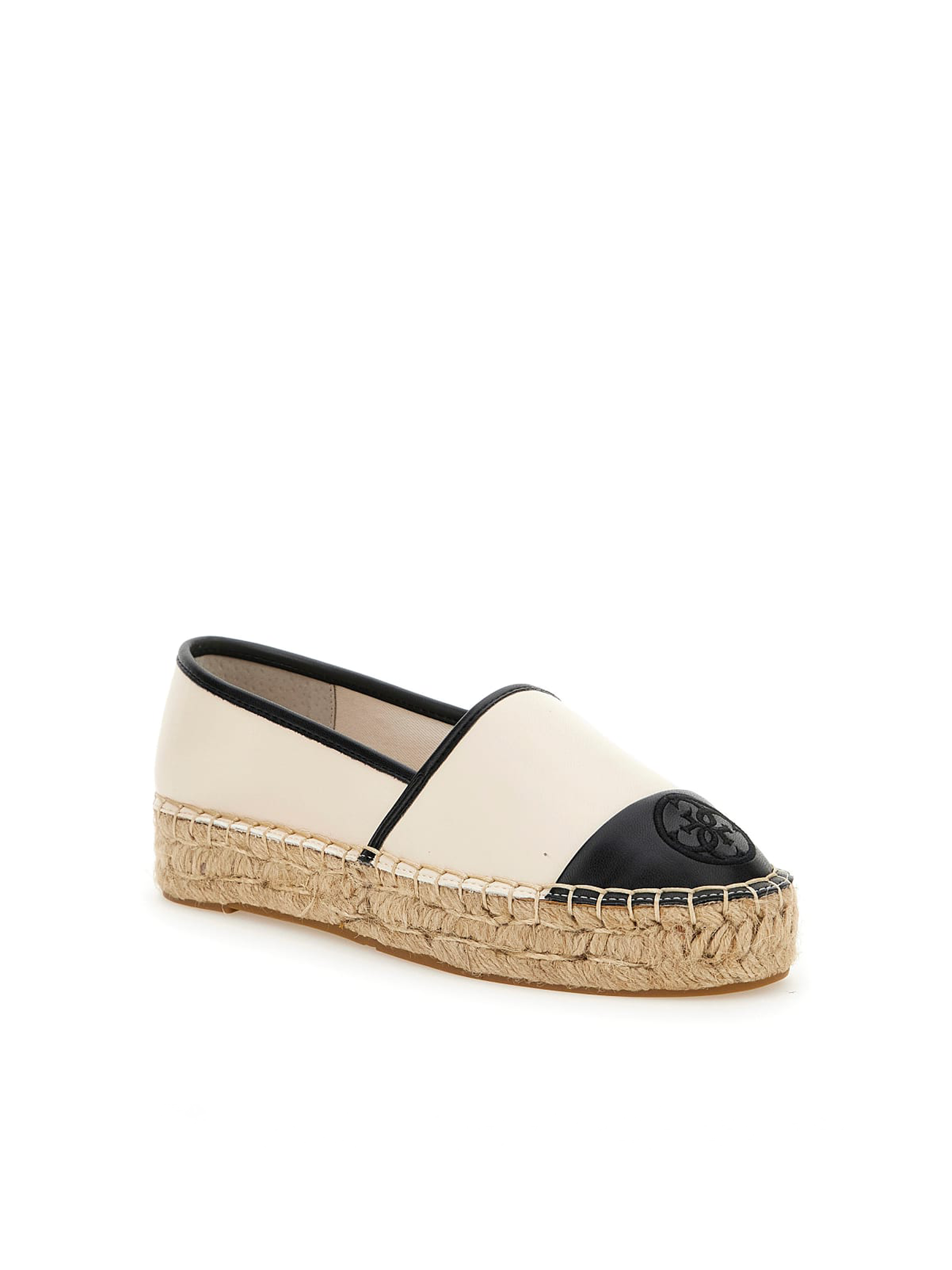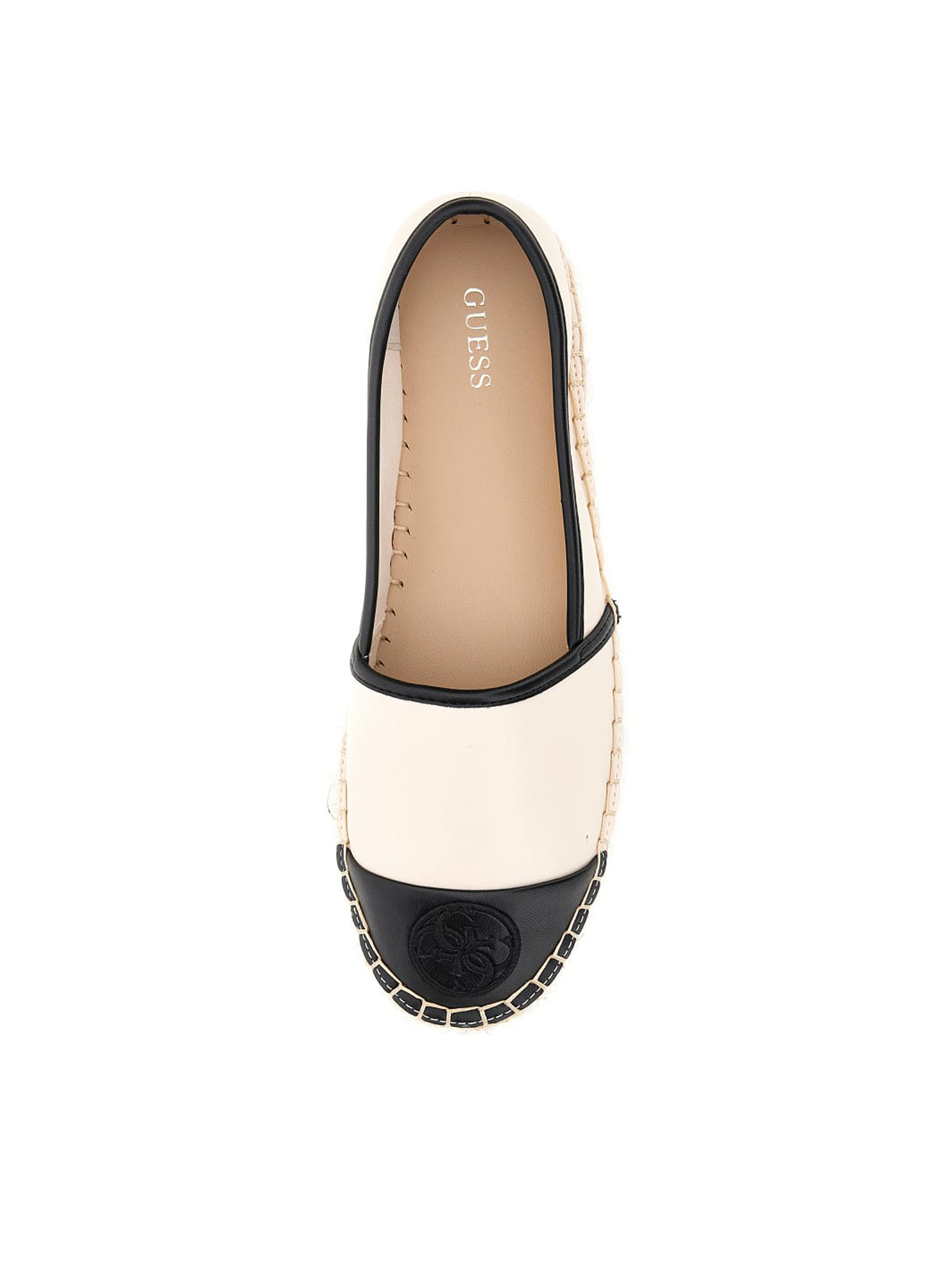 Espadryle damskie marki GUESS. Klasyczny kształt cholewki na niewielkiej platformie. Podeszwa wykonana została z gumy i opleciona słomianą jutą. Detale w postaci przeszyć cholewki oraz tłoczone logo marki GUESS na przodzie wyróżniają ten model. Klasyczne połączenie kolorów beżu i czerni oraz modna podwyższona podeszwa sprawdzą się do letnich stylizacji.