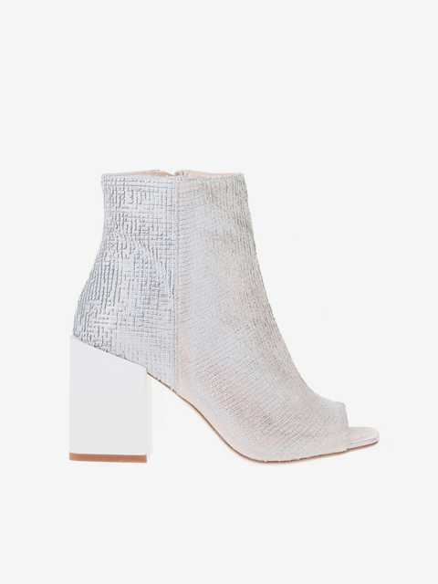 Botki Hego's w kolorze białym, z odkrytymi palcami osadzone na białym słupku o wysokości 8,5 cm, z zapięciem na zamek po wewnętrznej stronie. Posiadają skórzane wkładkę, podeszwę oraz wnętrze.