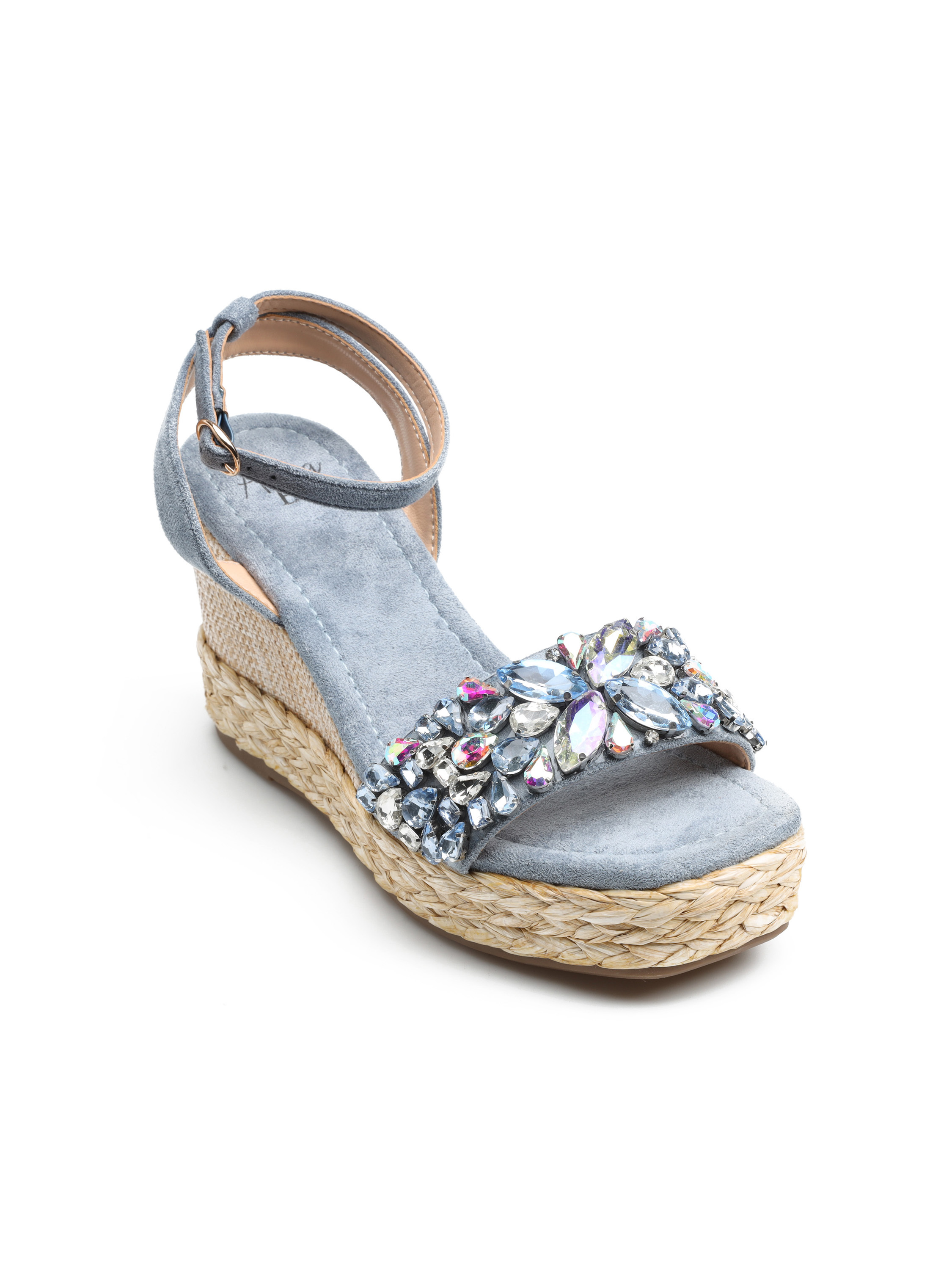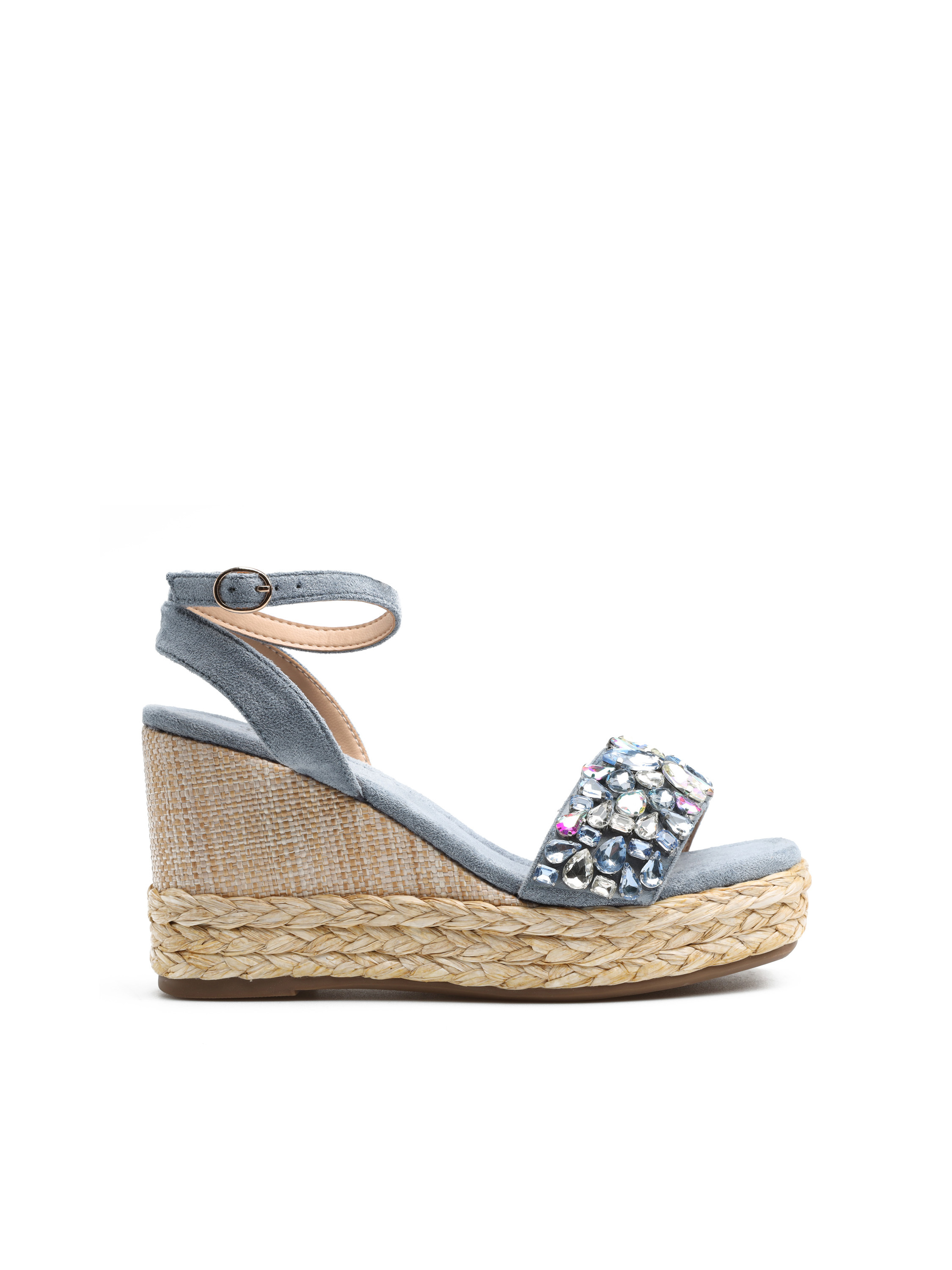 Espadryle damskie to fason zaprojektowany z myślą o kobietach szukających modnych i wygodnych rozwiązań. Model na koturnie obszytej pelcionką. Posiada regulowany pasek wokół kostki, który ułatwia dopasowanie obuwia do stopy. Cholewka ozdobiona została biżuteryjnymi kamieniami. Espadryle to fason idealny na lato. Będzię uzupłnieniem modnej garderoby kobiety.