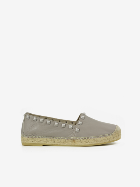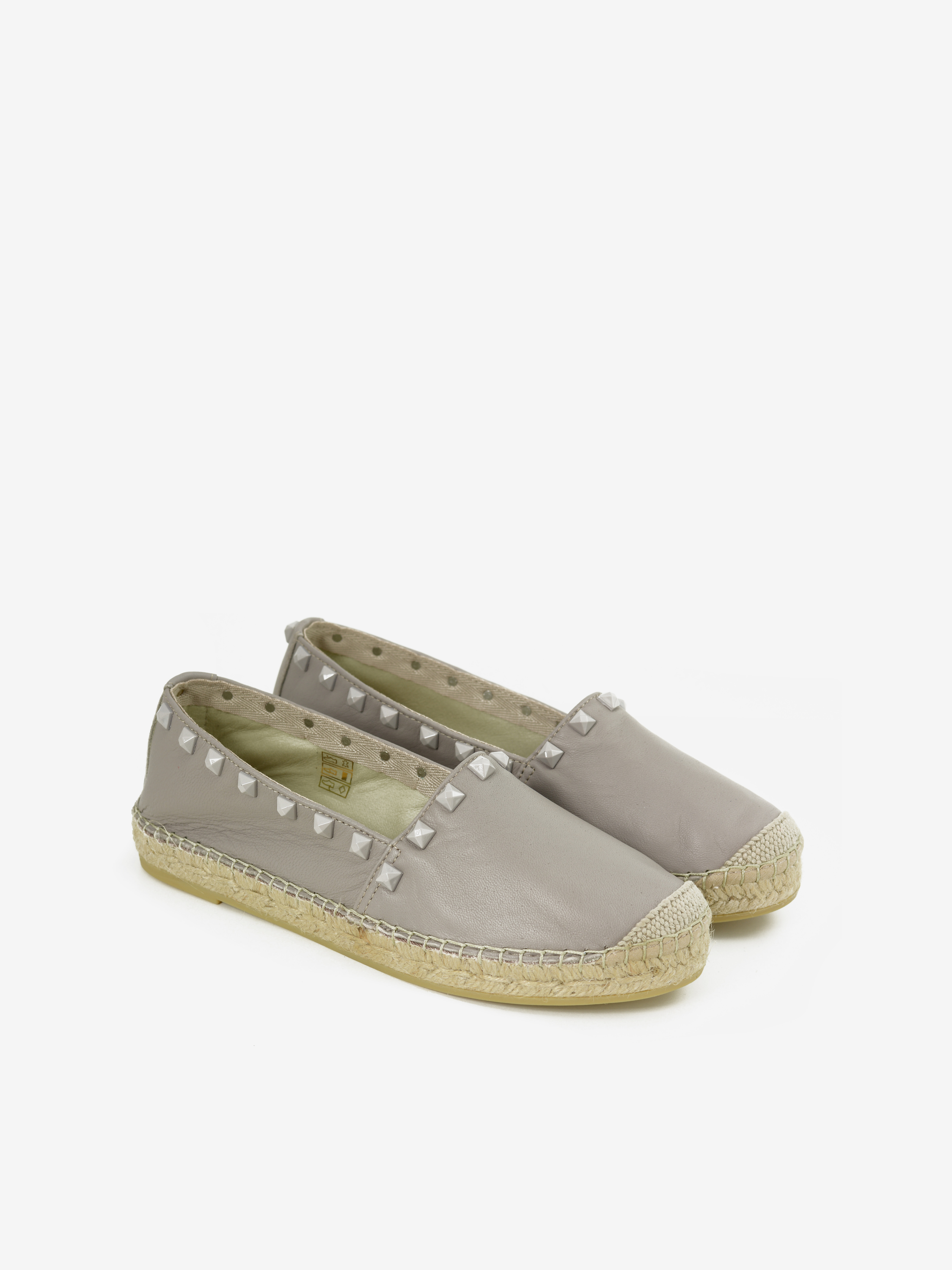 Model ze skórzaną cholewką ozdobioną dopasowanymi kolorystycznie ćwiekami. Materiałowe wnętrze. Podeszwa z tworzywa, wykończona plecionką.