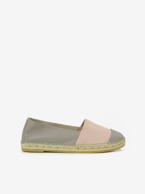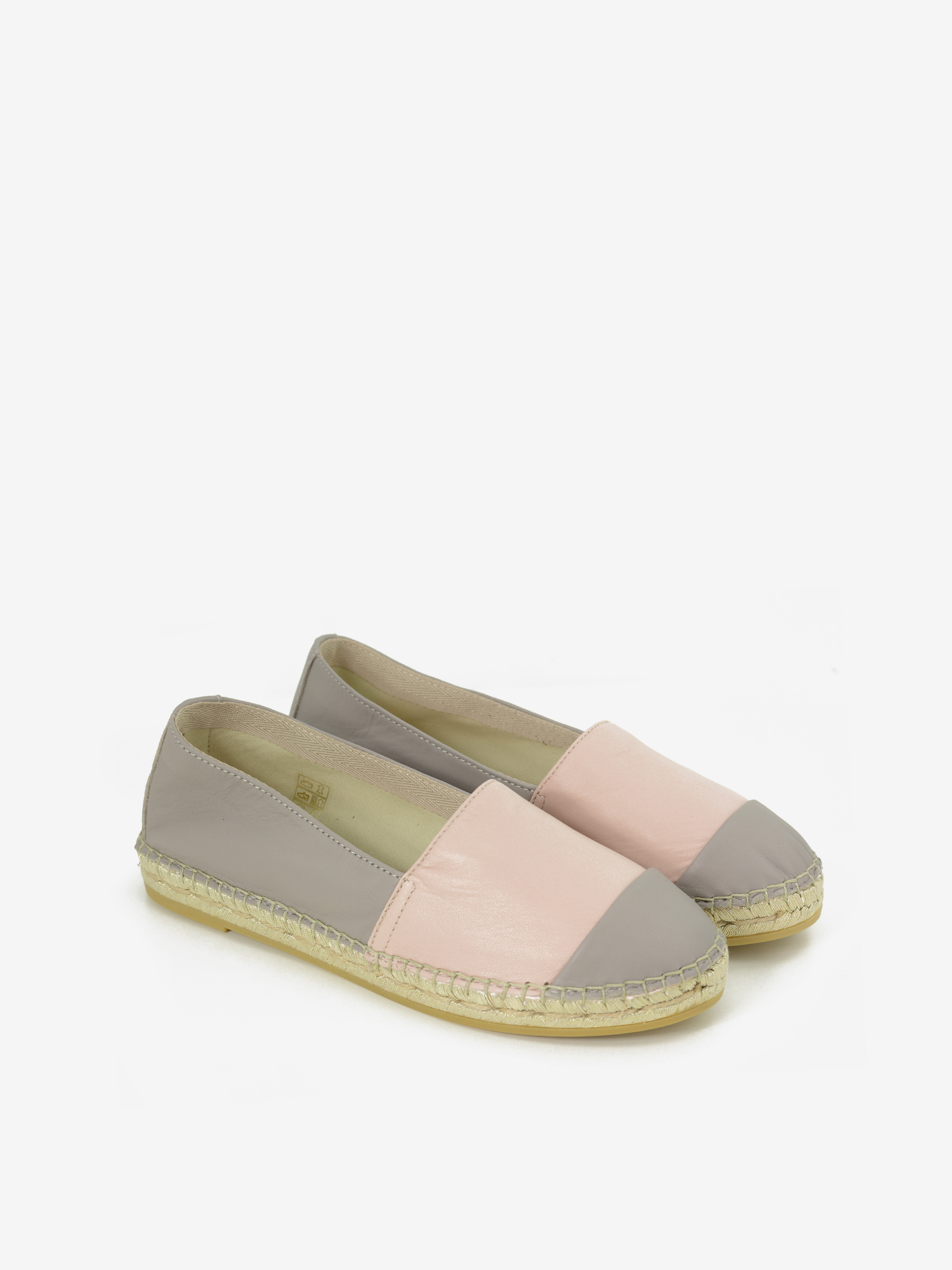 Model ze skórzaną, dwukolorową cholewką. Materiałowa wkładka. Częściowo skórzane, cześciowo materiałowe wnętrze. Podeszwa z tworzywa, wykończona plecionką.