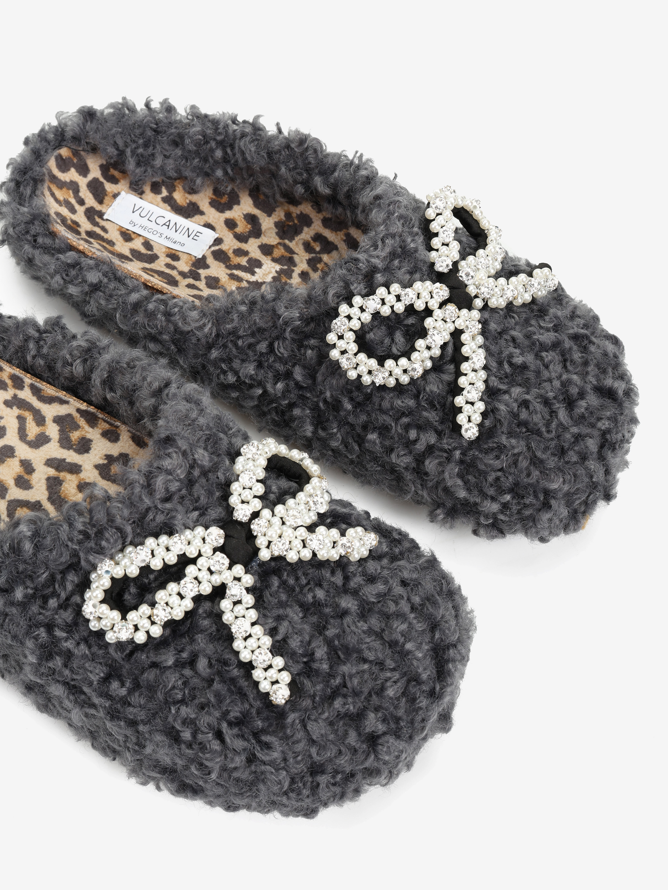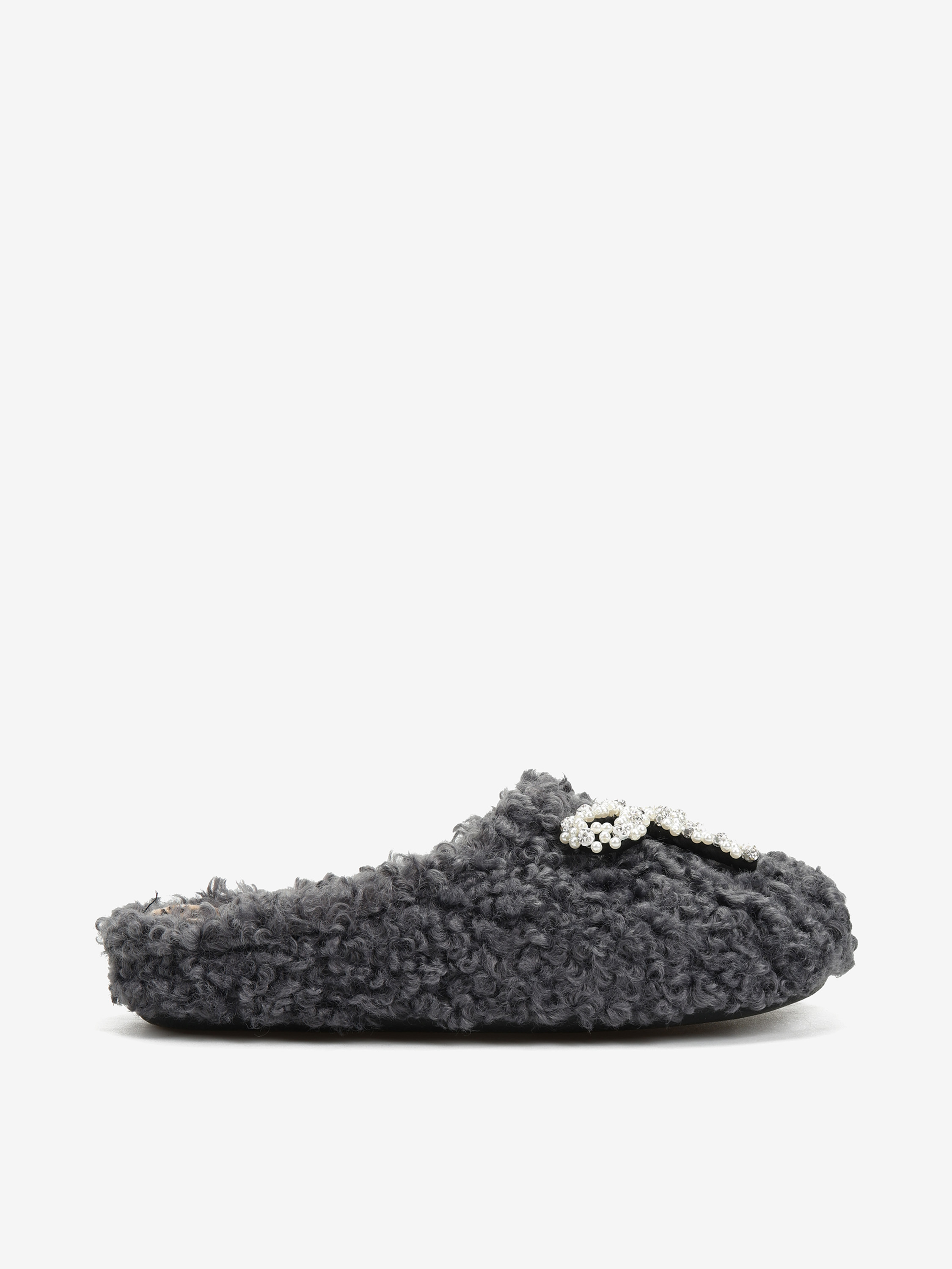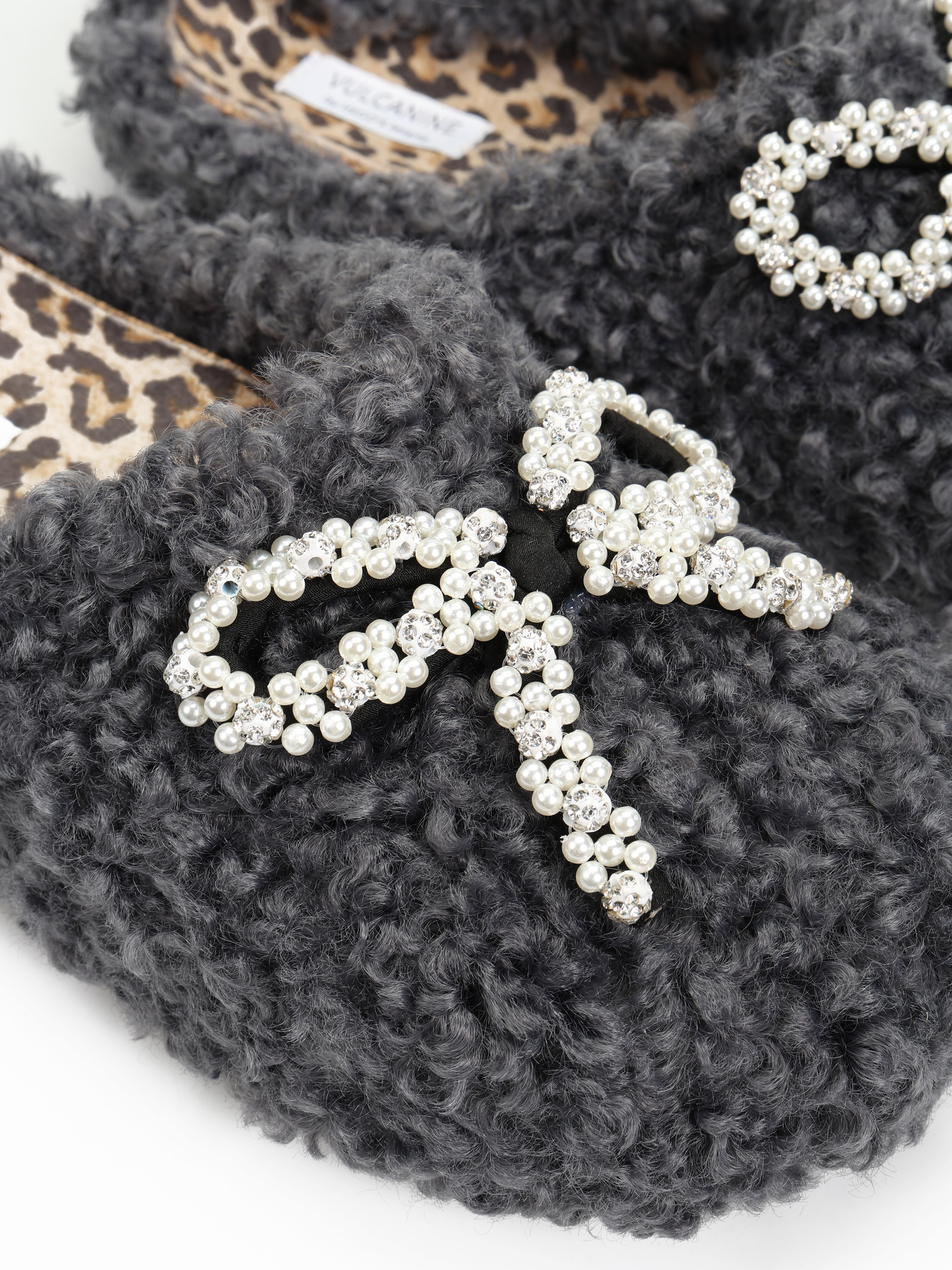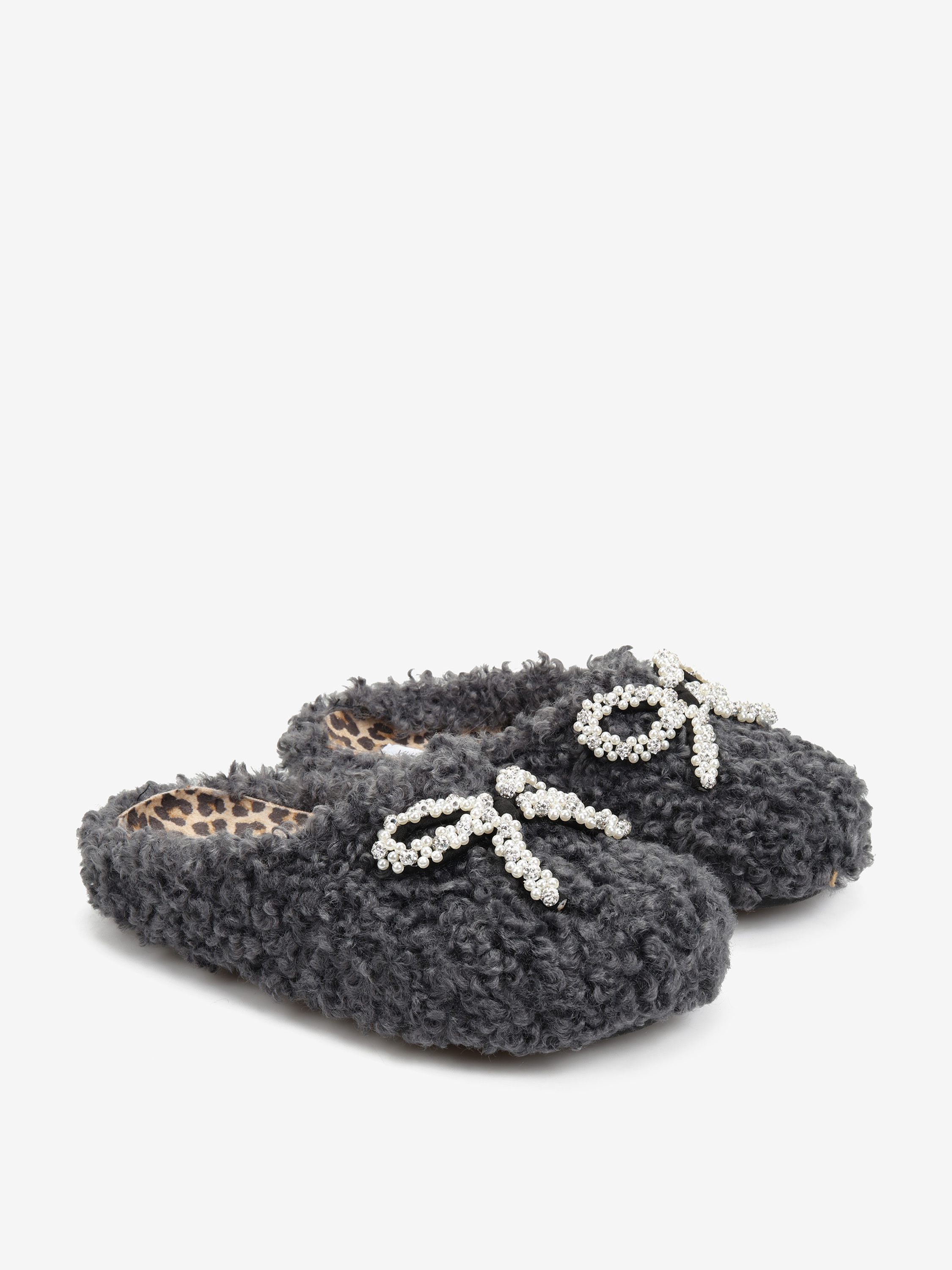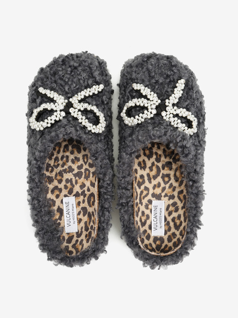 Wsuwane kapcie wykonane z miękkiej tkaniny imitujacej futro baranka. Ozdobna kokarda z perełkami.