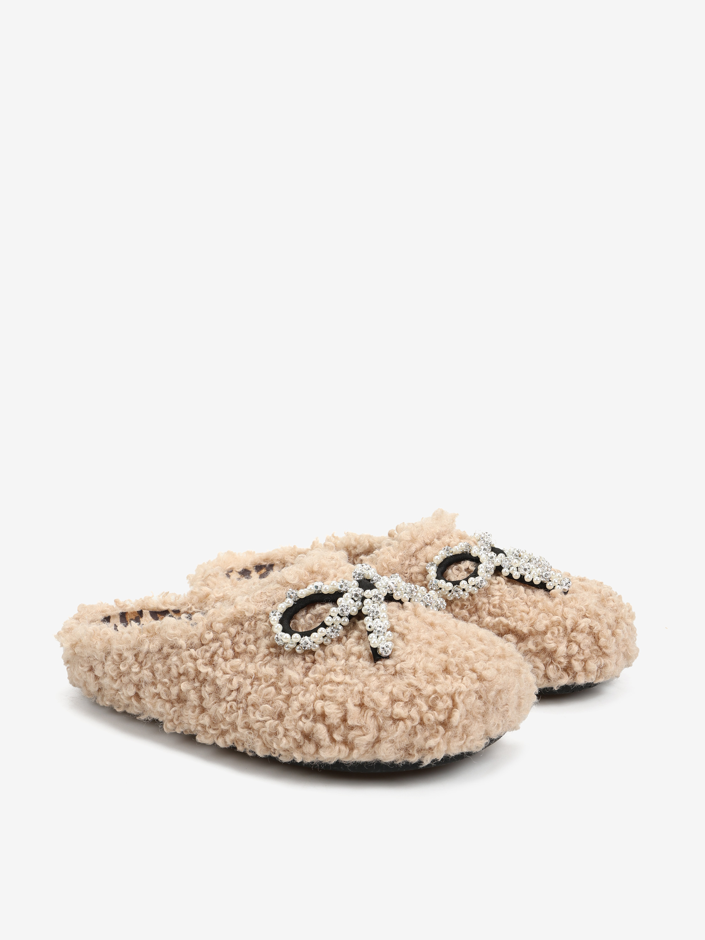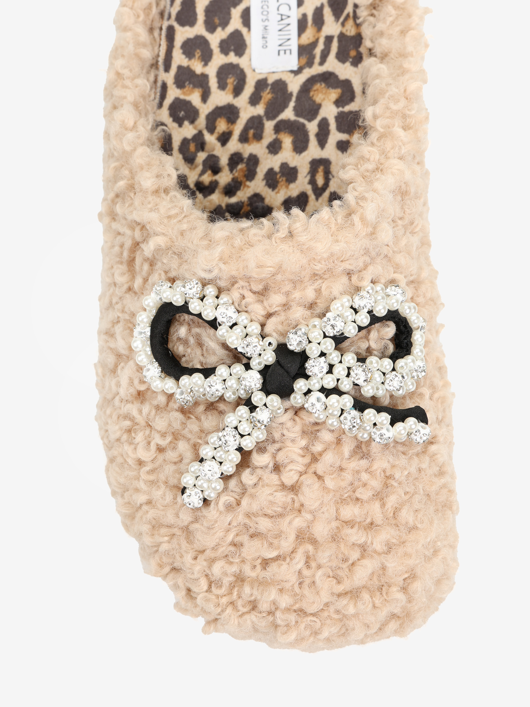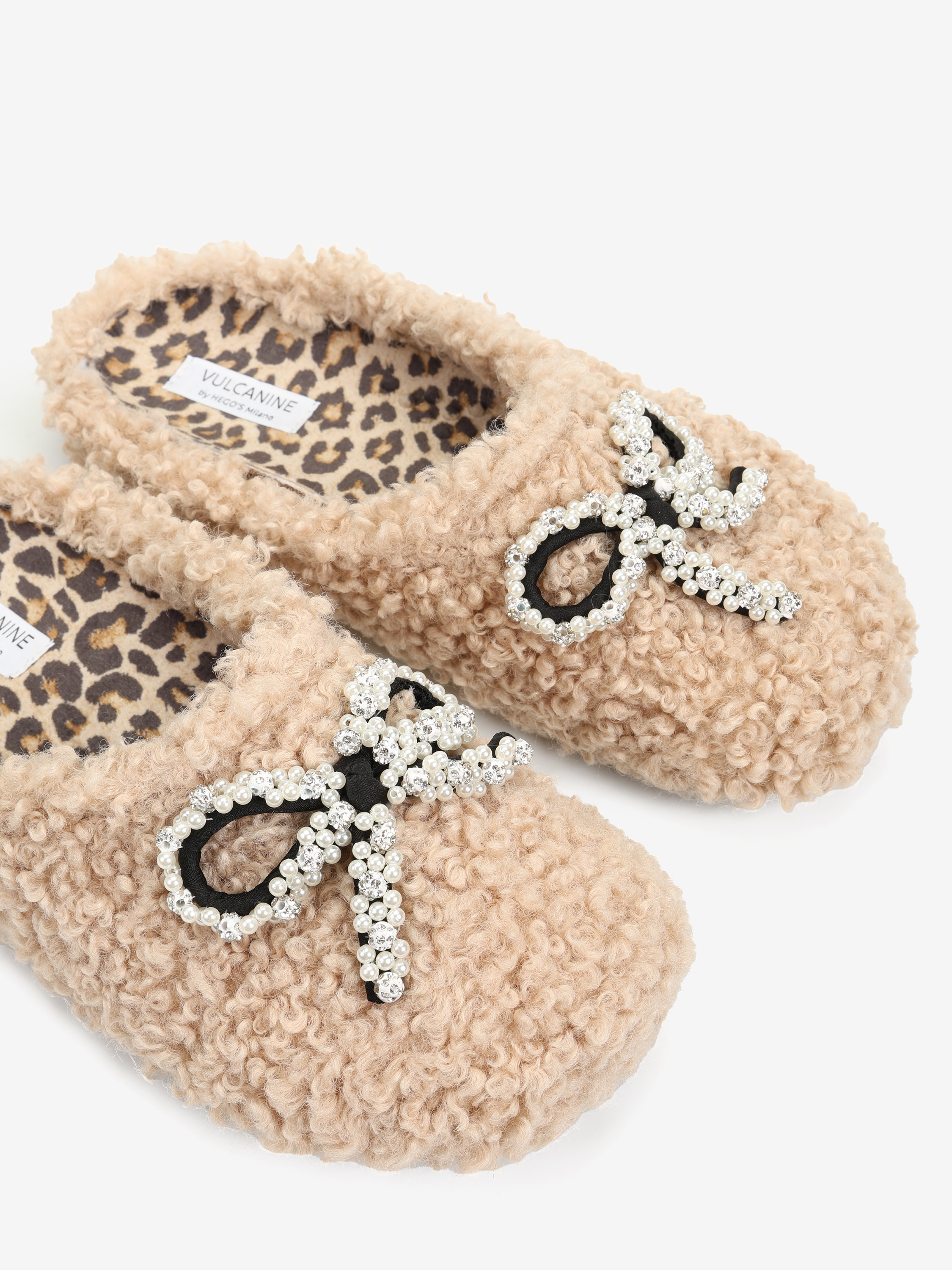 Wsuwane kapcie wykonane z miękkiej tkaniny imitujacej futro baranka. Ozdobna kokarda z perełkami.
