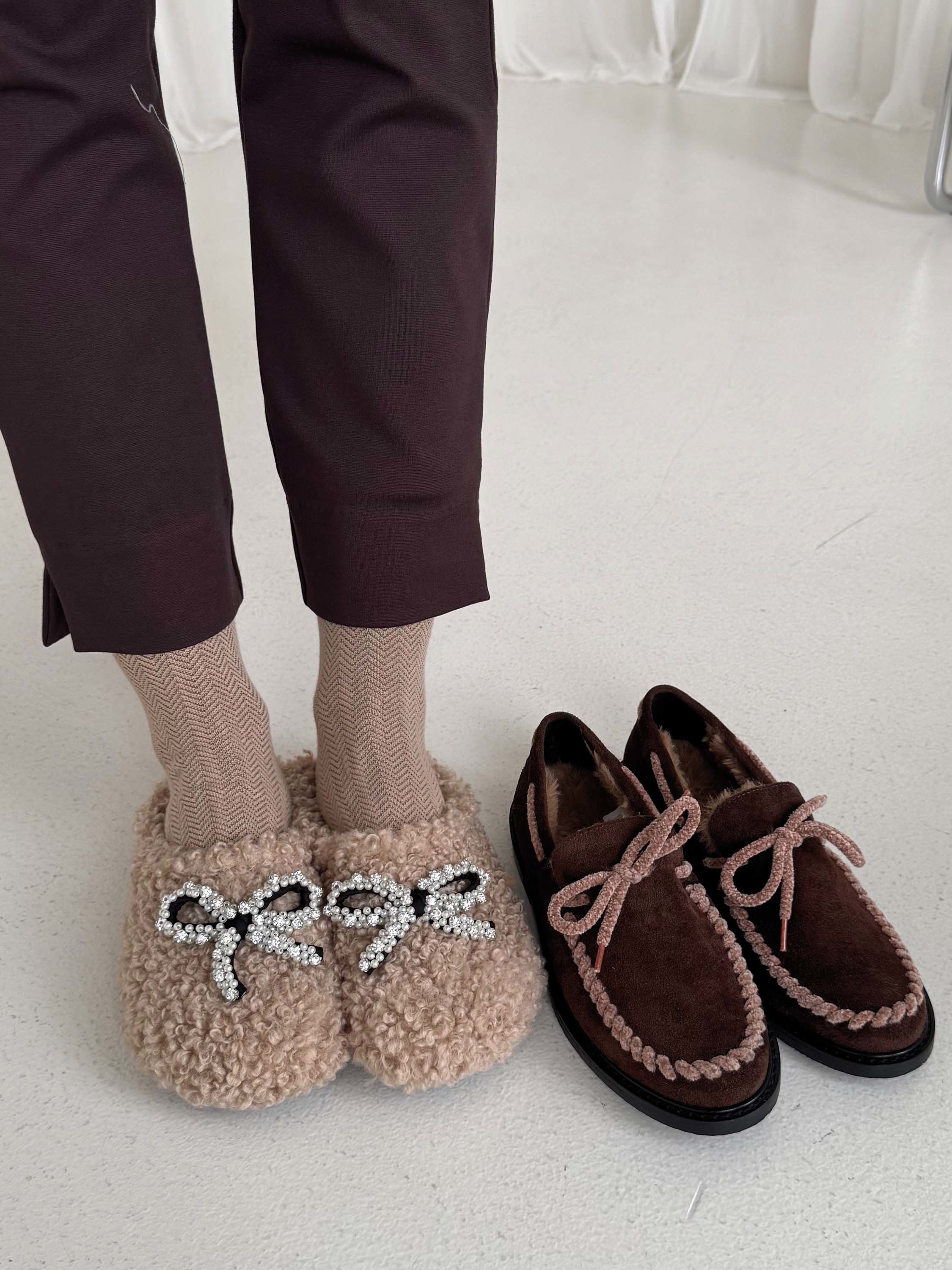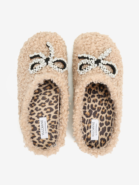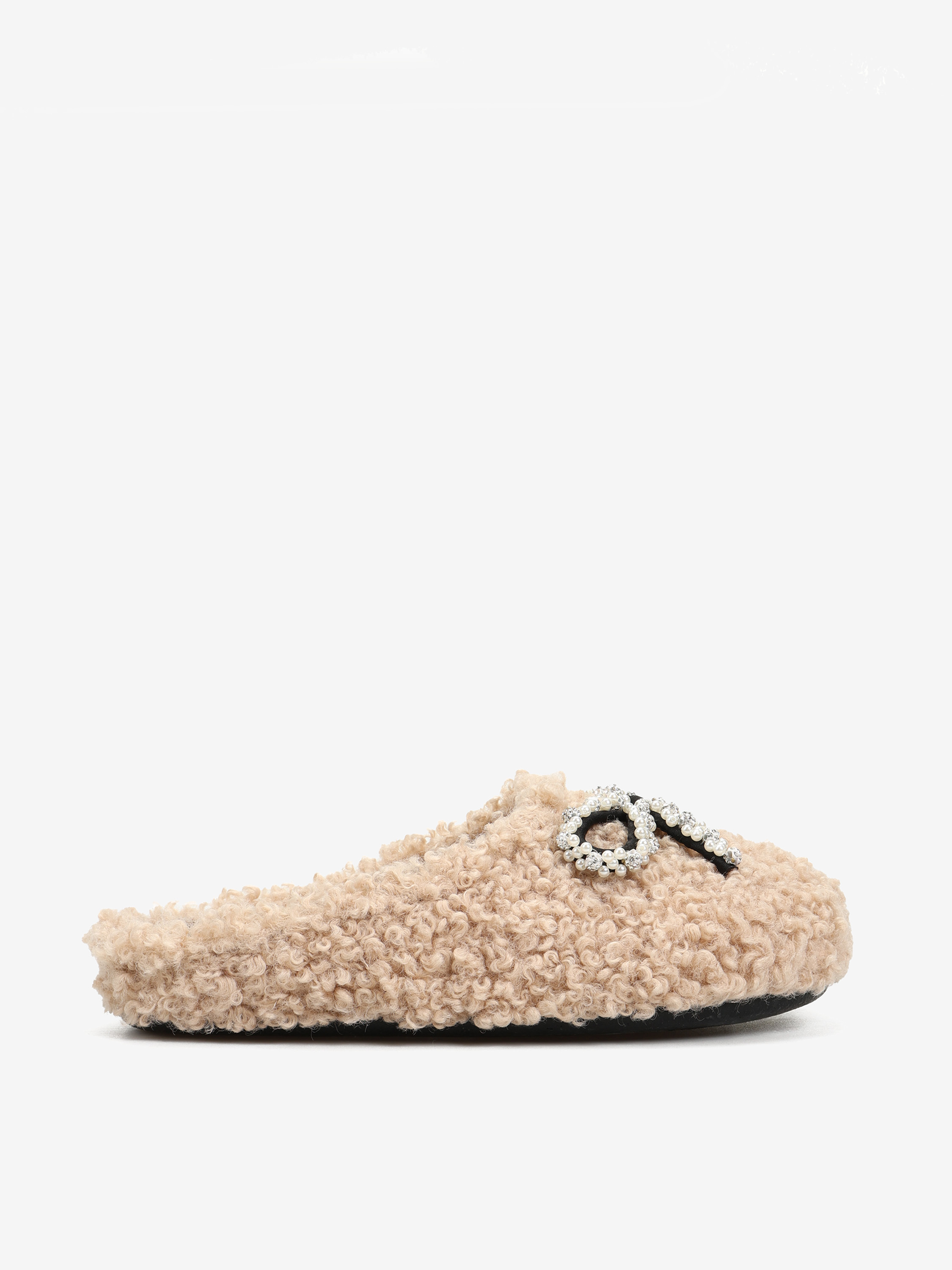 Wsuwane kapcie wykonane z miękkiej tkaniny imitujacej futro baranka. Ozdobna kokarda z perełkami.