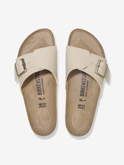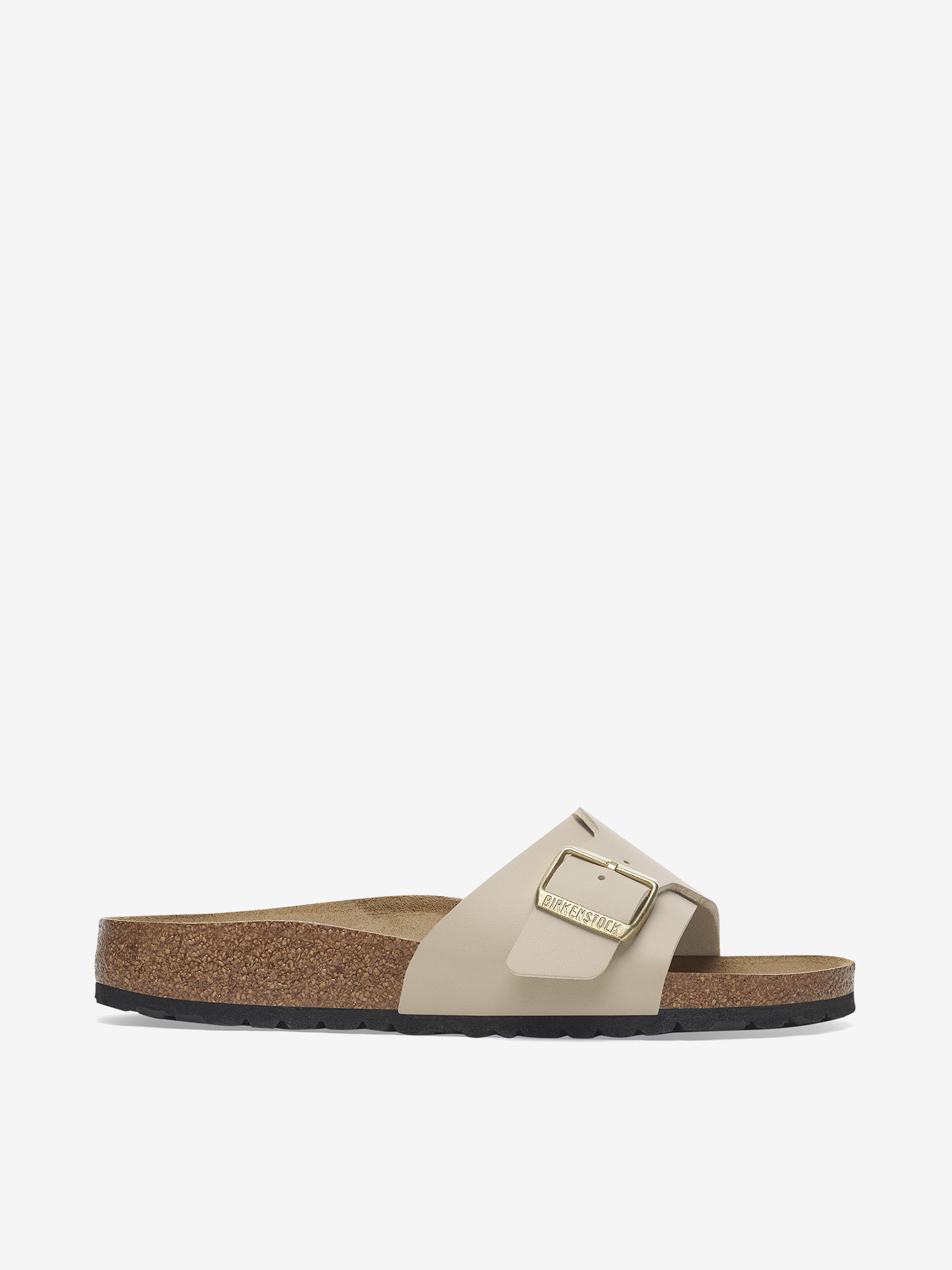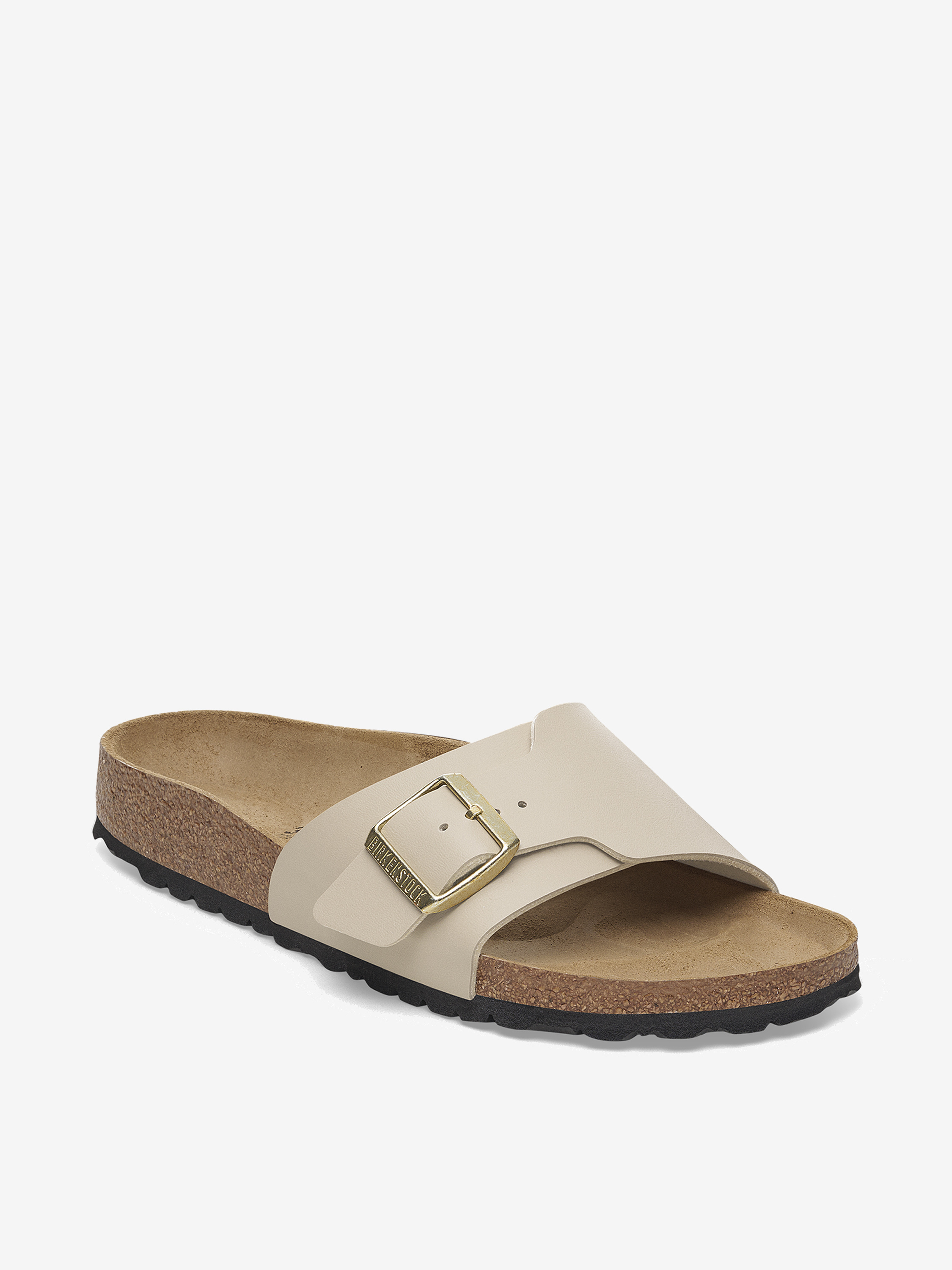 Wzornictwo modelu Catalina marki BIRKENSTOCK opiera się na popularnym, klasycznym modelu Madrid z paskiem i metalową klamrą. Klapki zostały wyposażone w nieco szerszy pasek, który nadaje obuwiu wyrazistości i podkreśla jego męski charakter. Materiał wierzchni obuwia to przyjazne dla skóry i wytrzymałe tworzywo syntetyczne Birko-Flor® o delikatnie połyskującej powierzchni.