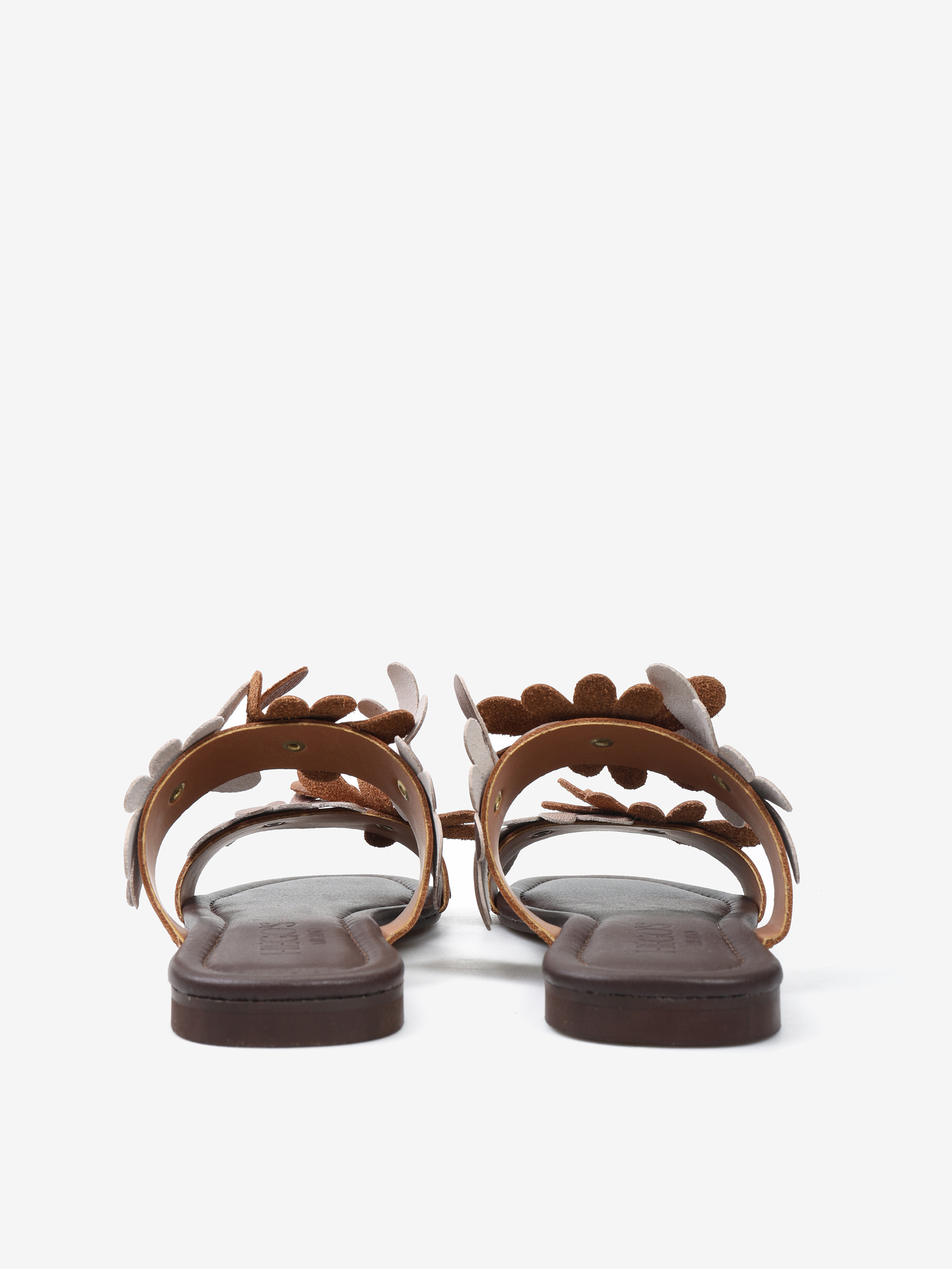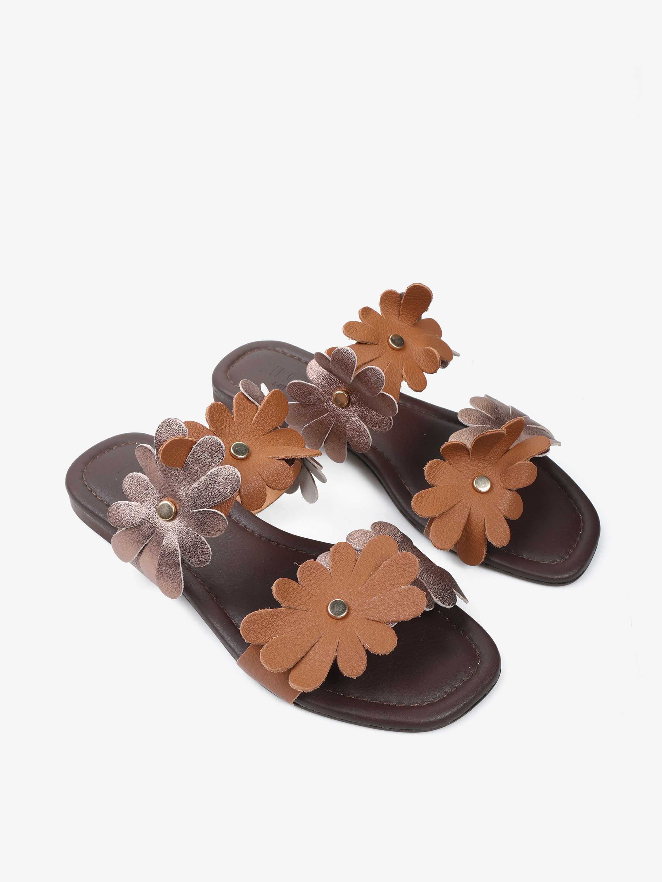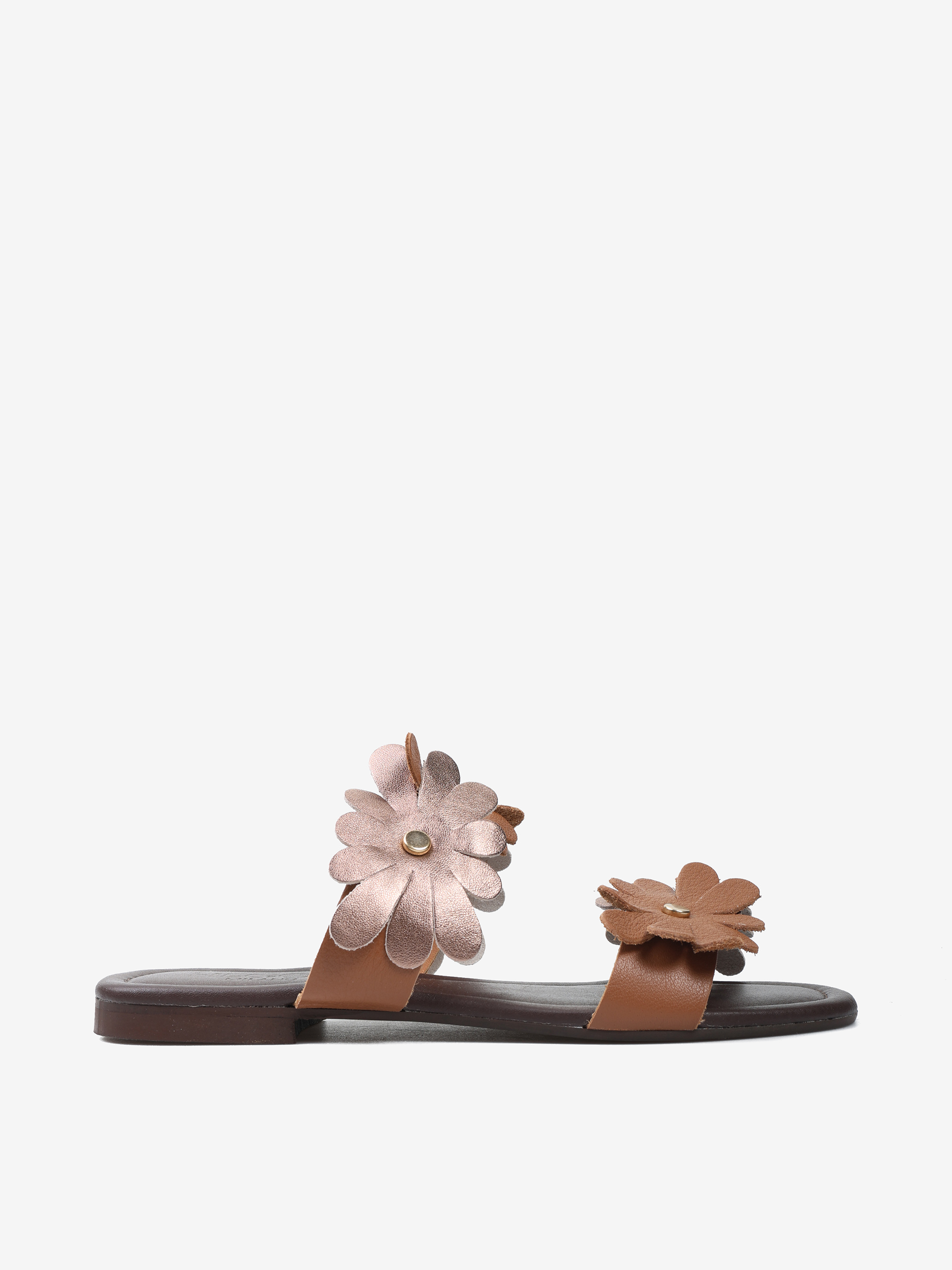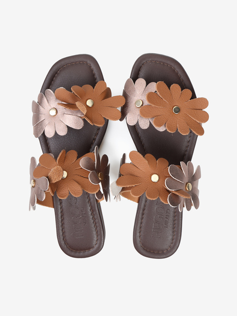 Skórzane klapki na płaskiej podeszwie wykonane z miękkiej, delikatnej skóry. Dwa paski z ozdobnymi kwiatami ze skóry naturalnej i metalizowanej.