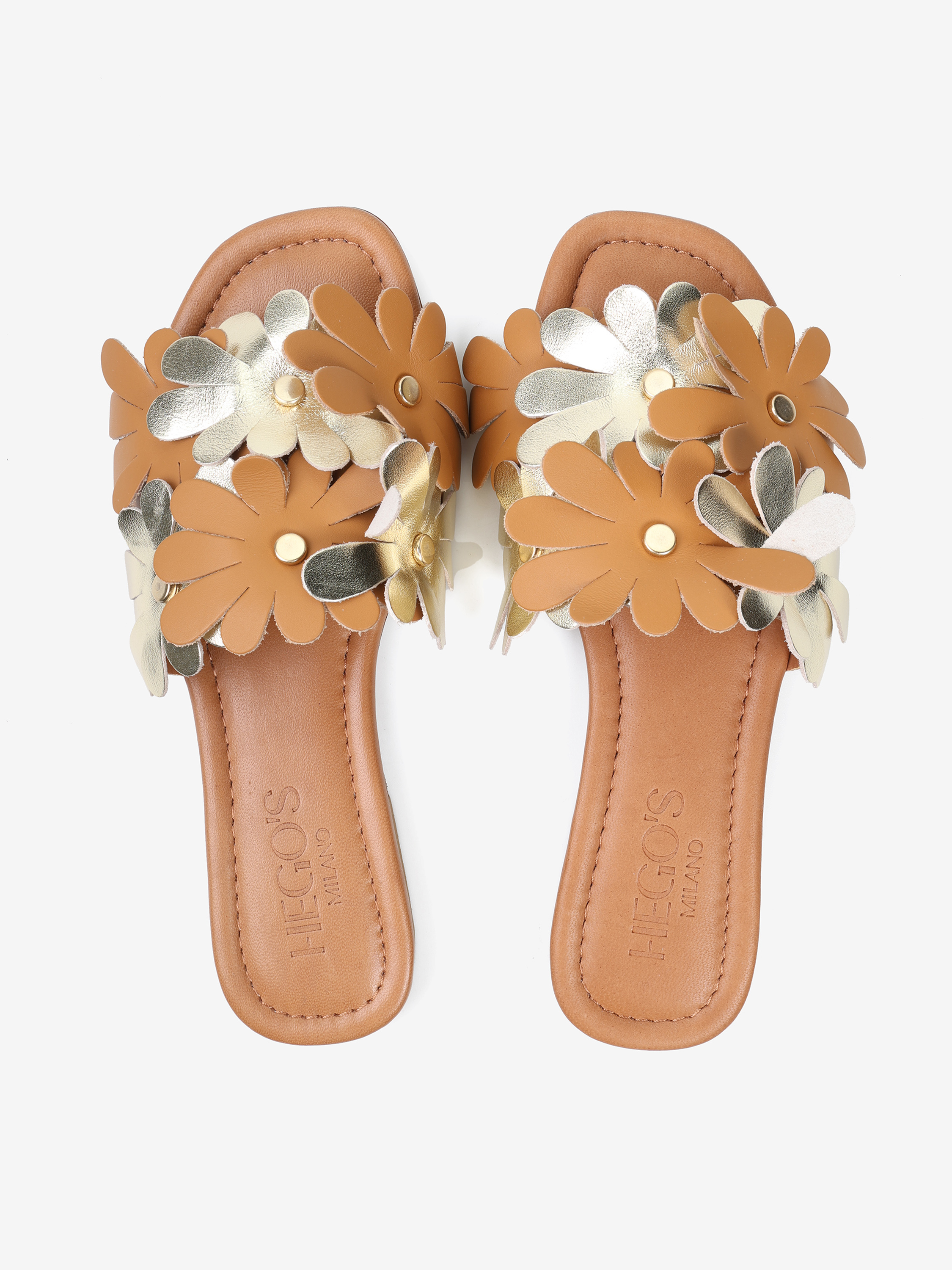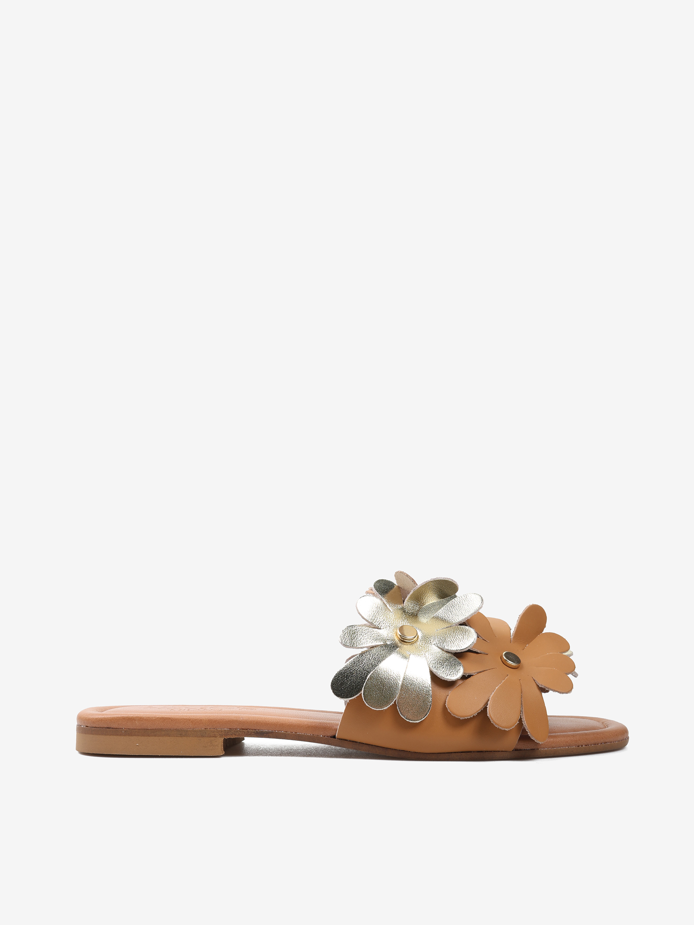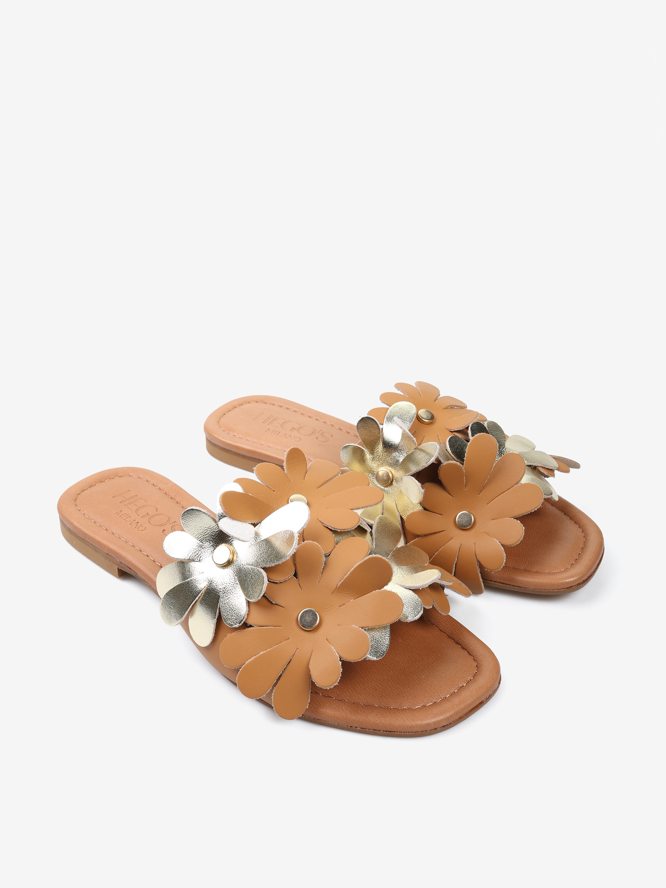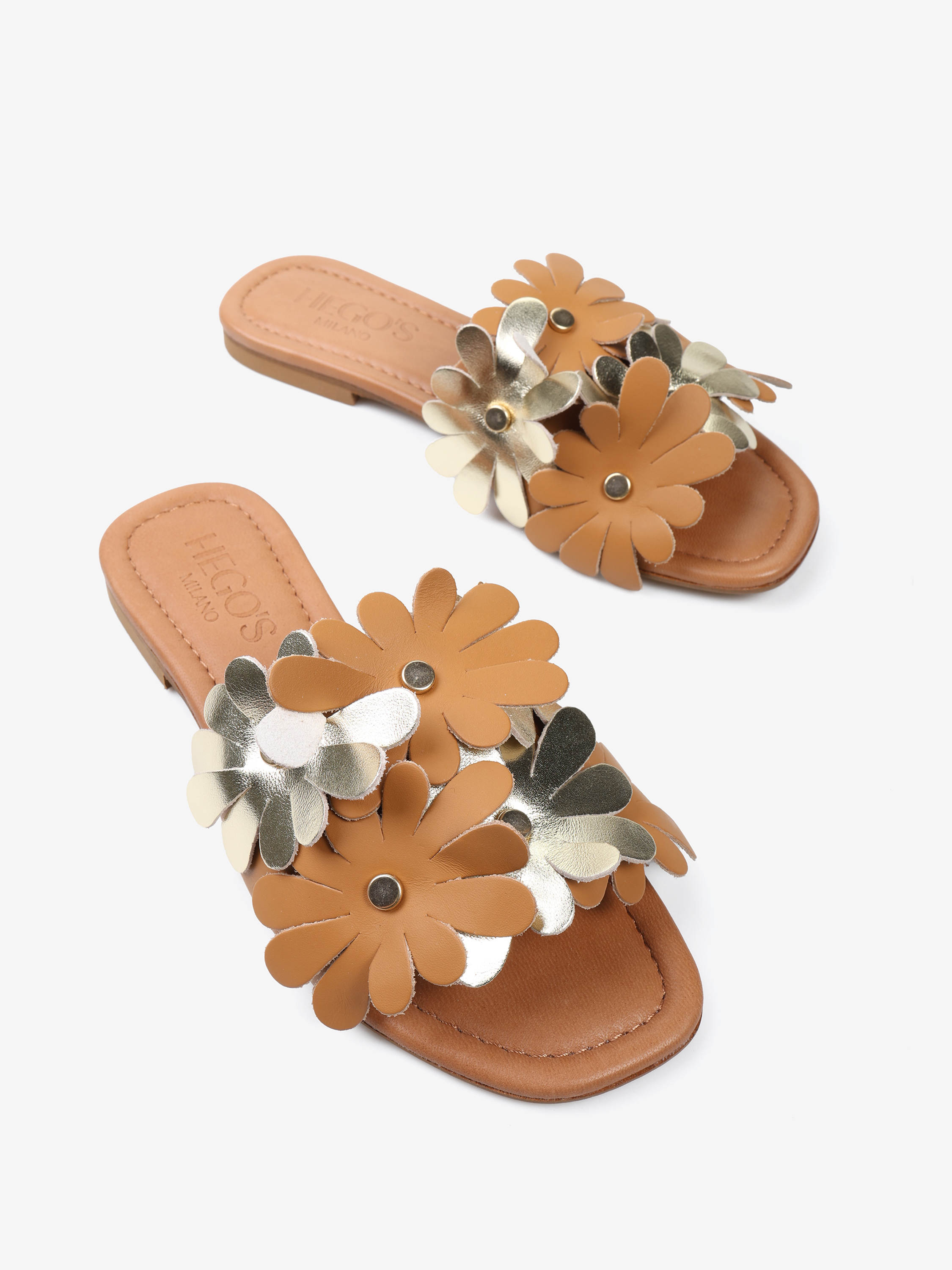Skórzane klapki na płaskiej podeszwie wykonane z miękkiej, delikatnej skóry. Pasek z ozdobnymi kwiatami ze skóry naturalnej i metalizowanej.