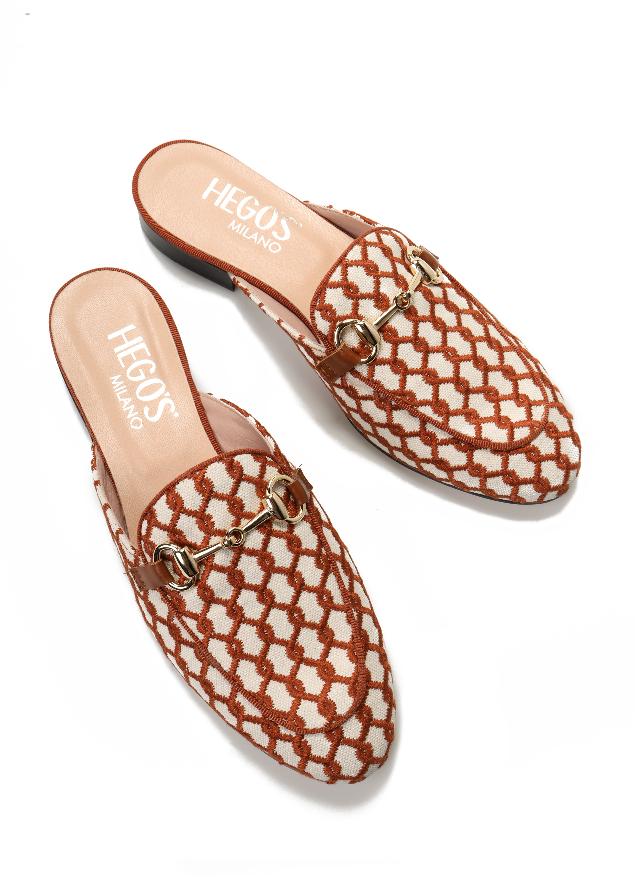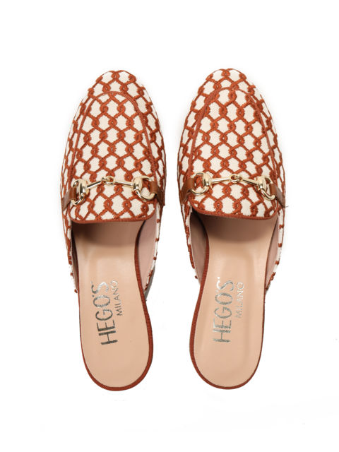 Klapki typu sabo z kolekcji HEGO'S MILANO wykonane z haftowanego materiału z delikatnym, złotym elementem na podbiciu.