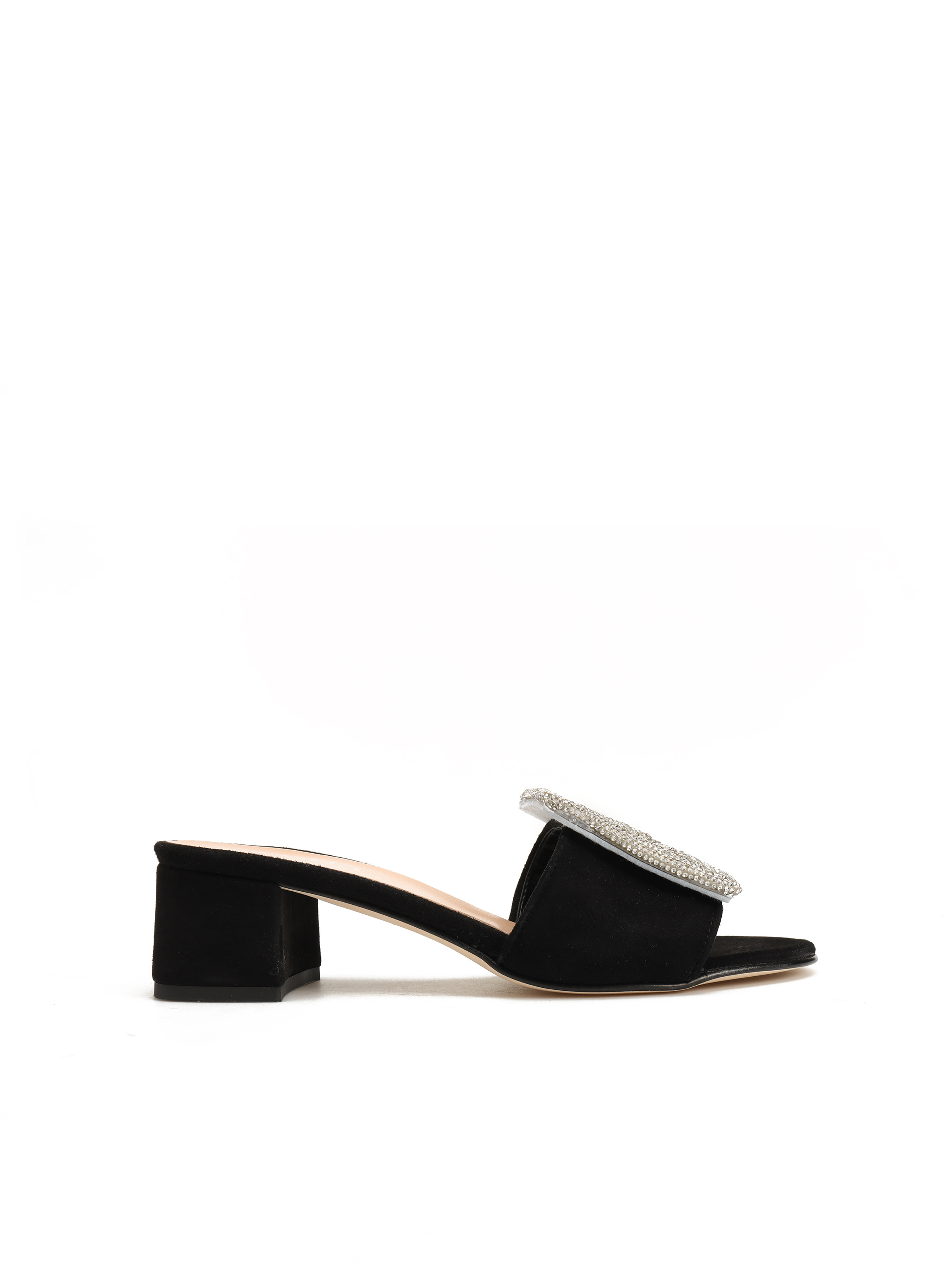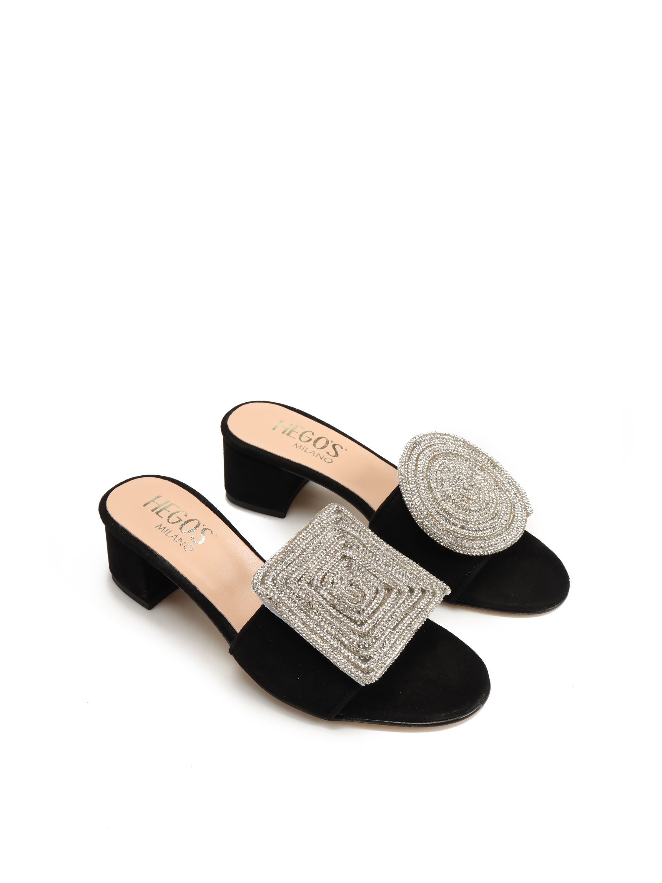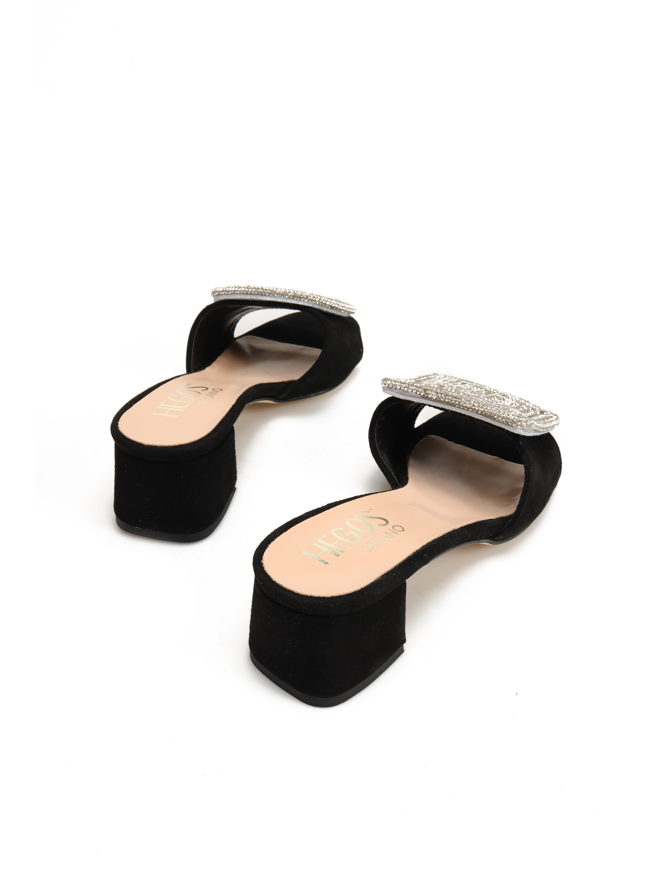 Wsuwane klapki na obcasie HEGO'S Milano wykonane są z zamszowej skóry. Cholewka w czarnym kolorze posiada geometryczną, połyskującą ozdobę która wyróżnia ten model. Klapki na niewysokim, wygodnym obcasie.